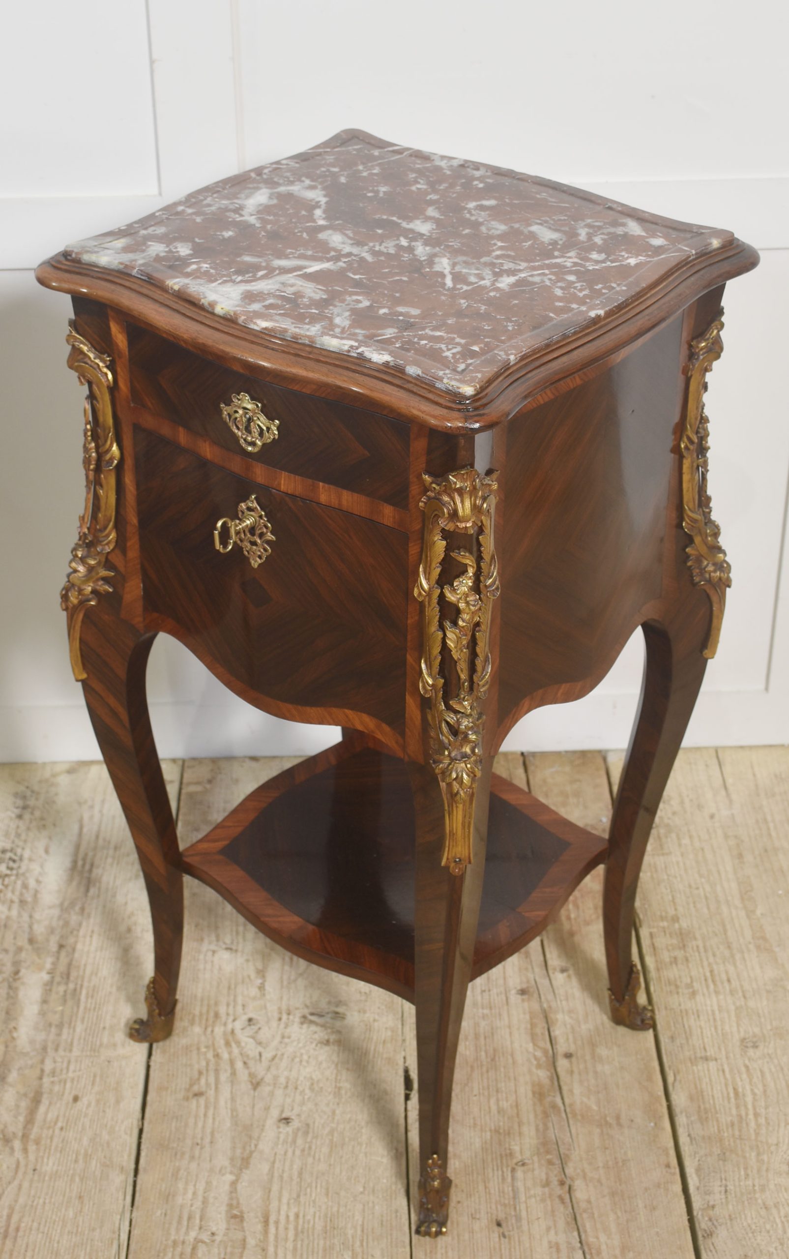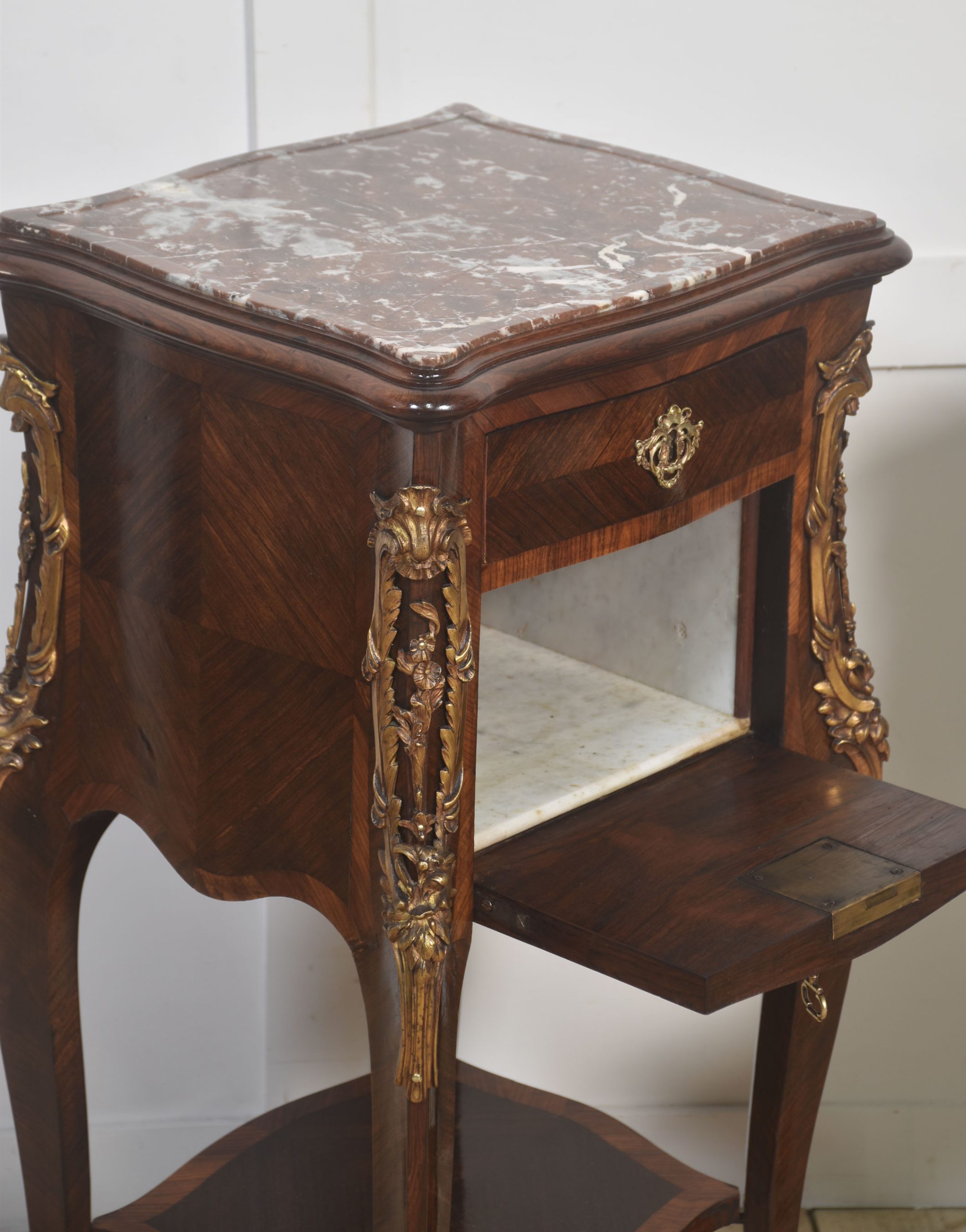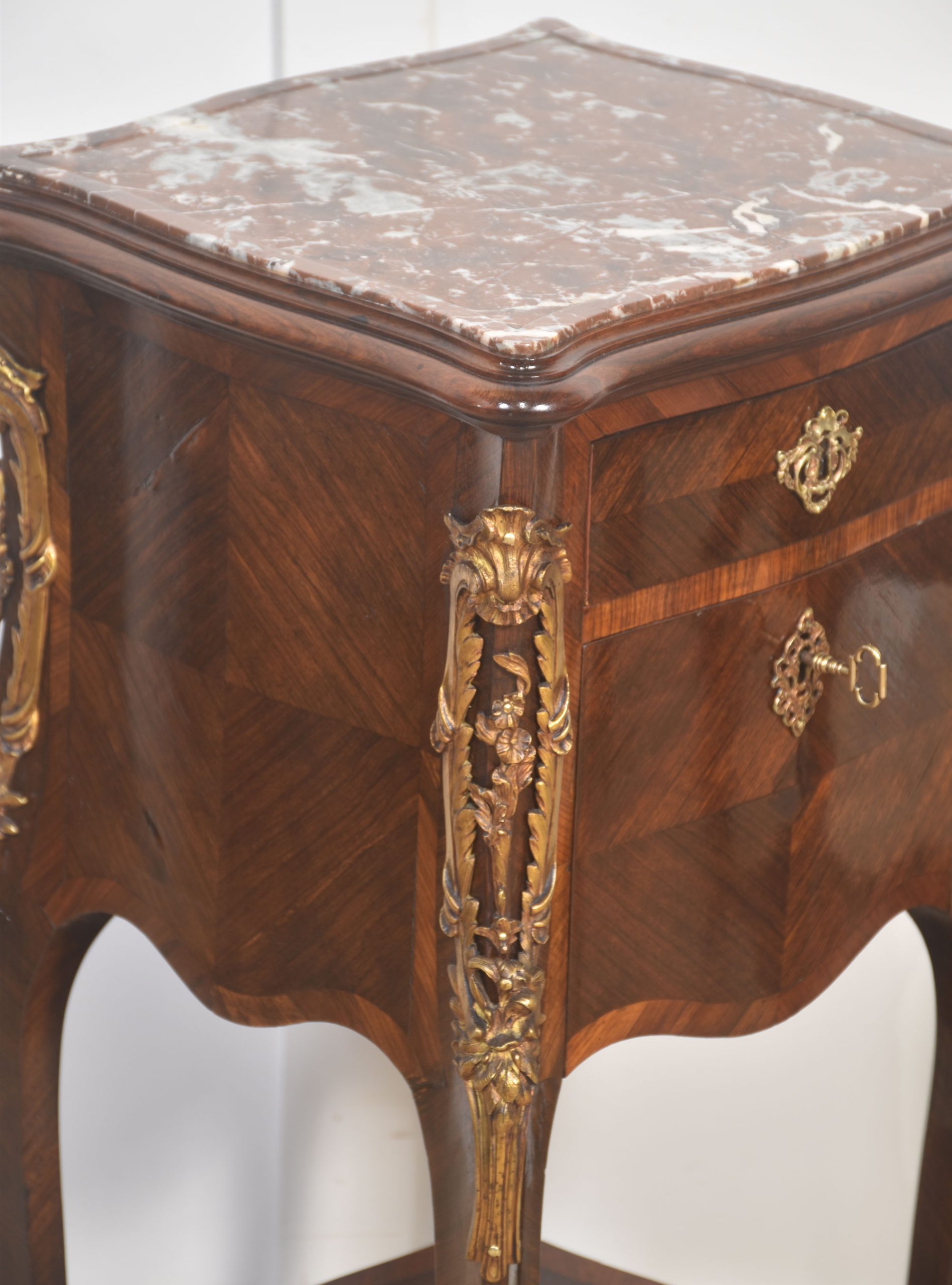 A finely crafted pair of French Louis XV–style bedside cabinets executed in richly figured walnut, each surmounted by a shaped reddish-brown marble top with molded edge.