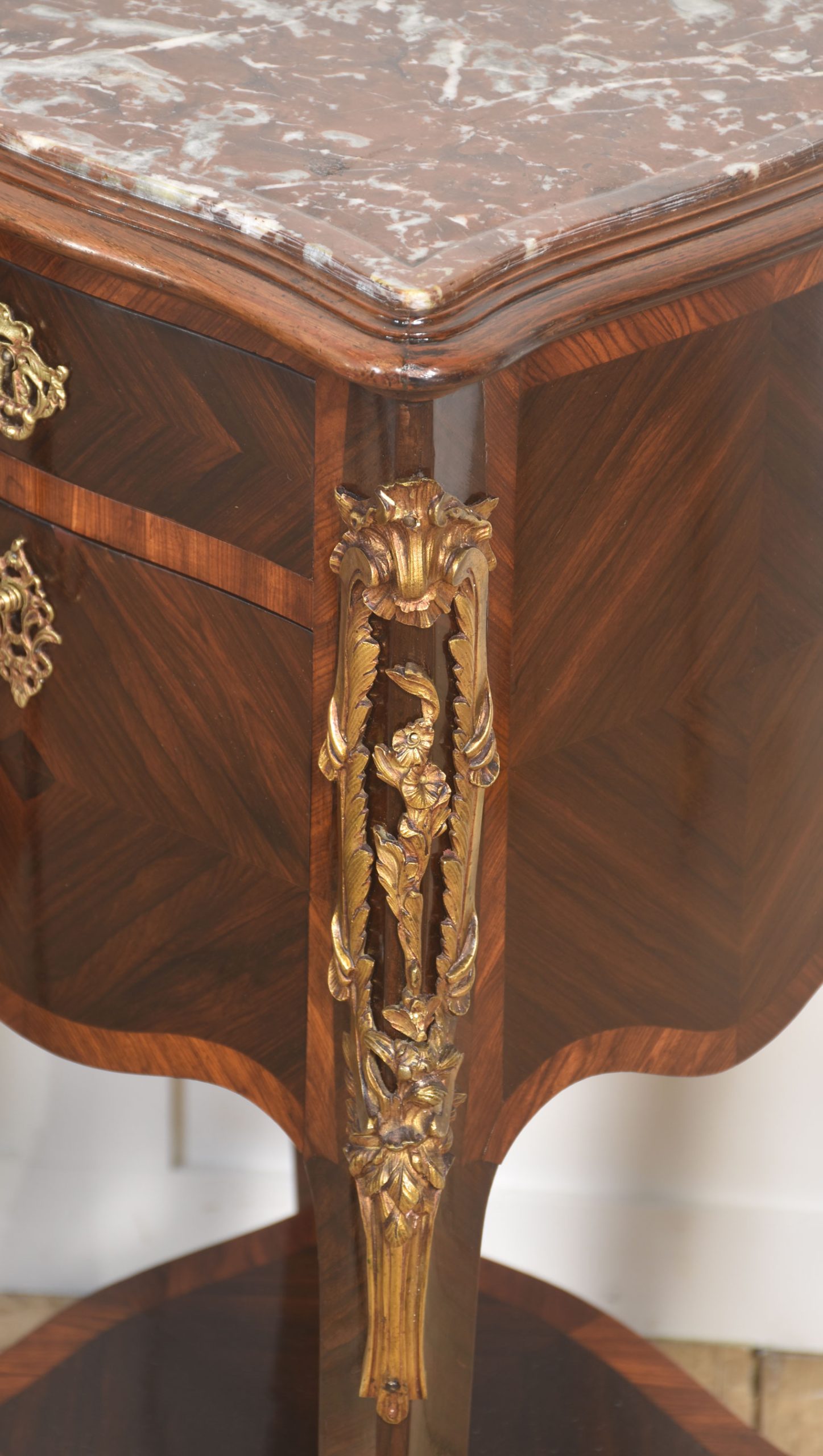 The façades are decorated with geometric parquetry in walnut veneers, arranged in chevron and diamond patterns, and framed by softly scalloped aprons. The corners, legs, and upper angles are enriched with finely chased gilt-bronze (ormolu) mounts depicting scrolling foliage and classical masks, retaining an attractive warm patina. Original-style brass drawer pulls and escutcheons complete the design.