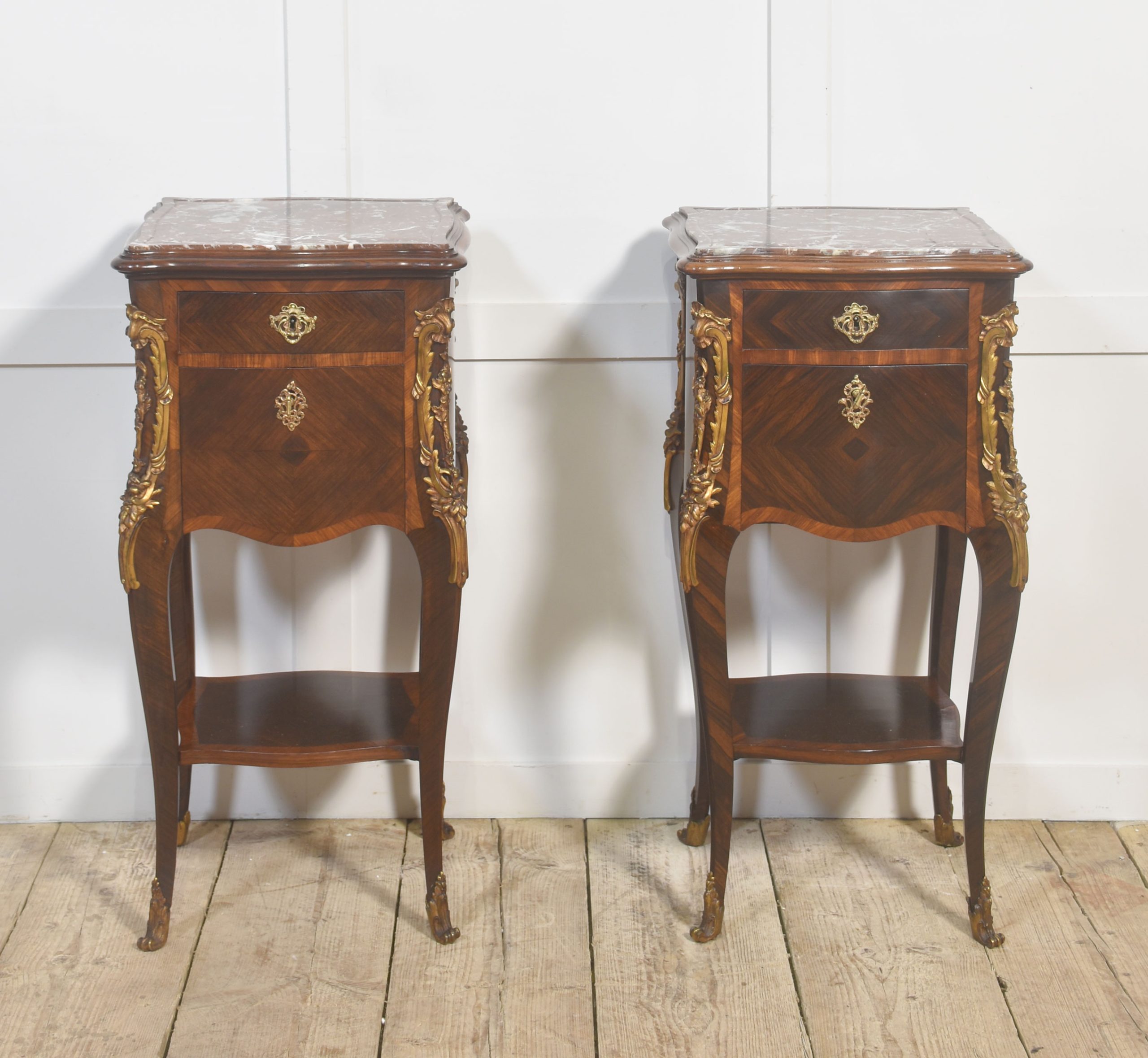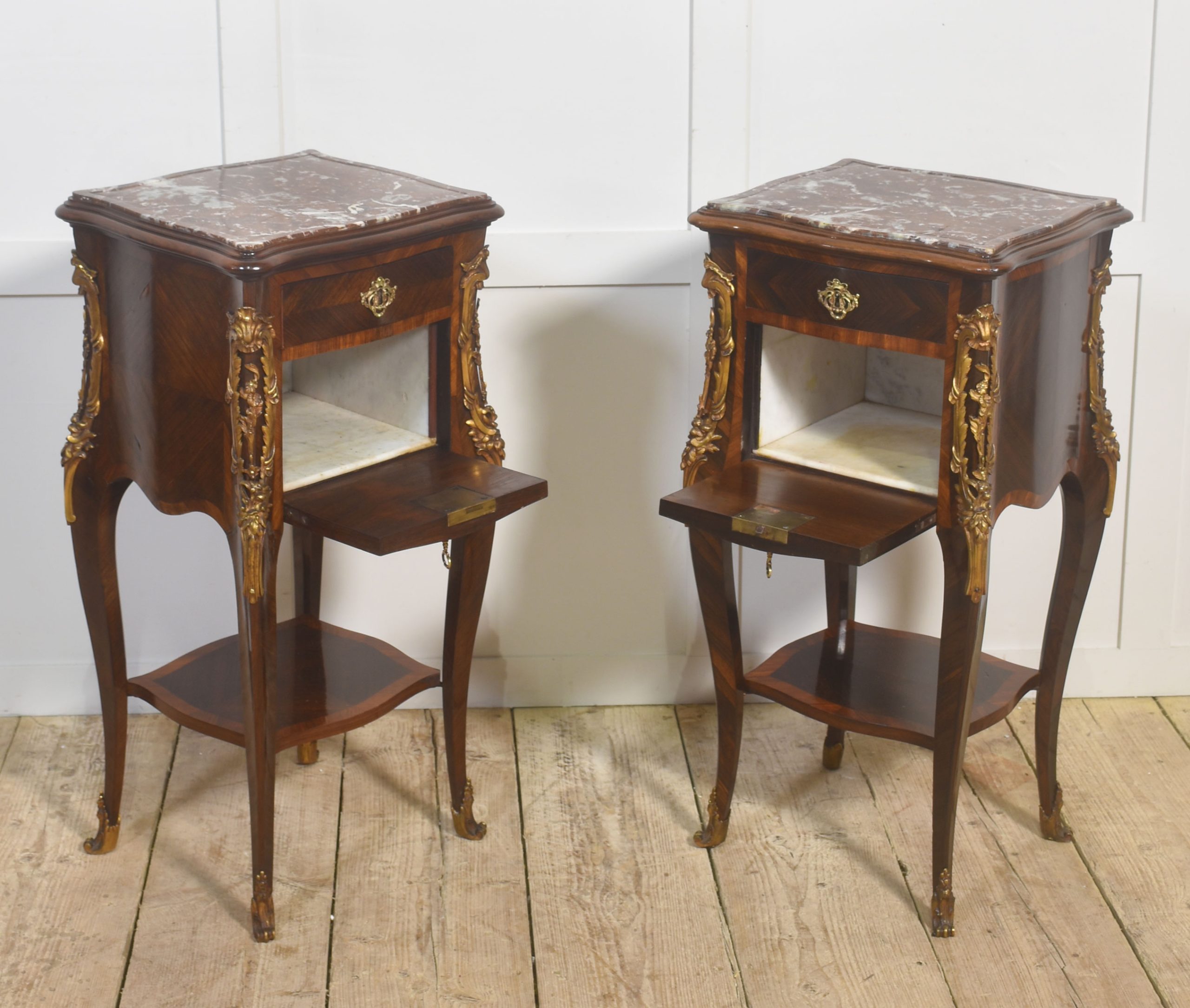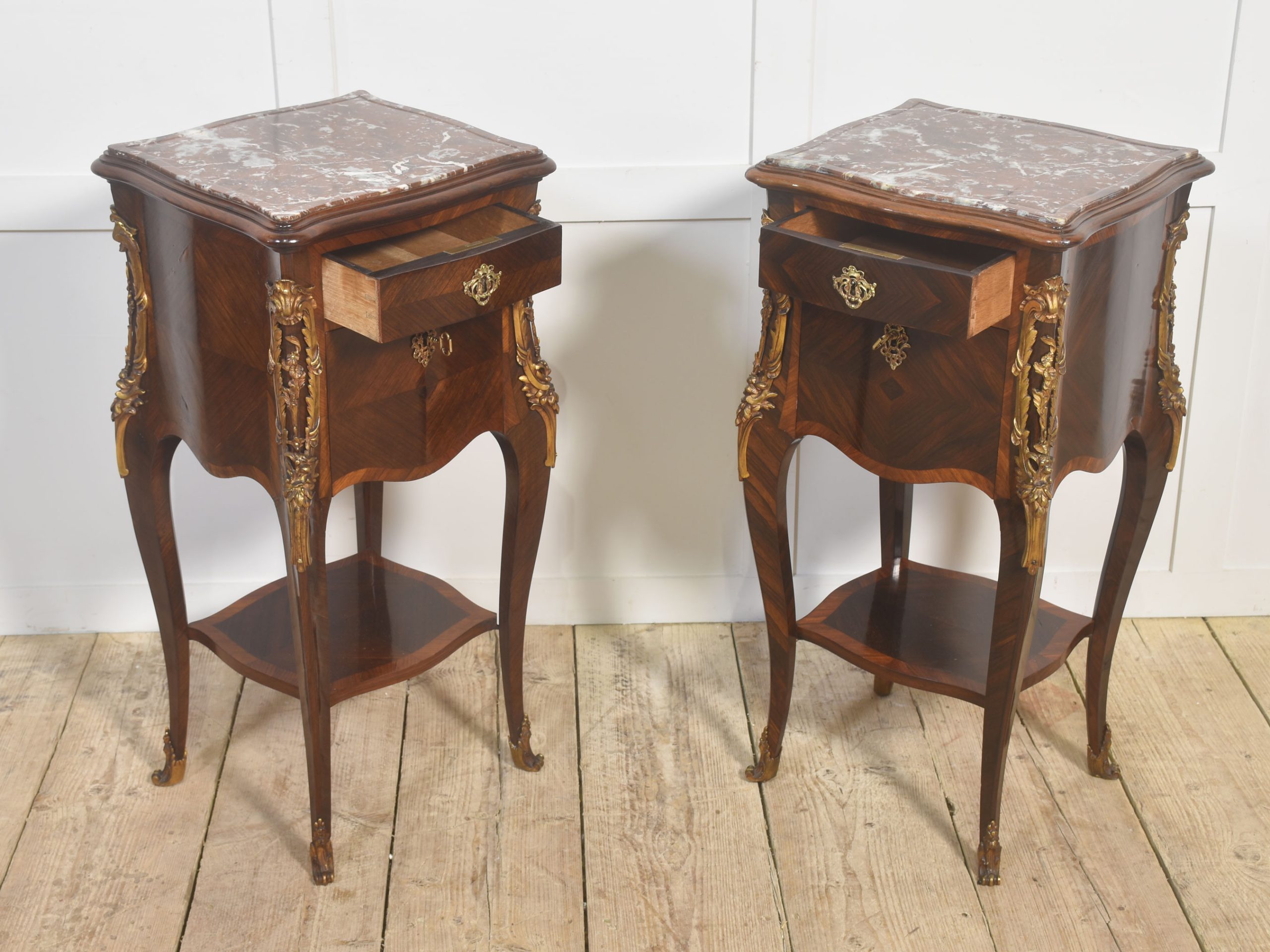 The elegant serpentine cases each feature a single upper drawer above a cabinet door, the interior lined in white marble, and raised on slender cabriole legs joined by a shaped undertier shelf. The proportions are light and well balanced, characteristic of the refined Louis XV revival aesthetic.