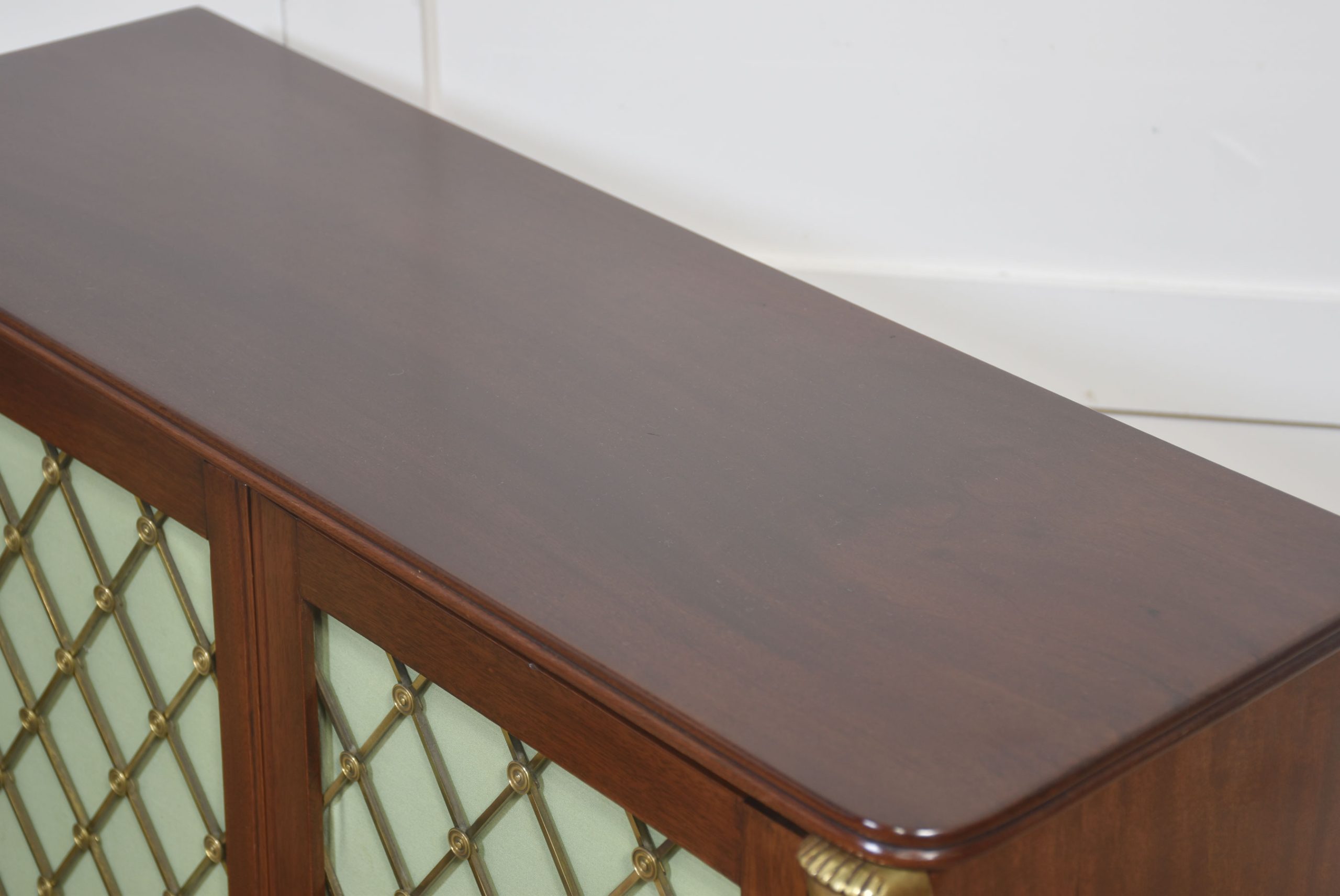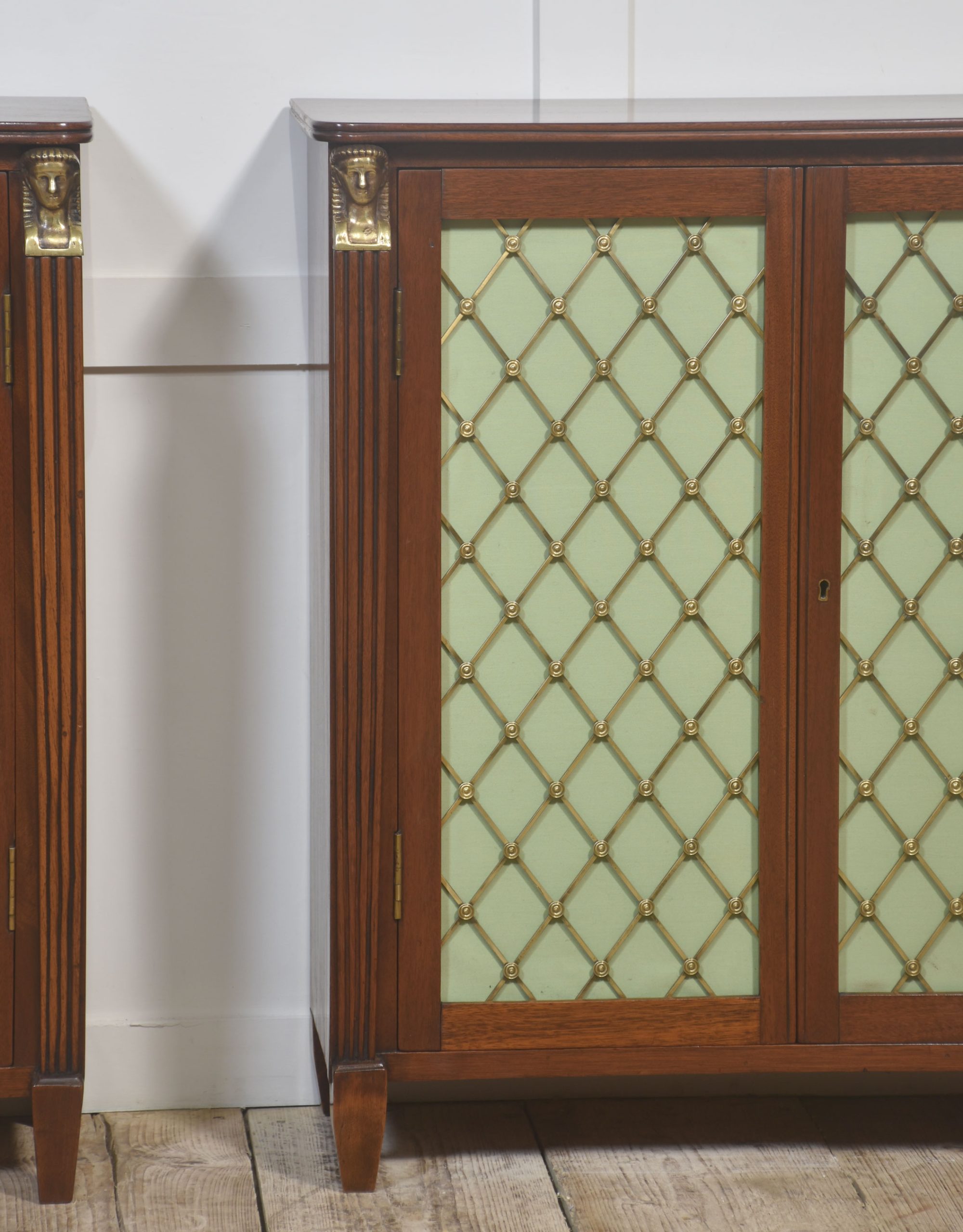 The façades feature double doors fitted with brass lattice grilles, set over a pale green fabric backing that provides a soft contrast and enhances the geometric pattern of the metalwork. At the upper corners, applied brass mounts in the form of classical female masks lend a sculptural accent and reinforce the period inspiration. The cabinets stand on tapering legs, giving the pieces a light, architectural stance.