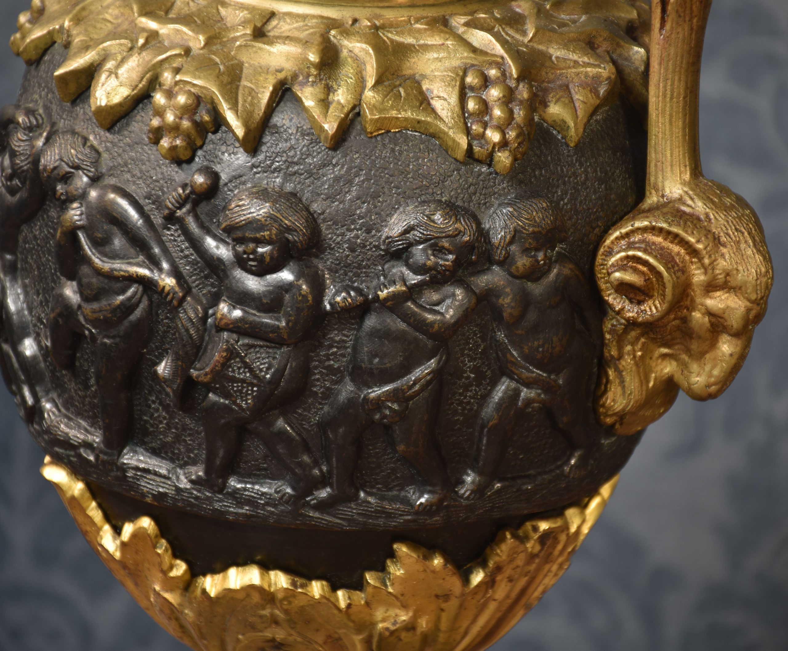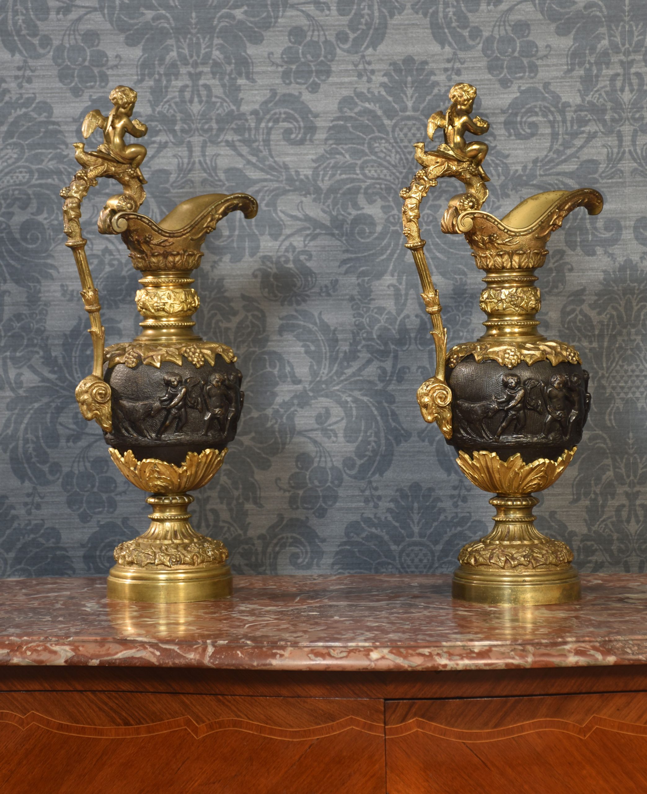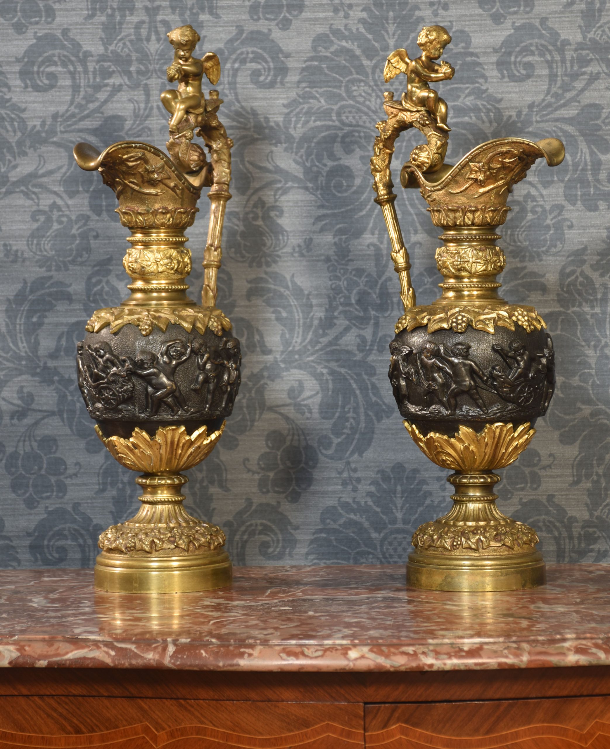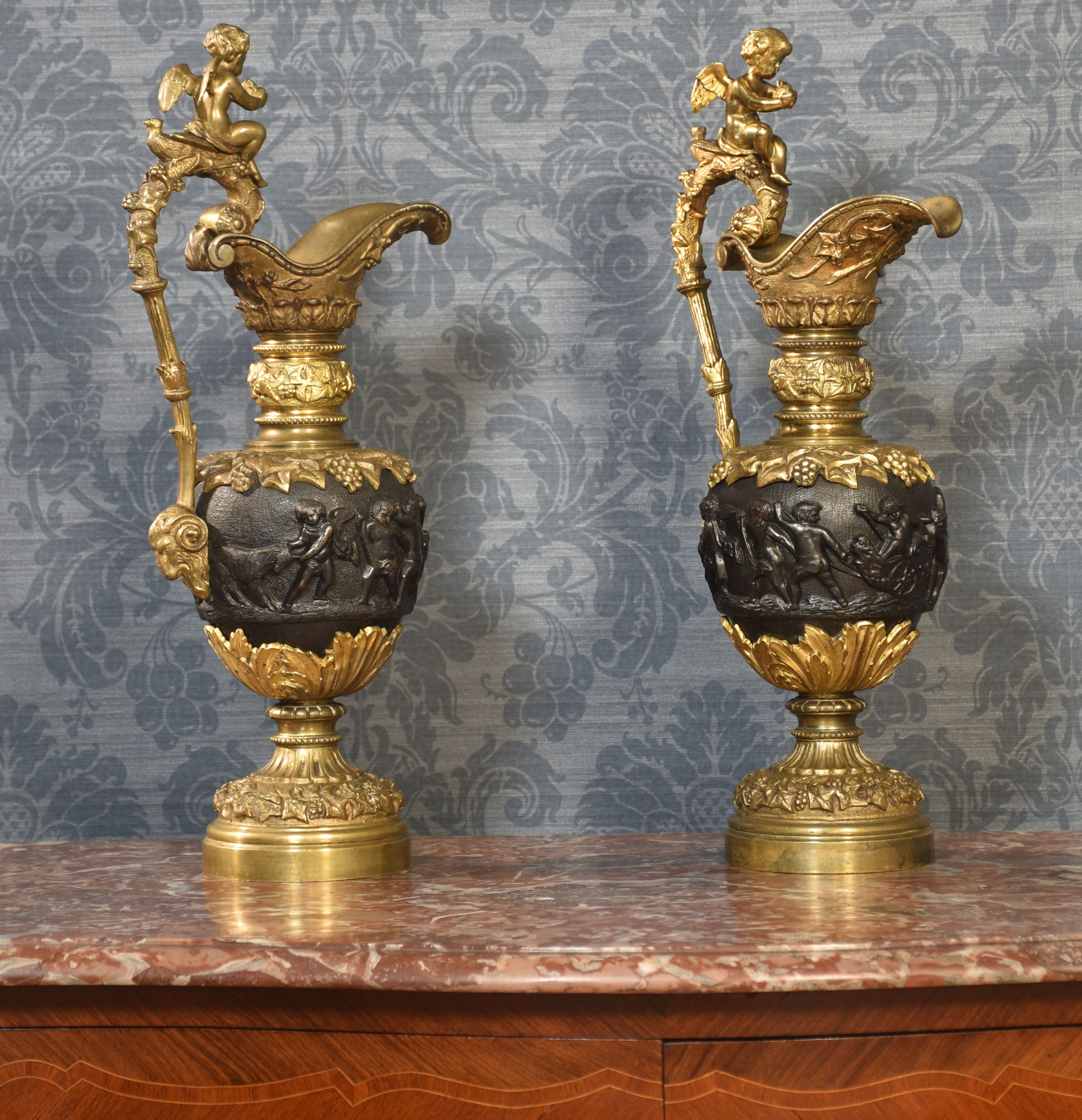 A pair of Renaissance-style French patinated bronze ewers cast overall with trailing grape vines on a punched ground, the handles with cherub mounts issuing from the rims descending to grotesque masks at the bodies, the bodies cast with putti representing the Arts and Sciences, the undersides with imbricated acanthus leaves above a waisted socle.