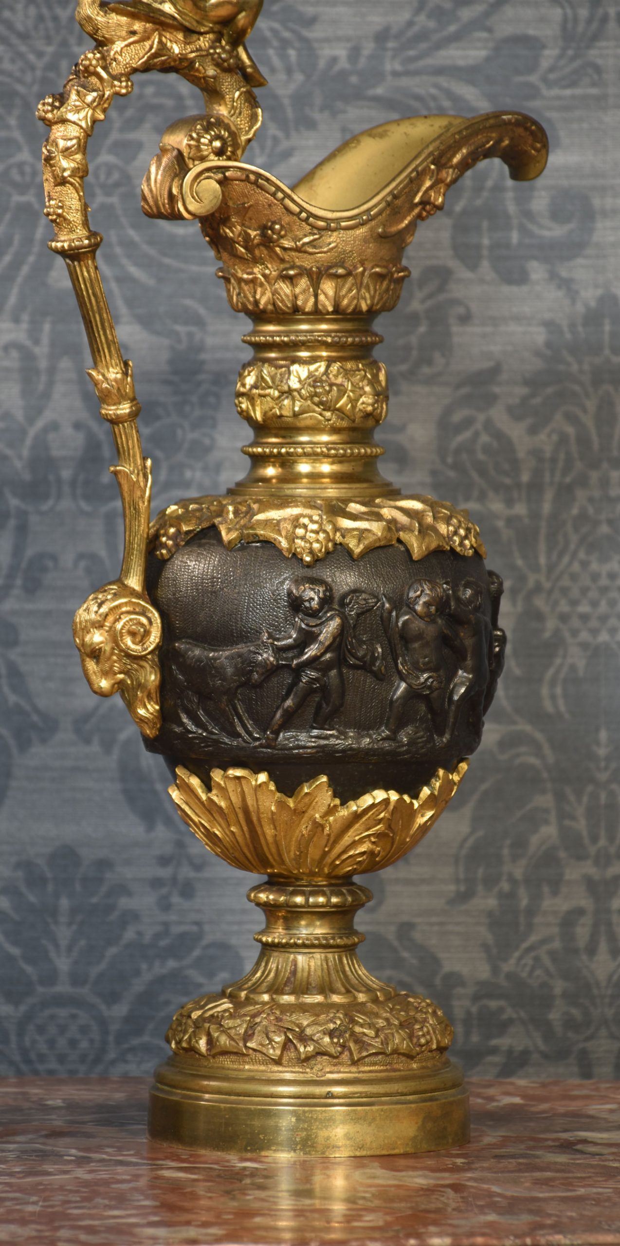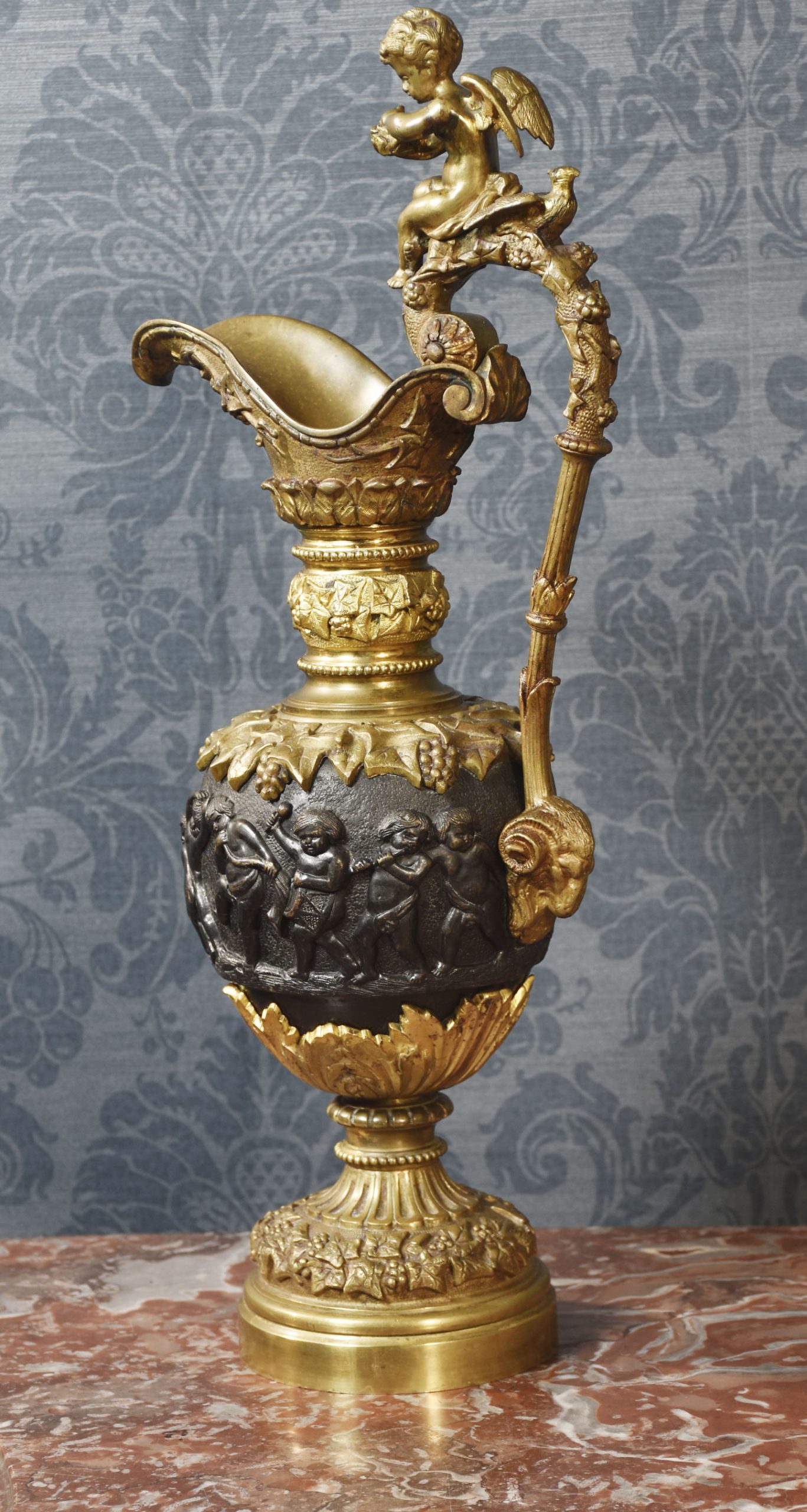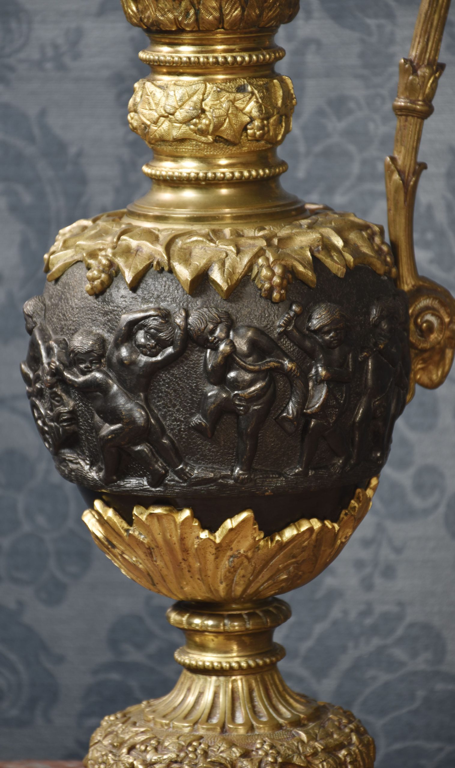 A pair of Renaissance-style French patinated bronze ewers cast overall with trailing grape vines on a punched ground, the handles with cherub mounts issuing from the rims descending to grotesque masks at the bodies, the bodies cast with putti representing the Arts and Sciences, the undersides with imbricated acanthus leaves above a waisted socle.