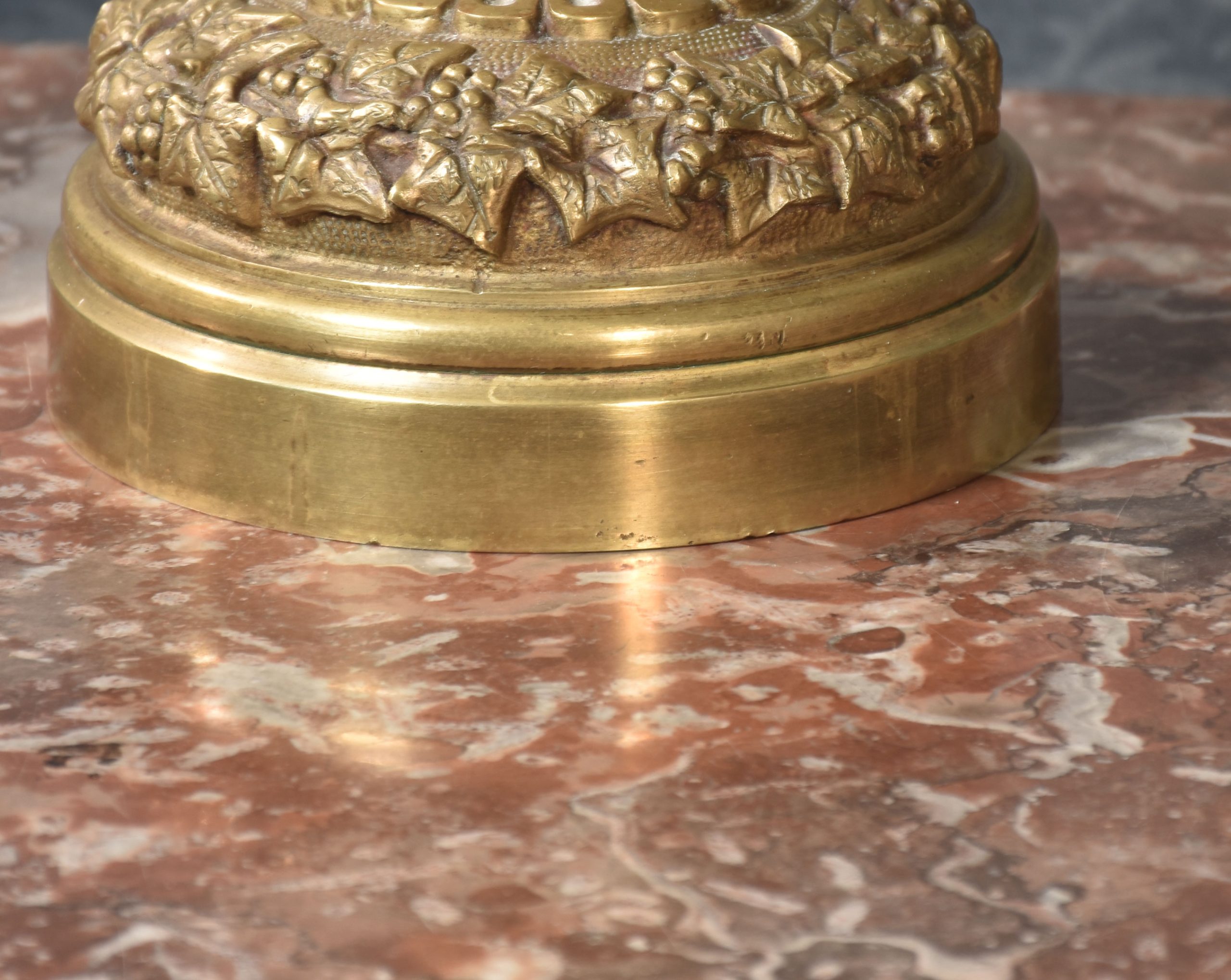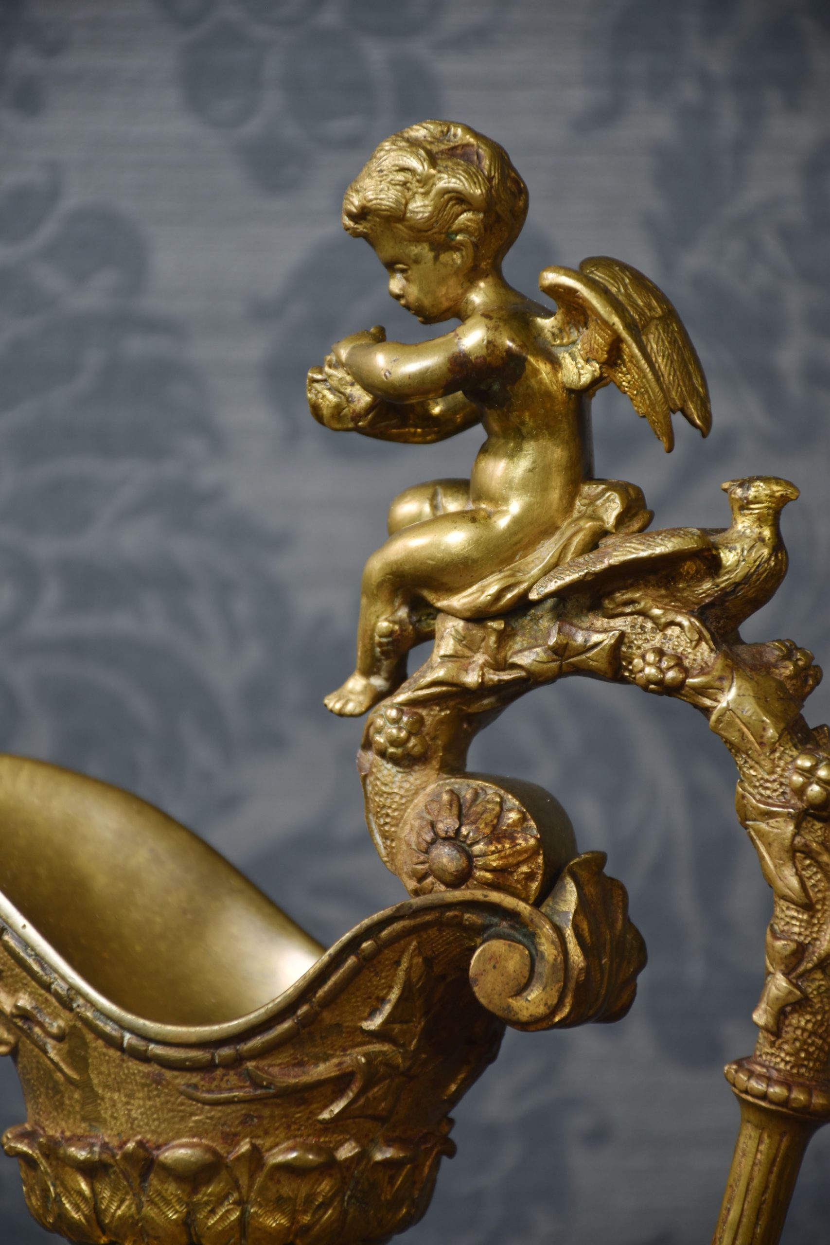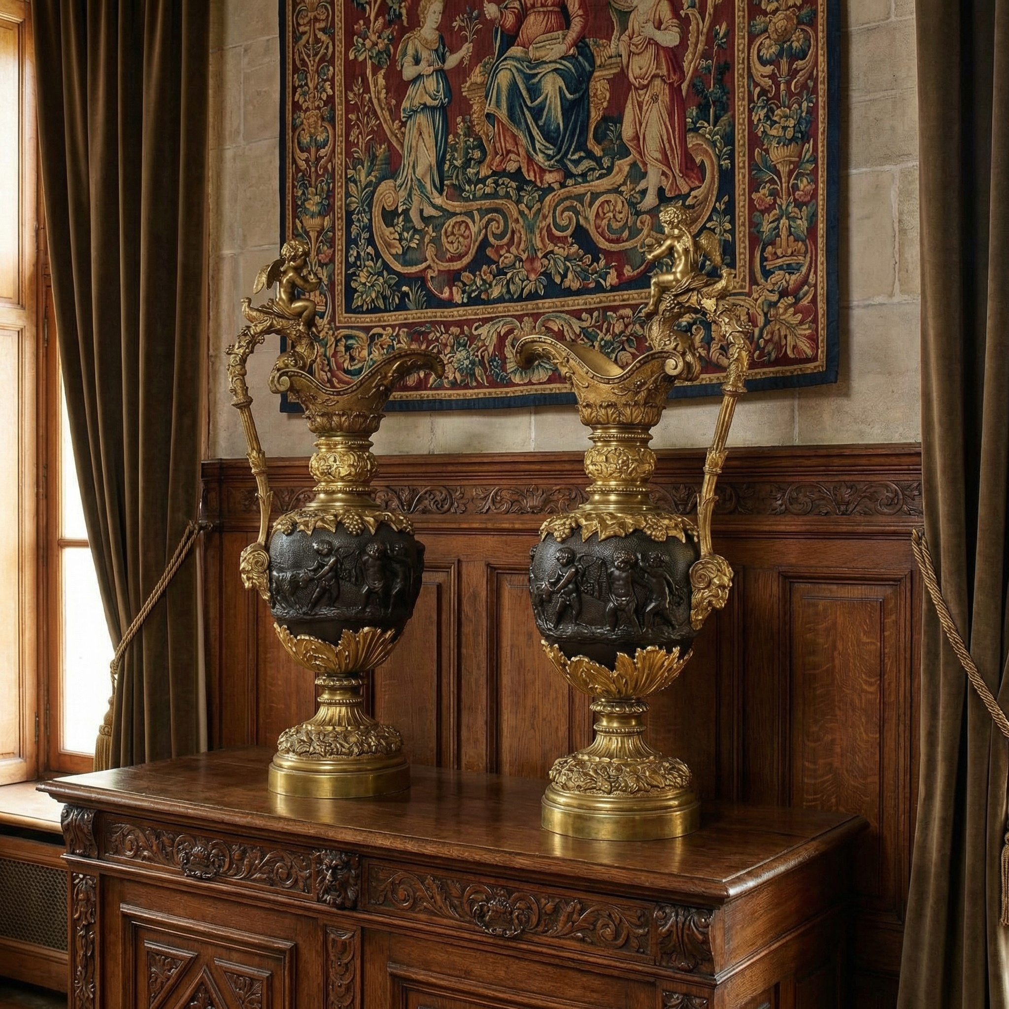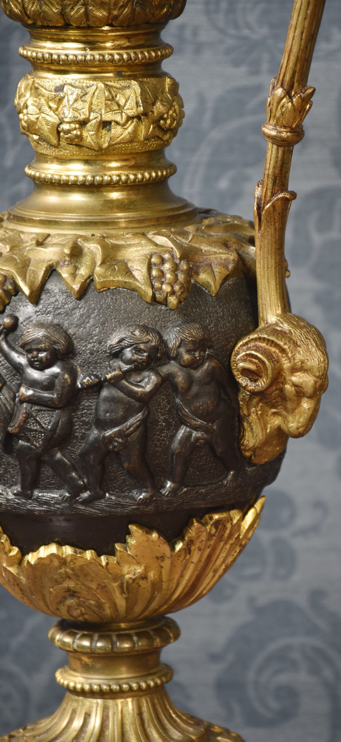 A pair of Renaissance-style French patinated bronze ewers cast overall with trailing grape vines on a punched ground, the handles with cherub mounts issuing from the rims descending to grotesque masks at the bodies, the bodies cast with putti representing the Arts and Sciences, the undersides with imbricated acanthus leaves above a waisted socle.