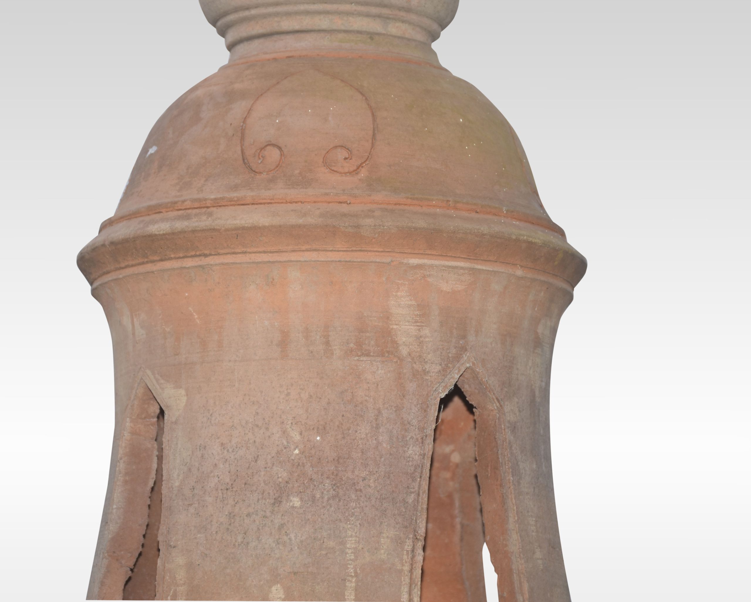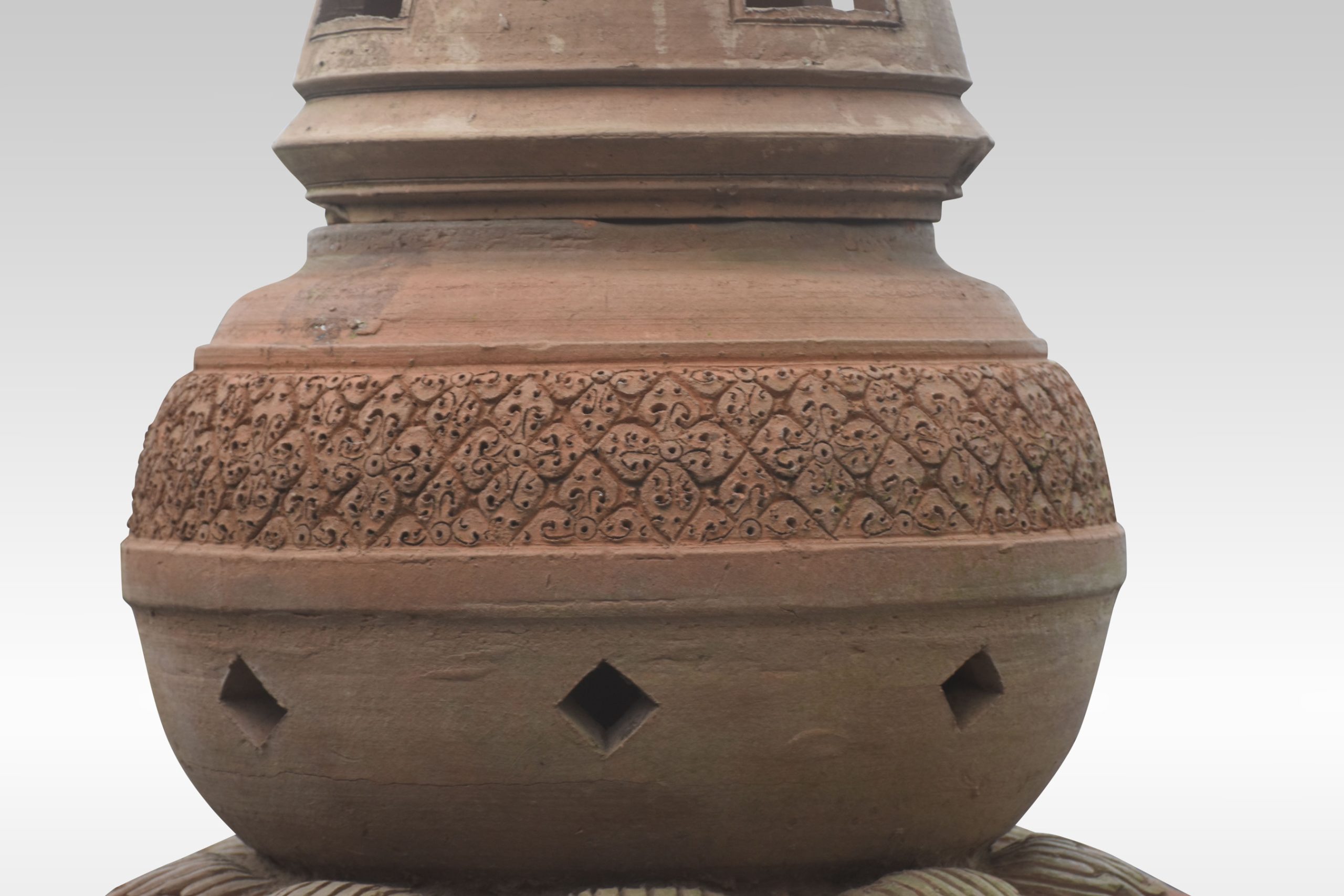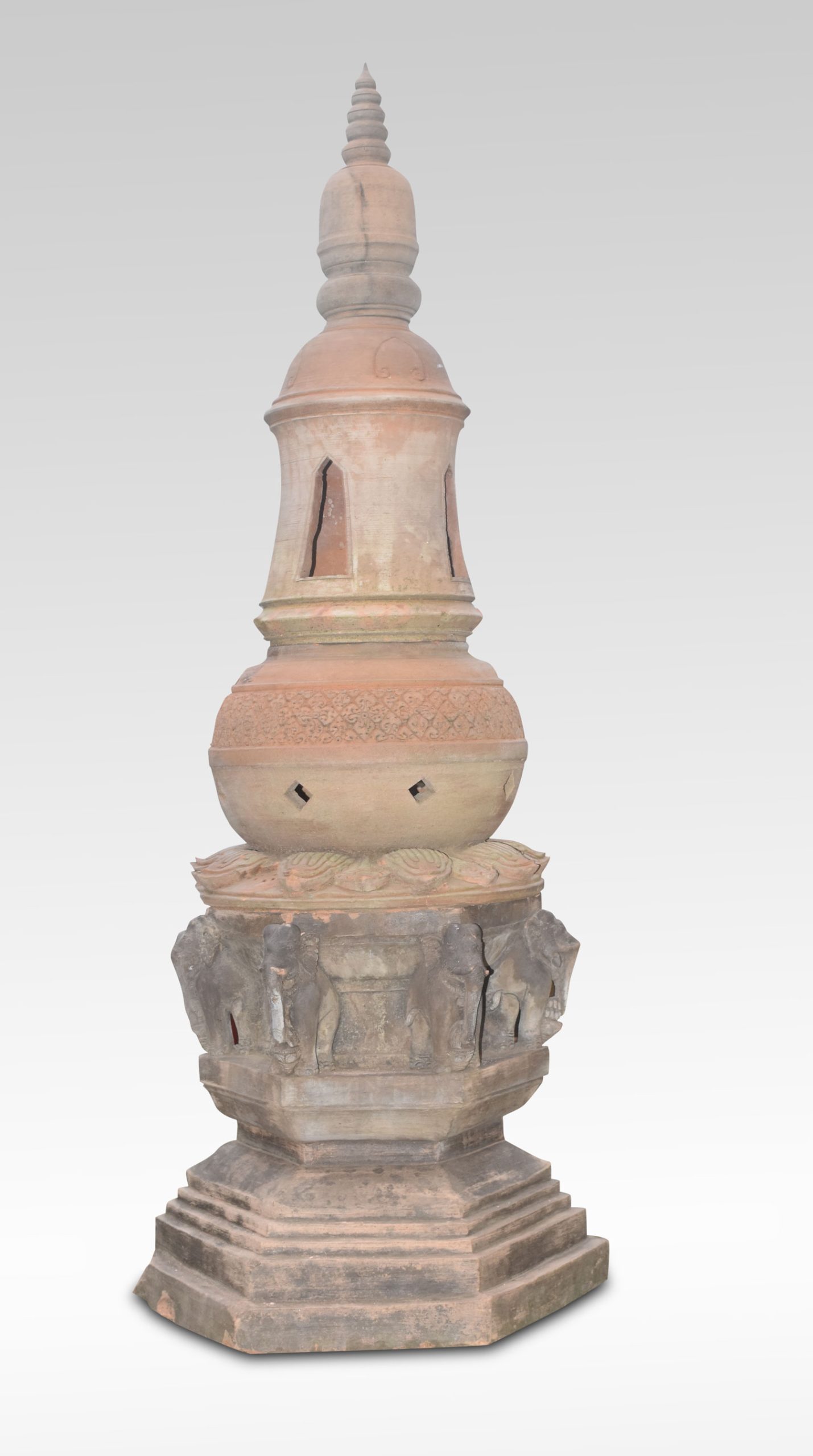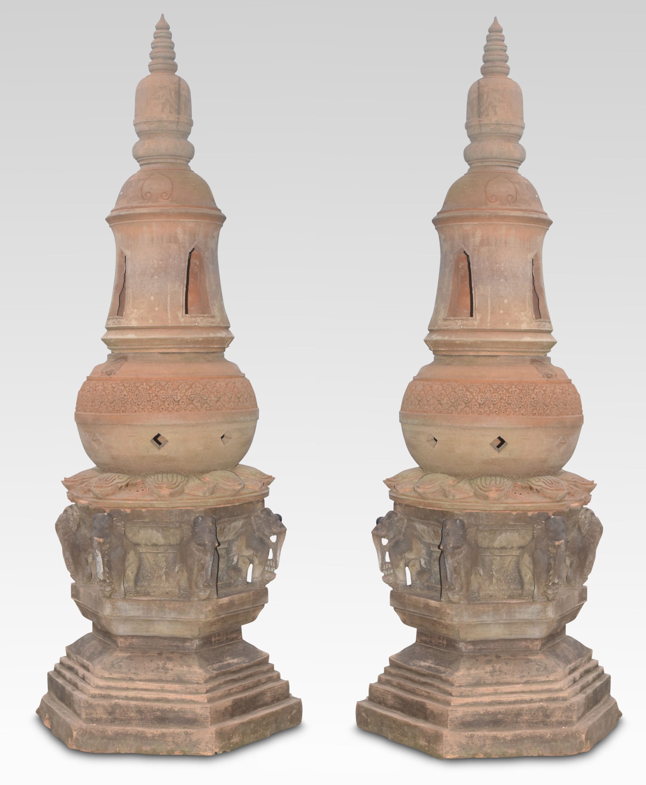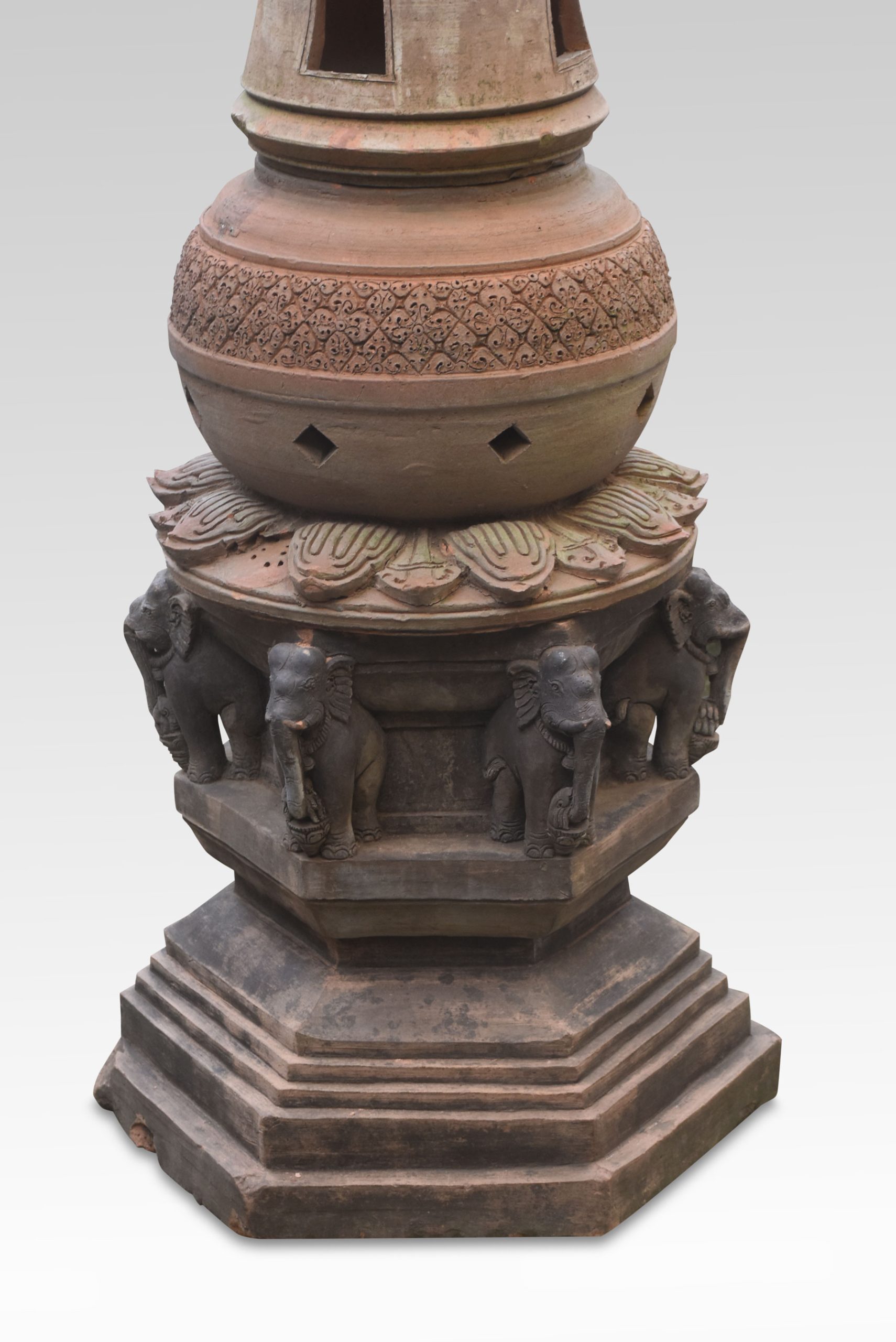 A Pair of terracotta lanterns having turned finials above opposing elephants. All raised up on a hexagonal stepped base.