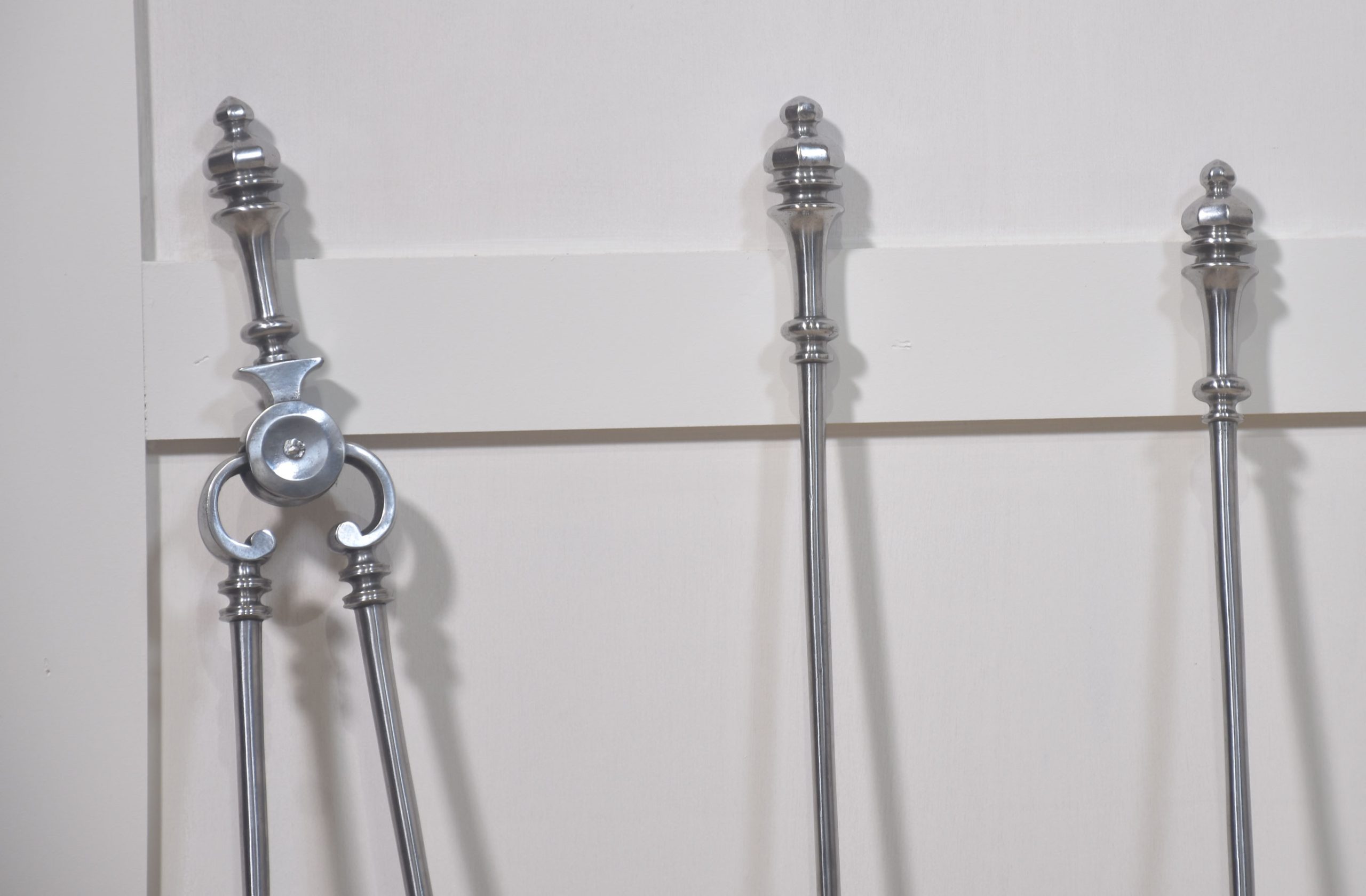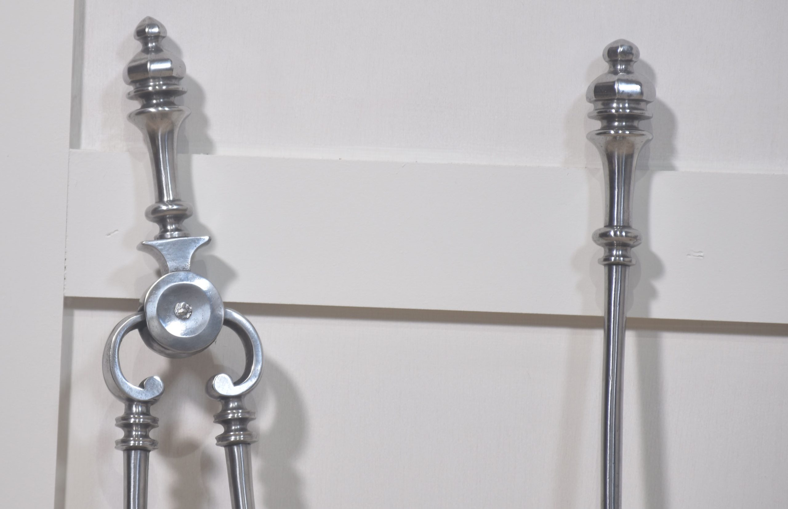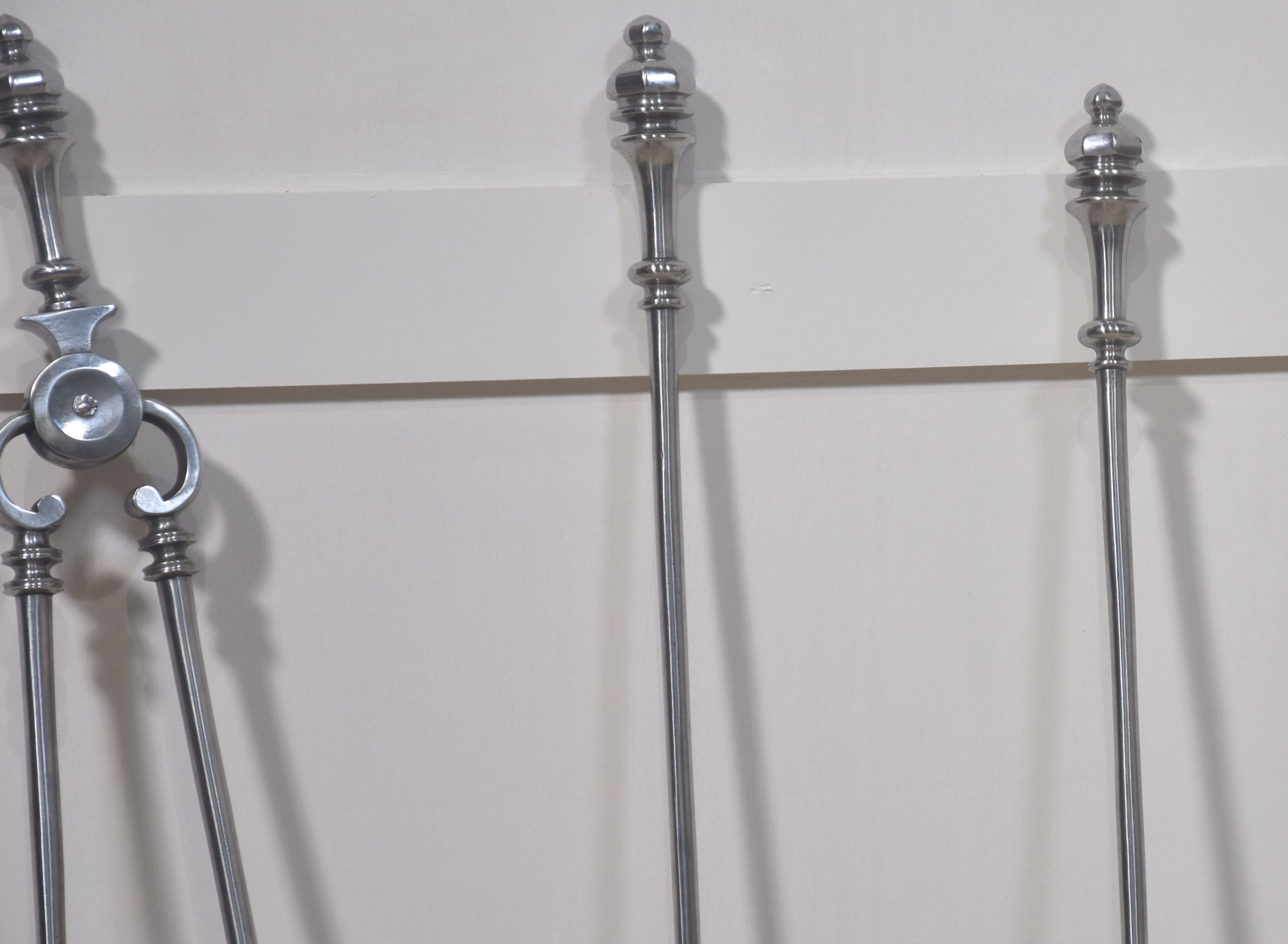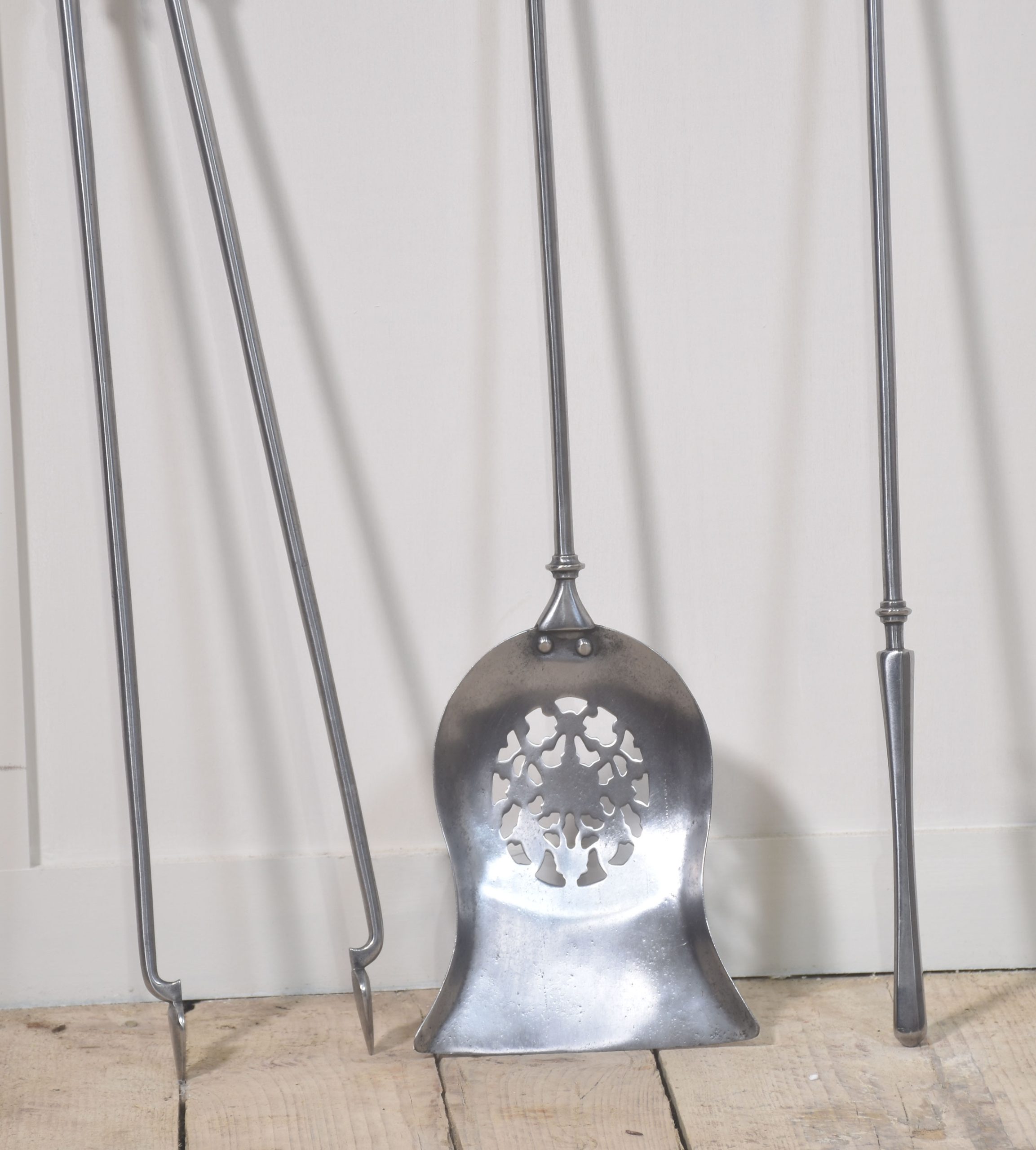 Regency polished steel fire toolset consisting of poker, tongs, and shovel with well-casted handles.