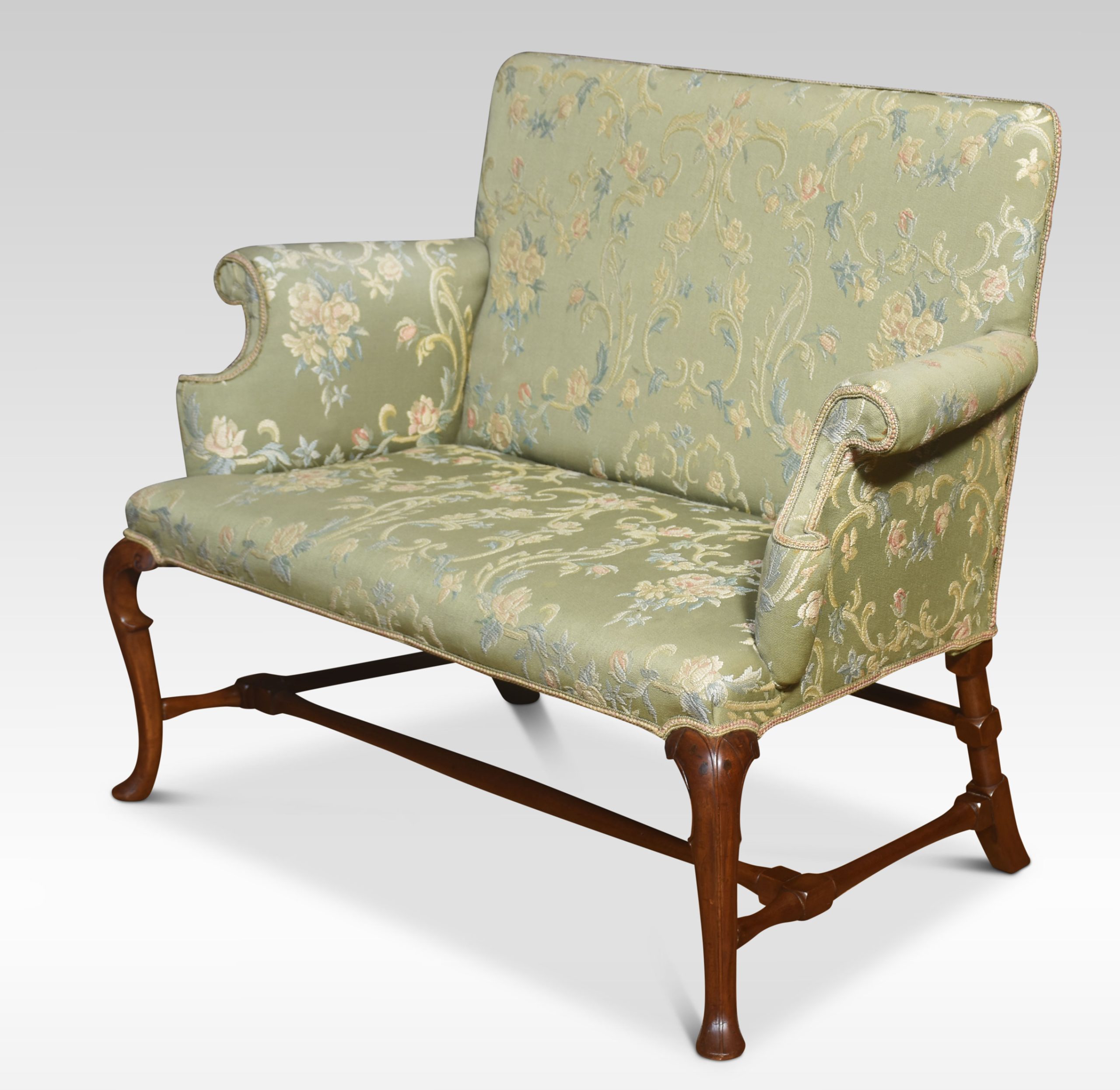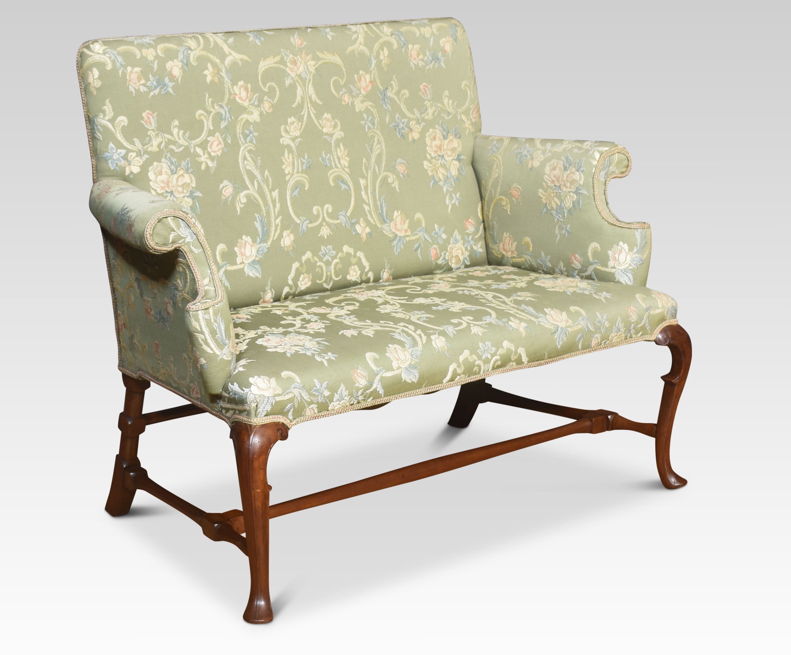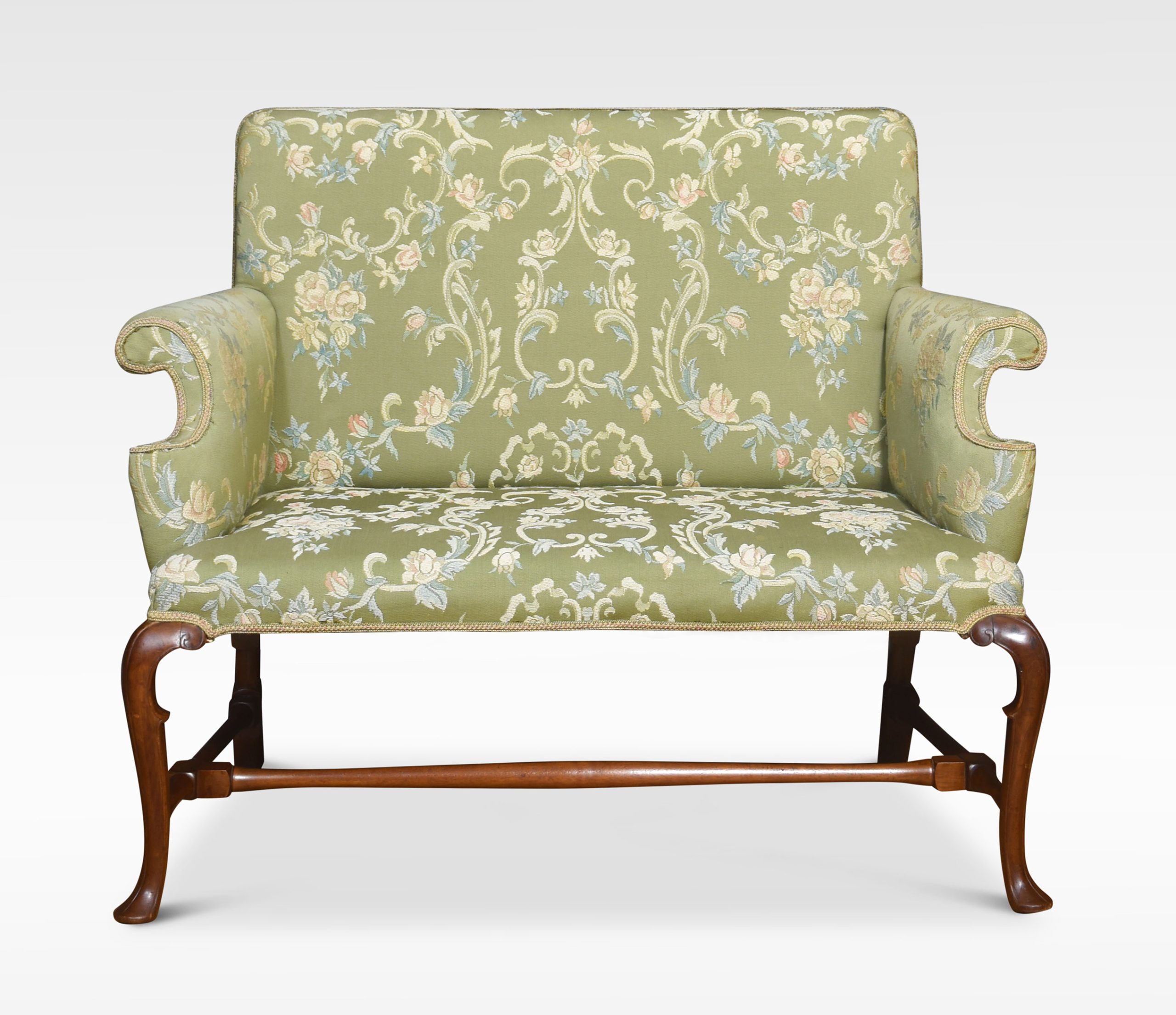 Walnut framed love seat, the solid walnut frame with a floral green upholstered back, seat and scrolling arms, raised on cabriole supports united by stretchers.
