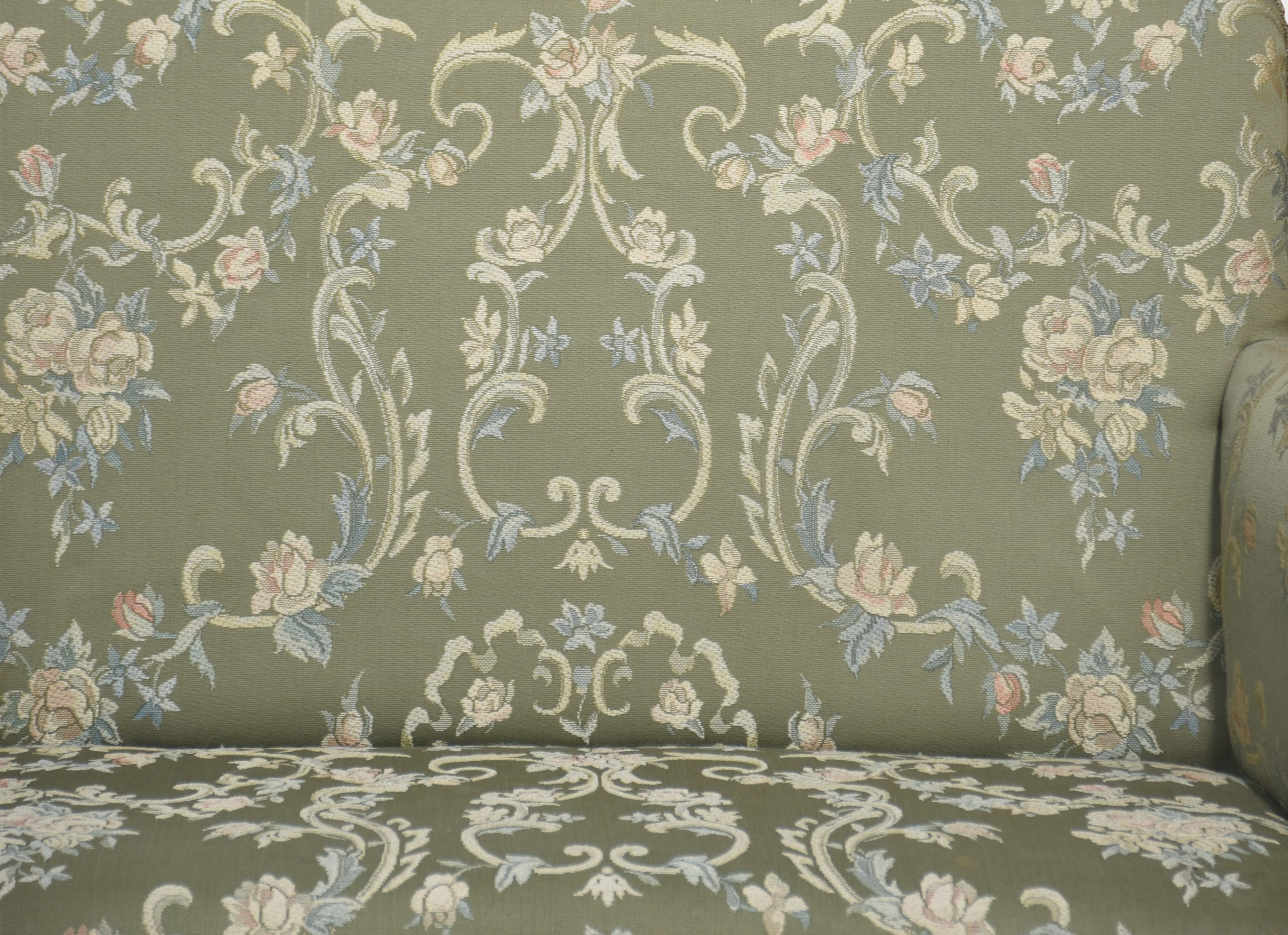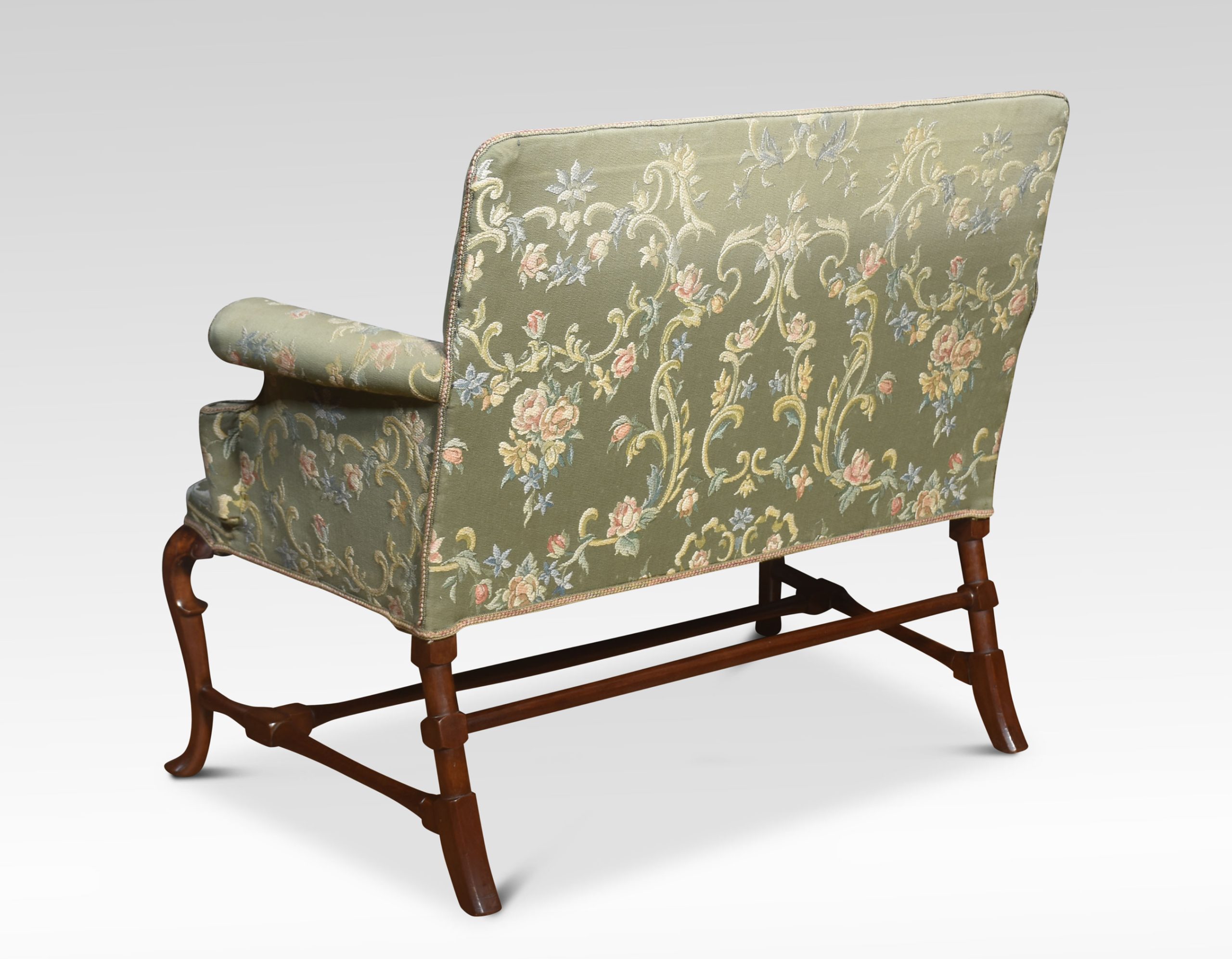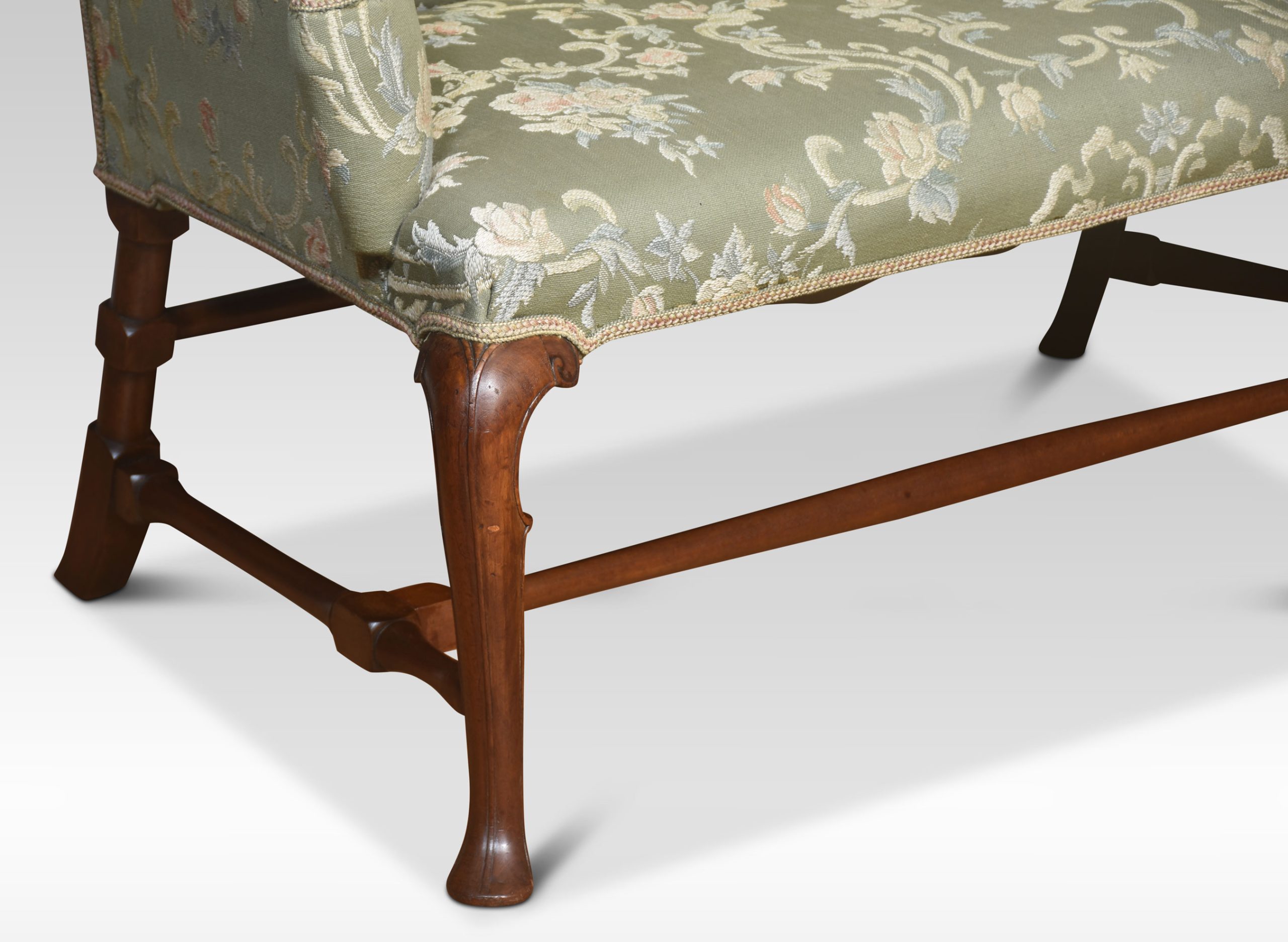 Walnut framed love seat, the solid walnut frame with a floral green upholstered back, seat and scrolling arms, raised on cabriole supports united by stretchers.