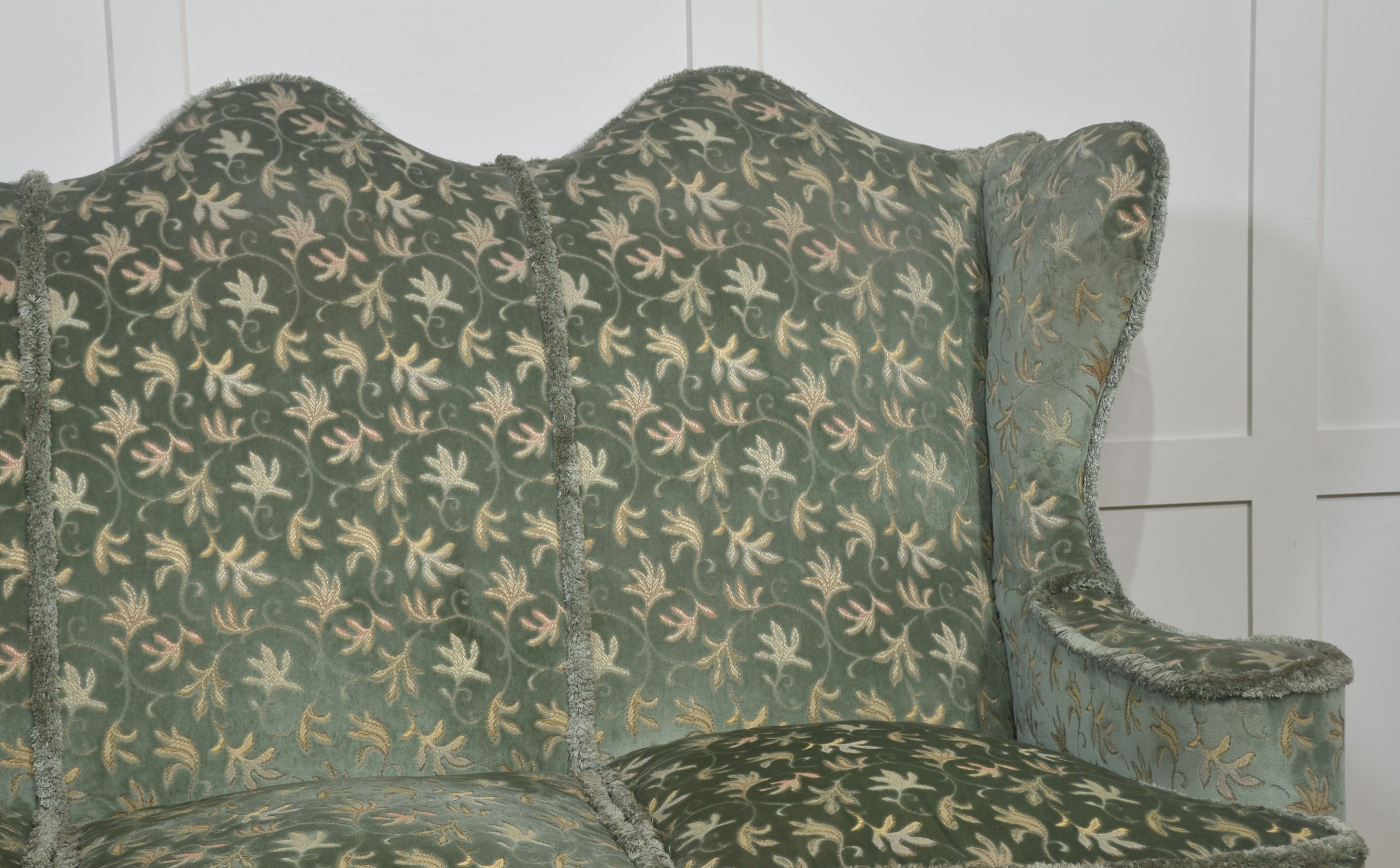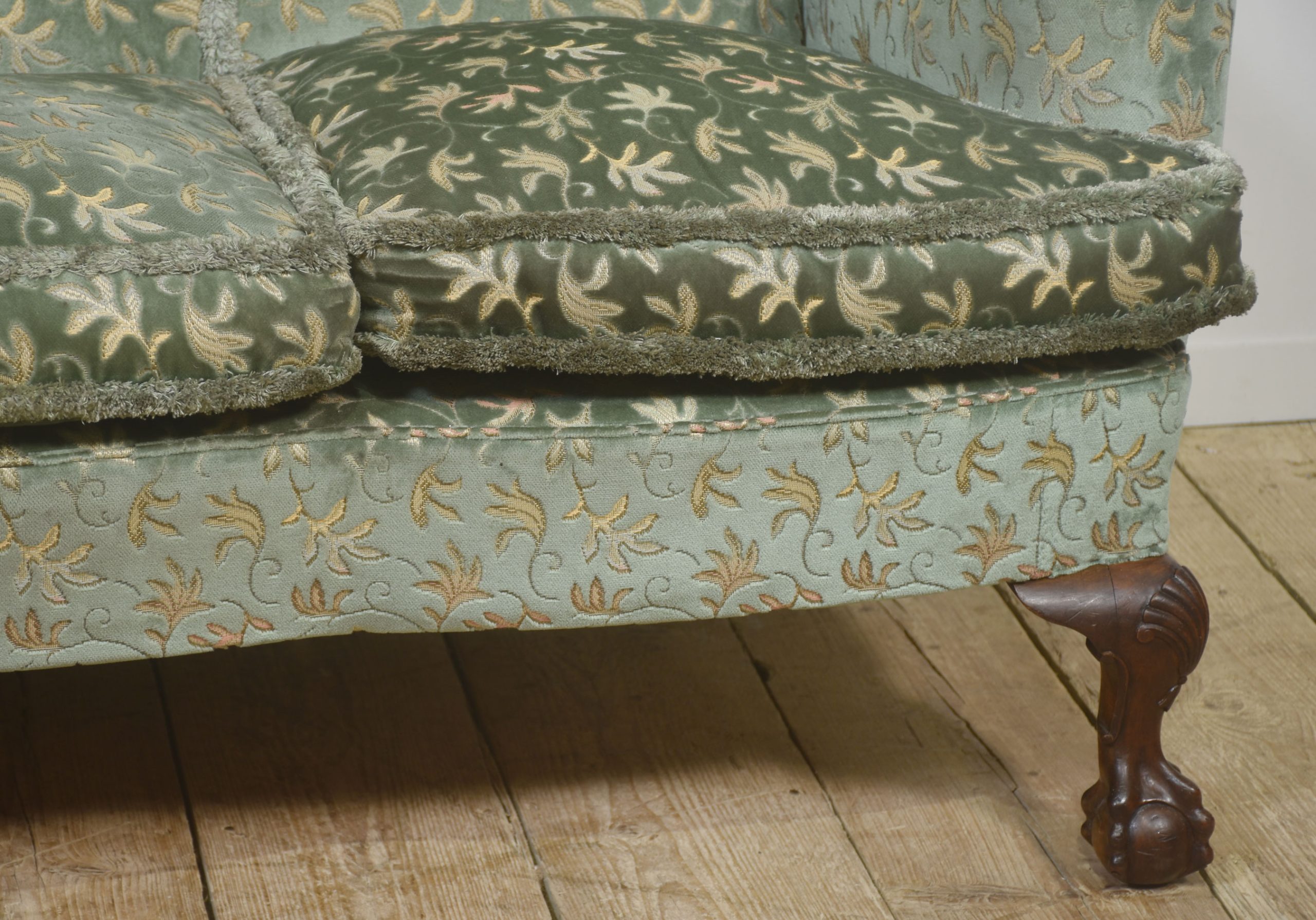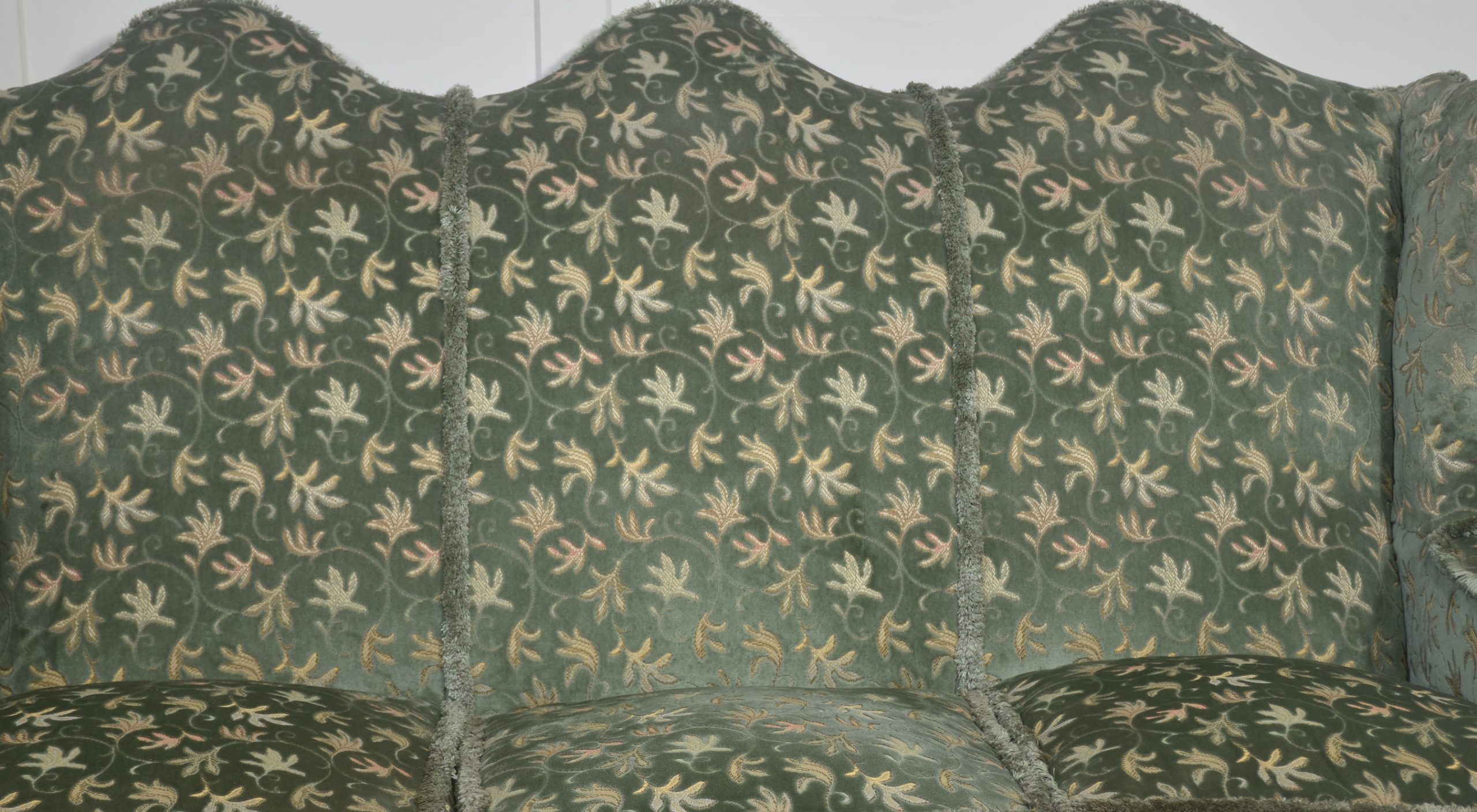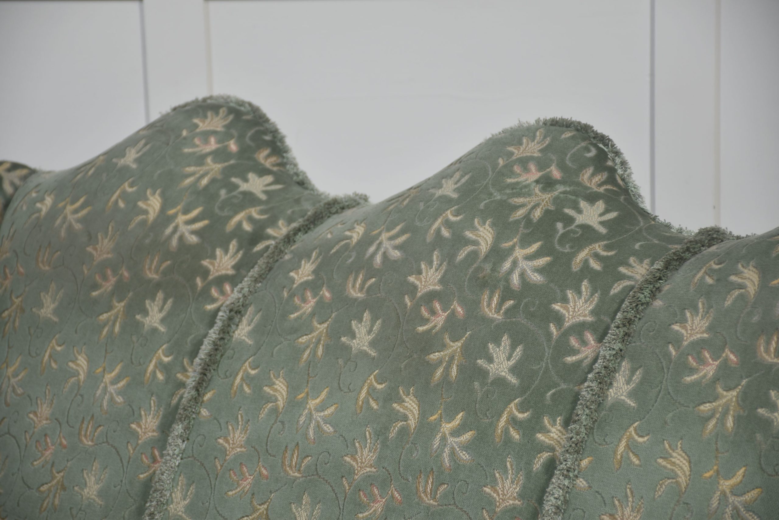 The sofa is upholstered in a plush sage-green patterned fabric featuring an intricate leaf-and-vine motif in warm gold and soft blush tones. Matching loose seat cushions with coordinating fringe trim add both comfort and charm. The upholstery presents an appealing aged patina, enhancing its decorative appeal.