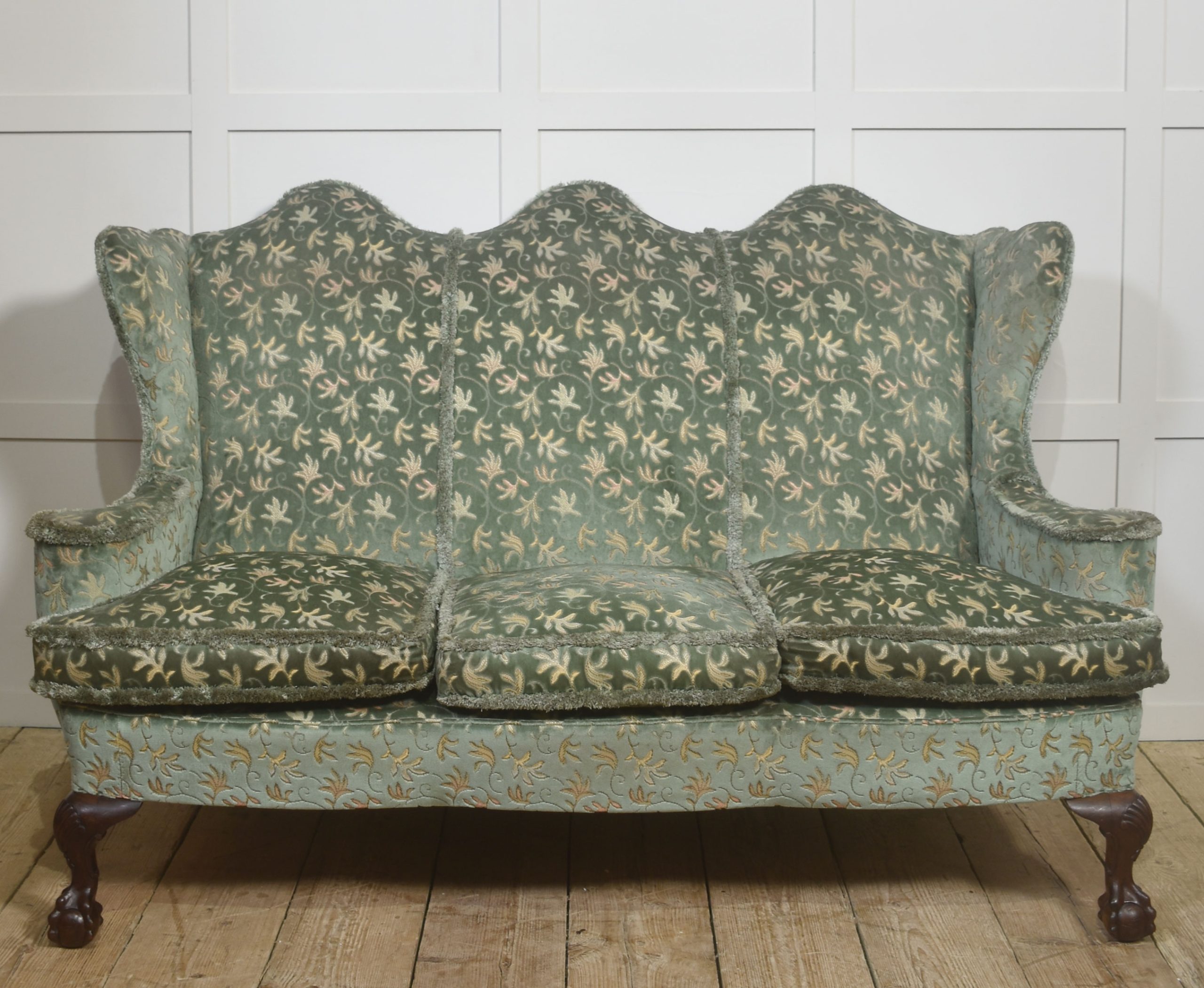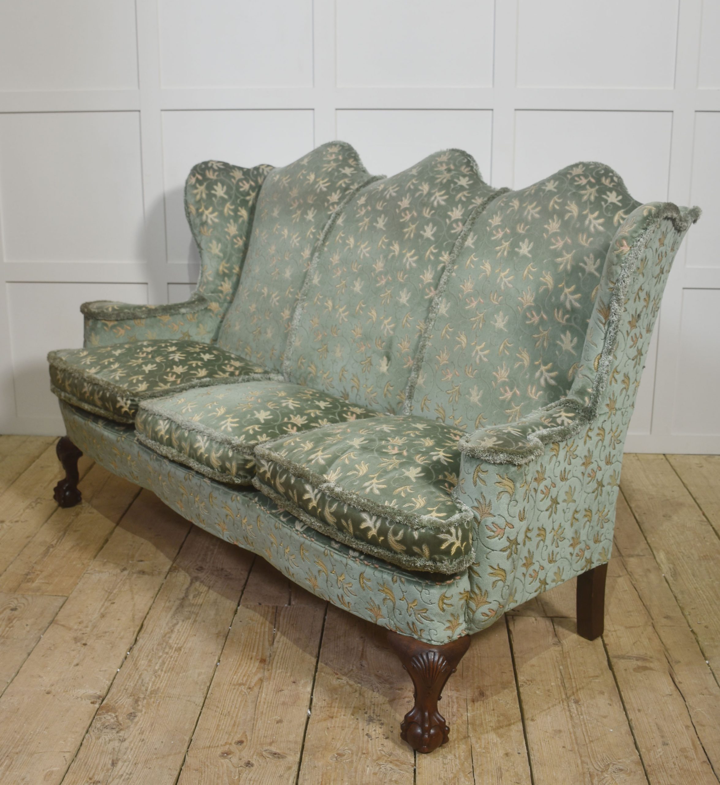 Bring refined character into your space with this beautifully upholstered three-seat sofa, distinguished by its graceful silhouette and richly detailed craftsmanship. The gently scalloped backrest, paired with softly flared winged sides, creates an inviting and sculptural profile from every angle.