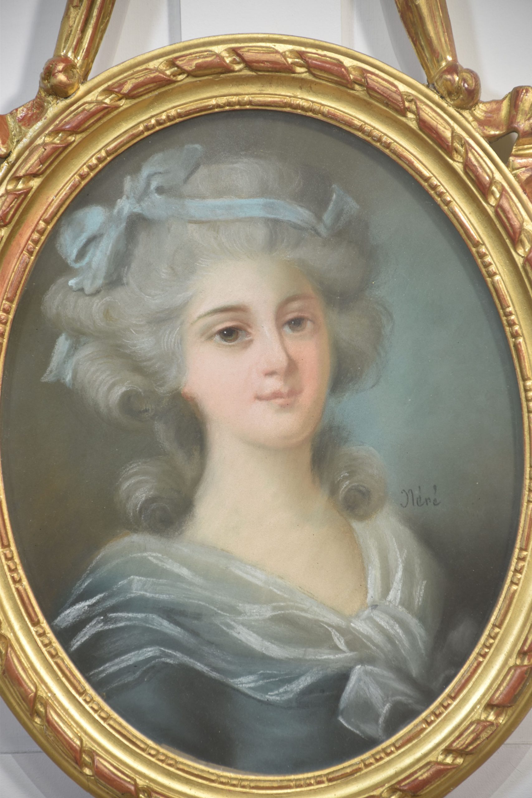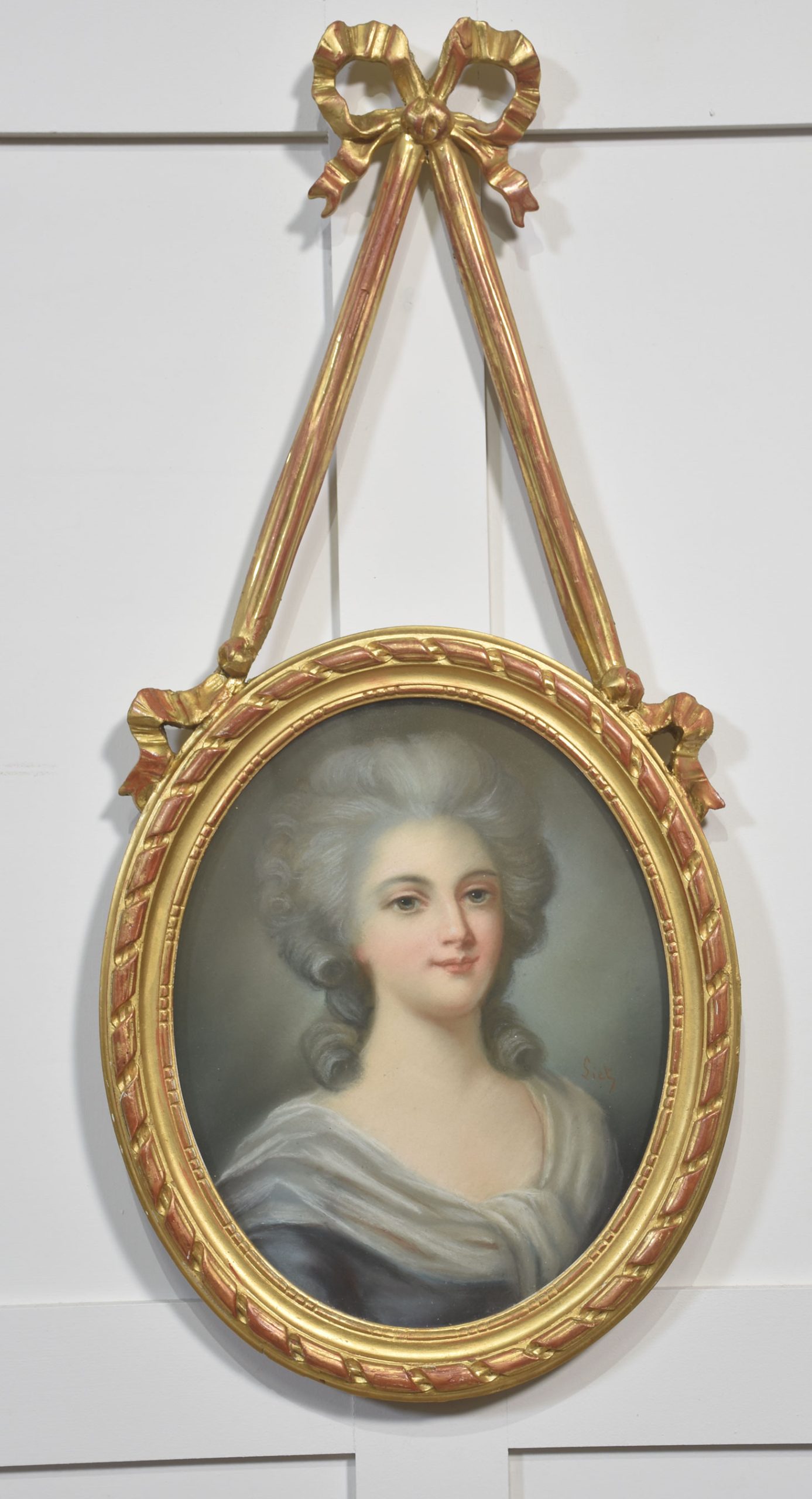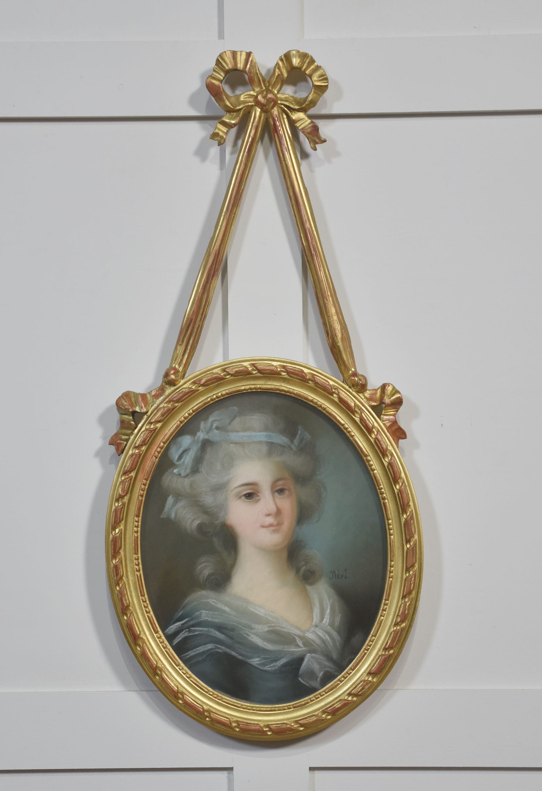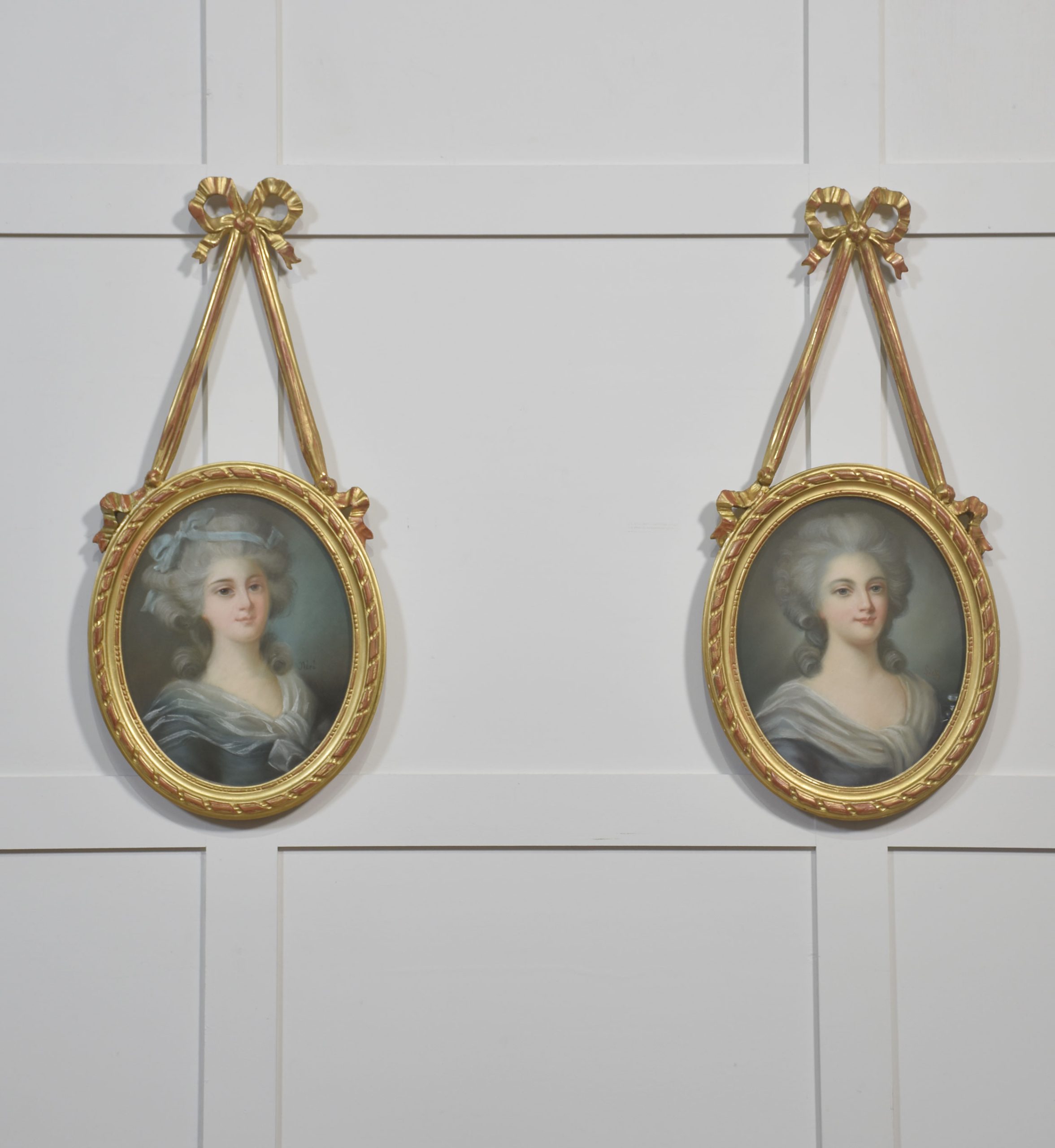 Both portraits are presented in matching oval giltwood frames surmounted by ribbon-and-bow crests, in the Louis XVI taste. The gilded frames feature intricate rope and laurel detailing, finished in a warm gold tone with subtle red bole undertones.