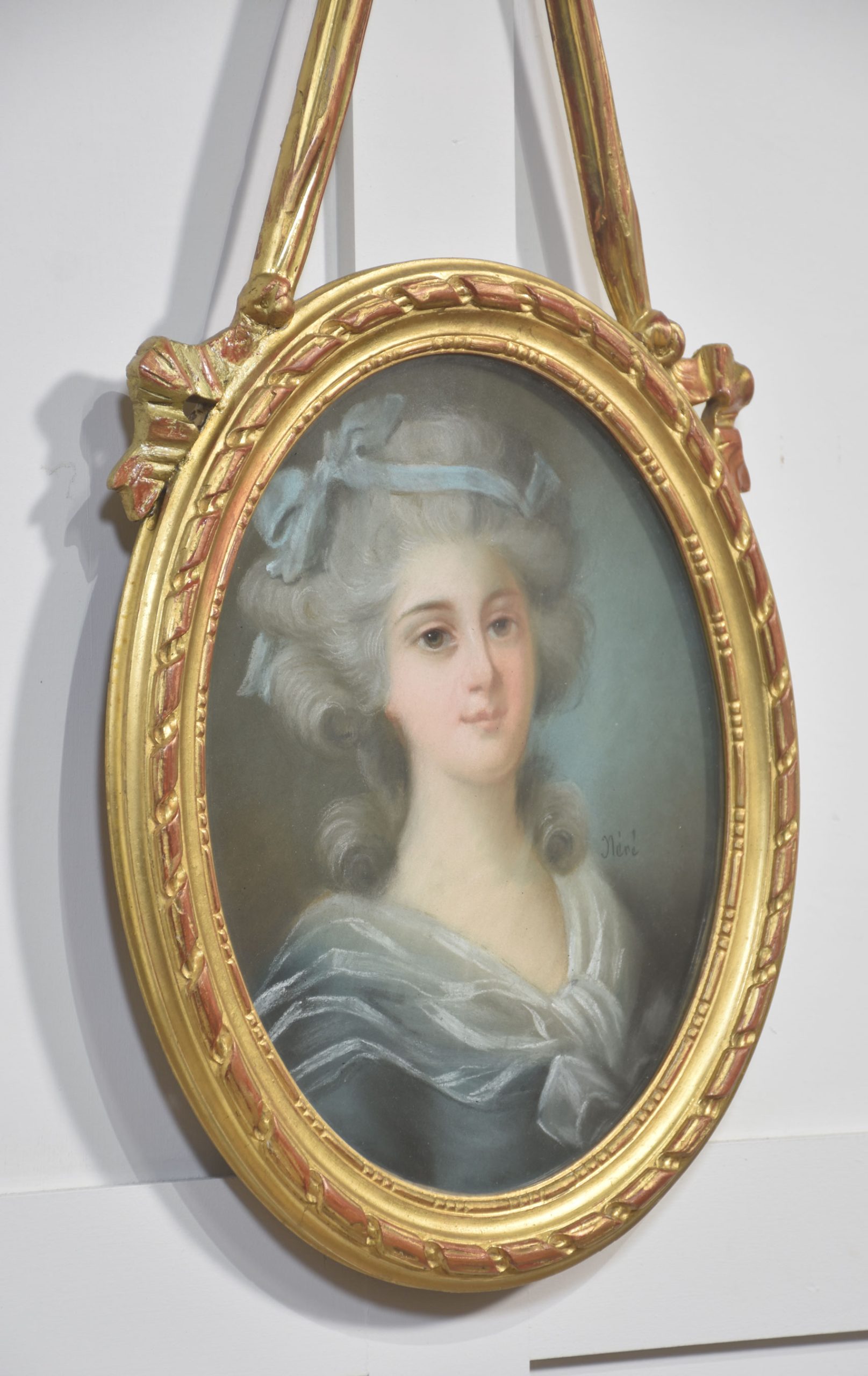 A refined pair of 19th-century French pastel portraits depicting elegant ladies in late 18th-century attire. Each portrait captures a poised woman with softly powdered hair, gently curled and adorned with delicate blue ribbons, dressed in finely draped garments of pale blue and silvery grey tones. Their serene expressions and luminous complexions are rendered with exceptional finesse, characteristic of the Neoclassical style.