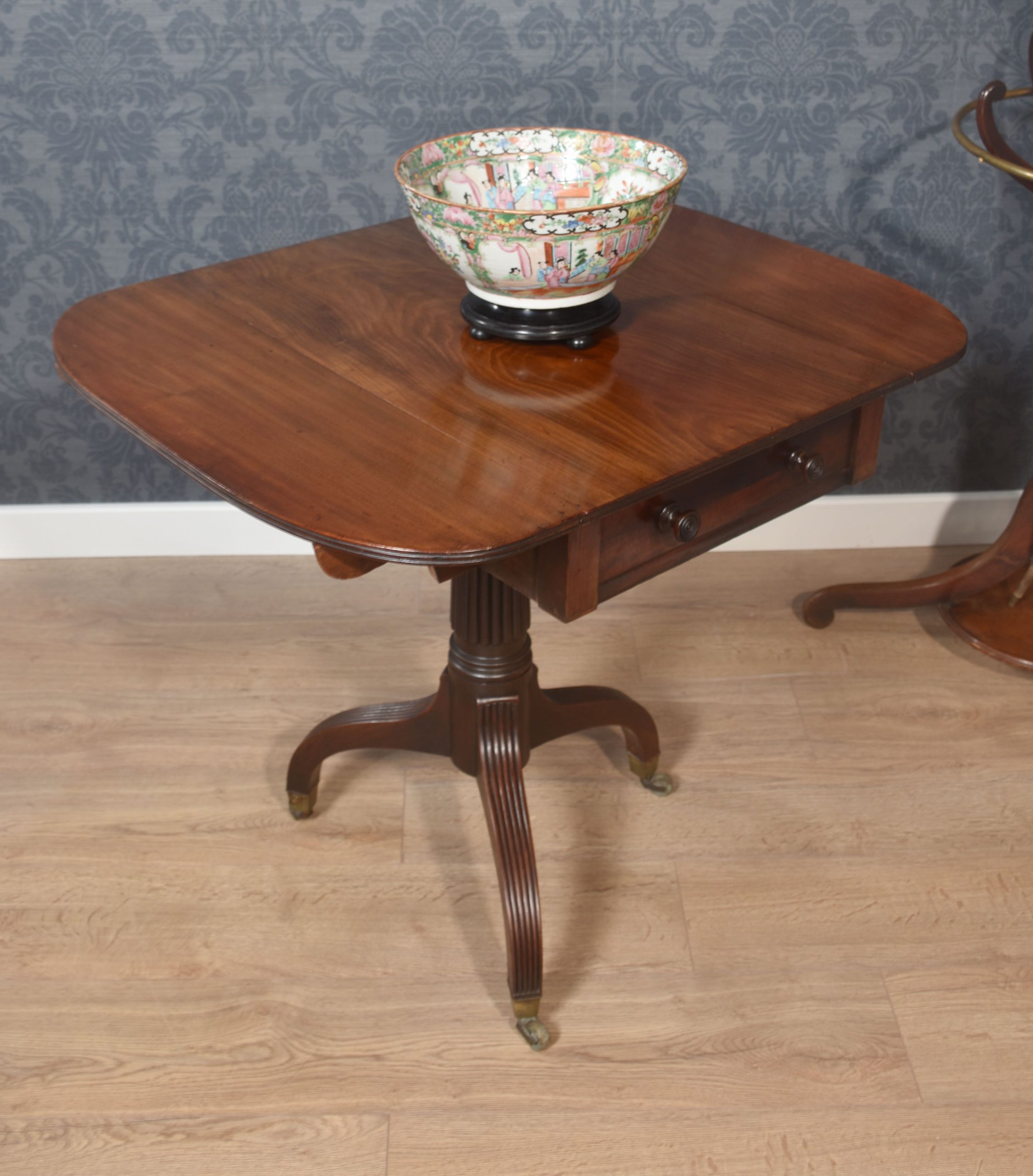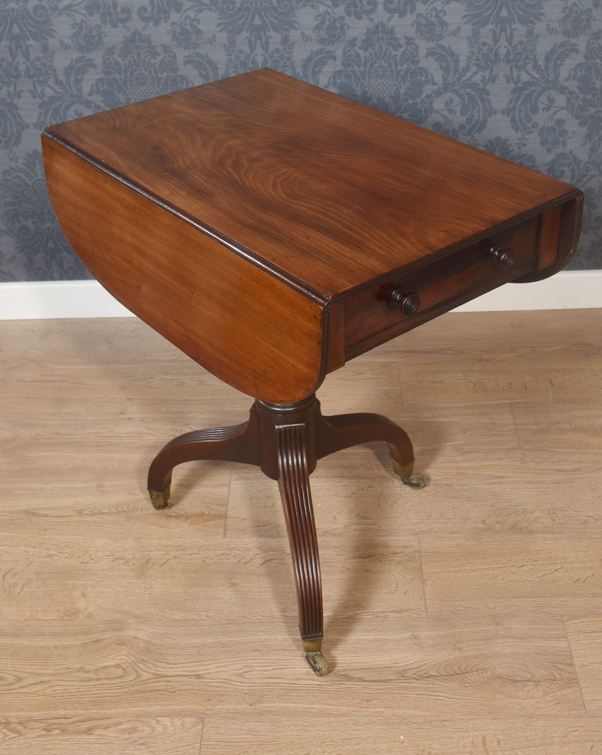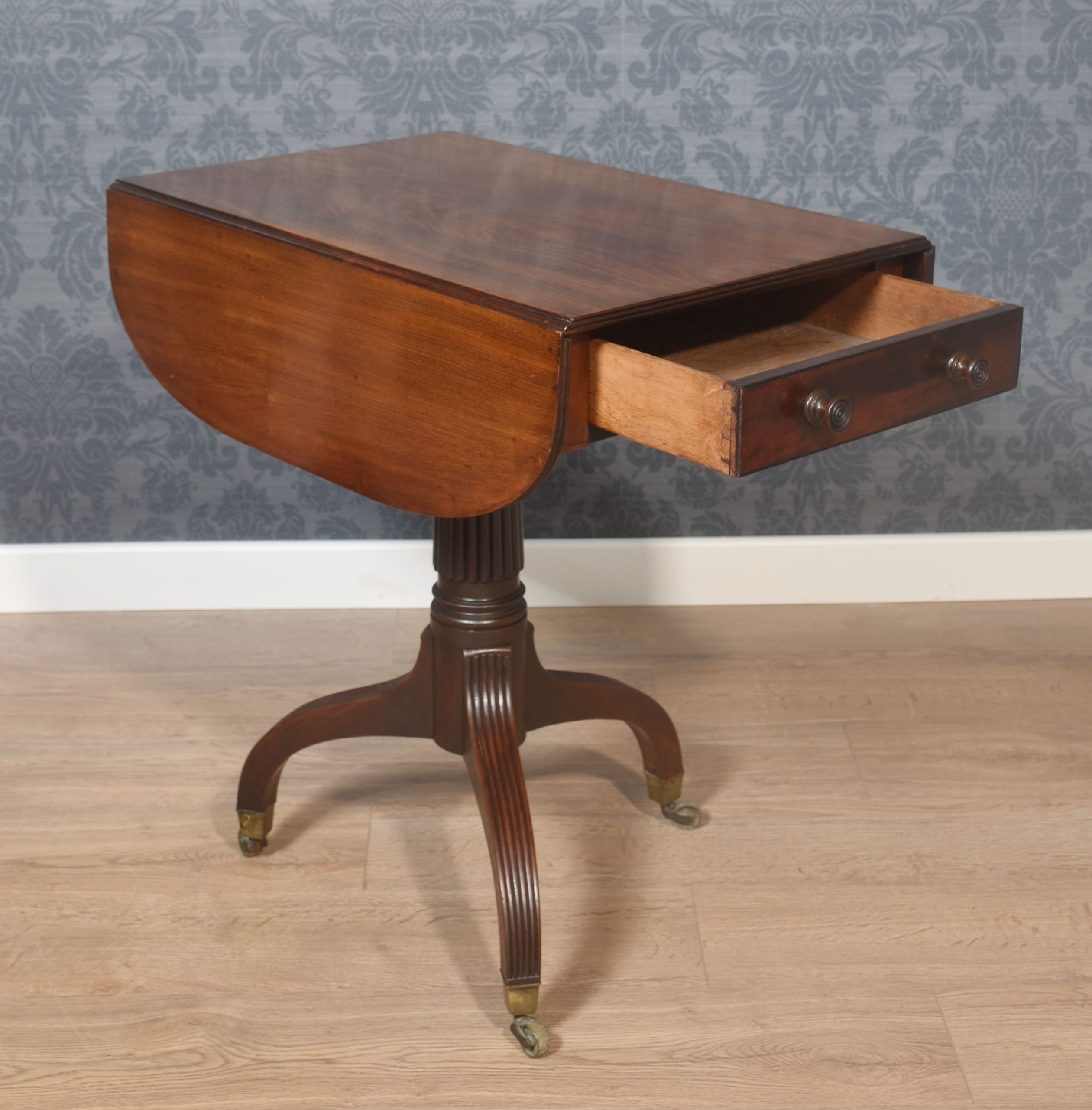 Regency mahogany lamp table, the rectangular top with lift-up ends having rounded corners. To the freeze fitted with drawer having turned knob handles. Supported on a turned reeded stem All raised up on splayed legs terminating in castors.