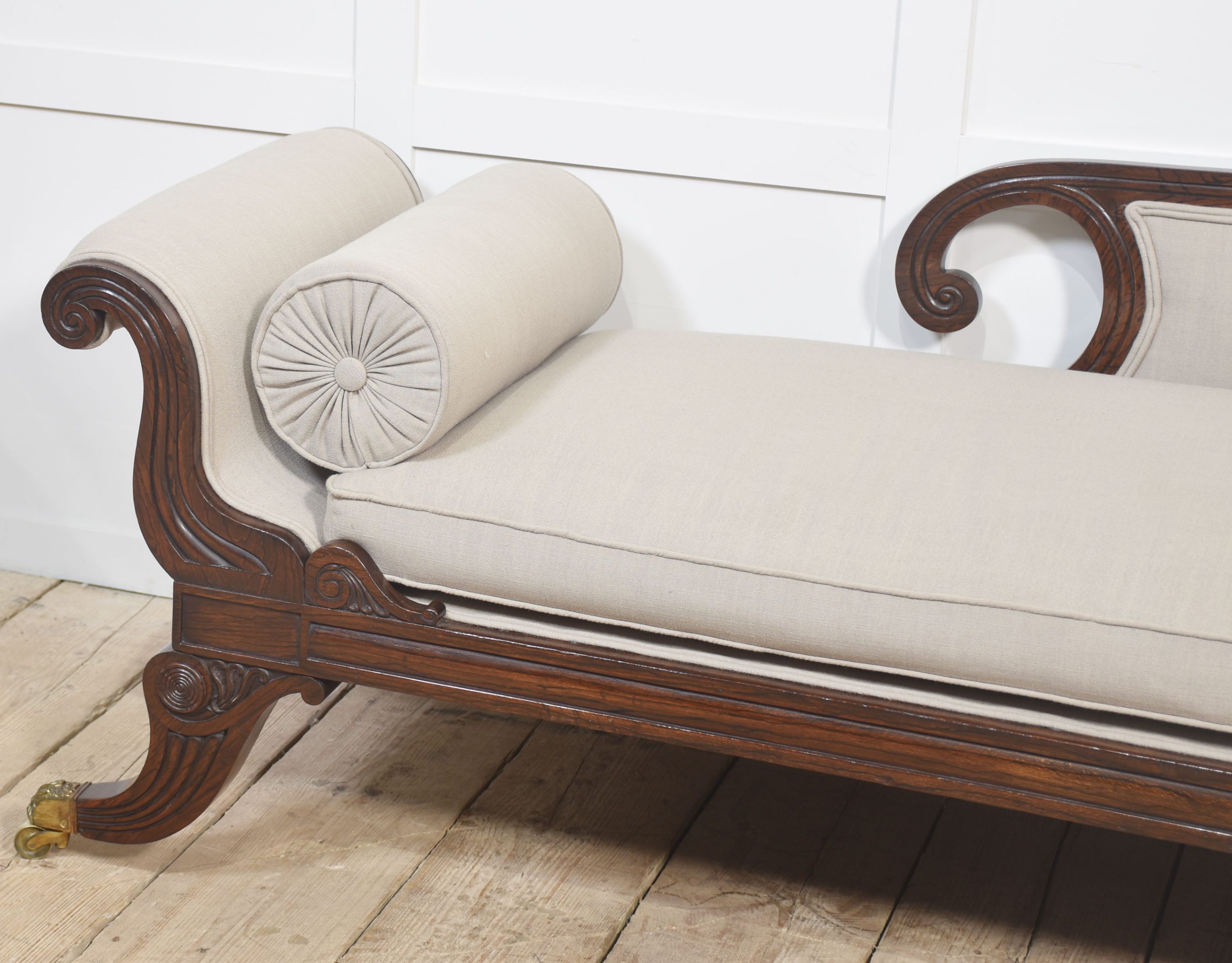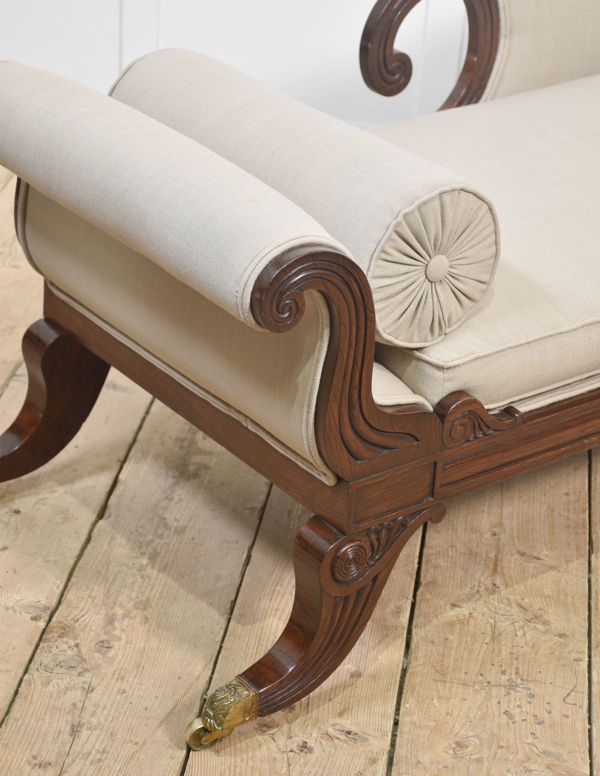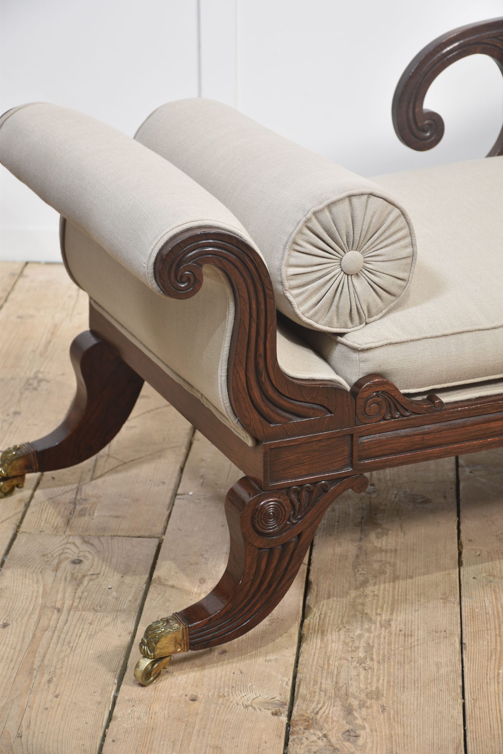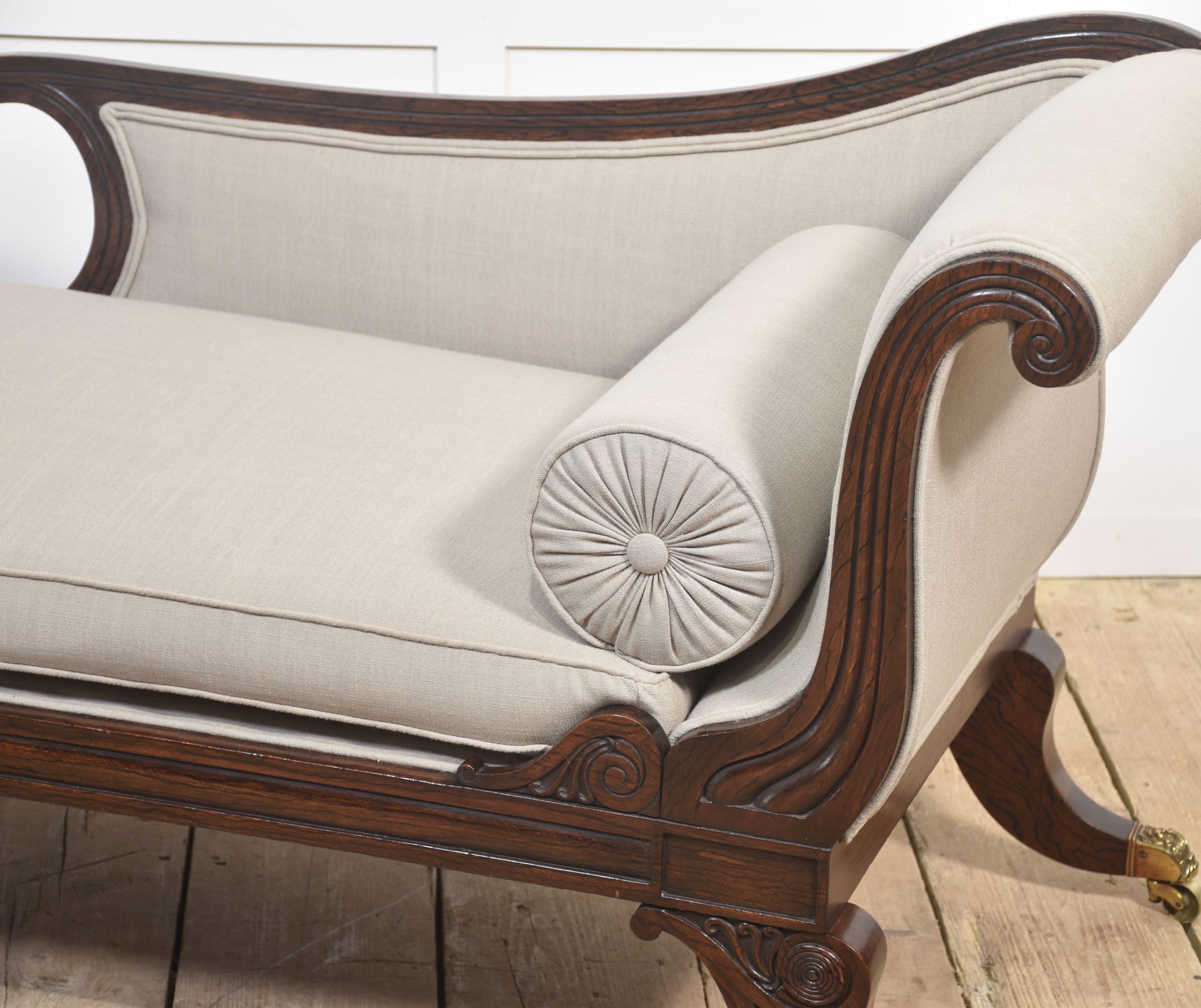 Regency Rosewood Chaise Lounge – Featuring a carved back rail above an upholstered back, a graceful scroll arm, and a loose cushion seat. The piece is supported by elegantly curved sabre legs, finished with brass caps and castors.