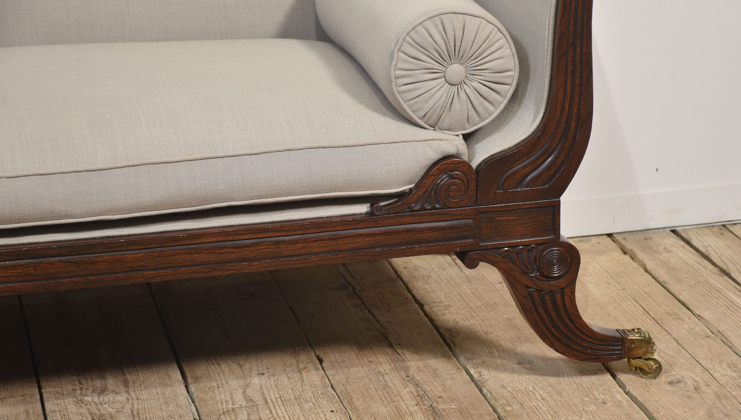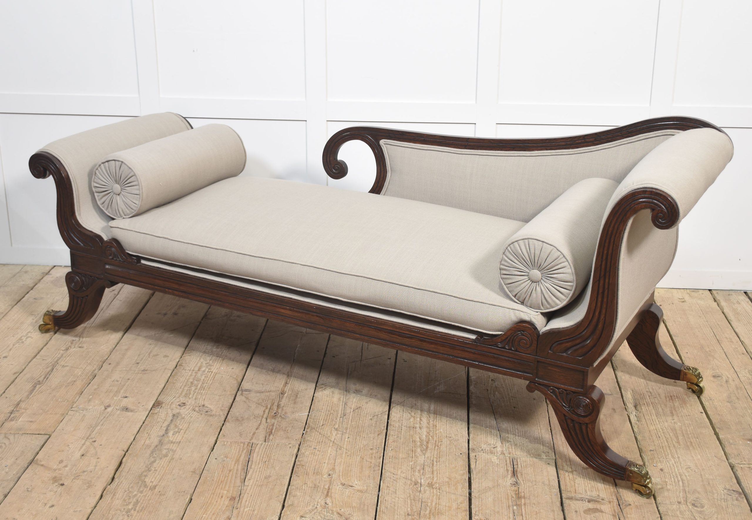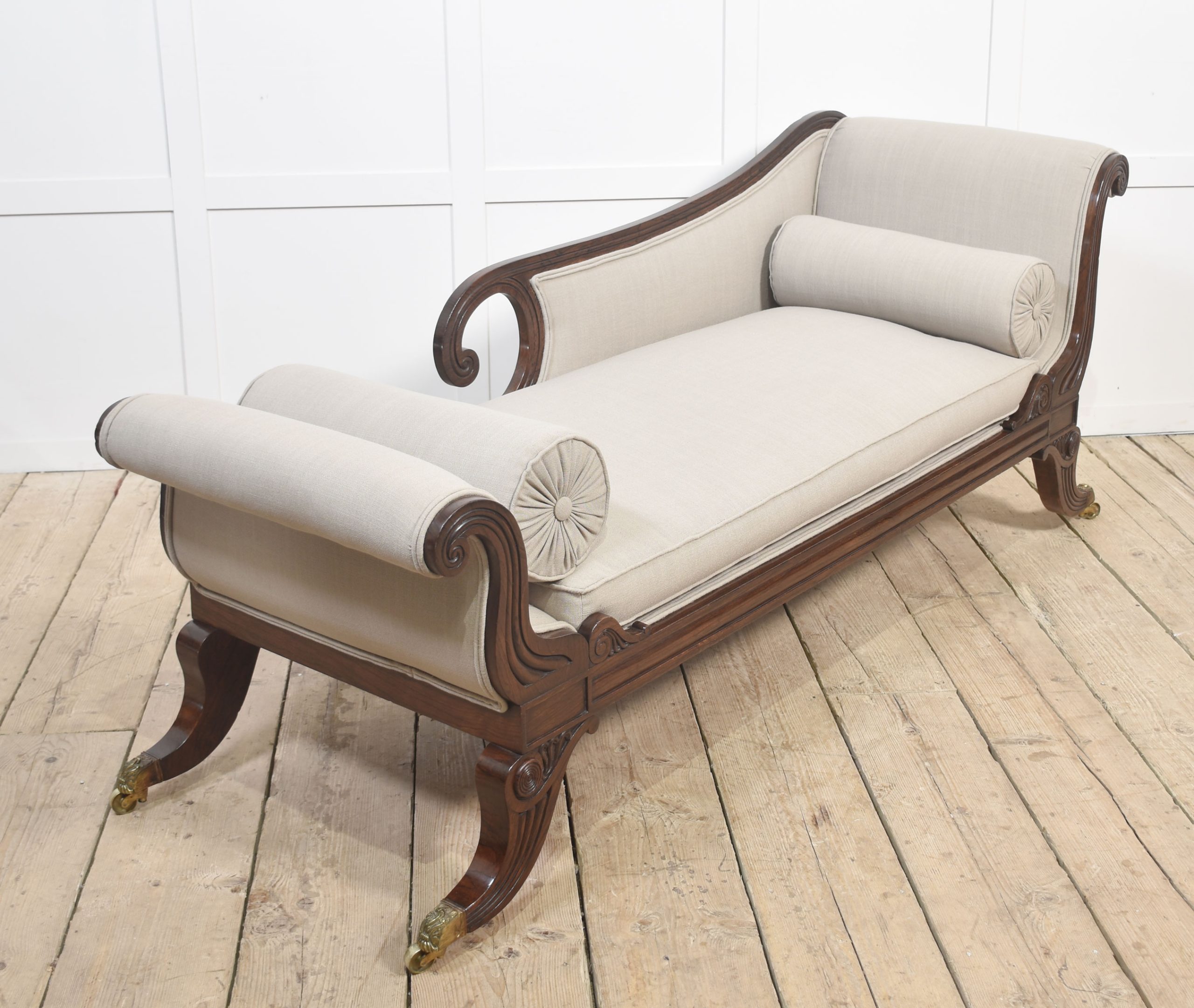 Regency Rosewood Chaise Lounge – Featuring a carved back rail above an upholstered back, a graceful scroll arm, and a loose cushion seat. The piece is supported by elegantly curved sabre legs, finished with brass caps and castors.