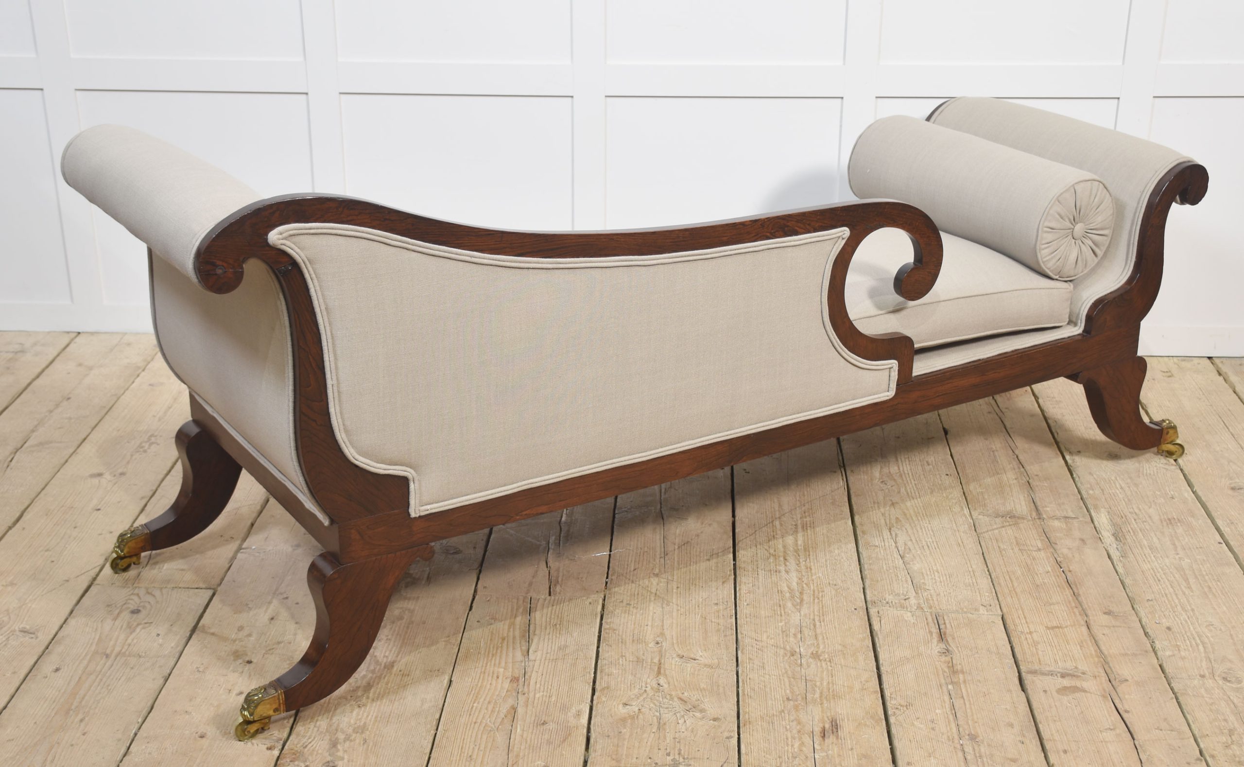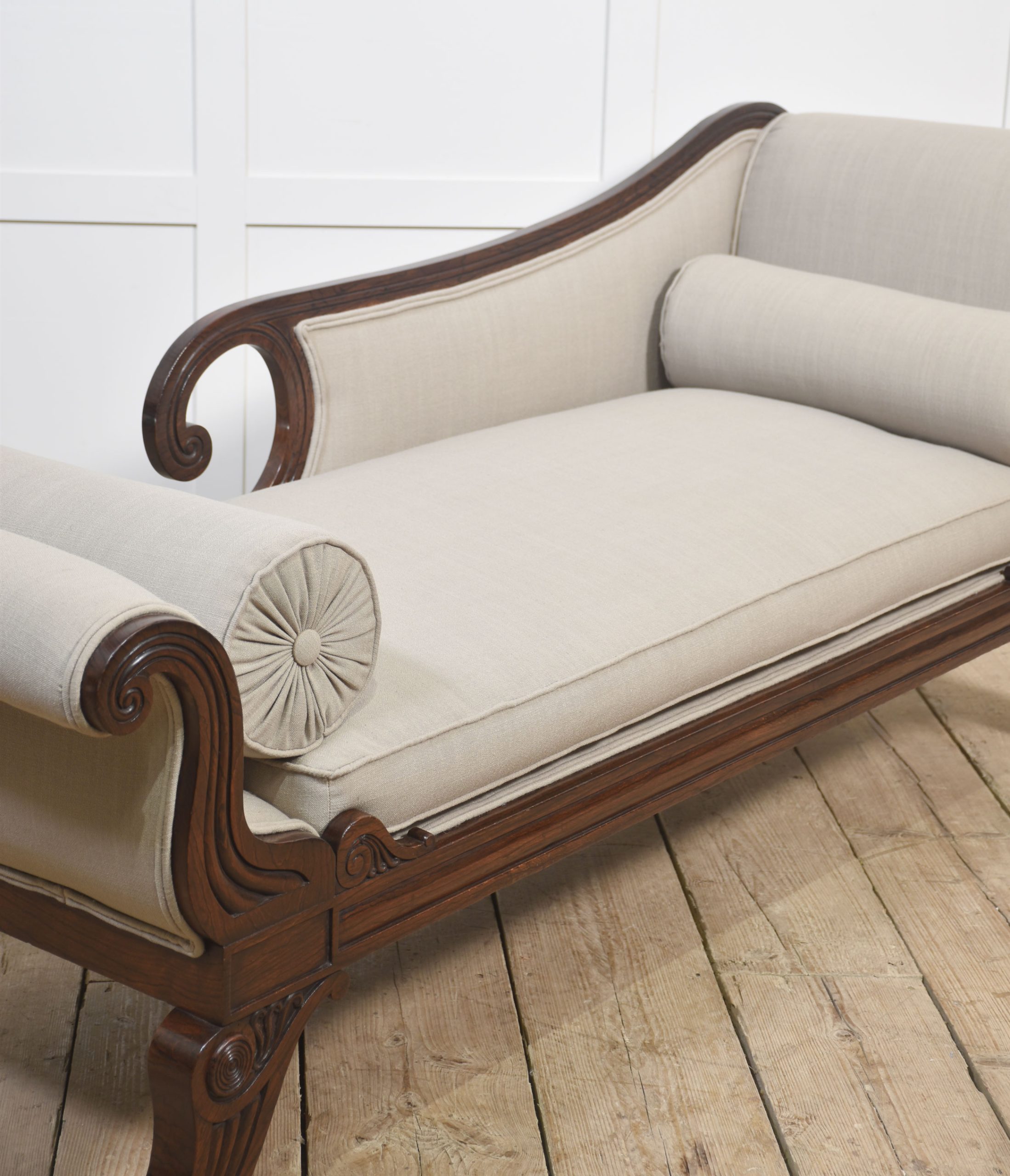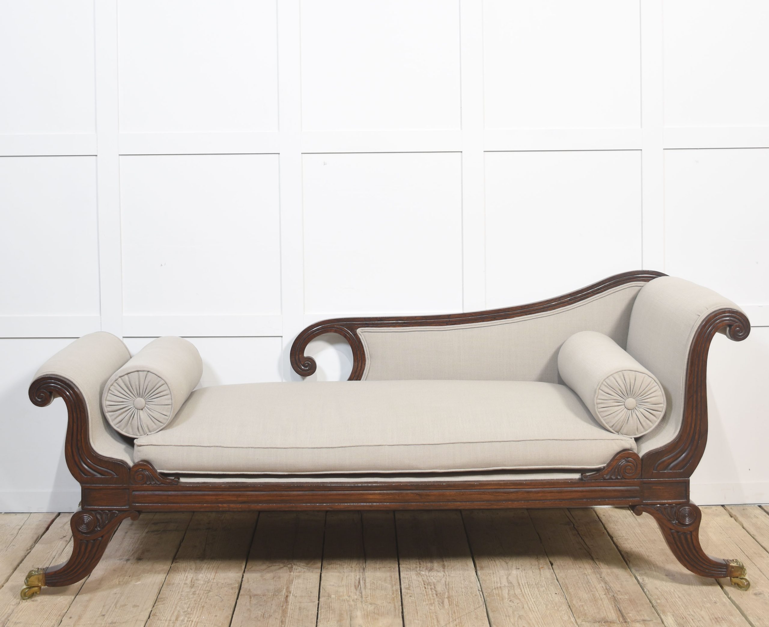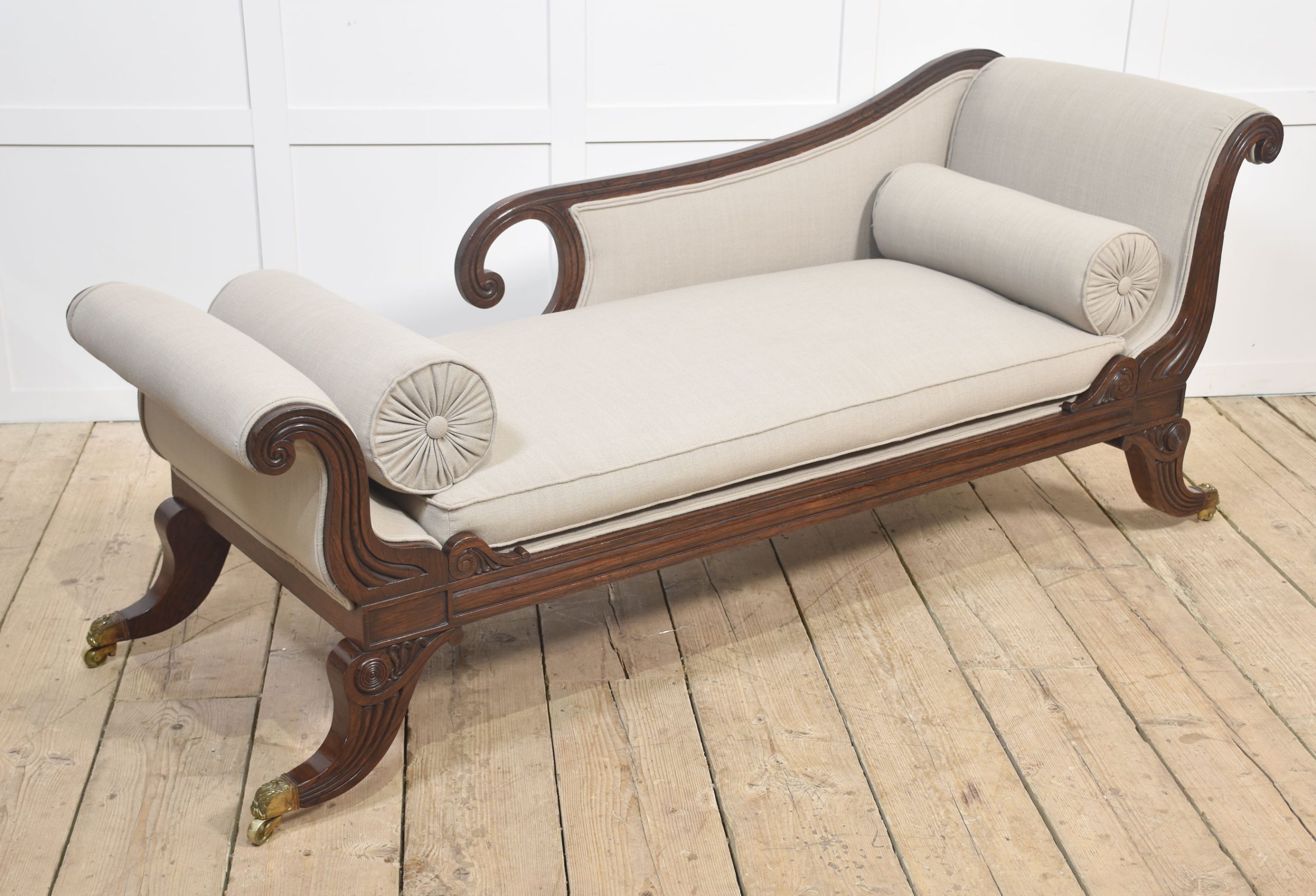 Regency Rosewood Chaise Lounge – Featuring a carved back rail above an upholstered back, a graceful scroll arm, and a loose cushion seat. The piece is supported by elegantly curved sabre legs, finished with brass caps and castors.