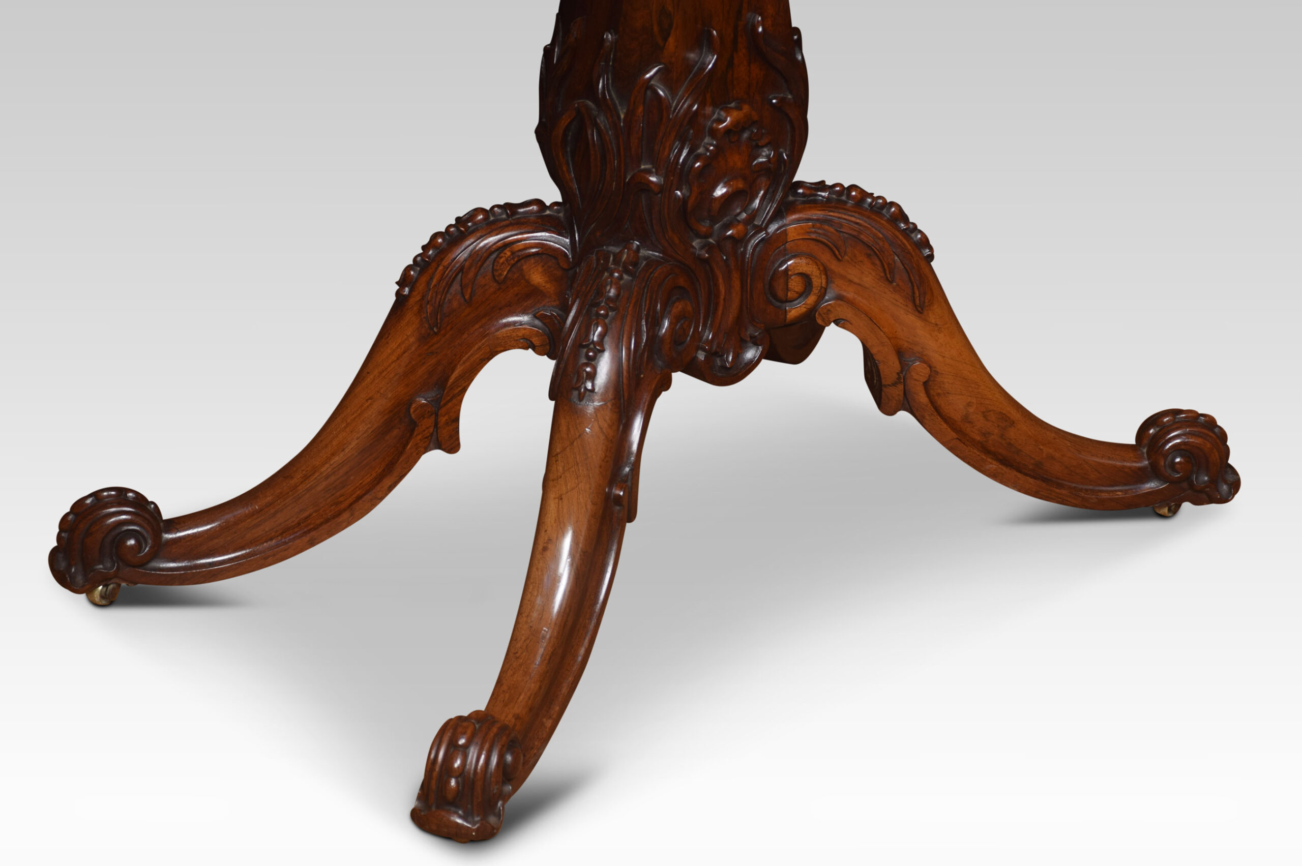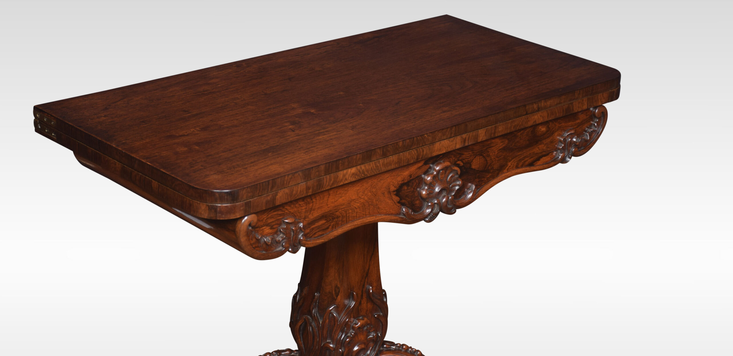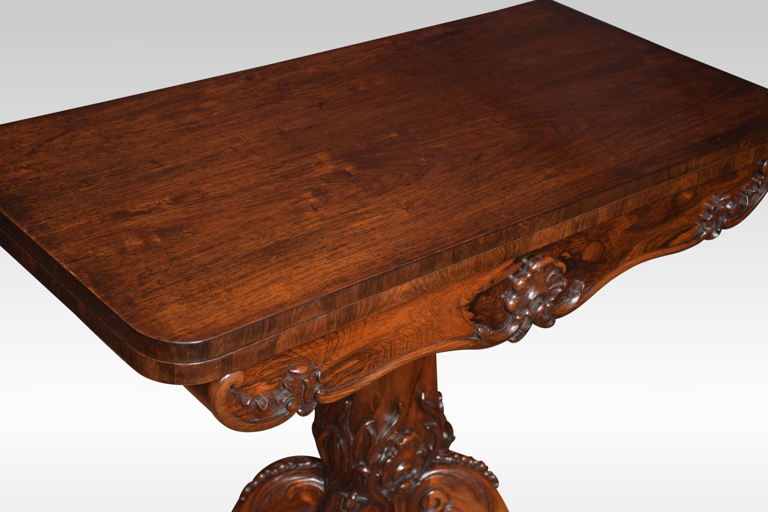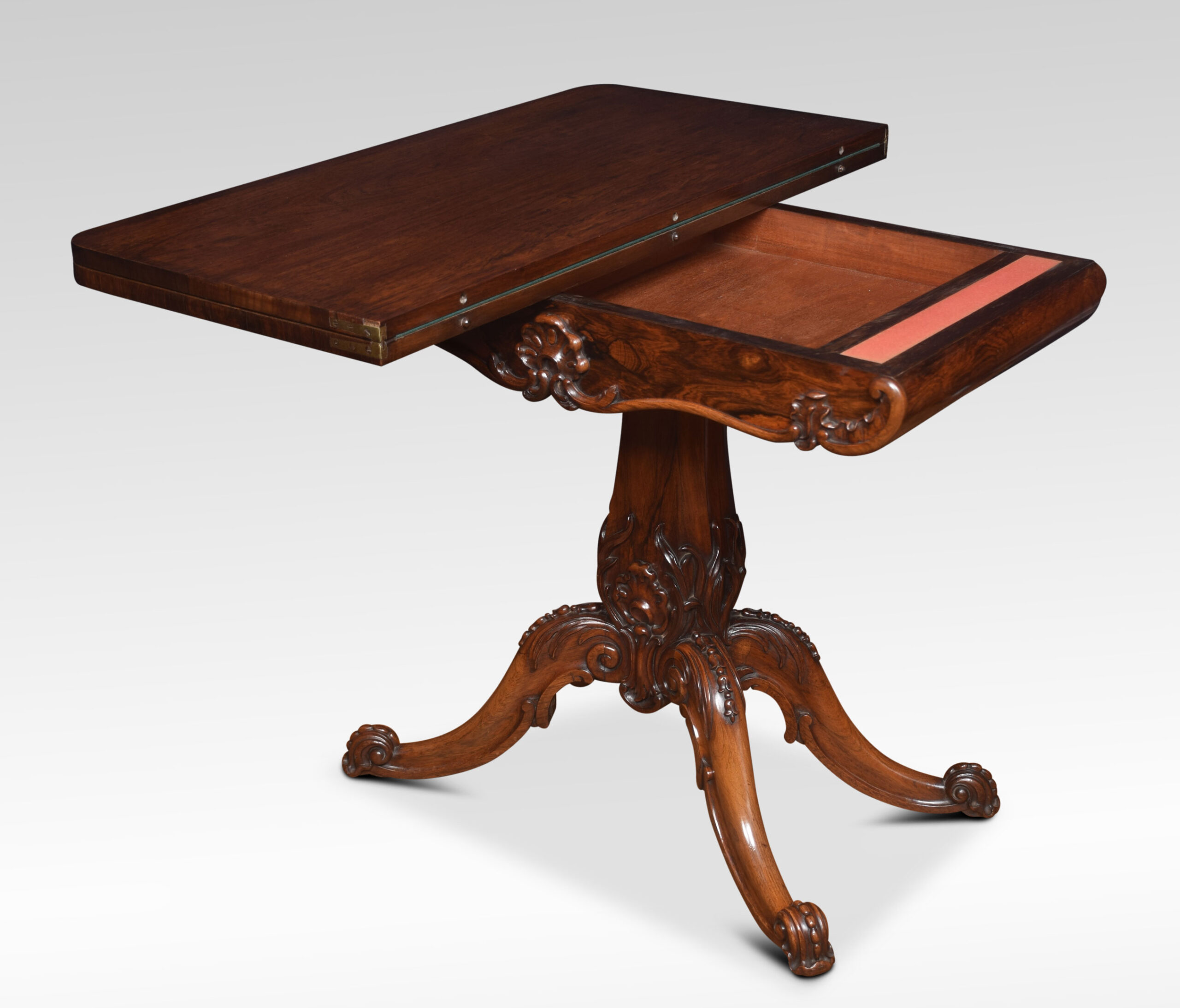Rosewood card table the rectangular top with rounded corners with central swivel top action, opening to reveal baize interior. All raised up on the scrolled apron and turned central column with acanthus carving, four cabriole legs terminating in scroll feet and brass casters.