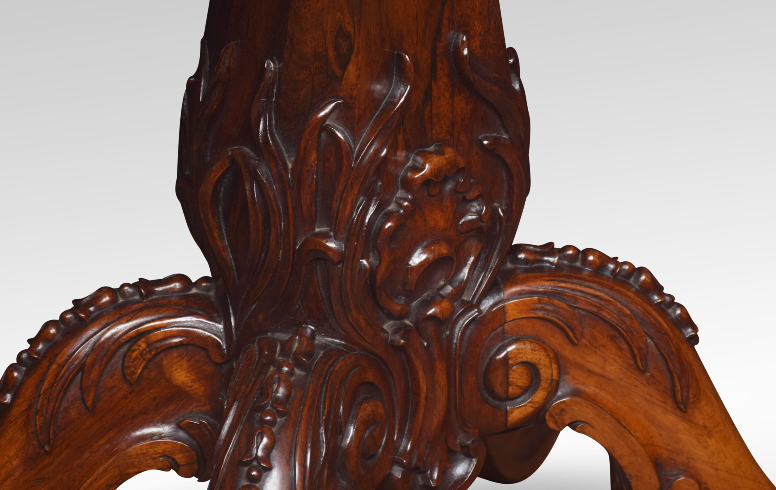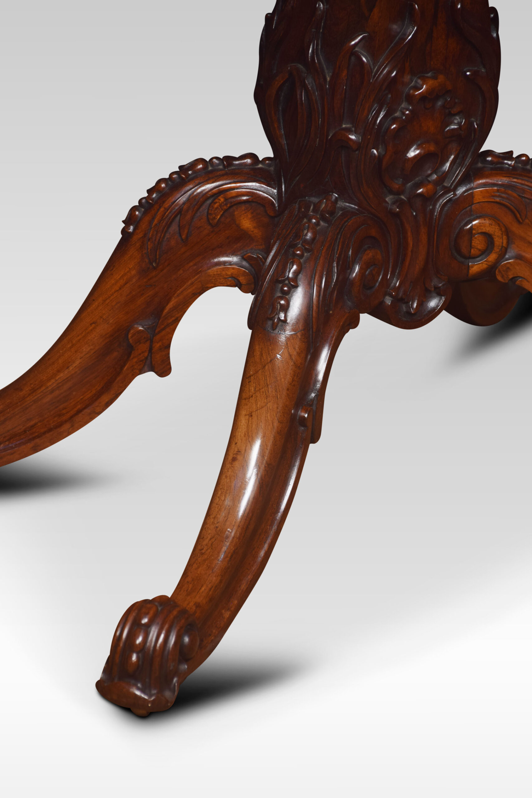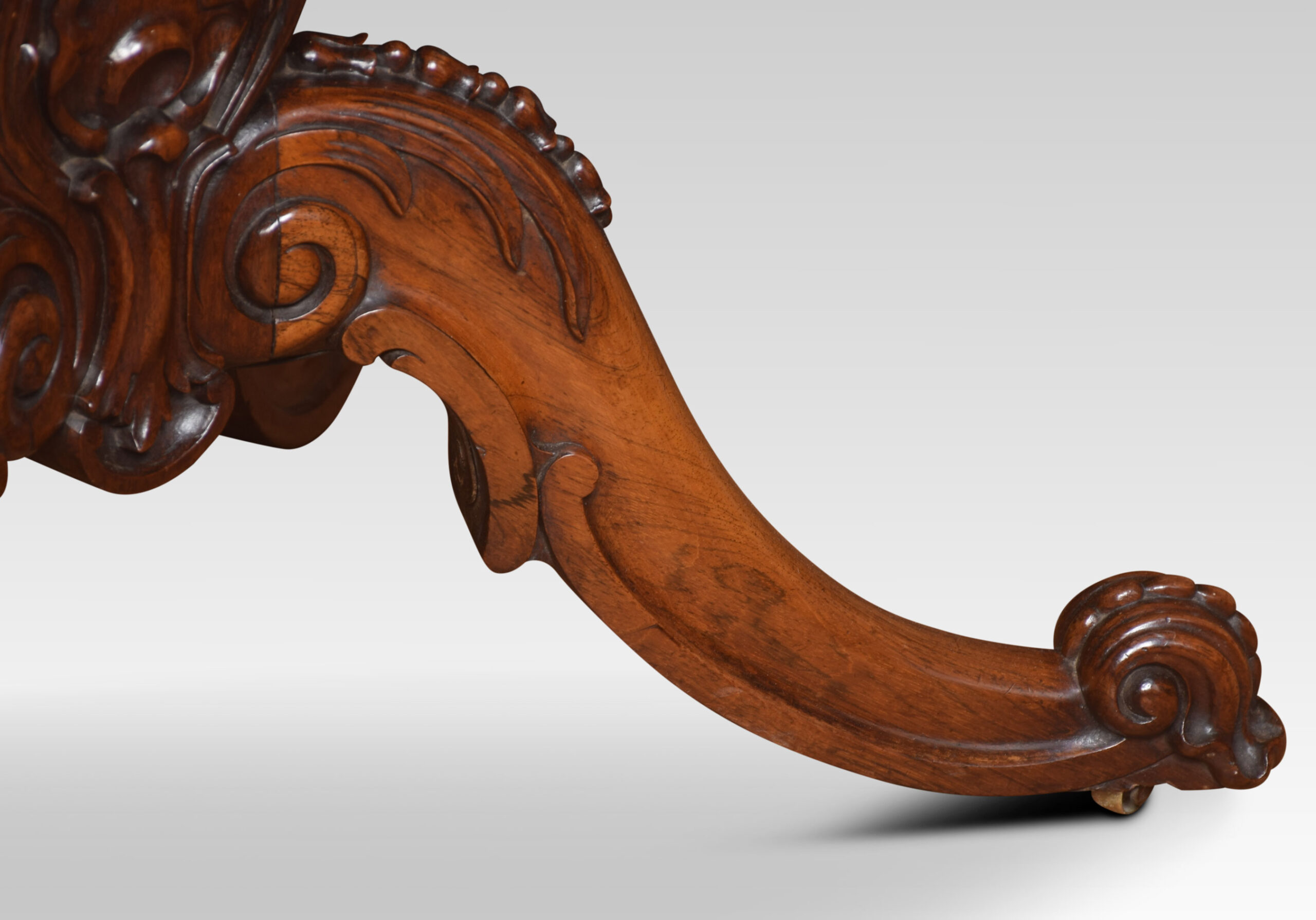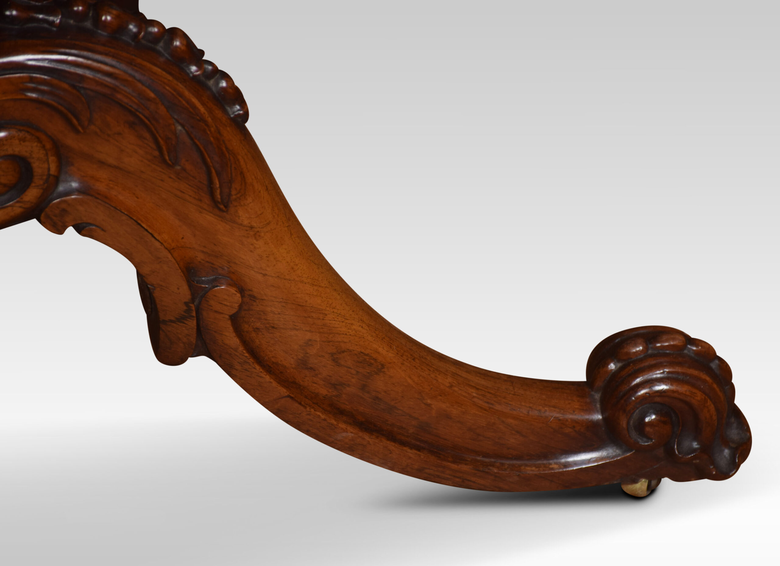 Rosewood card table the rectangular top with rounded corners with central swivel top action, opening to reveal baize interior. All raised up on the scrolled apron and turned central column with acanthus carving, four cabriole legs terminating in scroll feet and brass casters.