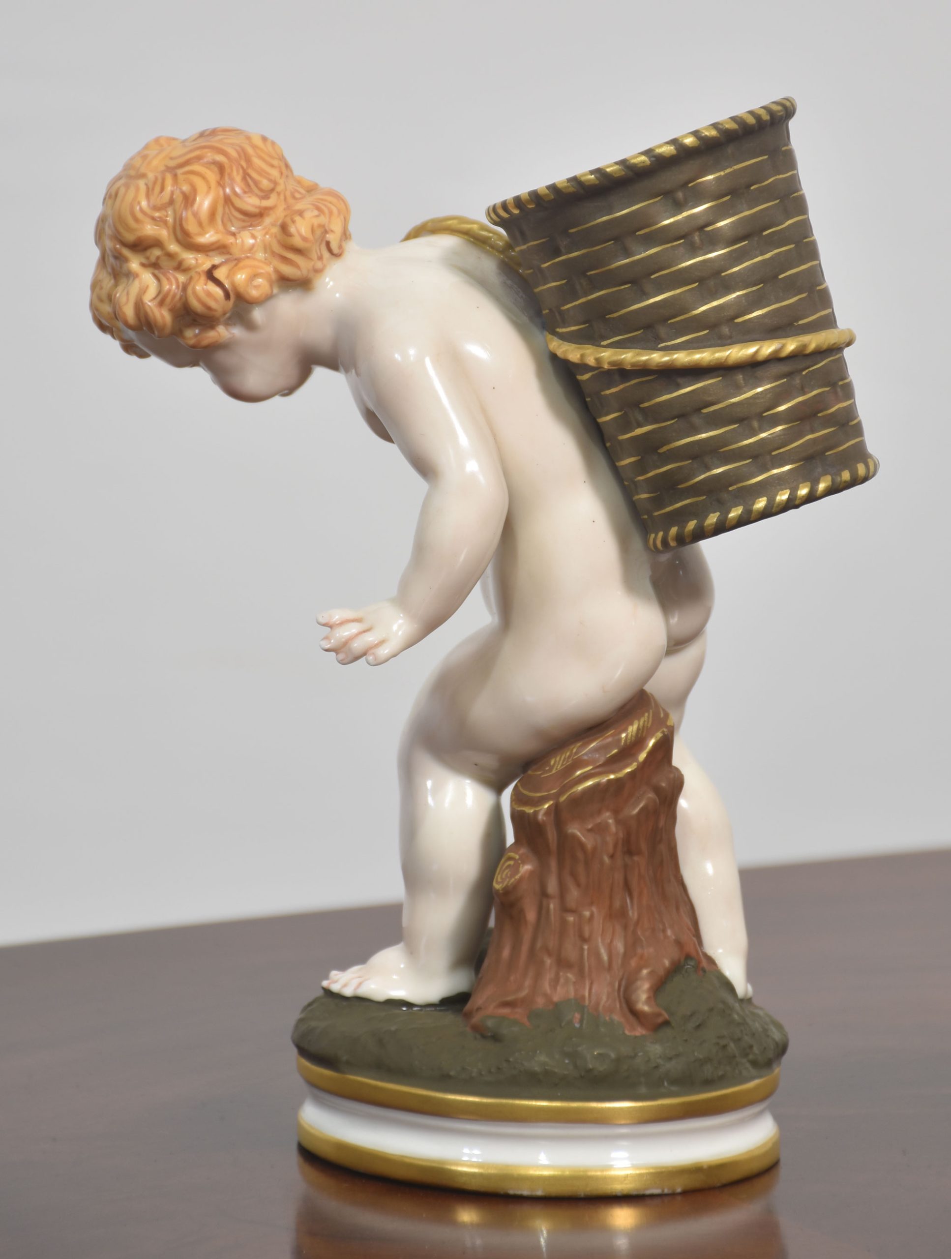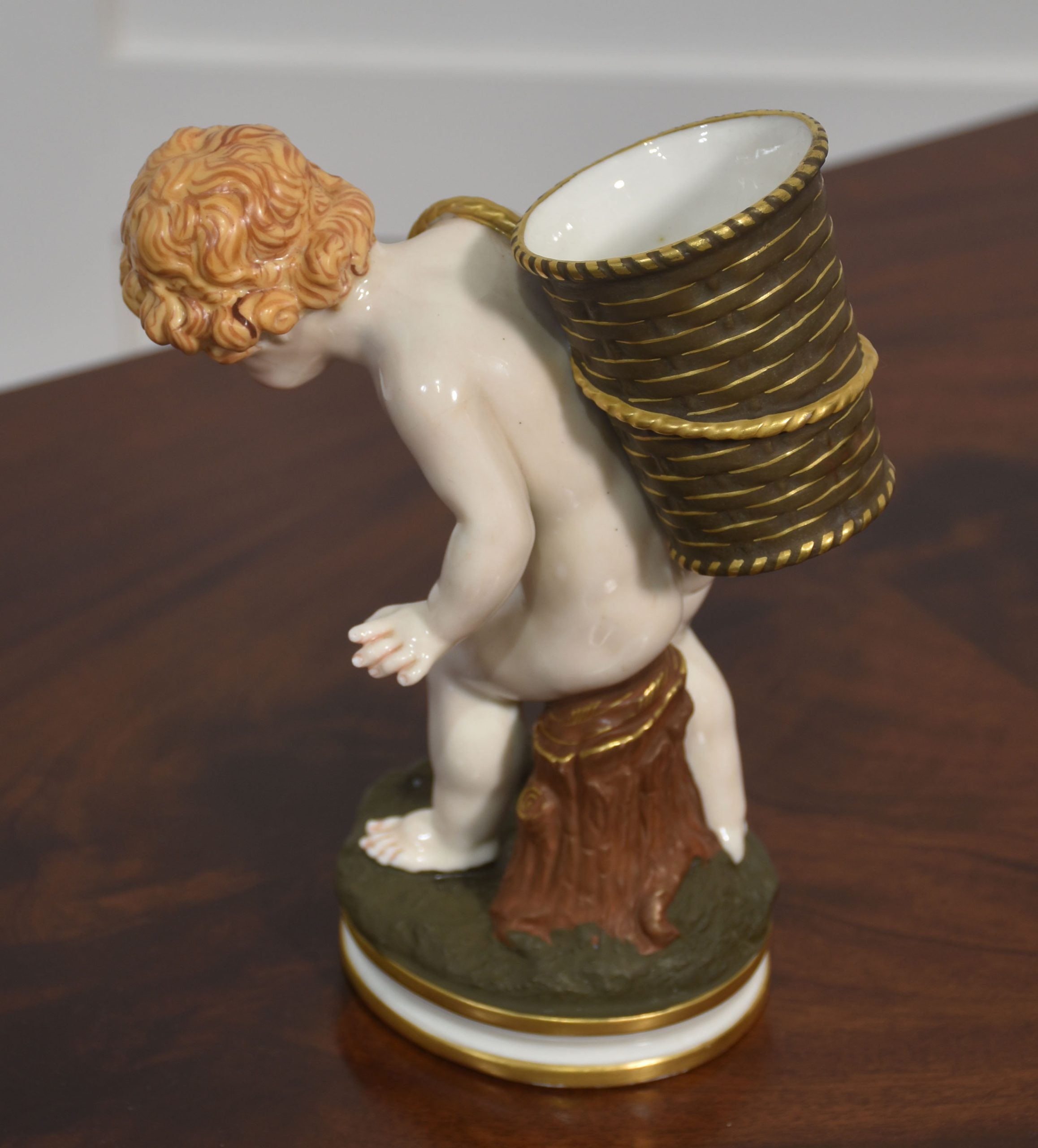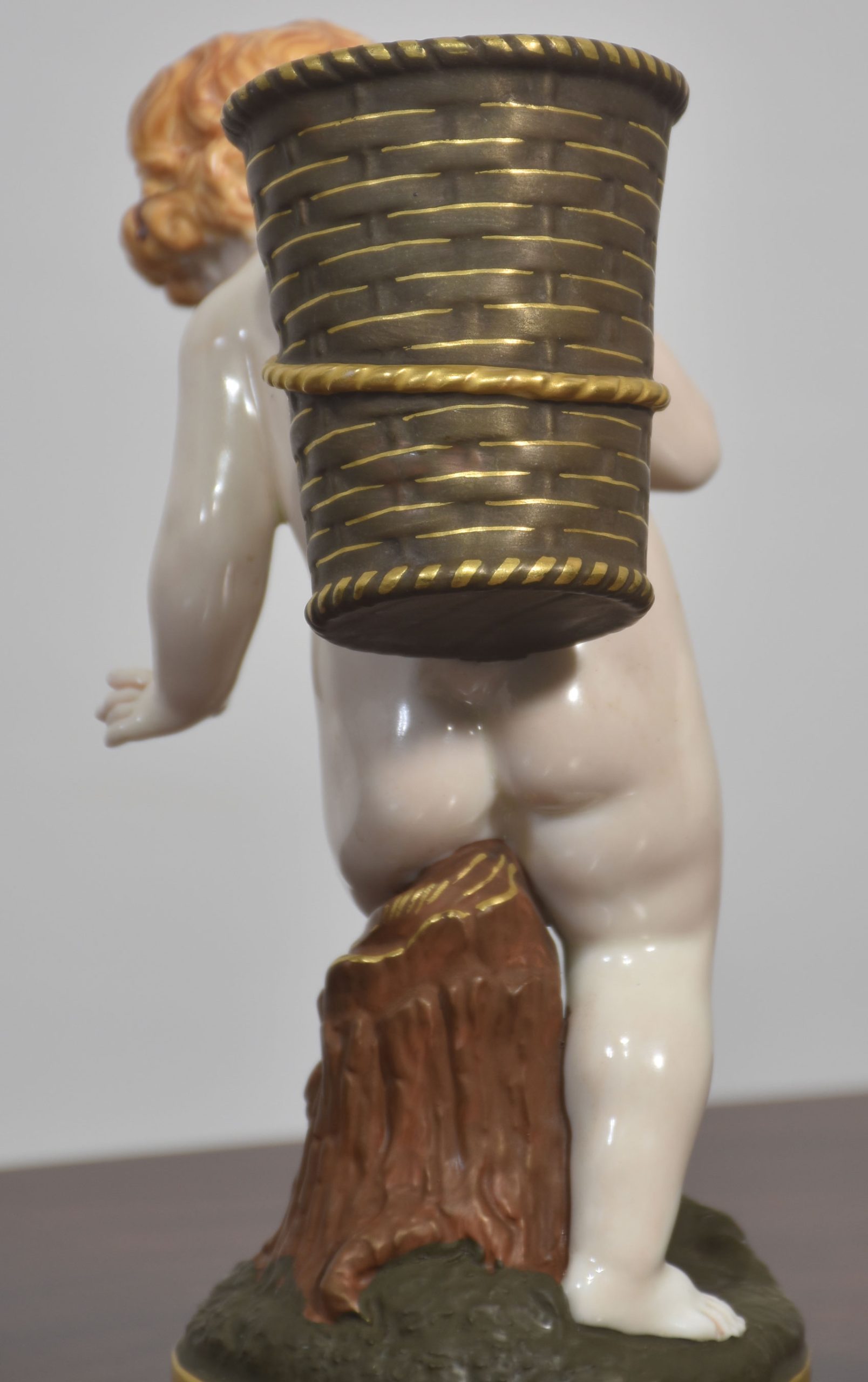 A beautifully crafted Royal Worcester porcelain figurine depicting a cherub carrying a large basket on its back. The figure is rendered with exquisite attention to detail, showcasing the soft modelling and delicate hand-painting characteristic of Royal Worcester’s fine porcelain.