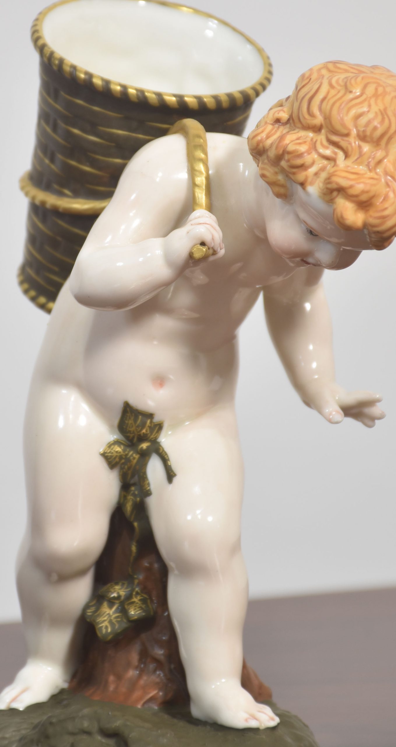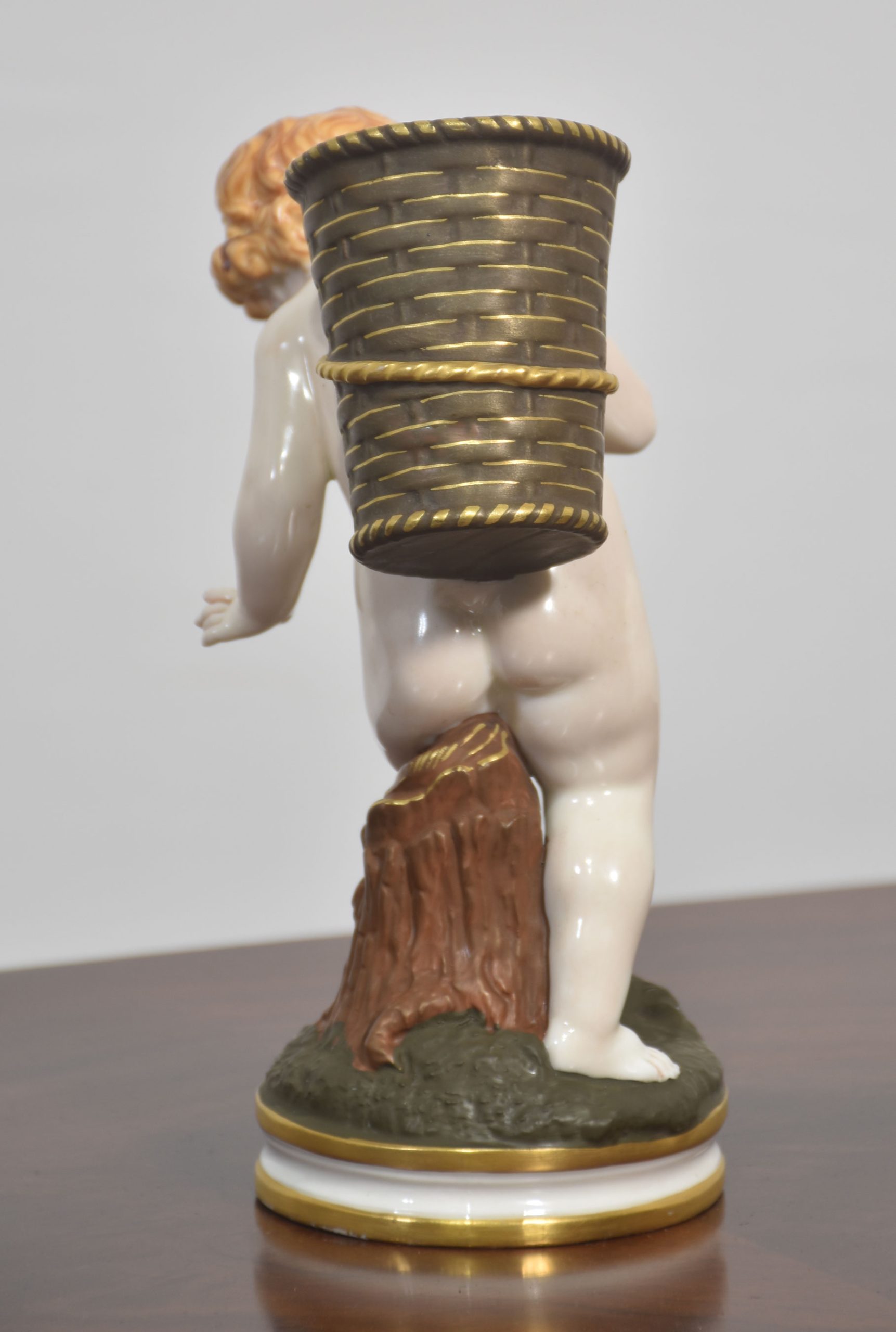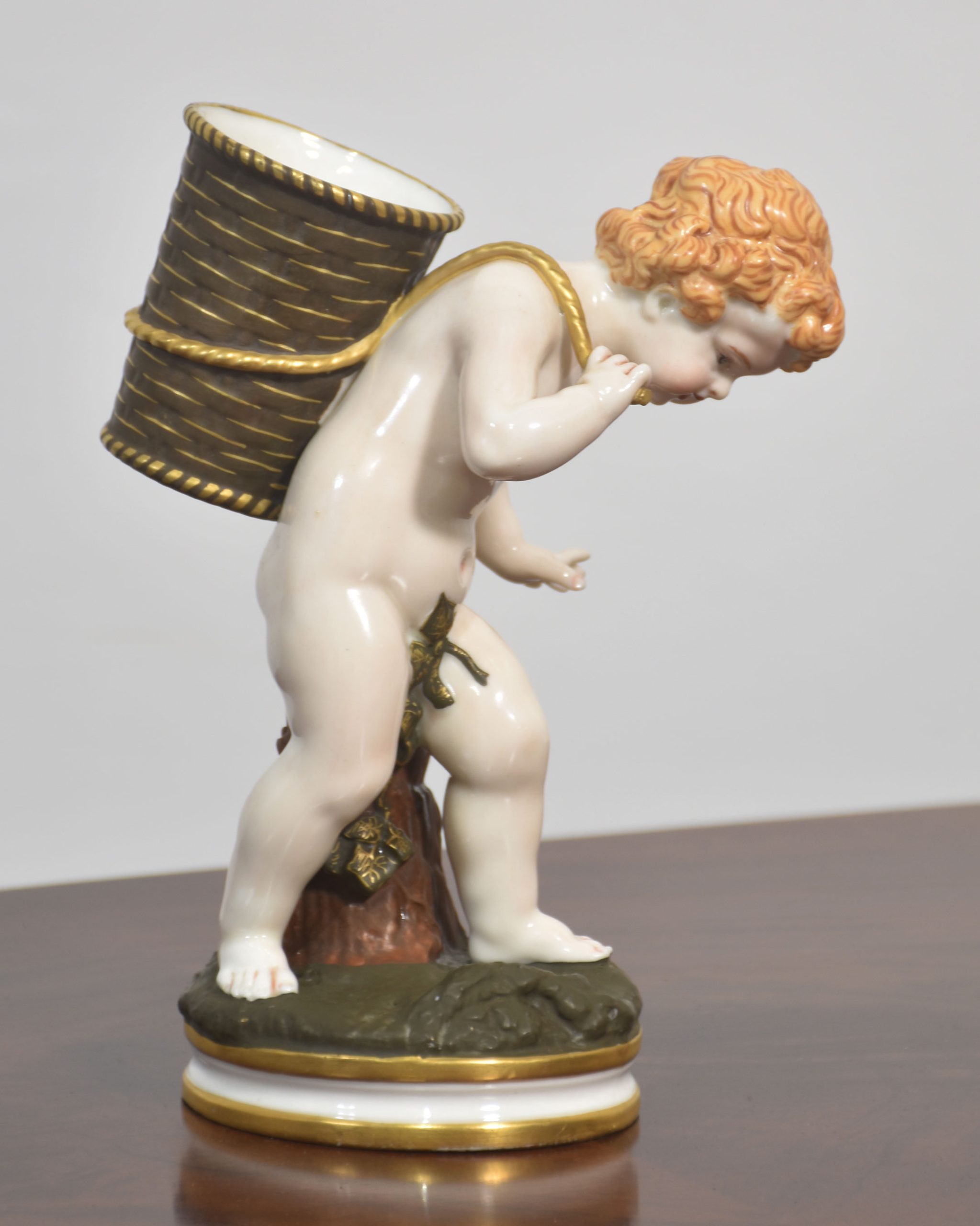 A beautifully crafted Royal Worcester porcelain figurine depicting a cherub carrying a large basket on its back. The figure is rendered with exquisite attention to detail, showcasing the soft modelling and delicate hand-painting characteristic of Royal Worcester’s fine porcelain.