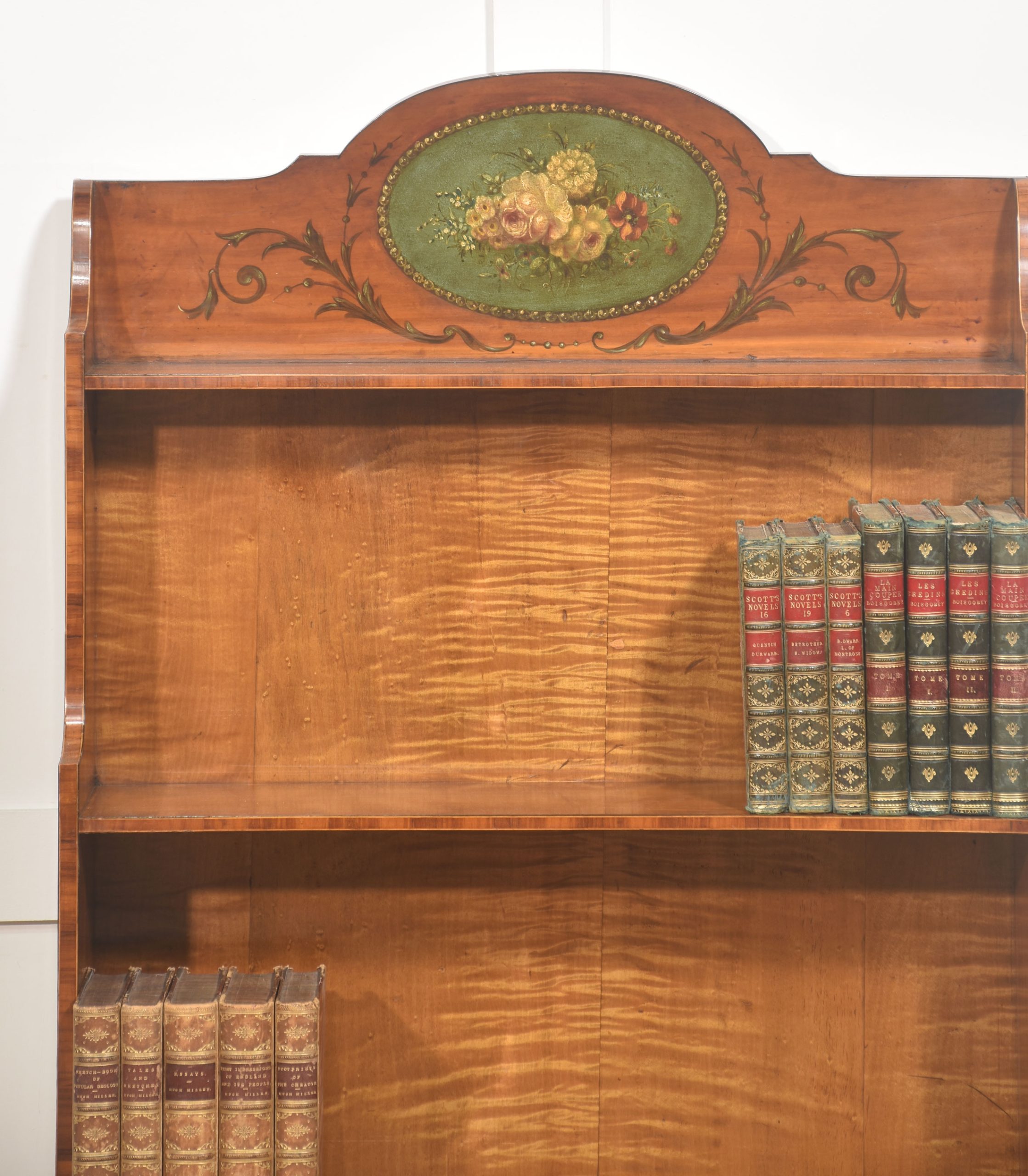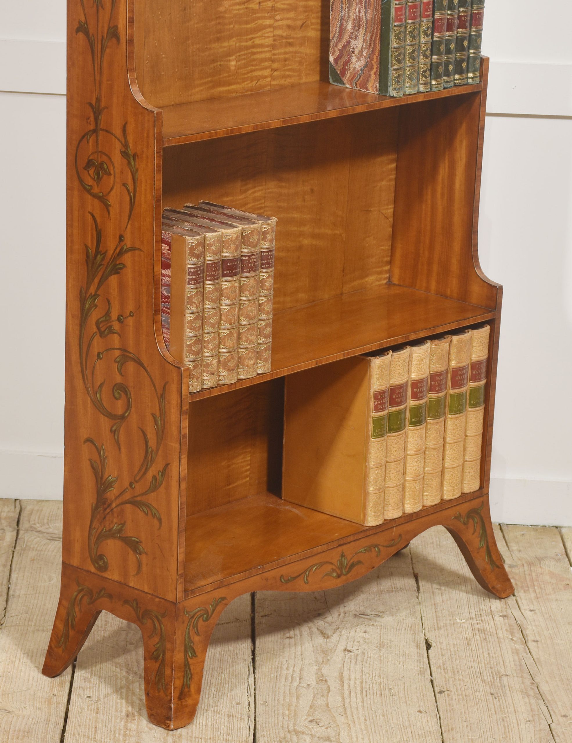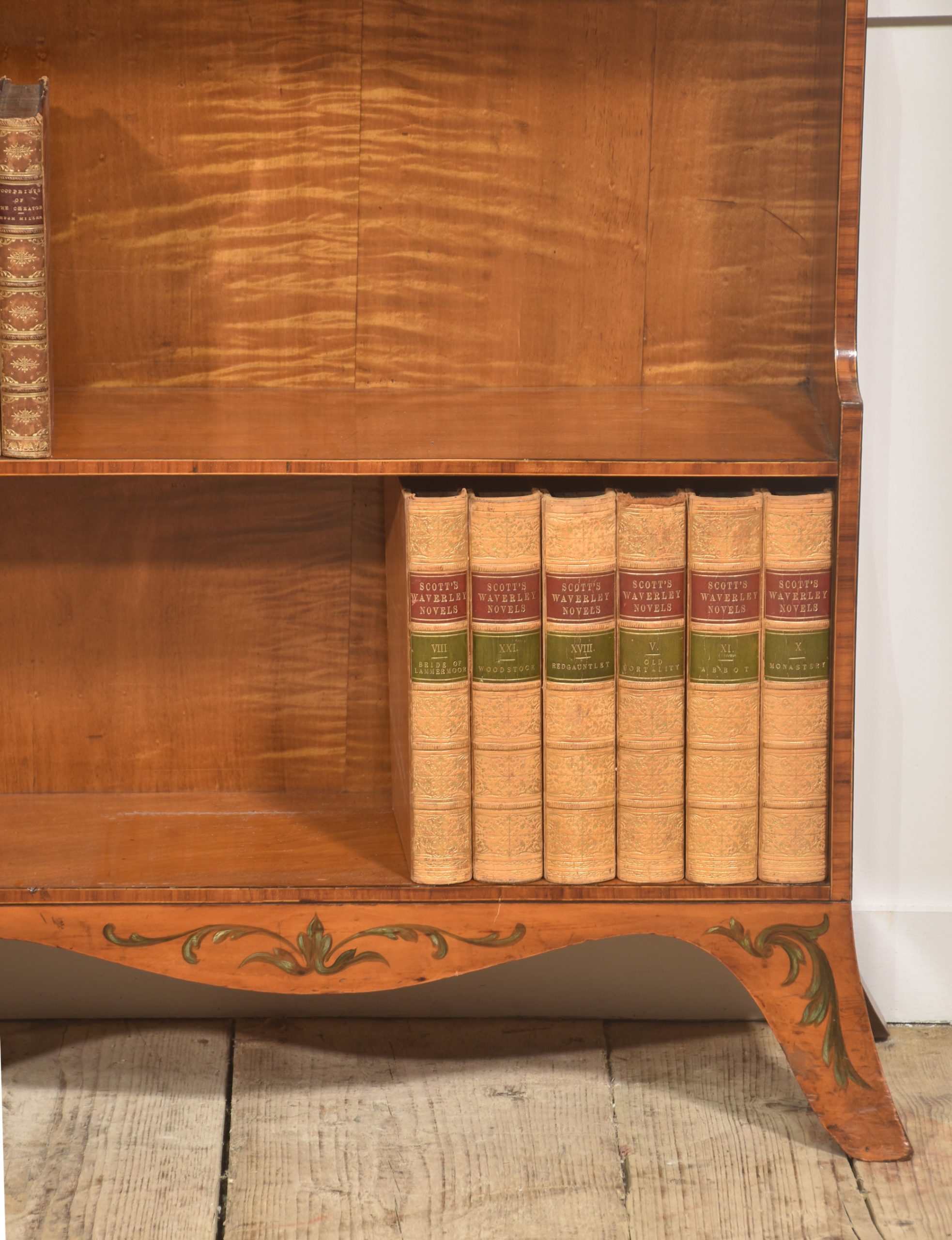 A finely made satinwood open bookcase, of elegant upright form, the bookcase is arranged with three open shelves above a deeper base compartment and stands on shaped bracket feet with a serpentine apron.