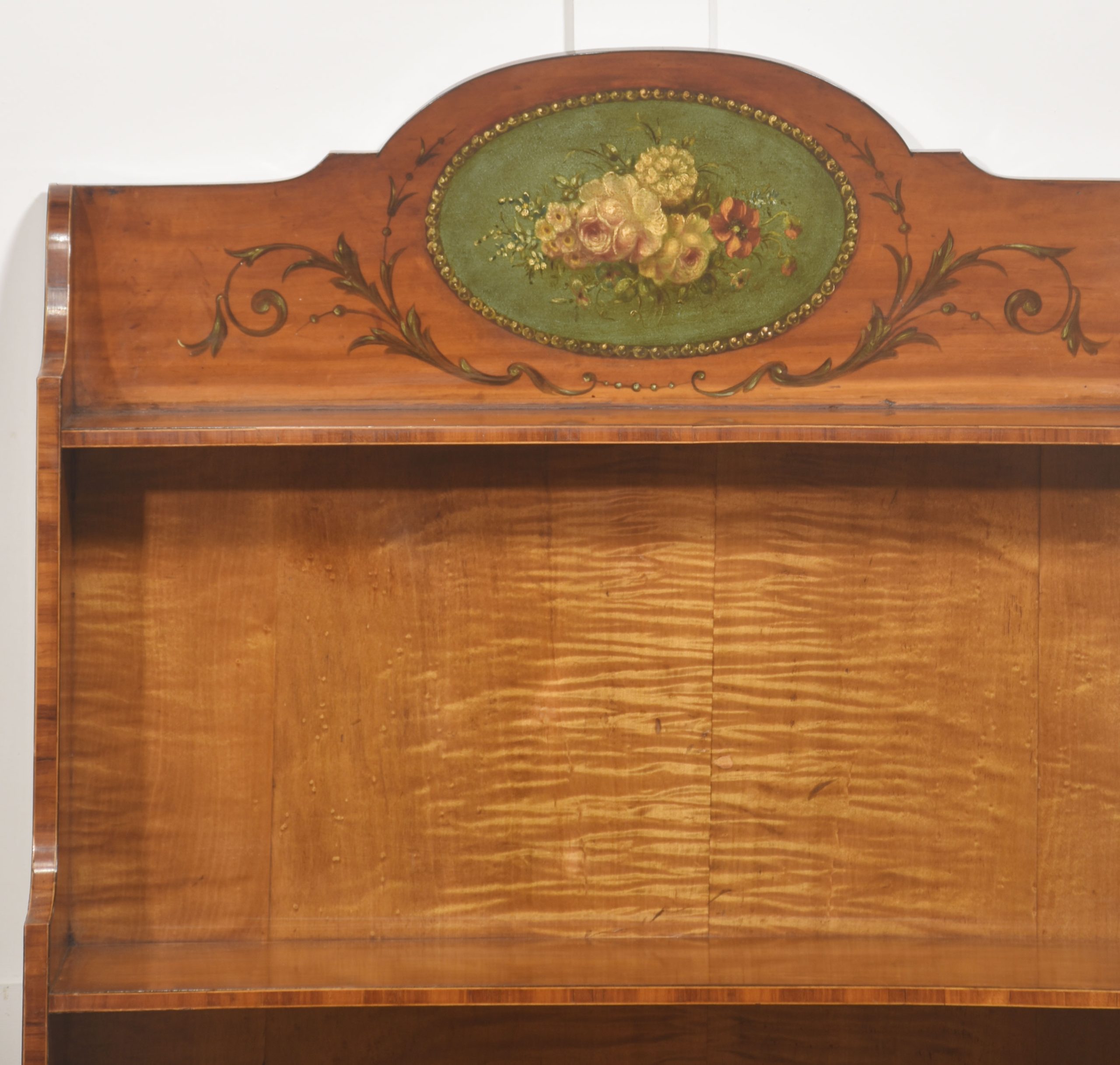 The piece is veneered throughout in richly figured satinwood, the interior panels displaying attractive rippling grain. The shaped cresting is centred by an oval painted panel depicting a floral bouquet on a green ground, framed by a gilt beaded border and surrounded by scrolling foliate decoration. Hand-painted foliate ornament continues down the sides and across the apron and feet, characteristic of the decorative vocabulary of the Aesthetic Movement.