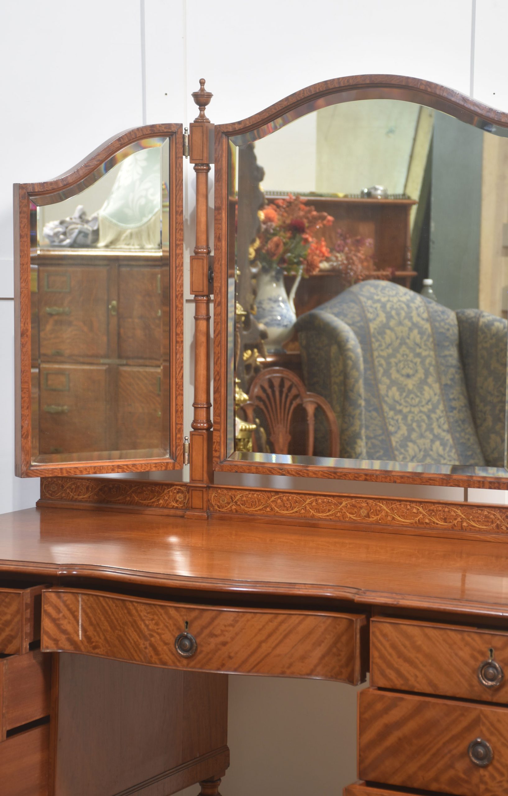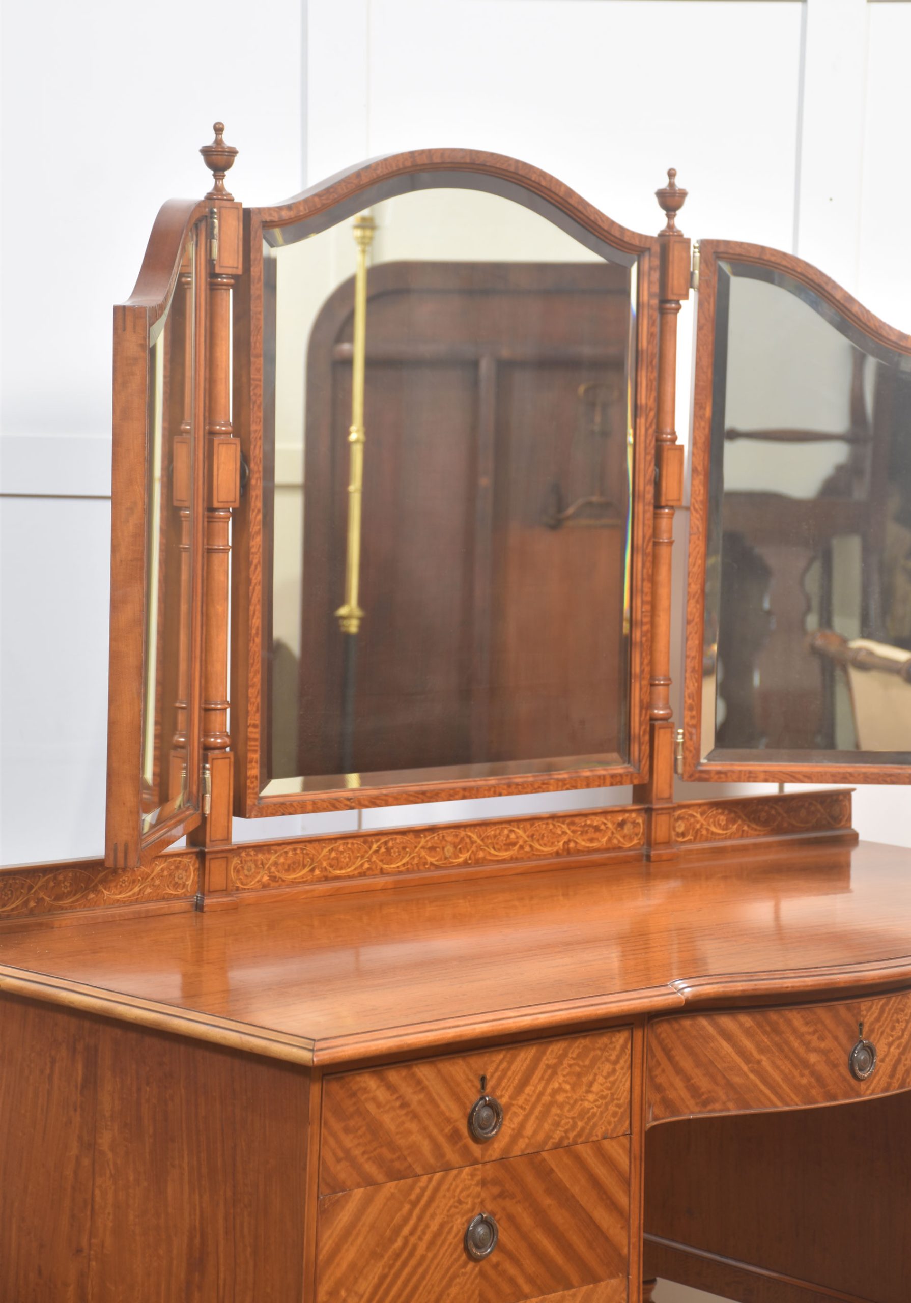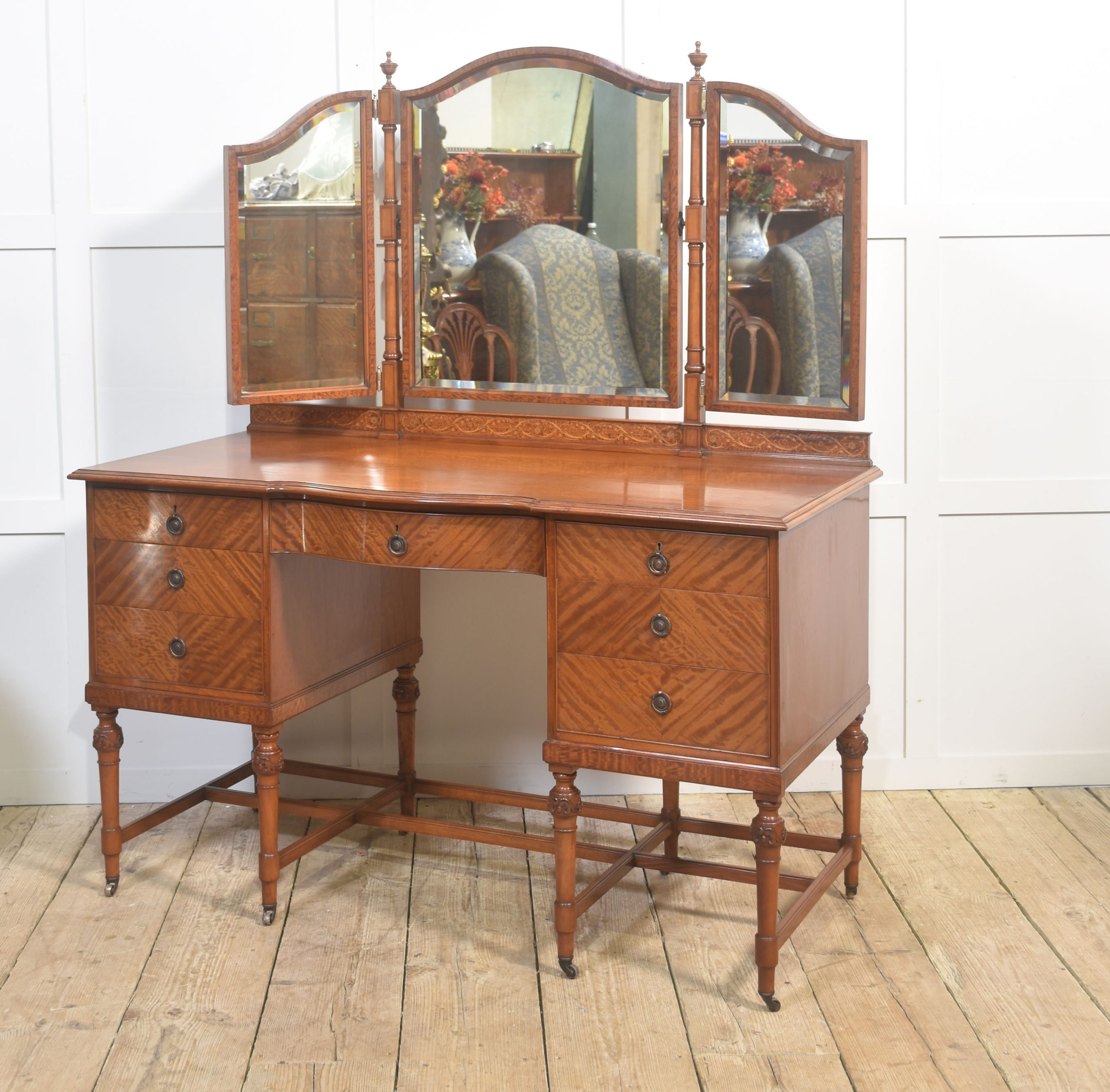 A fine early 20th-century satinwood dressing table, distinguished by its warm tone and beautifully figured veneers throughout. The shaped top is surmounted by an elegant arrangement of three adjustable mirrors, each framed in satinwood with gently arched crests and supported on turned uprights, allowing the mirrors to be angled to suit the user.