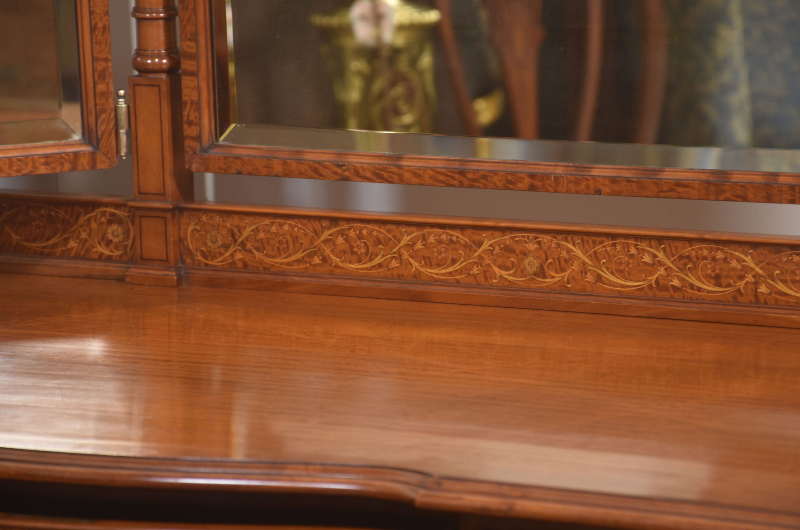 A finely inlaid frieze beneath the mirrors, decorated with scrolling foliate motifs, adds a refined decorative note and highlights the quality of the cabinetmaking.