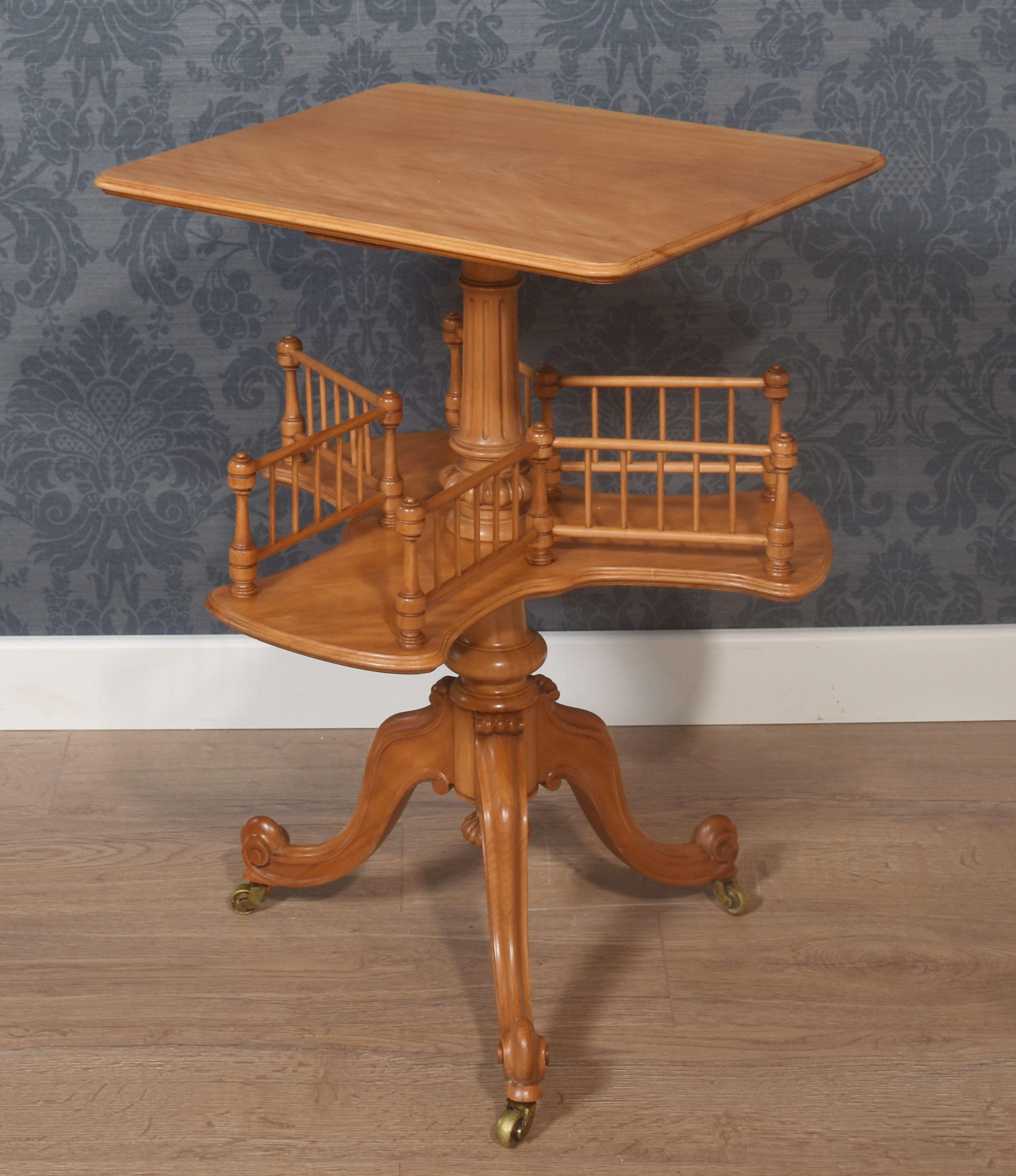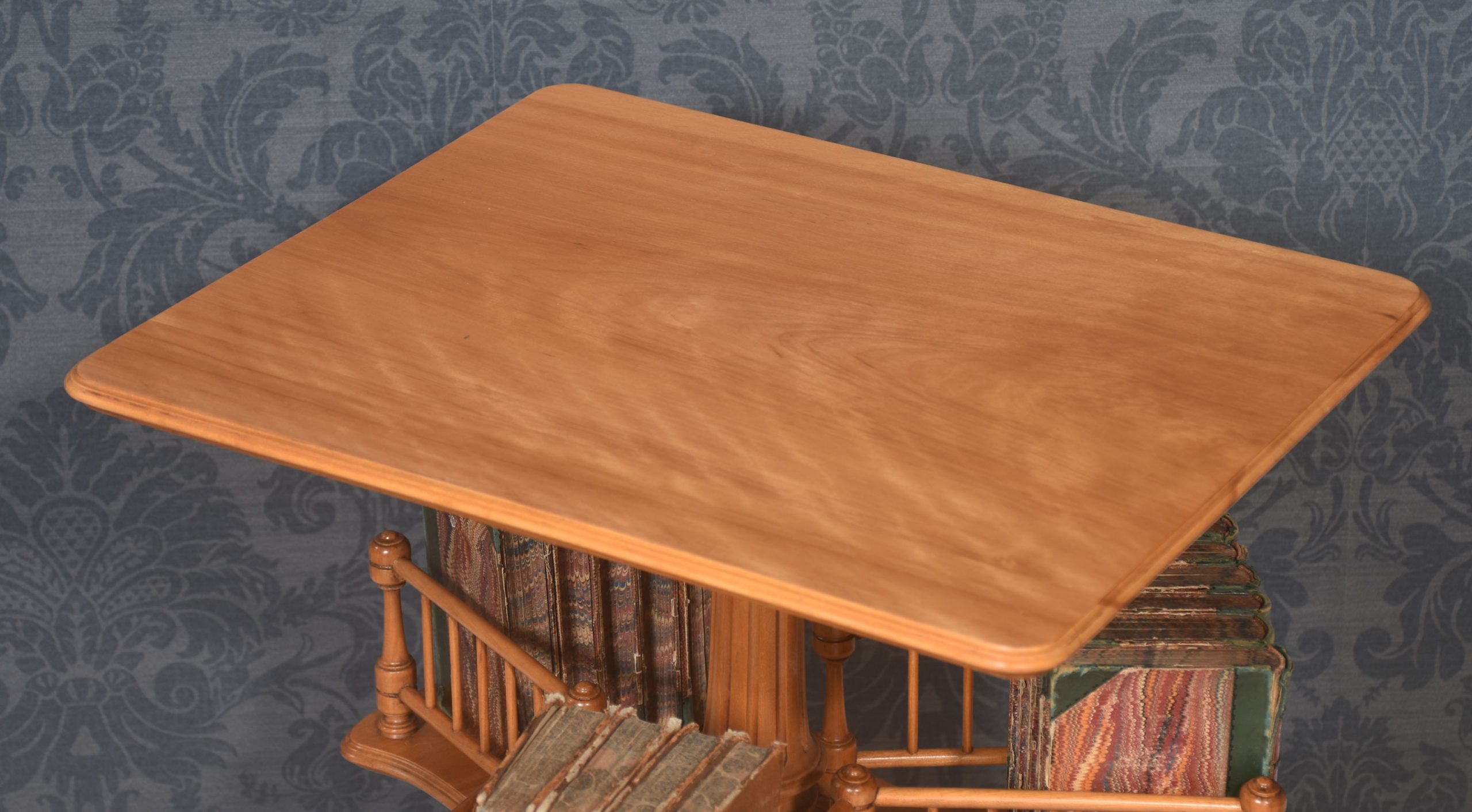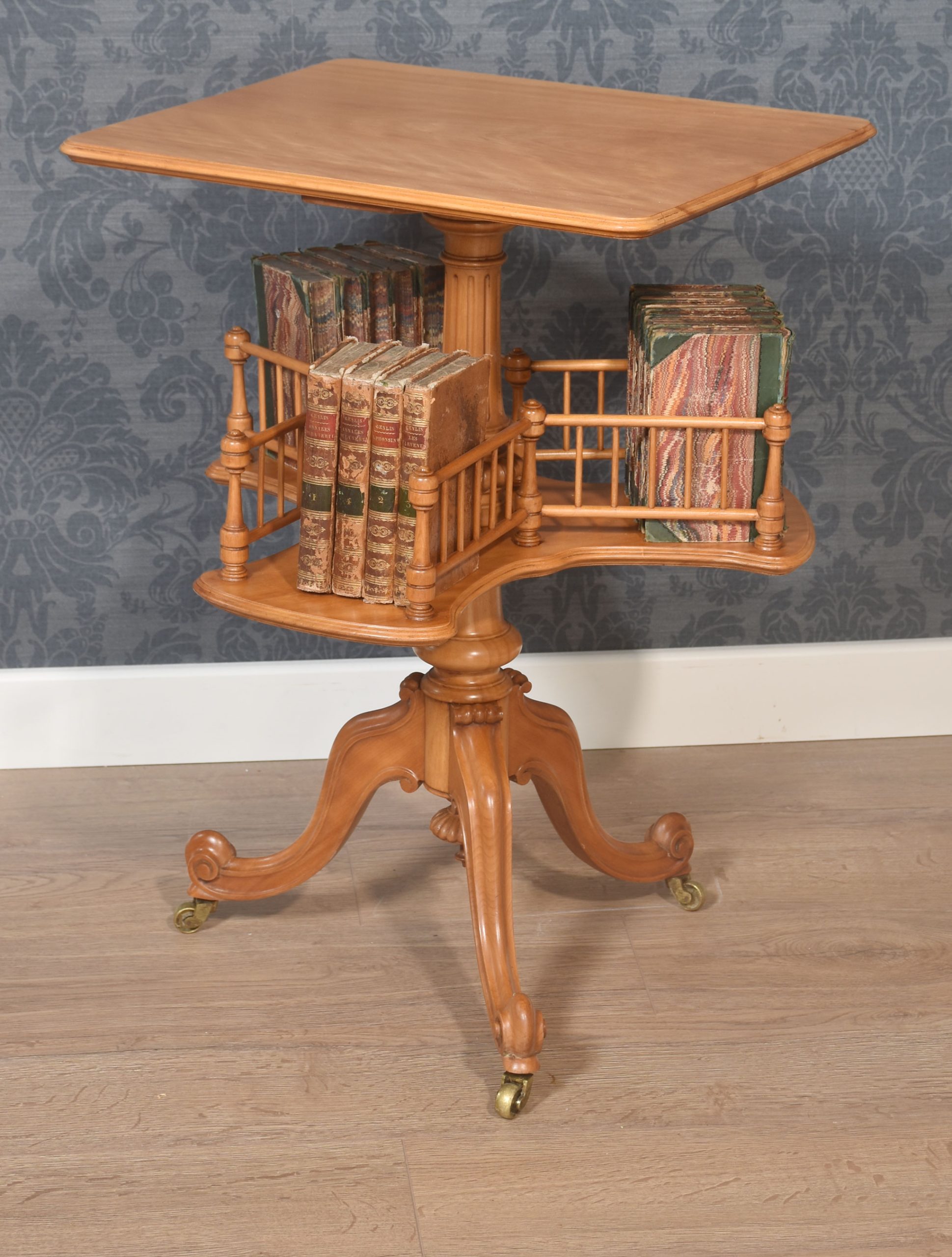 Satinwood revolving book table the rectangular top with a molded edge. Raised up on fluted support with revolving three-division bookshelf under tier All raised up on tripod base terminating in casters.