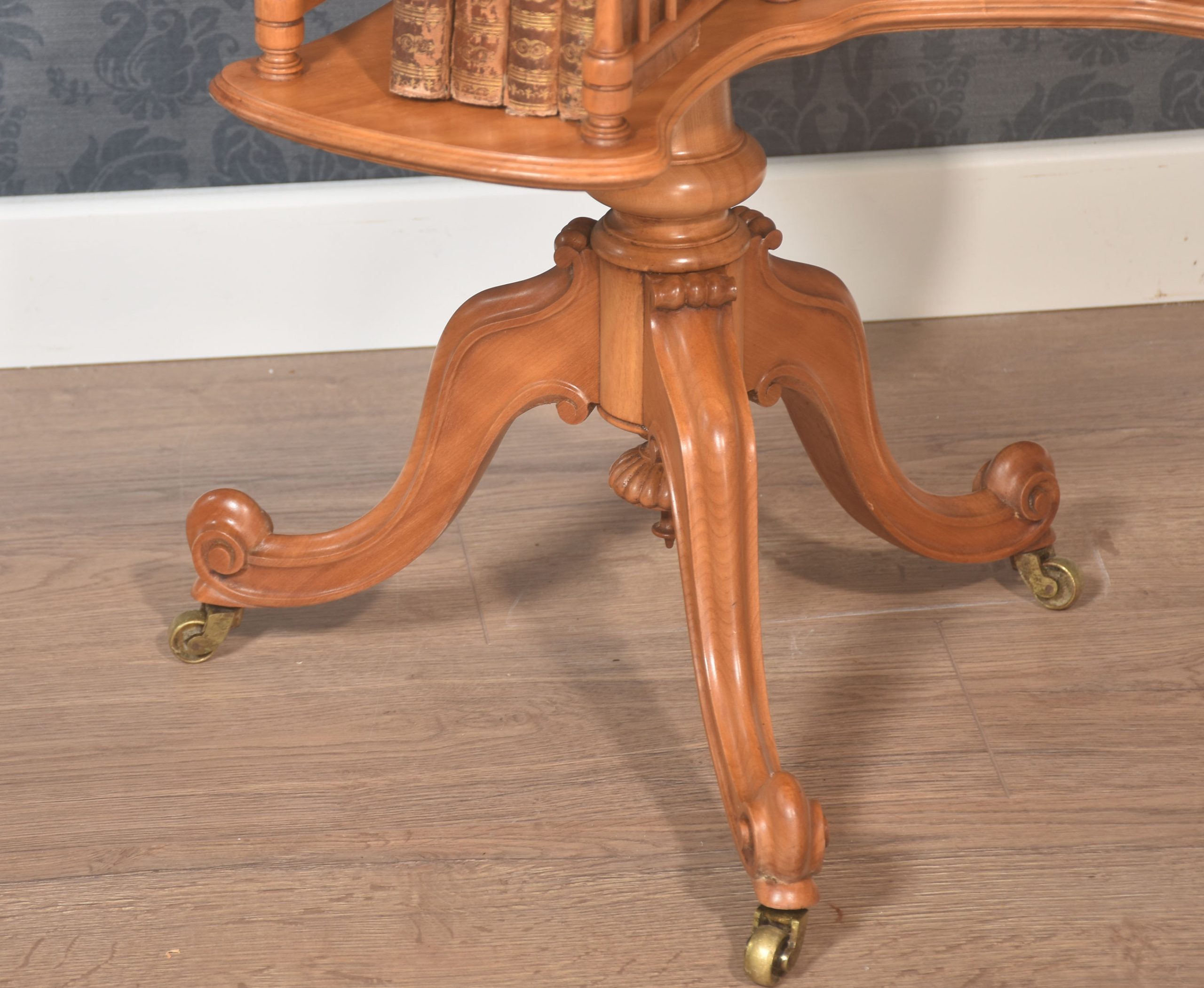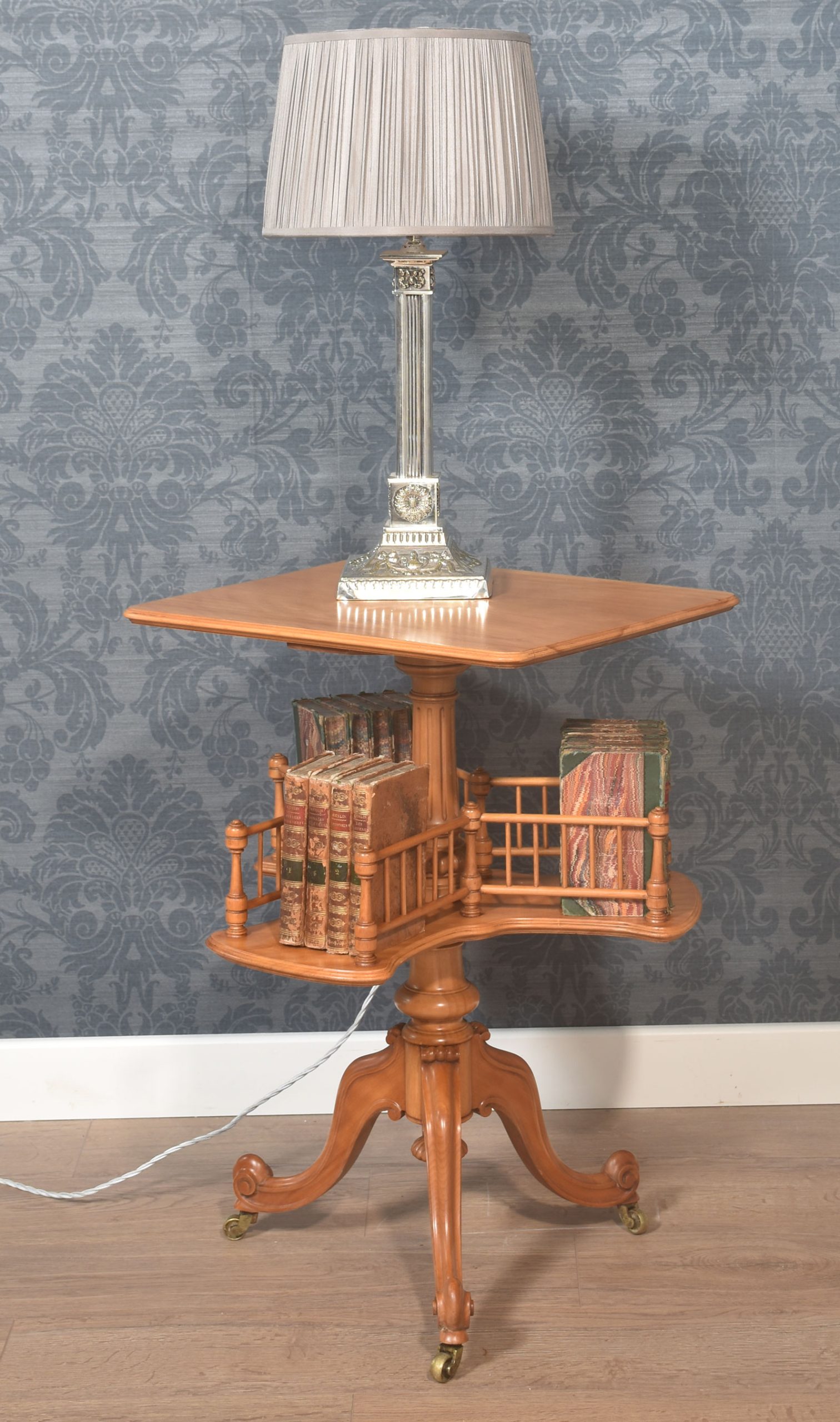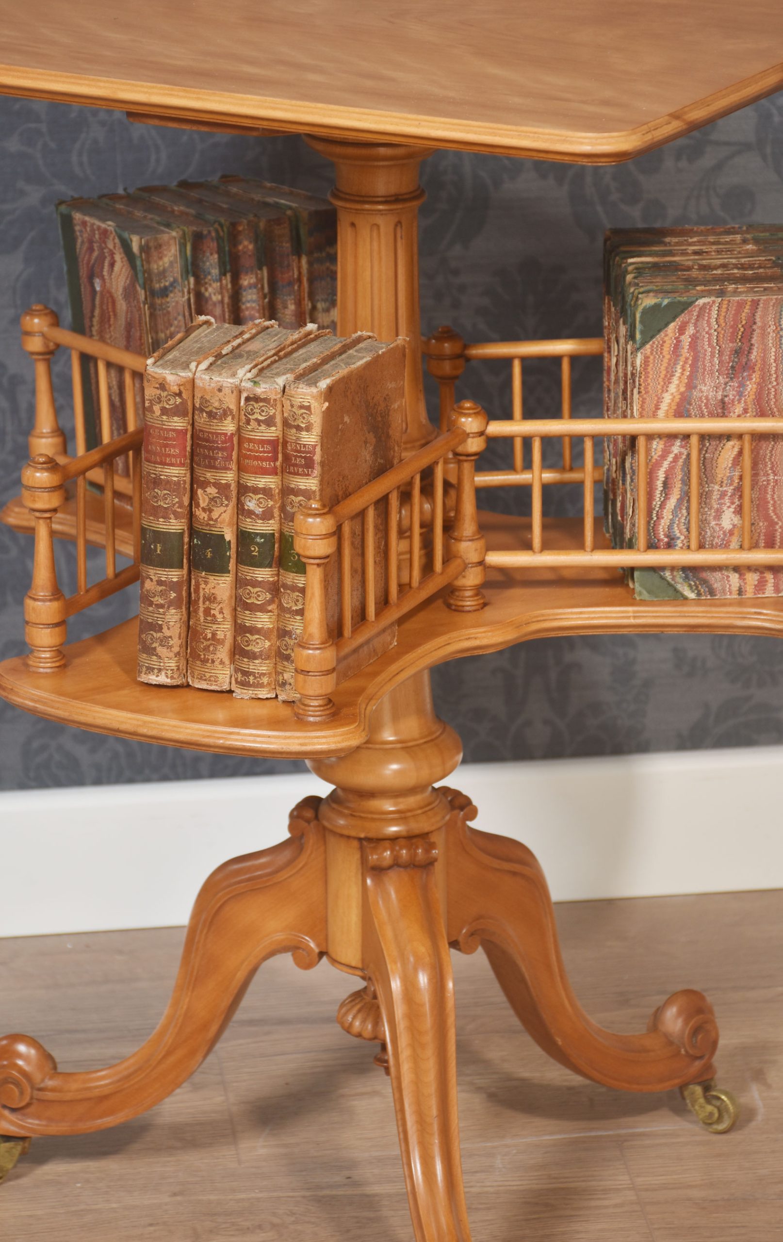 Satinwood revolving book table the rectangular top with a molded edge. Raised up on fluted support with revolving three-division bookshelf under tier All raised up on tripod base terminating in casters.
