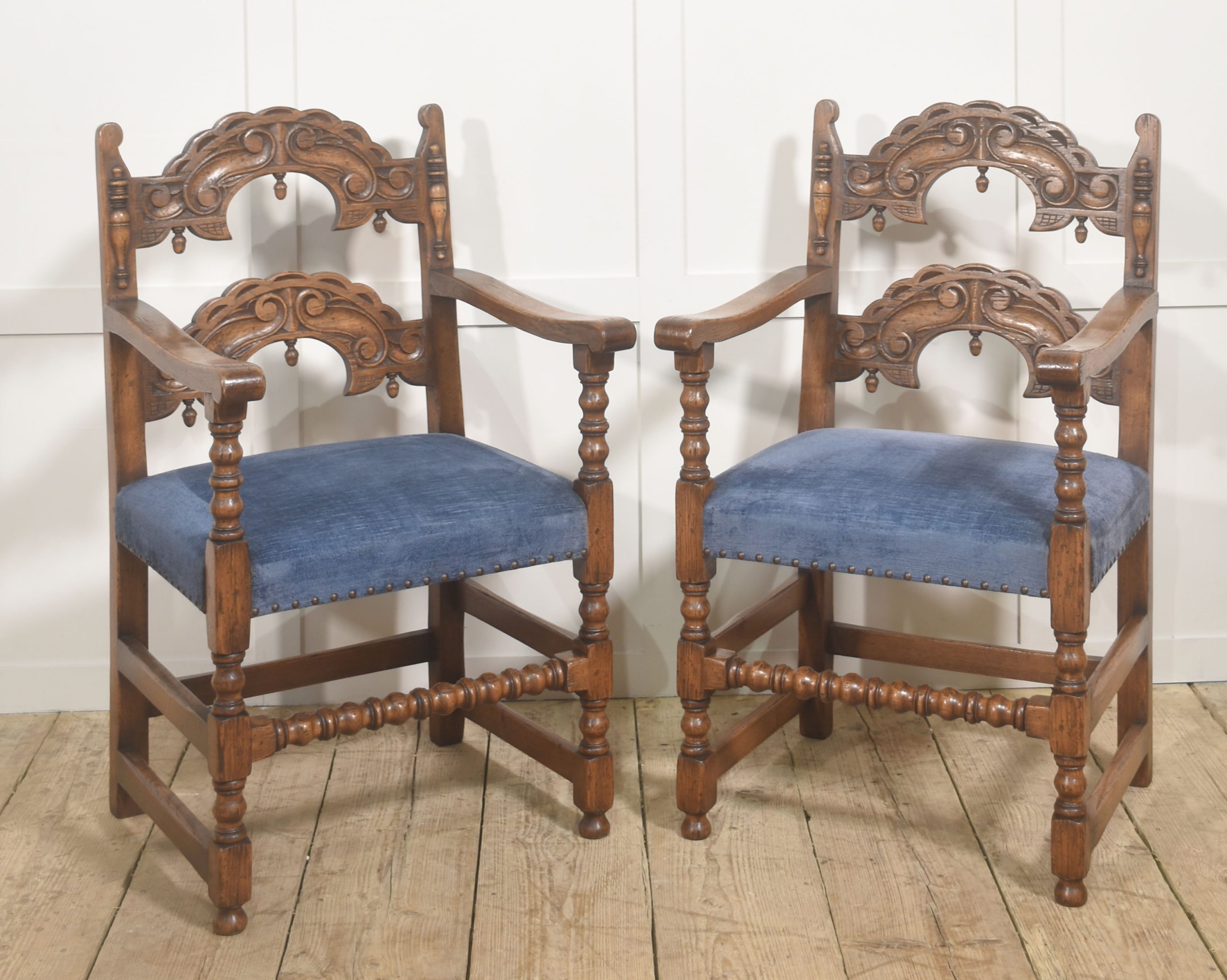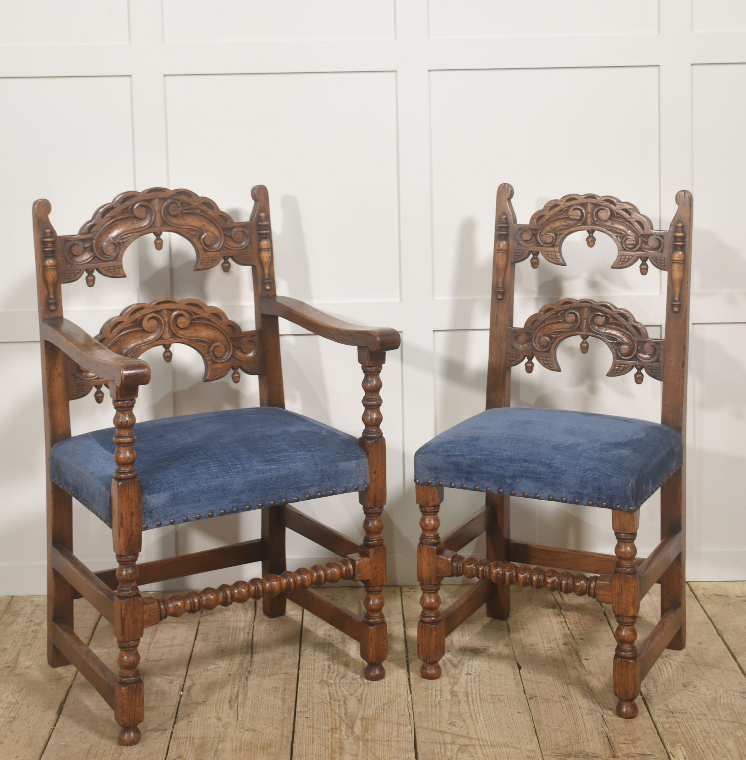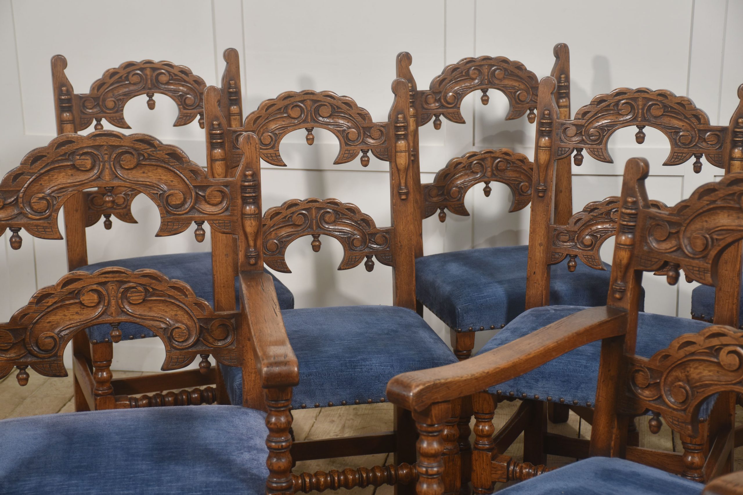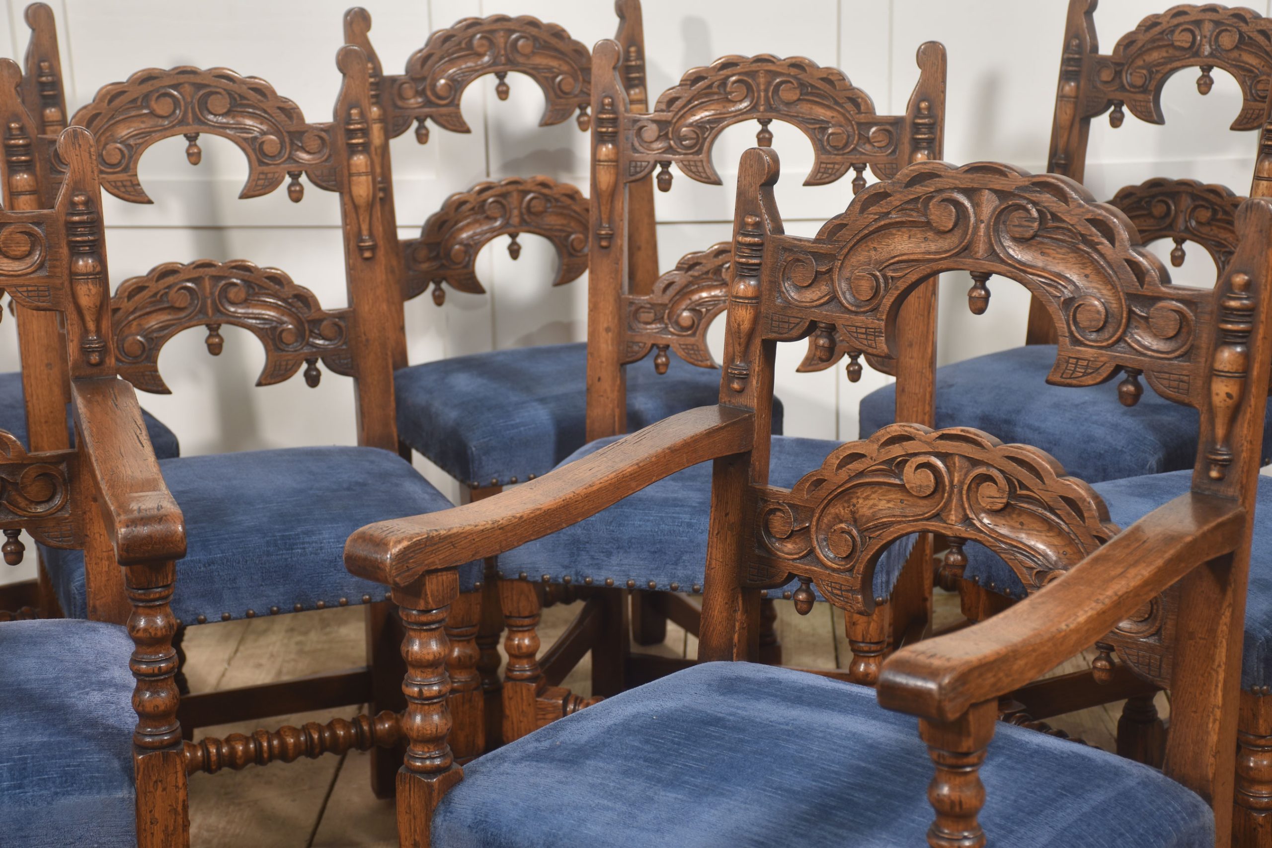 A distinguished set of eight early twentieth-century carved oak dining chairs, comprising six side chairs and two armchairs, executed in a richly detailed Jacobean Revival manner. Each chair is crafted from solid oak, displaying a warm, medium-toned finish that highlights the natural grain and depth of the timber while lending a mellow, time-earned character to the ensemble.
