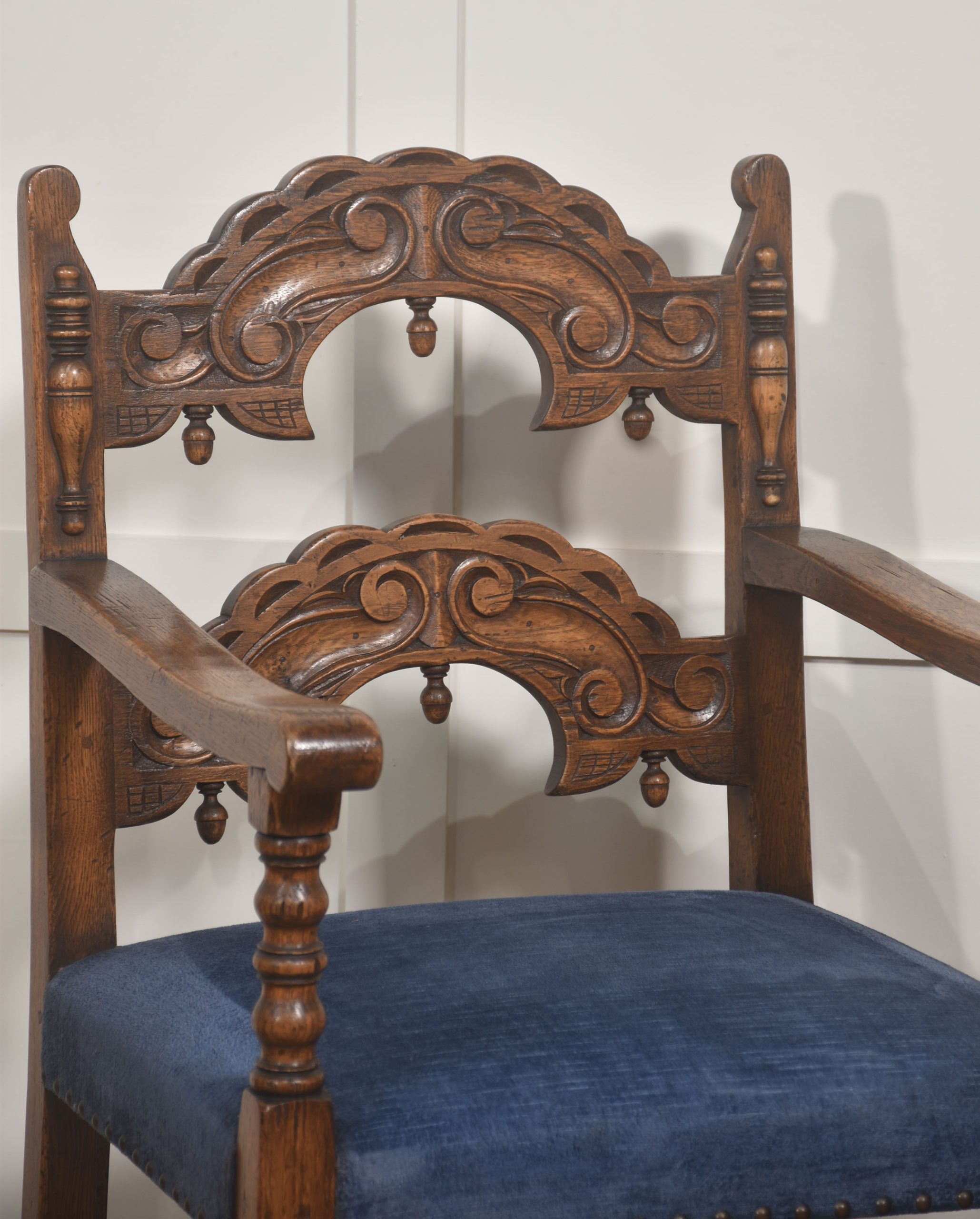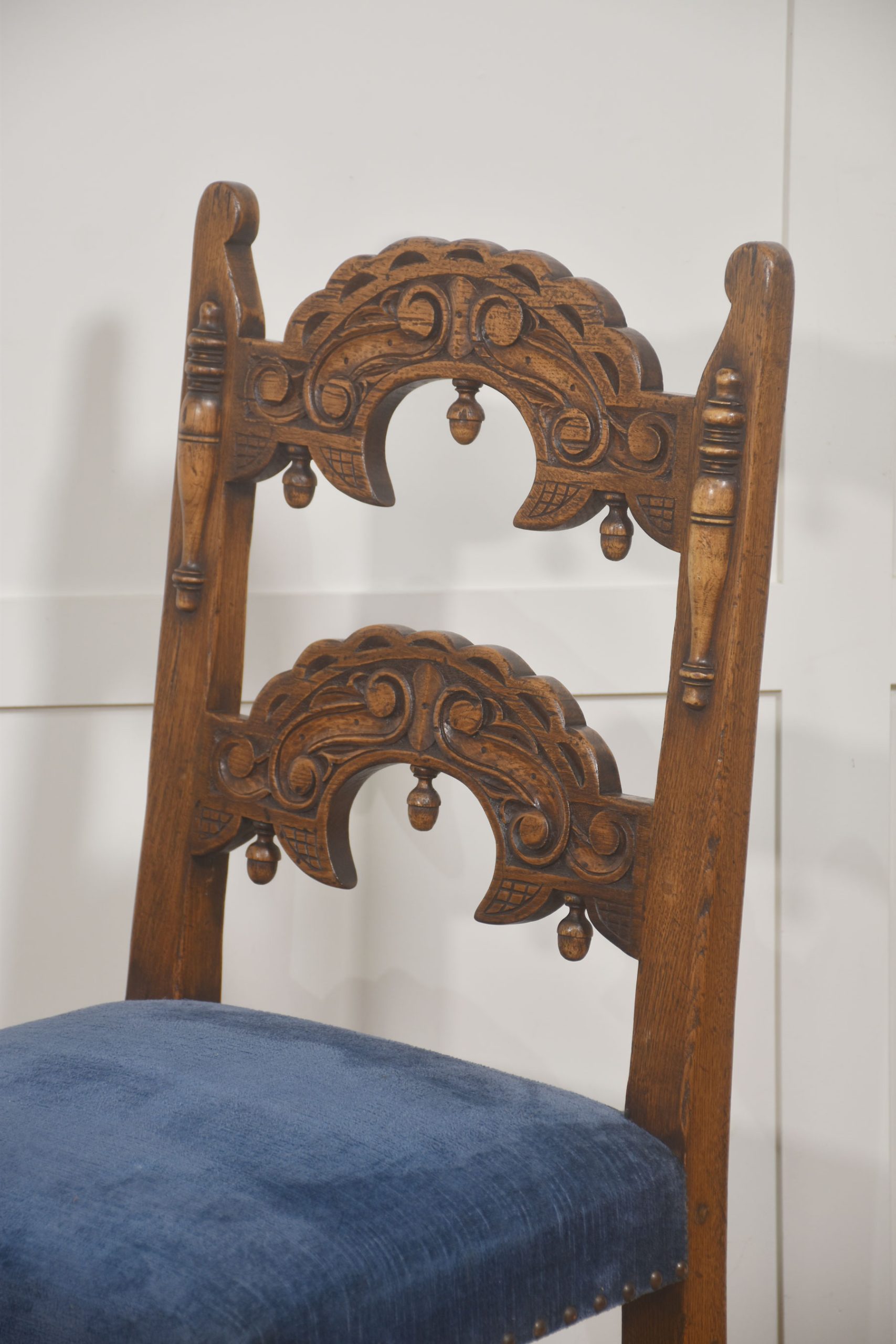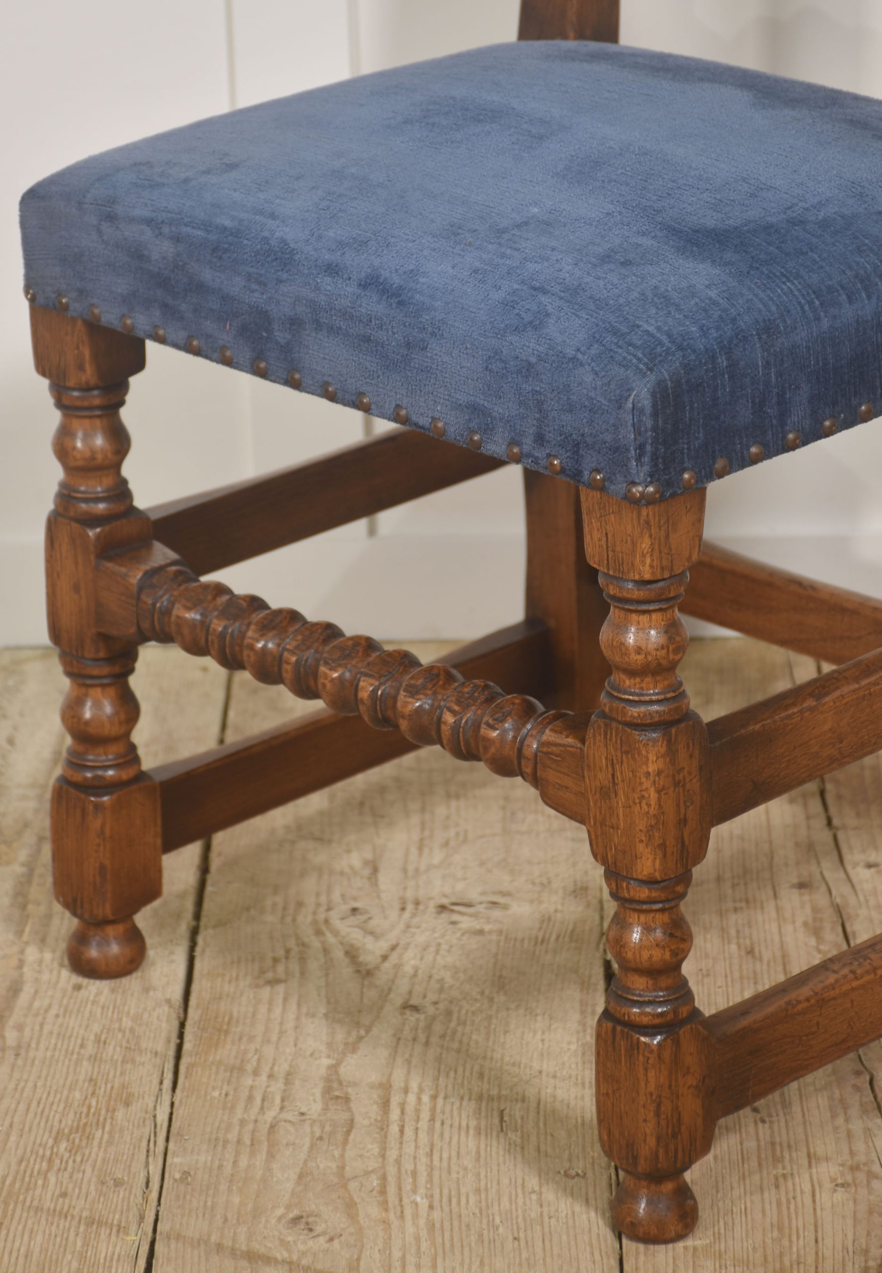 Seats are generously proportioned and upholstered in a deep blue velvet, secured with evenly spaced brass studwork along the lower edge. The upholstery offers a refined contrast to the warmth of the oak frame, introducing a restrained yet sophisticated color element that complements both traditional and transitional interiors.