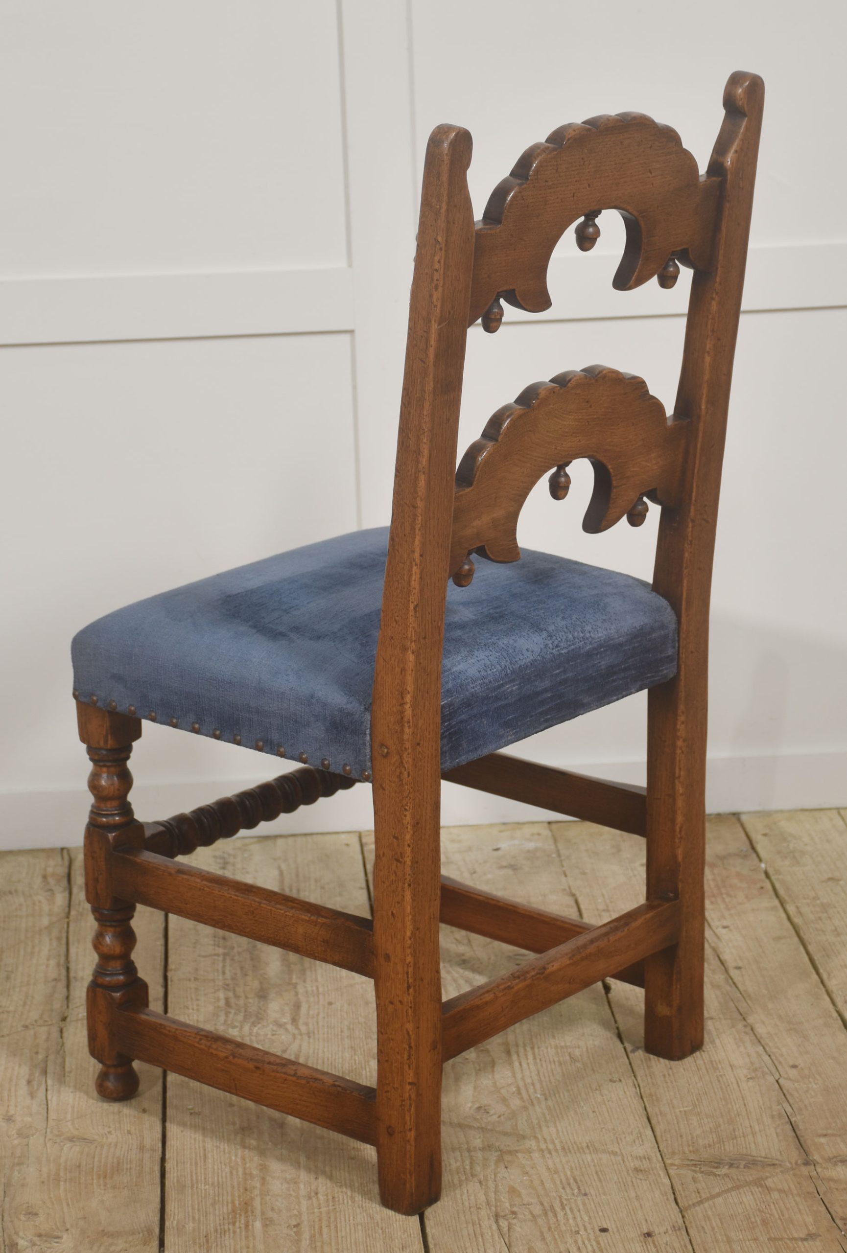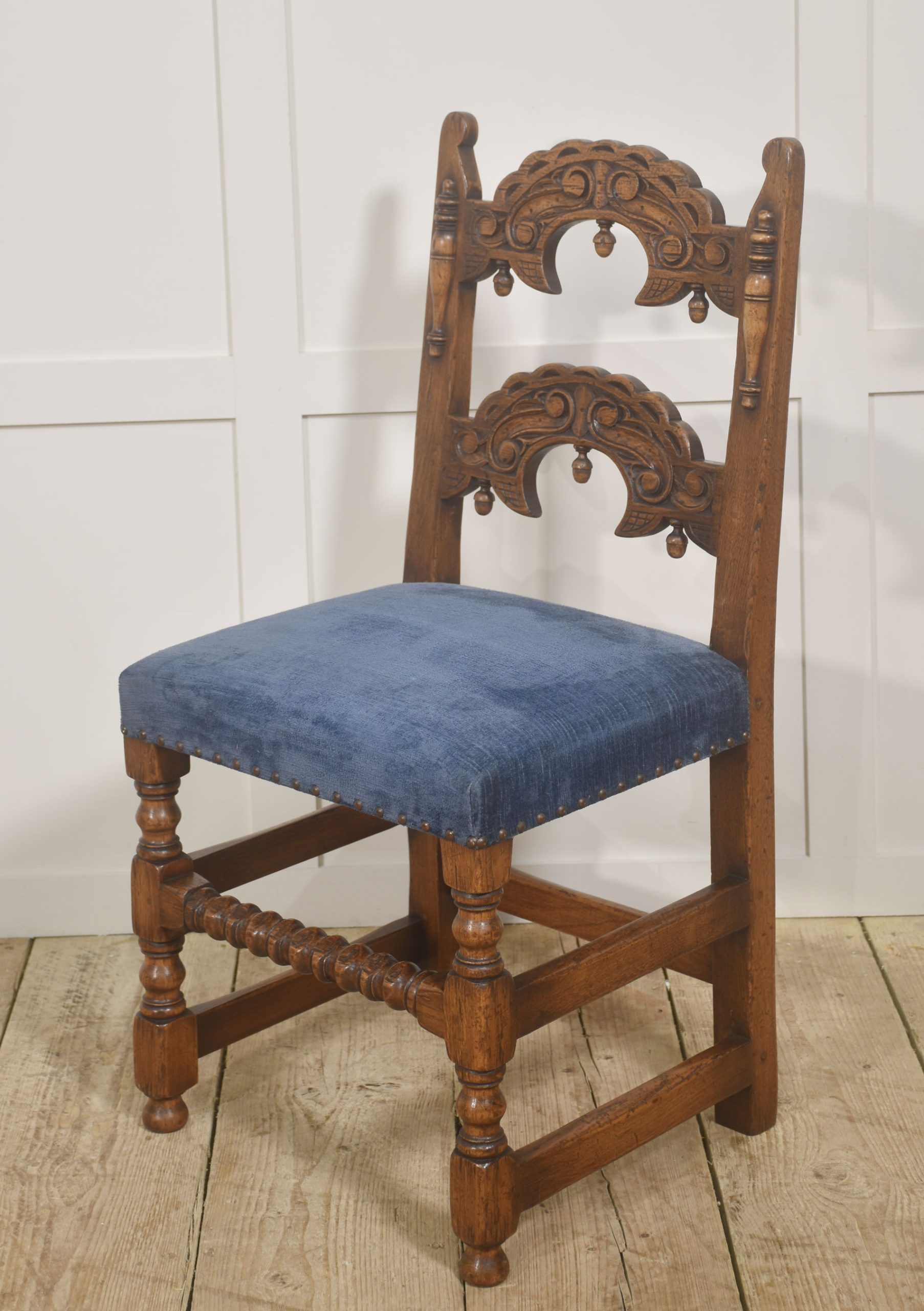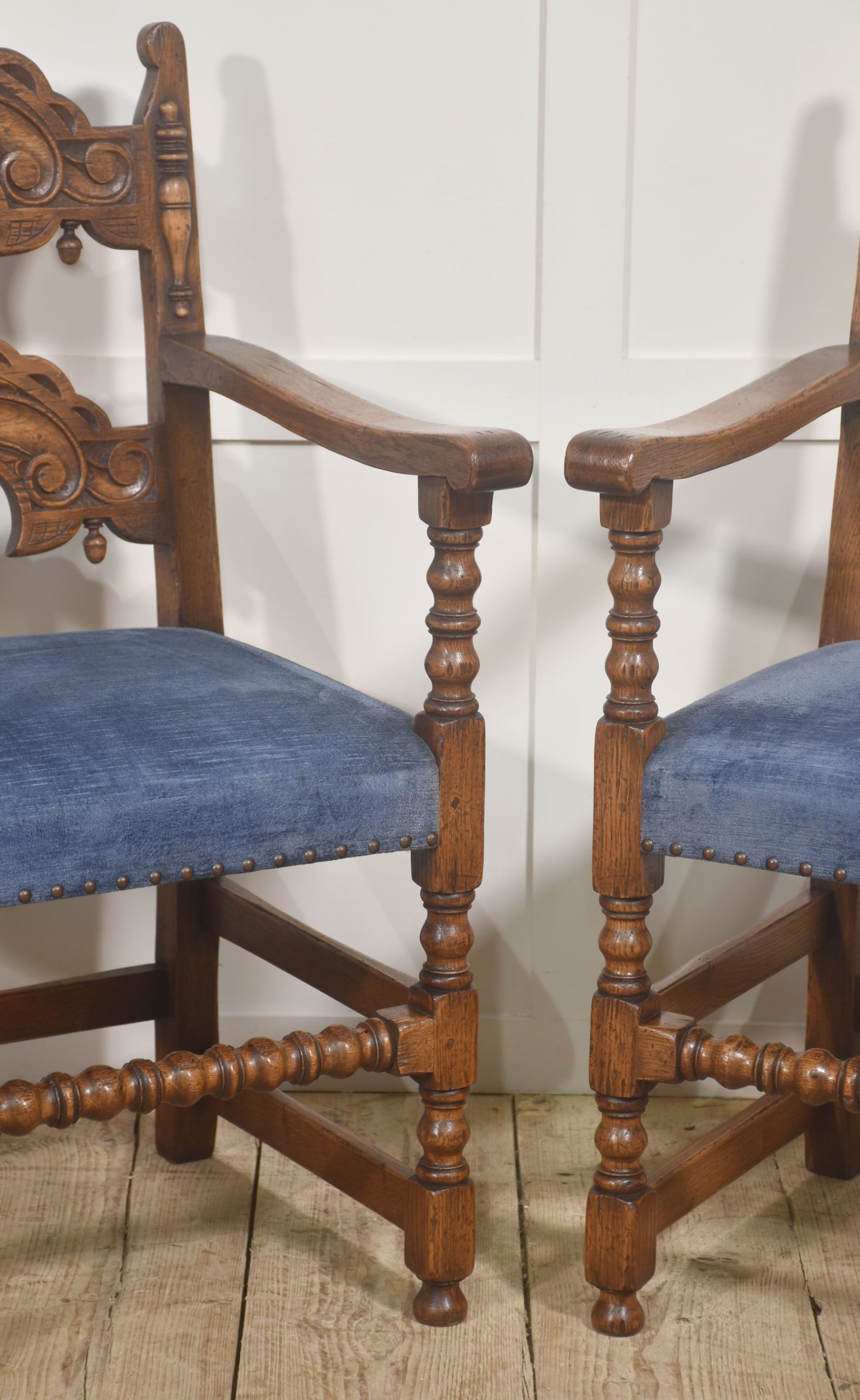 Seats are generously proportioned and upholstered in a deep blue velvet, secured with evenly spaced brass studwork along the lower edge. The upholstery offers a refined contrast to the warmth of the oak frame, introducing a restrained yet sophisticated color element that complements both traditional and transitional interiors.