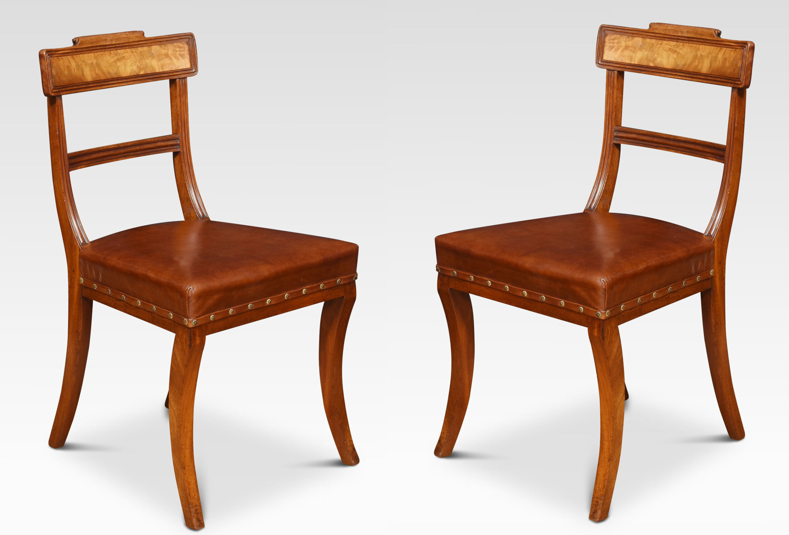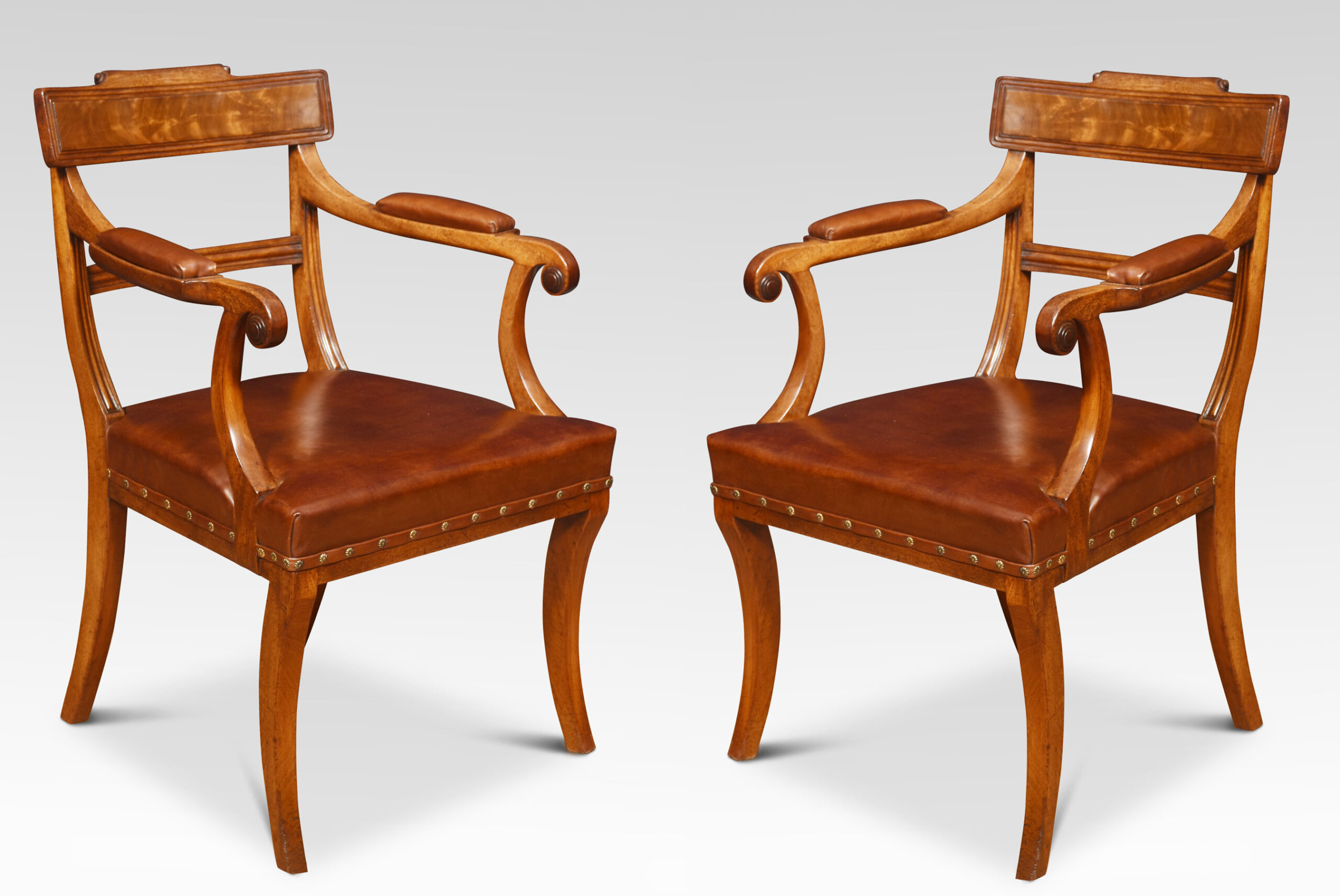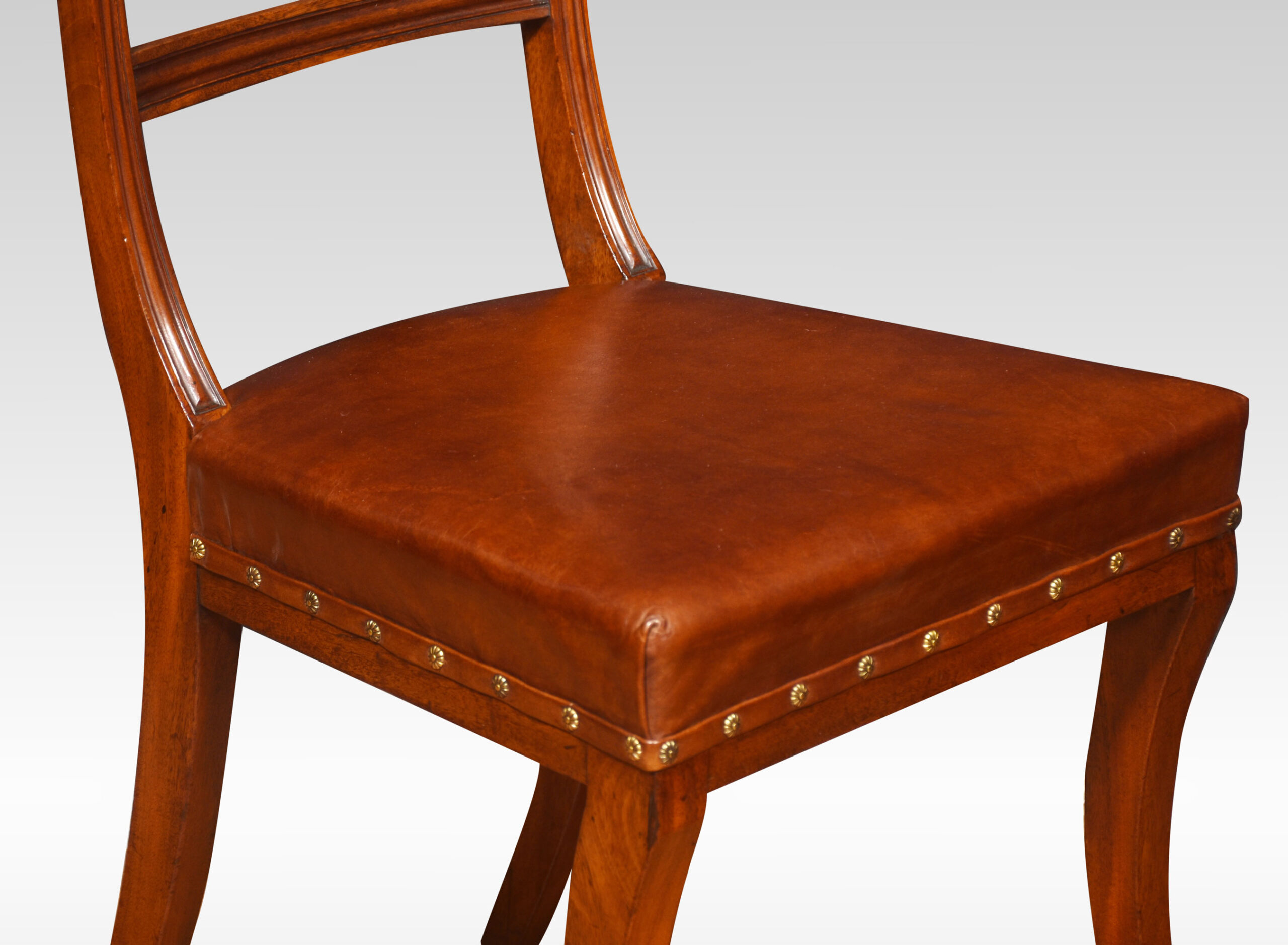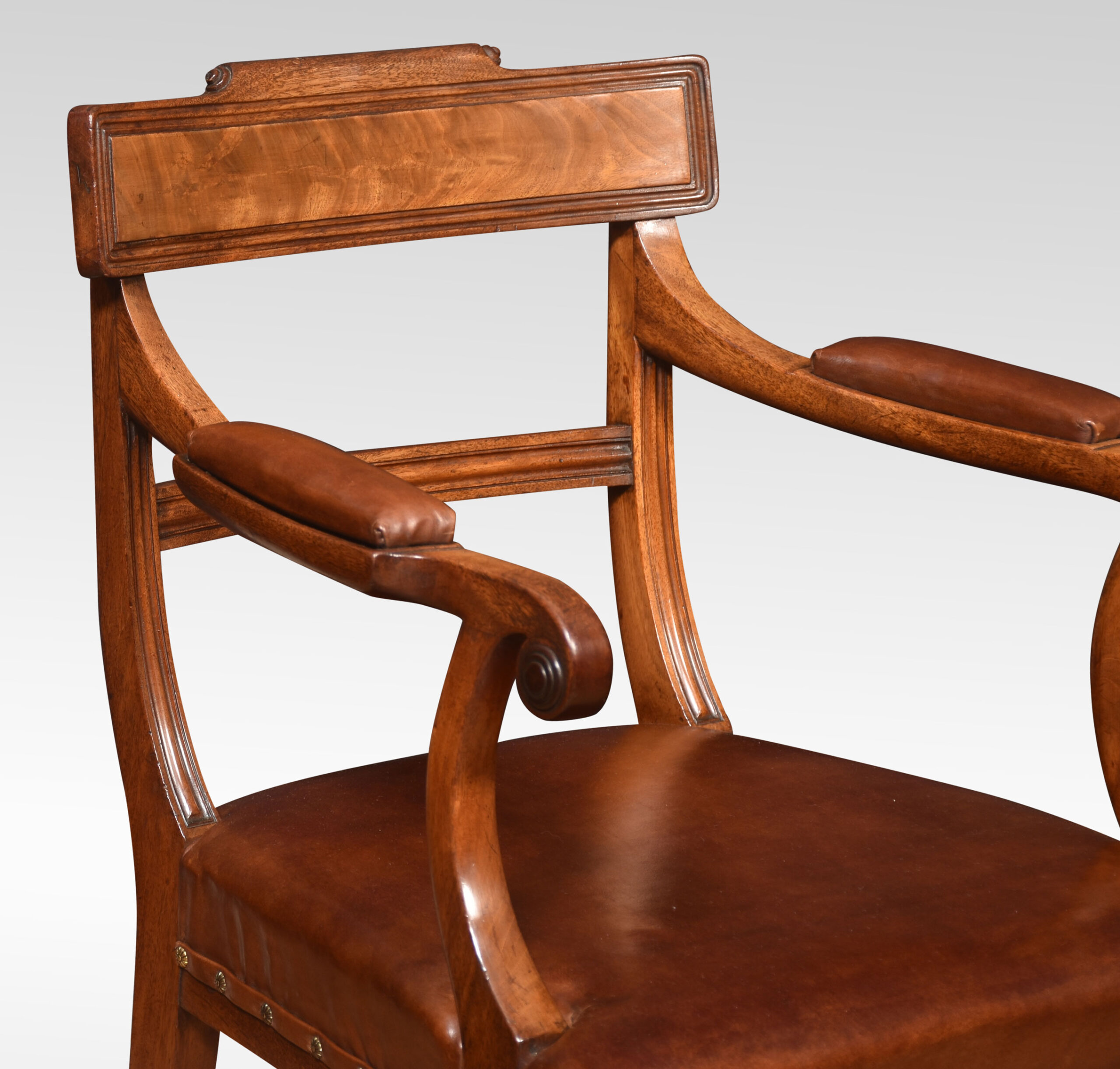 A set of eight Regency mahogany dining chairs. Comprising of two carvers and six chairs. Each with shaped top rail and central backrest, to the brown leather seats. All raised up on saber legs.