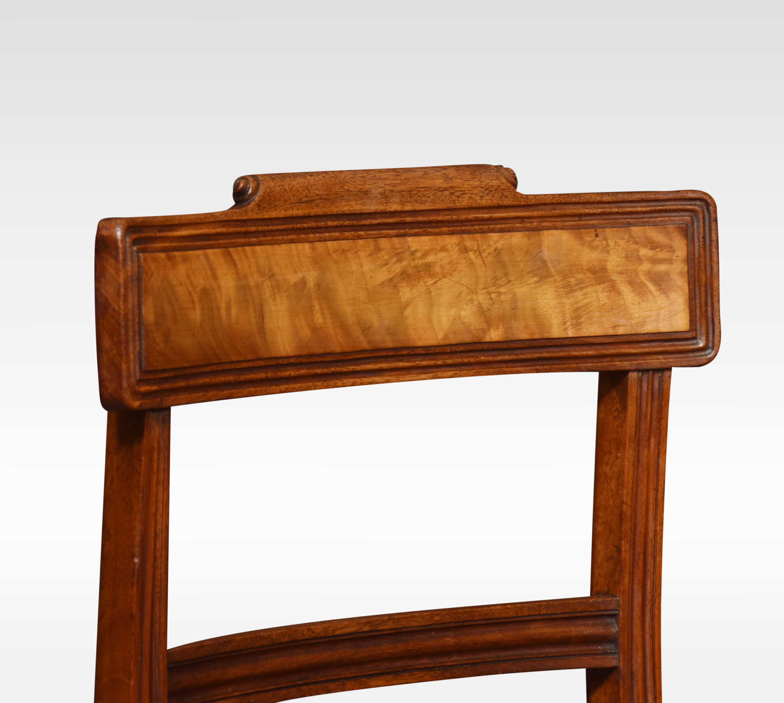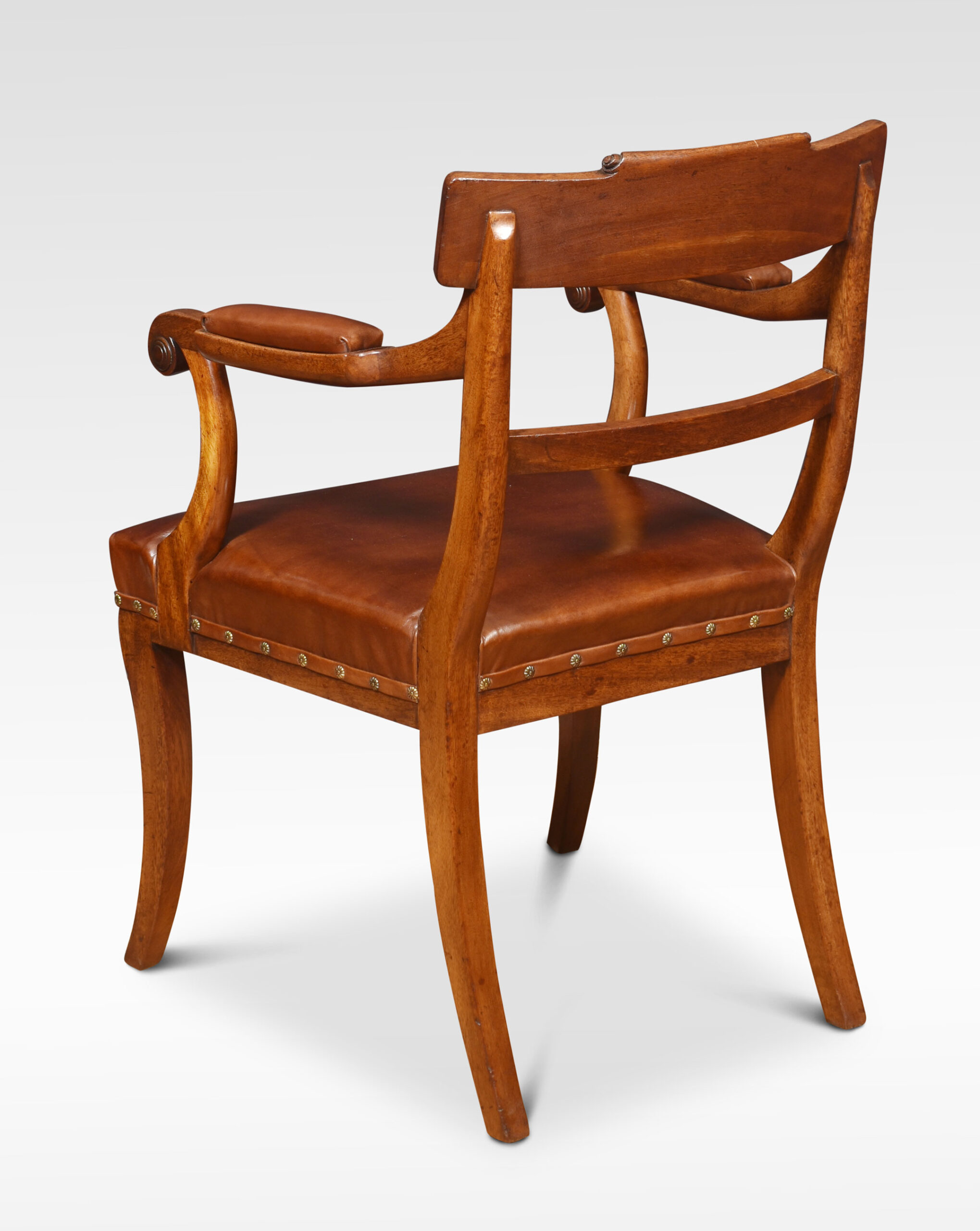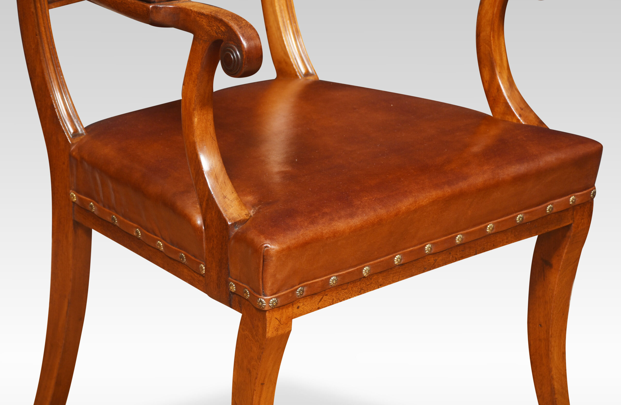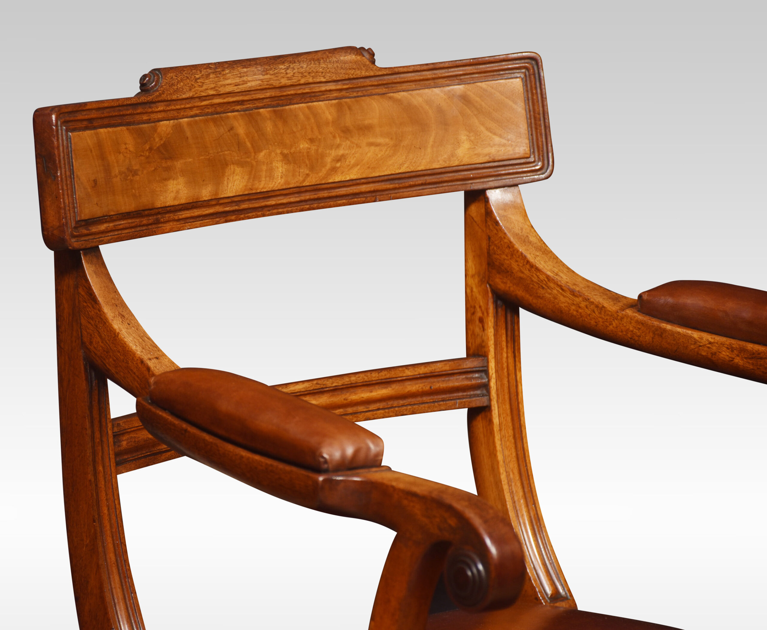 A set of eight Regency mahogany dining chairs. Comprising of two carvers and six chairs. Each with shaped top rail and central backrest, to the brown leather seats. All raised up on saber legs.