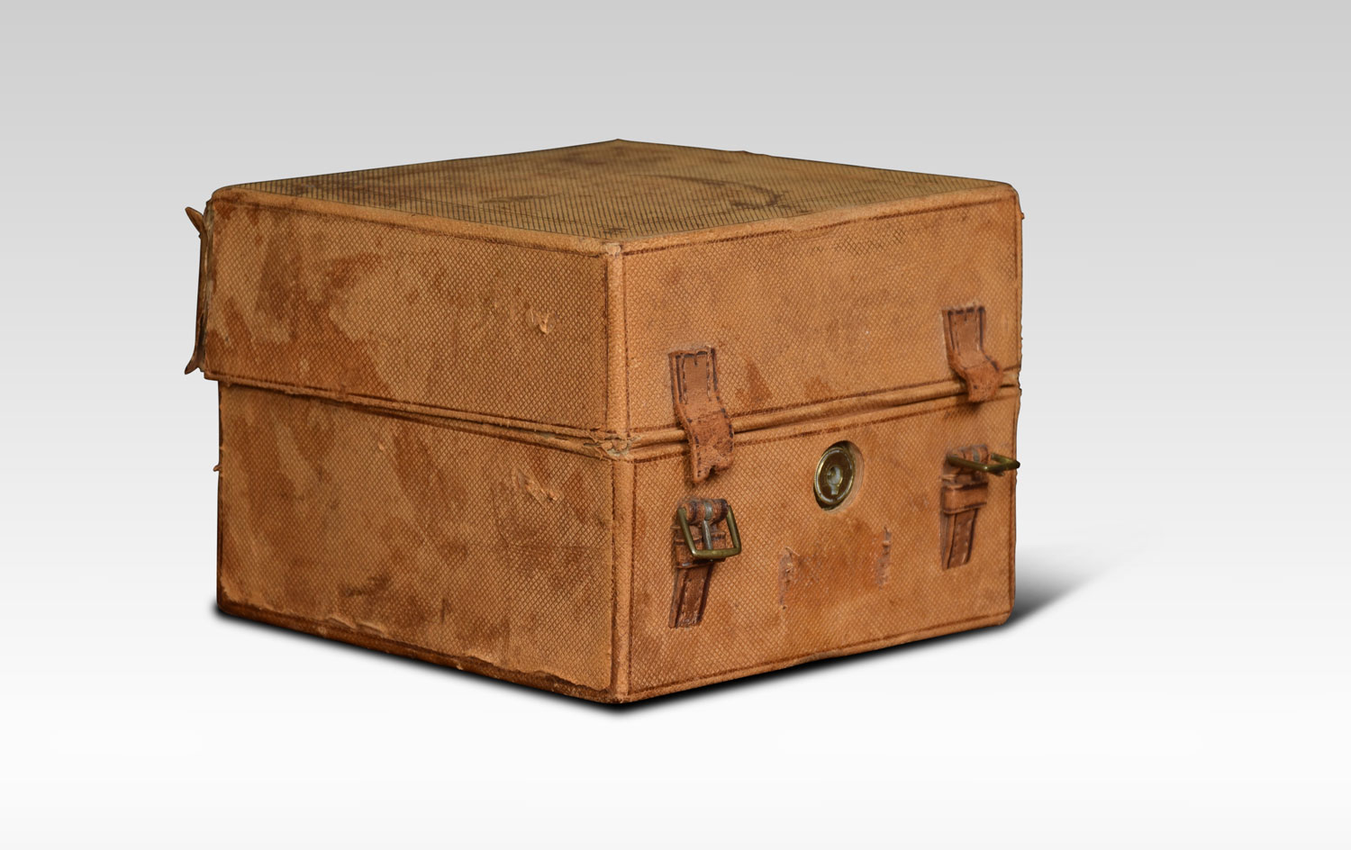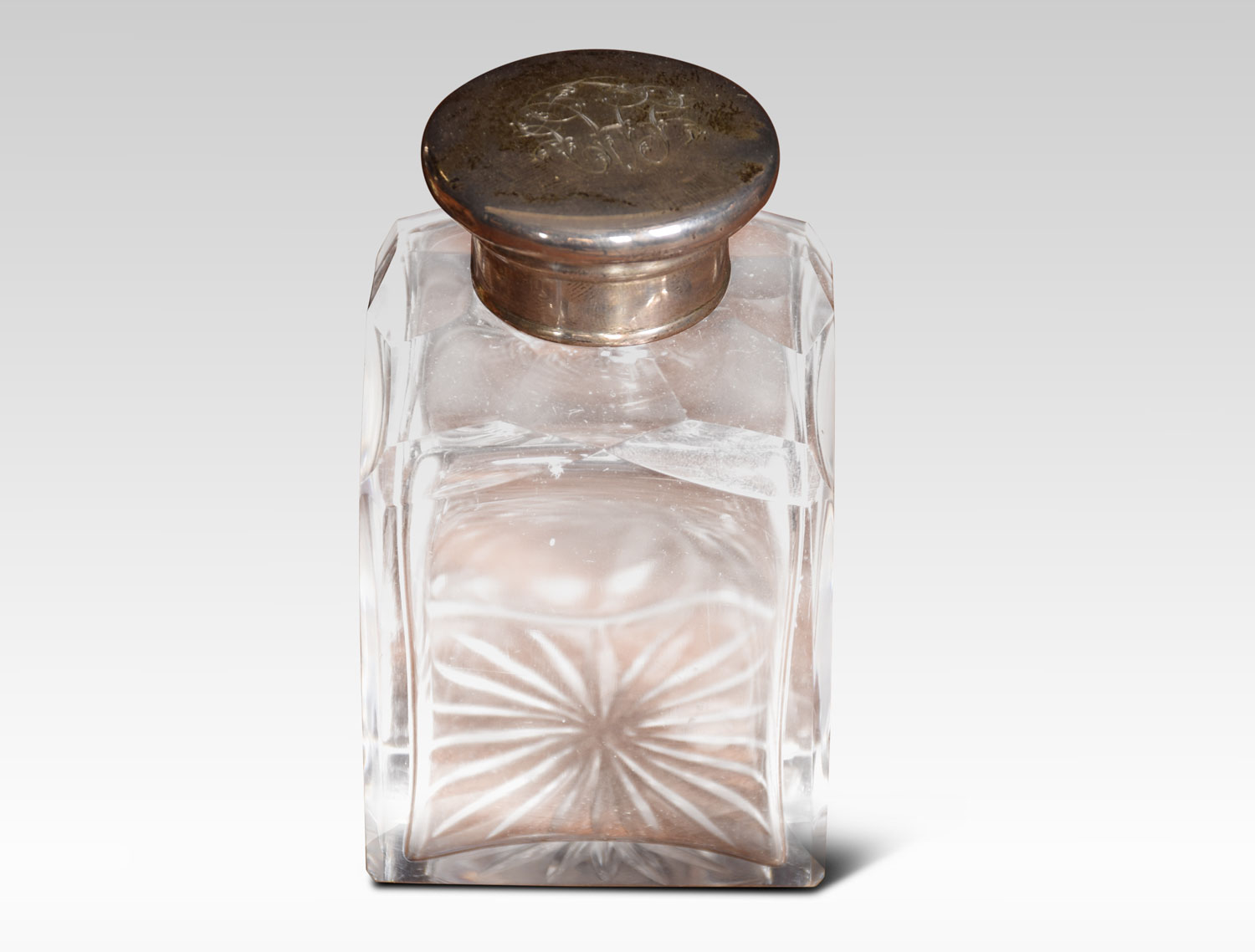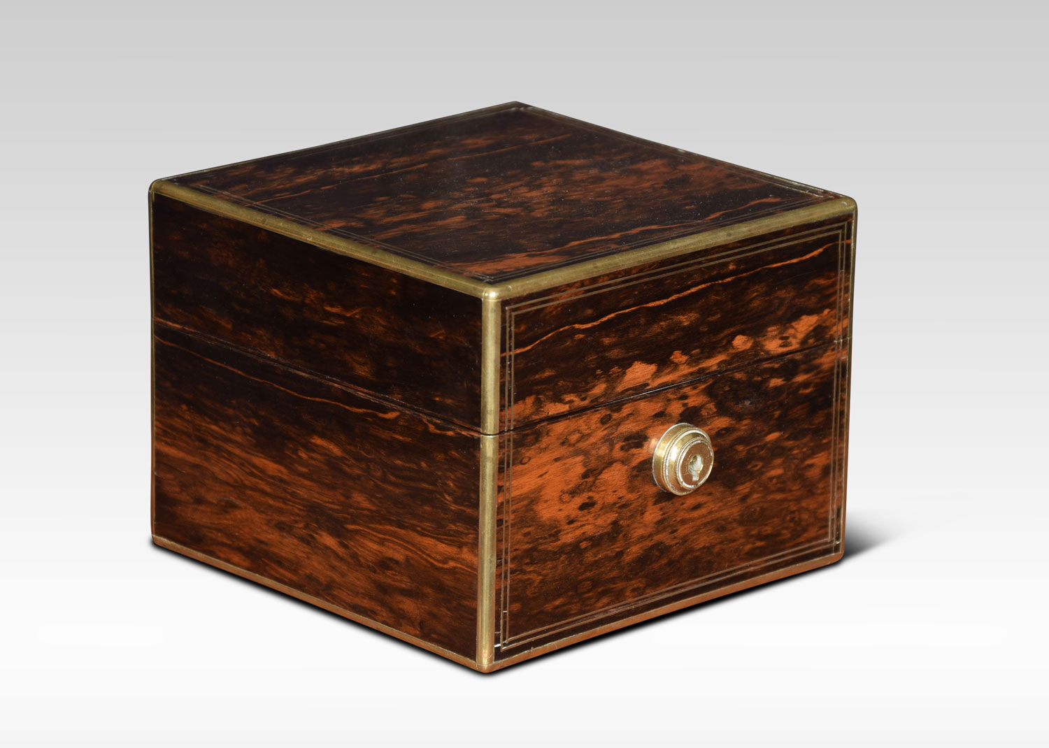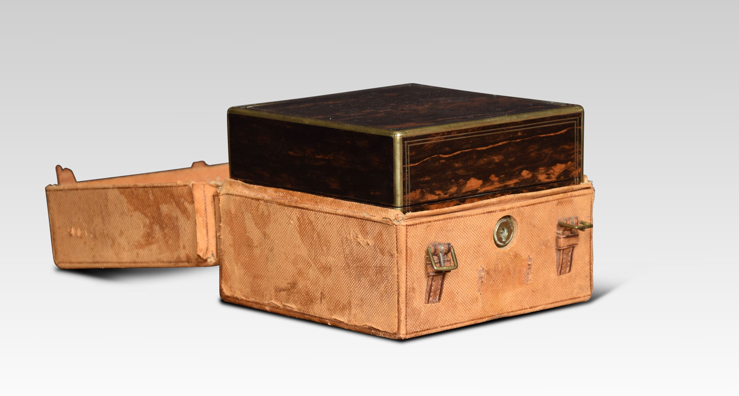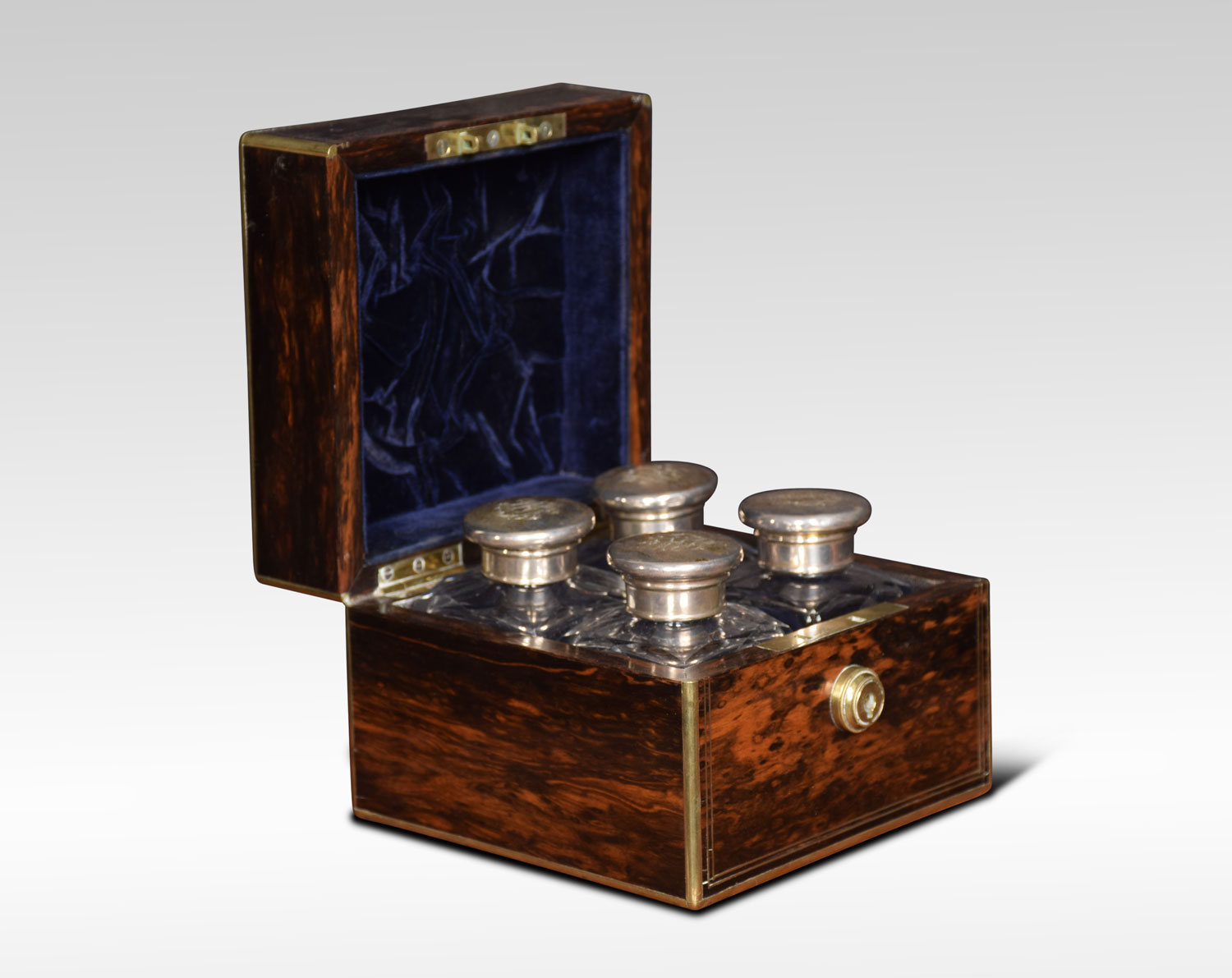 A set of four cologne or perfume bottles in fitted coromandel and brass case. The four silvered lids with etched motifs above cut glass square bottles. The box marked Austin of Dublin. Retaining its original leather outer case.