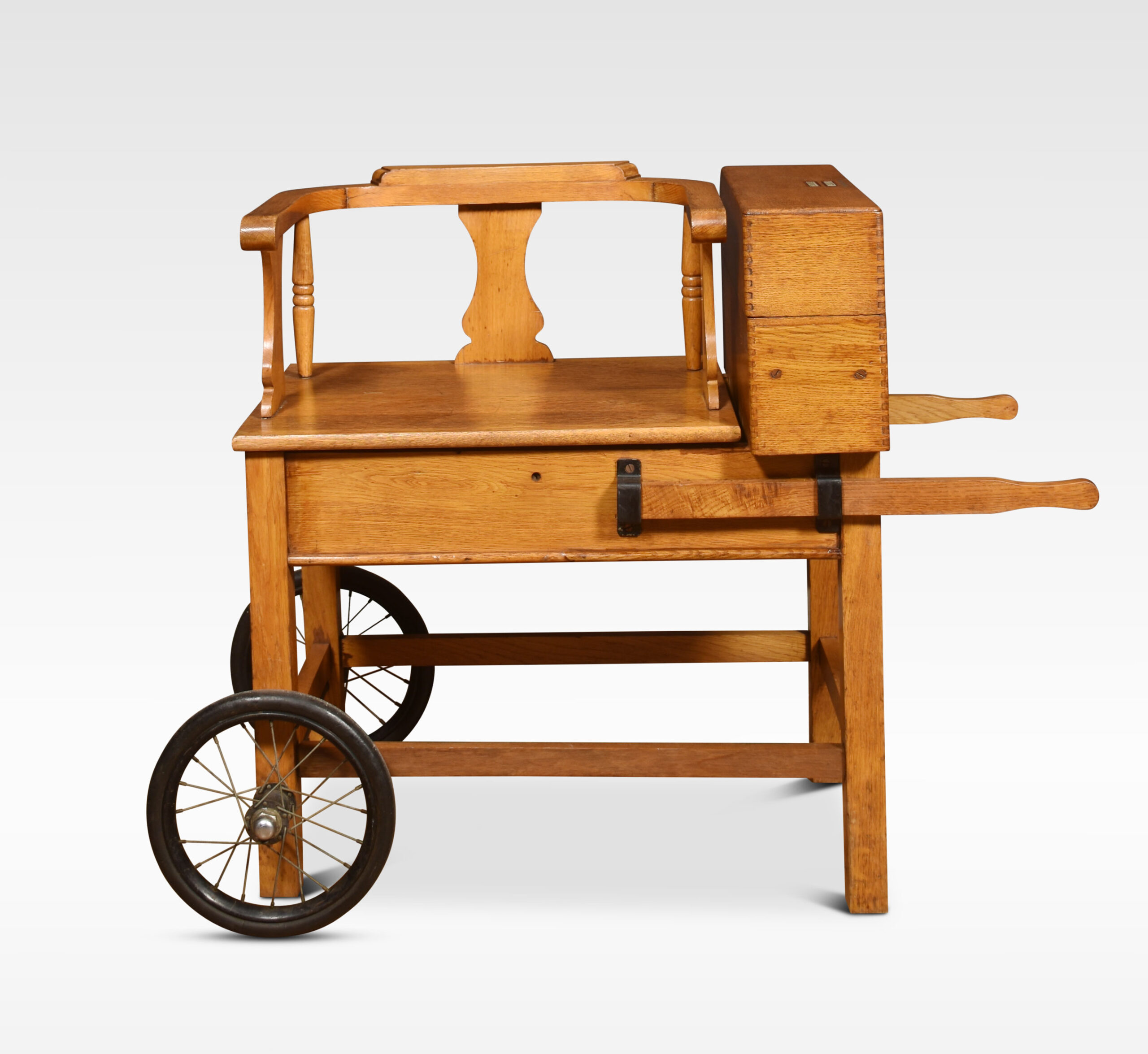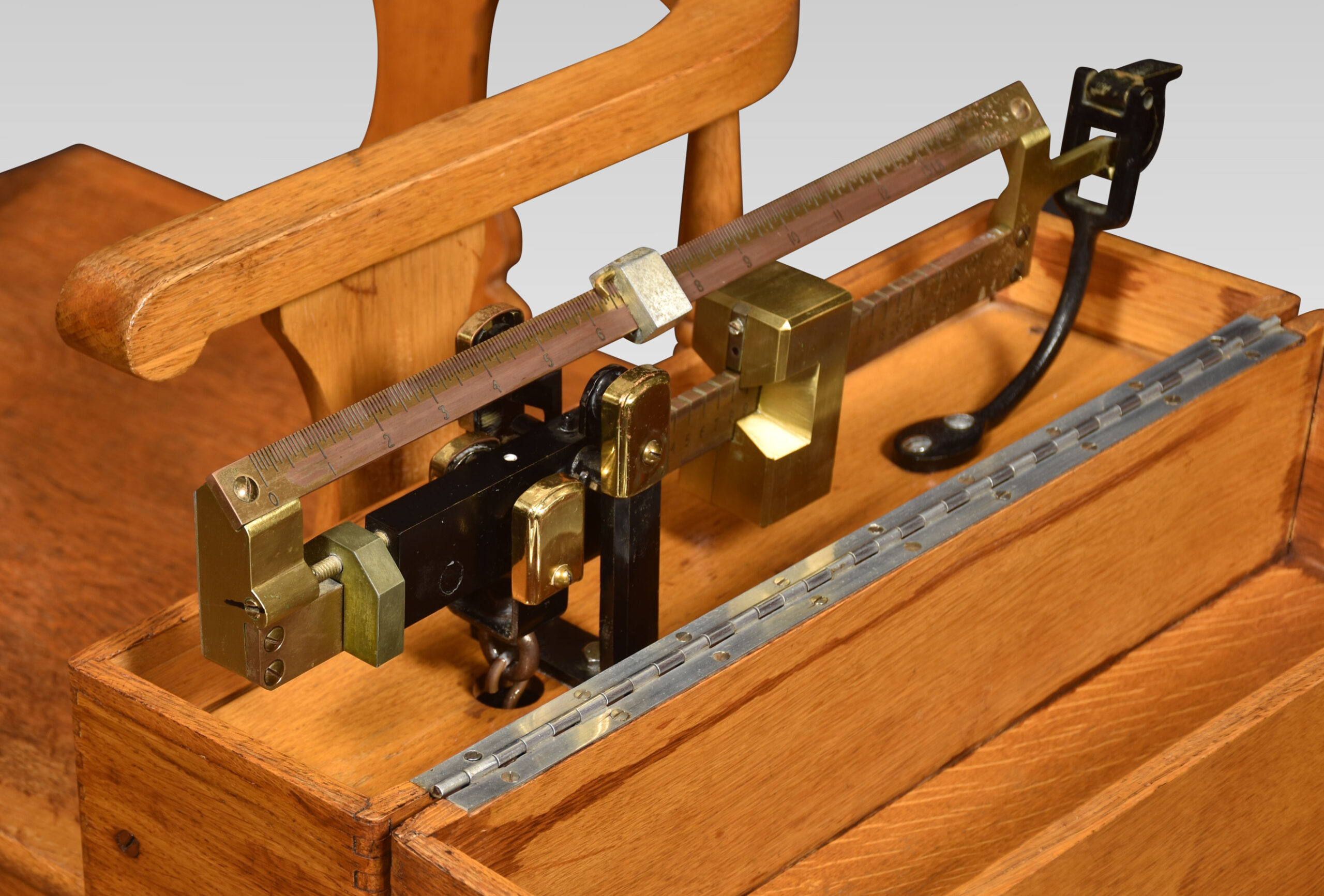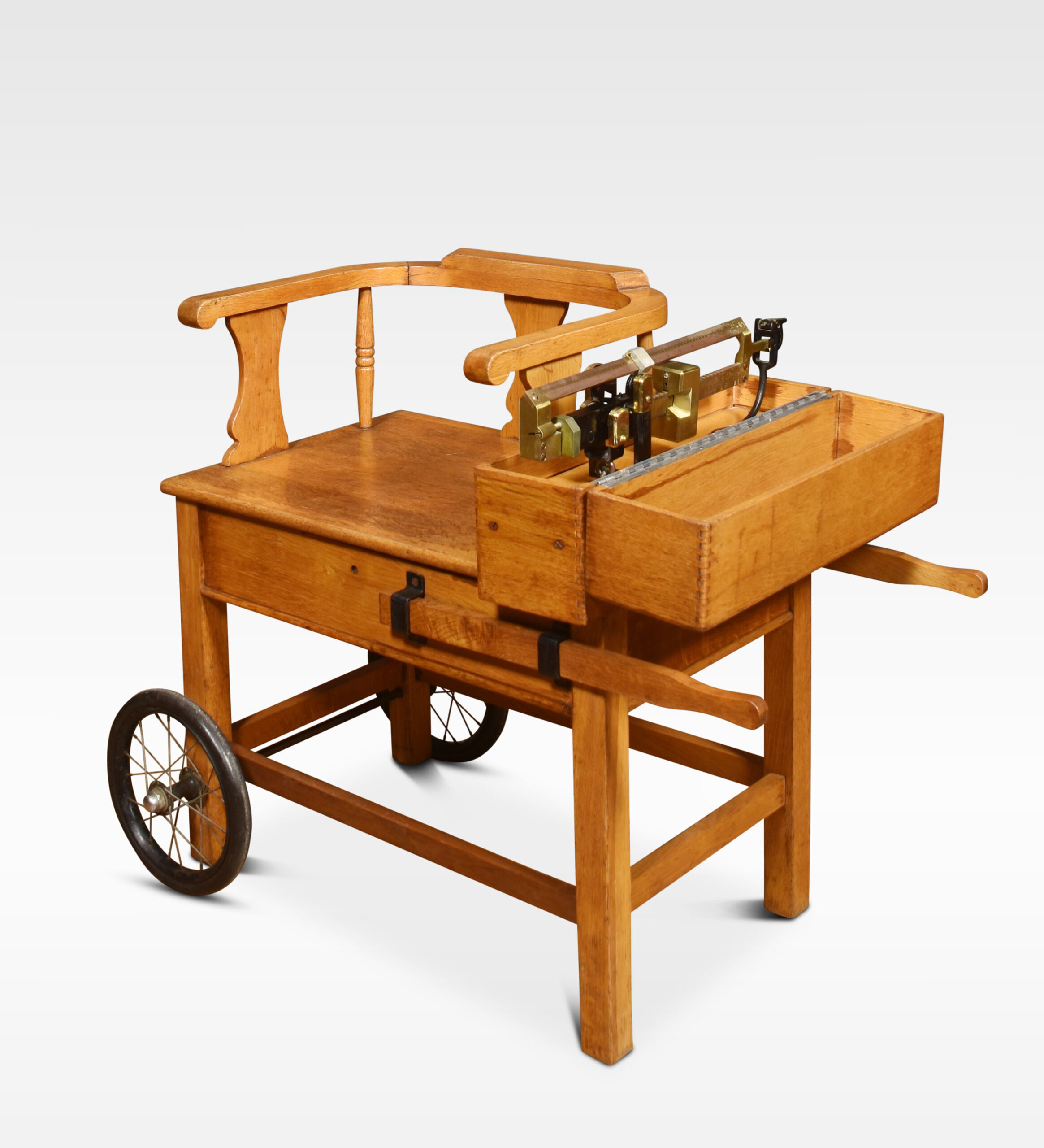 Set of doctors scales for C.F Thakray Chemists.The solid oak seat with shaped back alongside cast balance scale. standing on square sports with pull out handles terminating in spoked wheels.