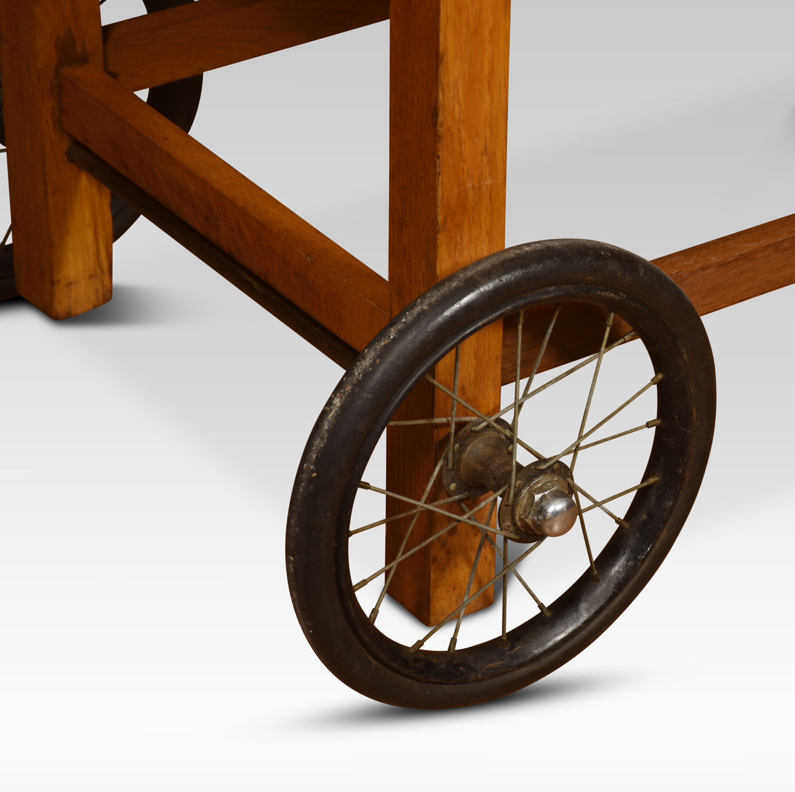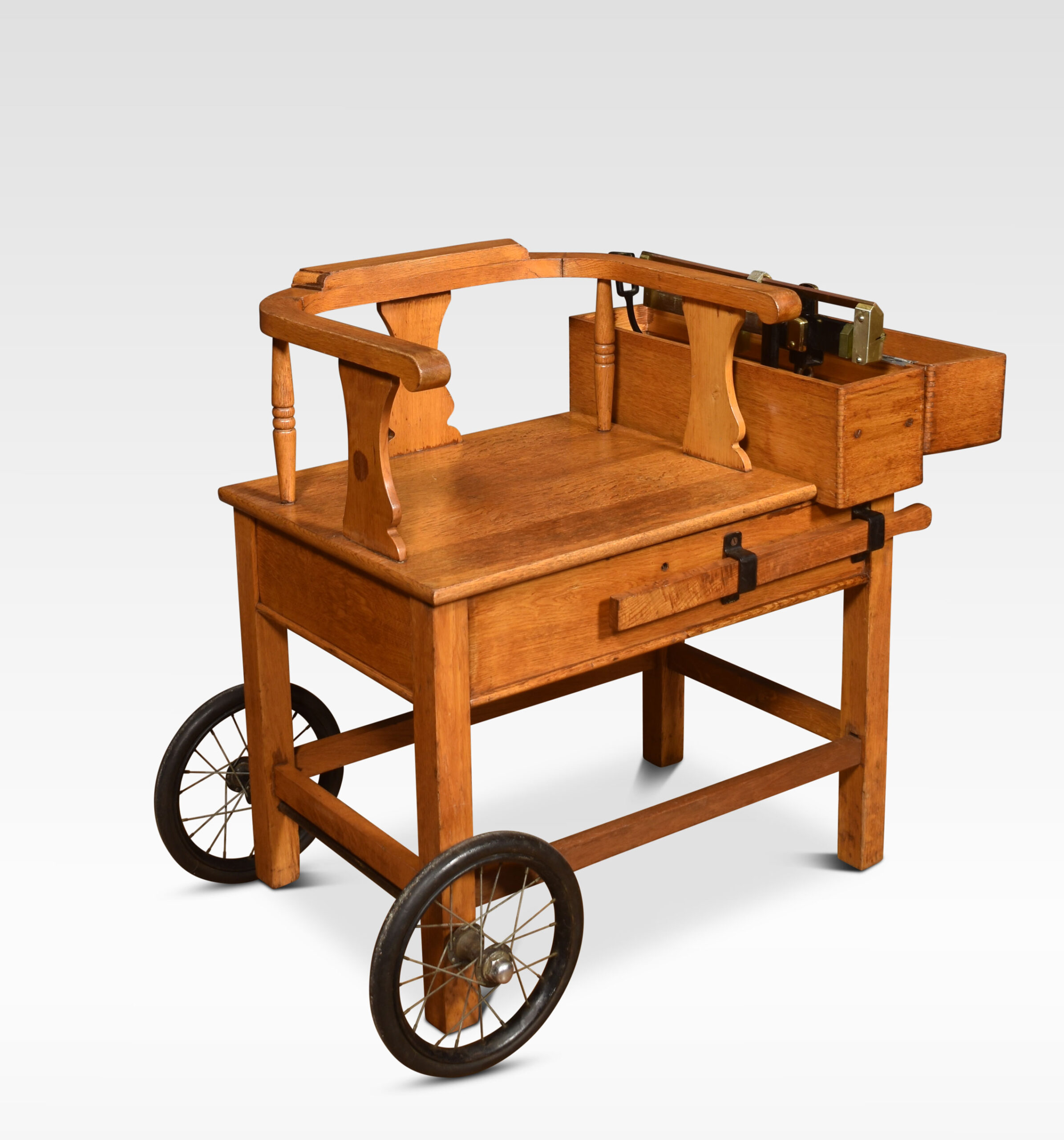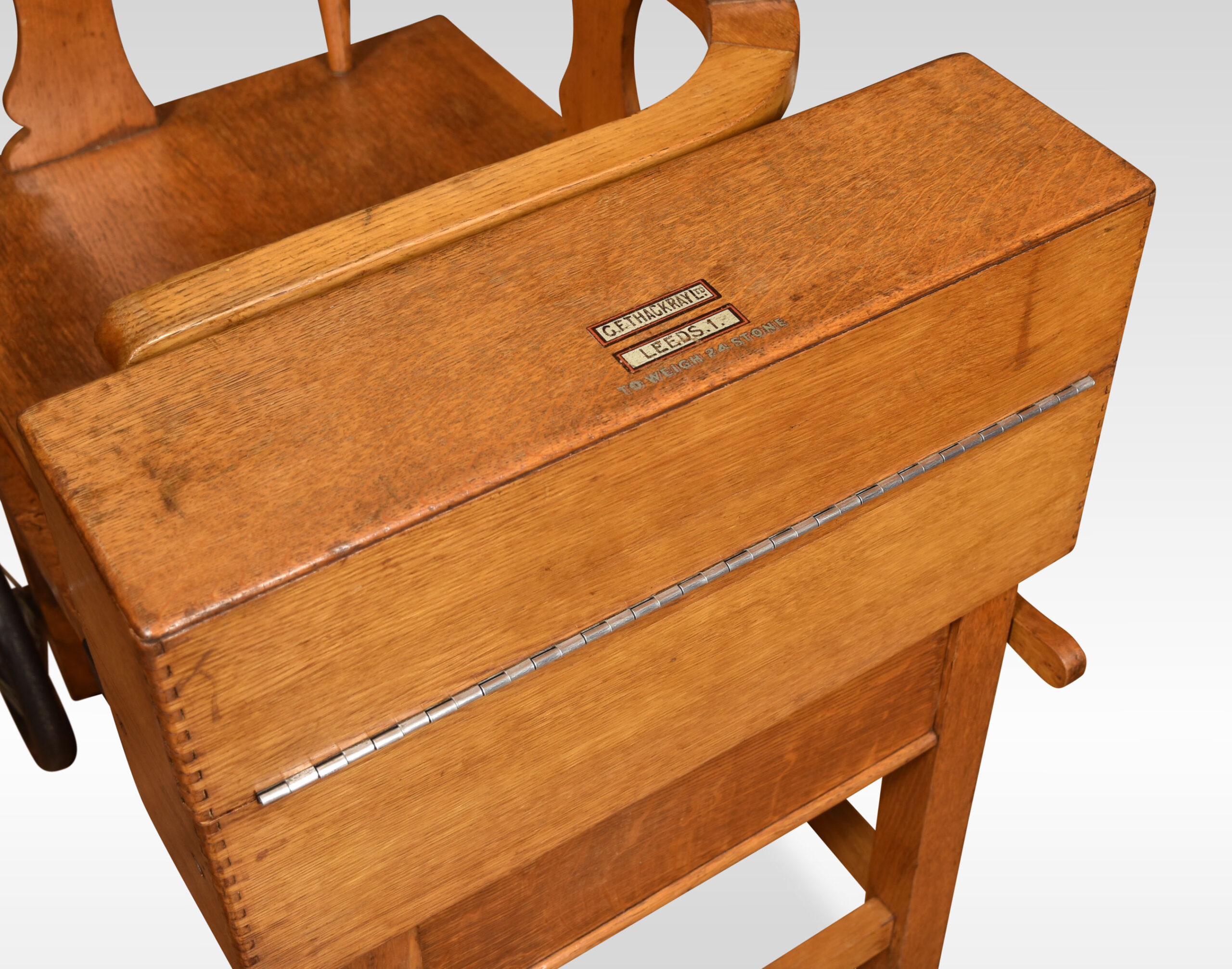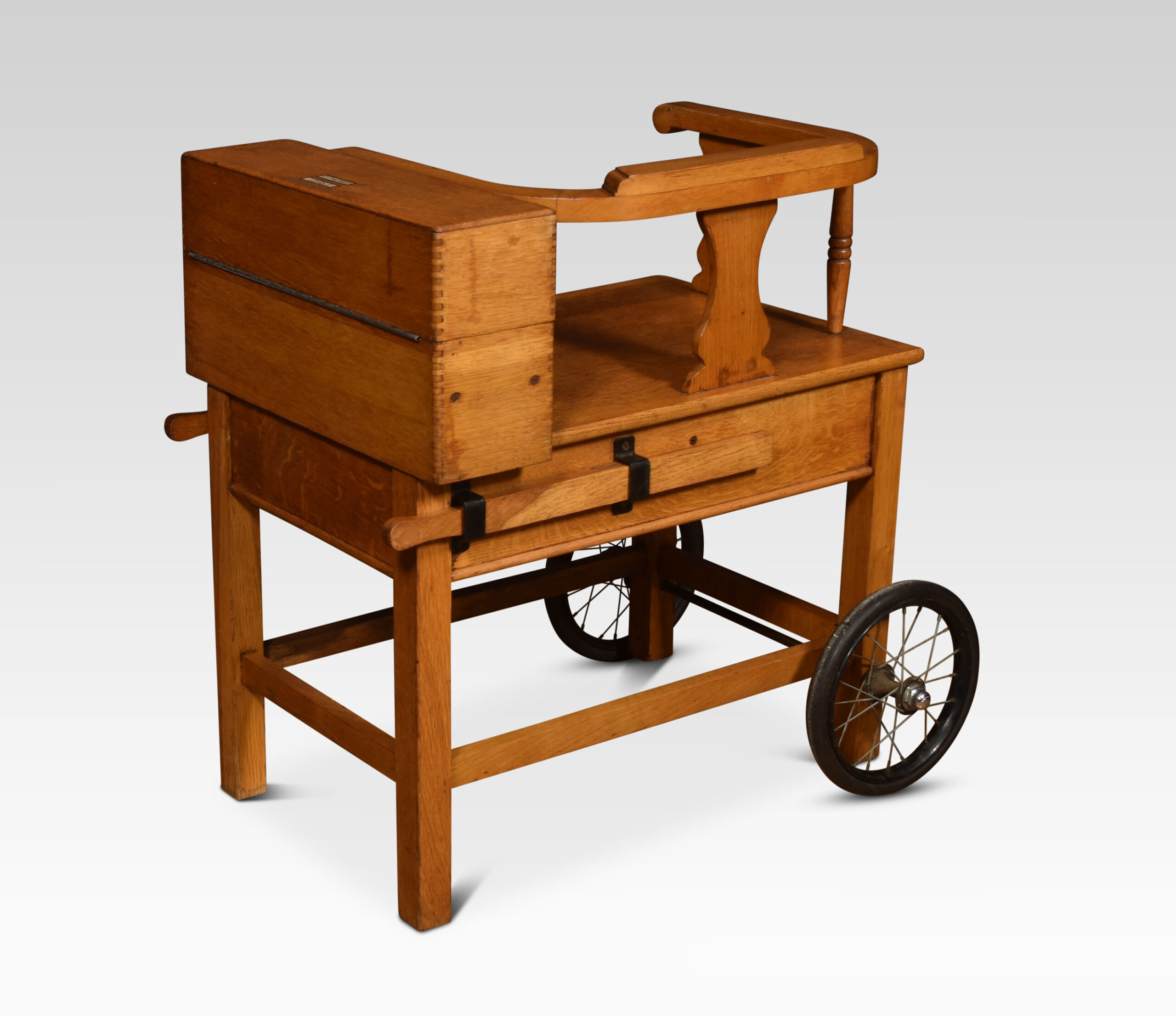 Set of doctors scales for C.F Thakray Chemists.The solid oak seat with shaped back alongside cast balance scale. standing on square sports with pull out handles terminating in spoked wheels.