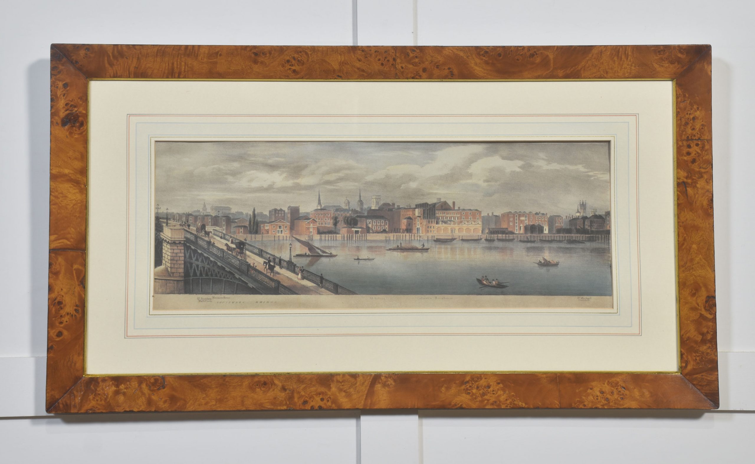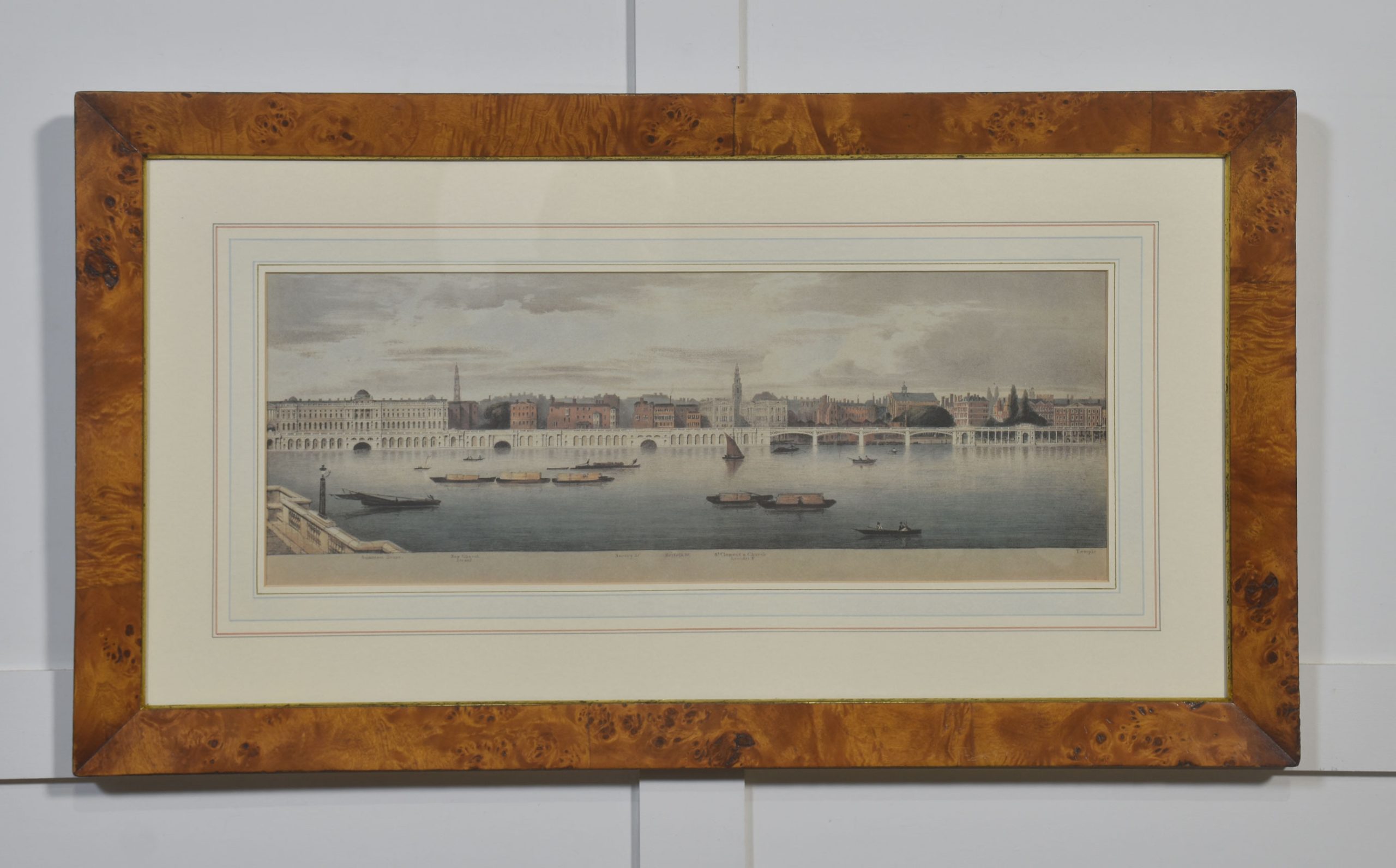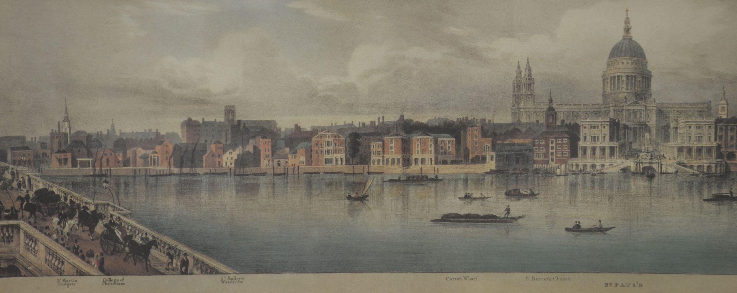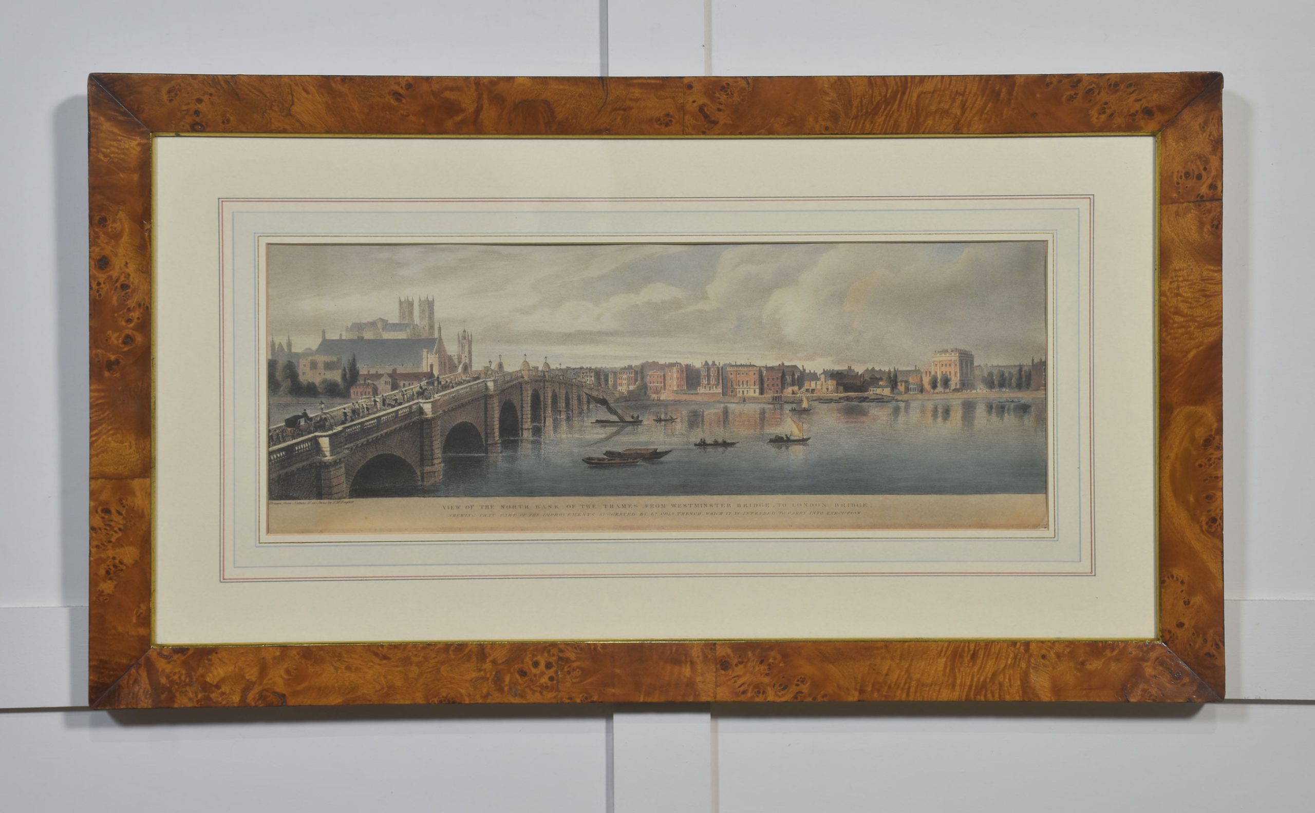 A cohesive and visually impressive suite of panoramic river views depicting the Thames as it winds through historic London. Each work presents a carefully articulated prospect along the river, recording the city’s architectural grandeur, commercial life, and bridges at a moment when topographical accuracy and picturesque effect were closely allied. The scenes include extended stretches between Westminster Bridge and London Bridge, with prominent landmarks such as St Paul’s Cathedral rising above the riverfront skyline.
