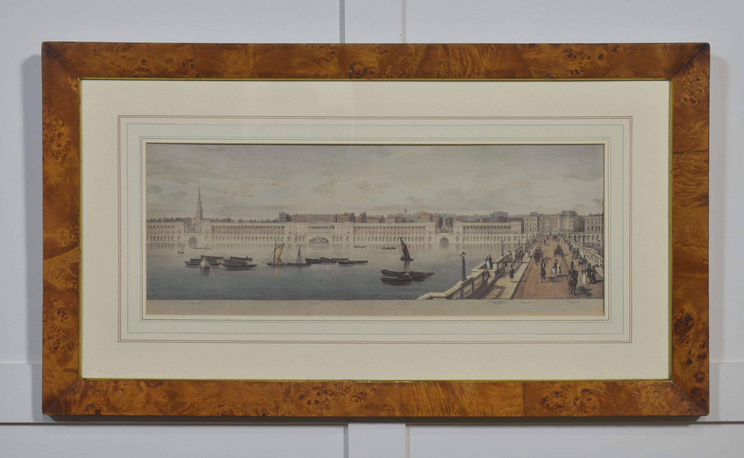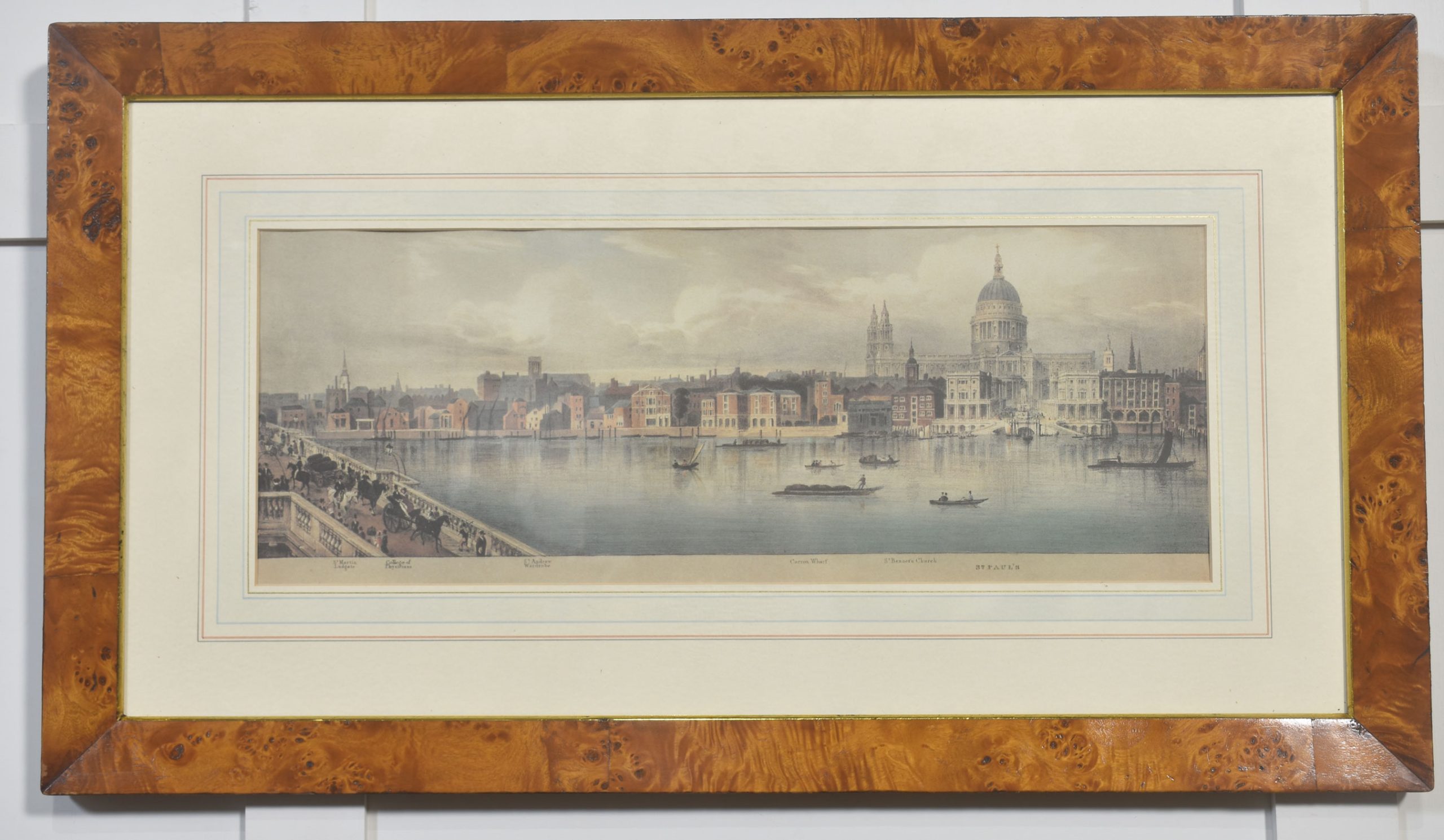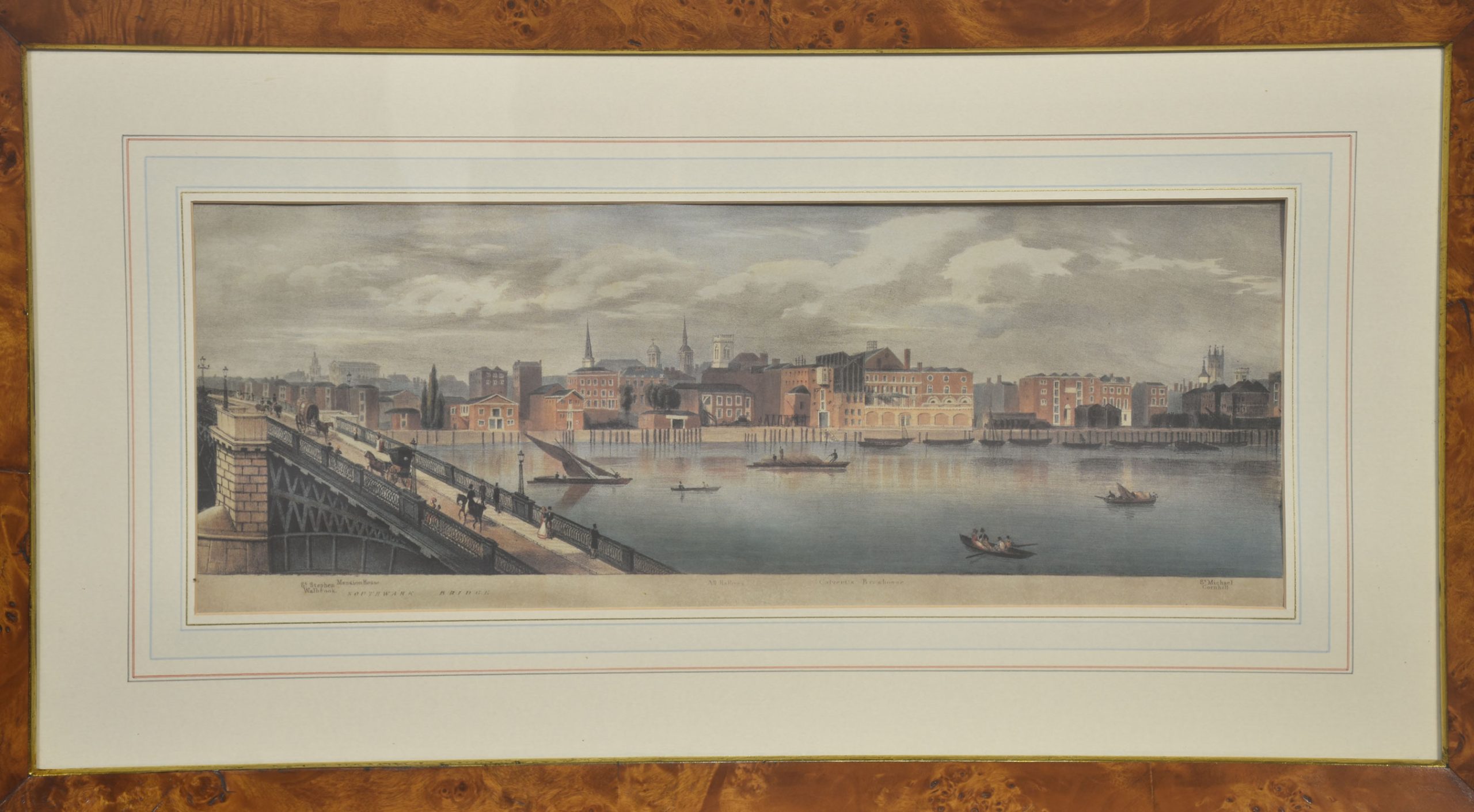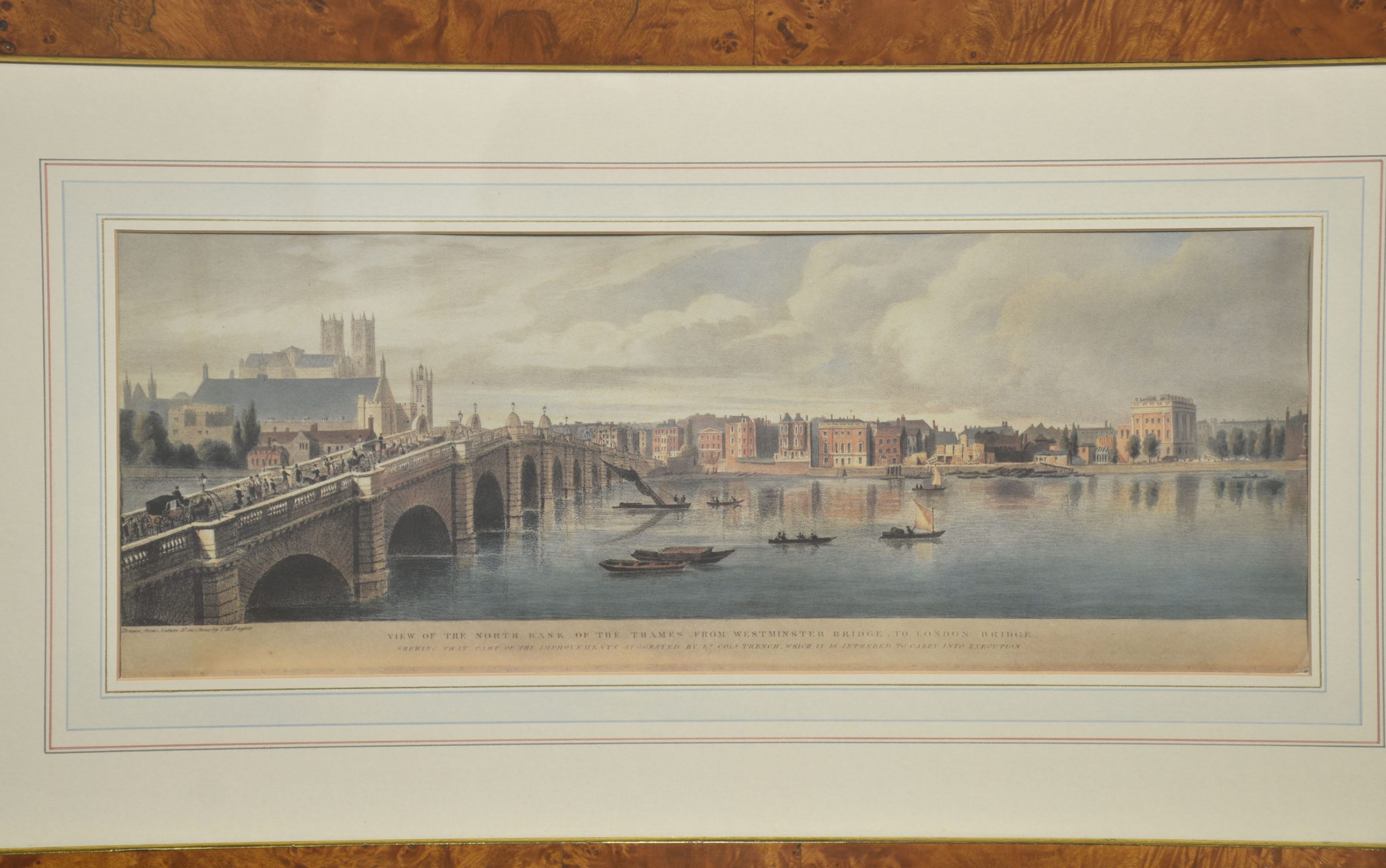 A cohesive and visually impressive suite of panoramic river views depicting the Thames as it winds through historic London. Each work presents a carefully articulated prospect along the river, recording the city’s architectural grandeur, commercial life, and bridges at a moment when topographical accuracy and picturesque effect were closely allied. The scenes include extended stretches between Westminster Bridge and London Bridge, with prominent landmarks such as St Paul’s Cathedral rising above the riverfront skyline.