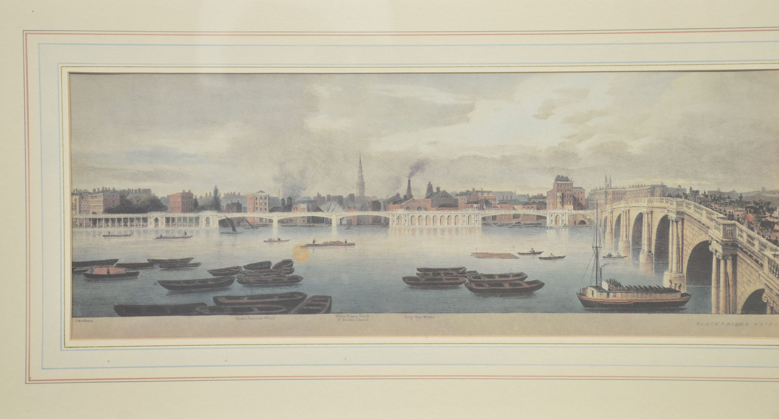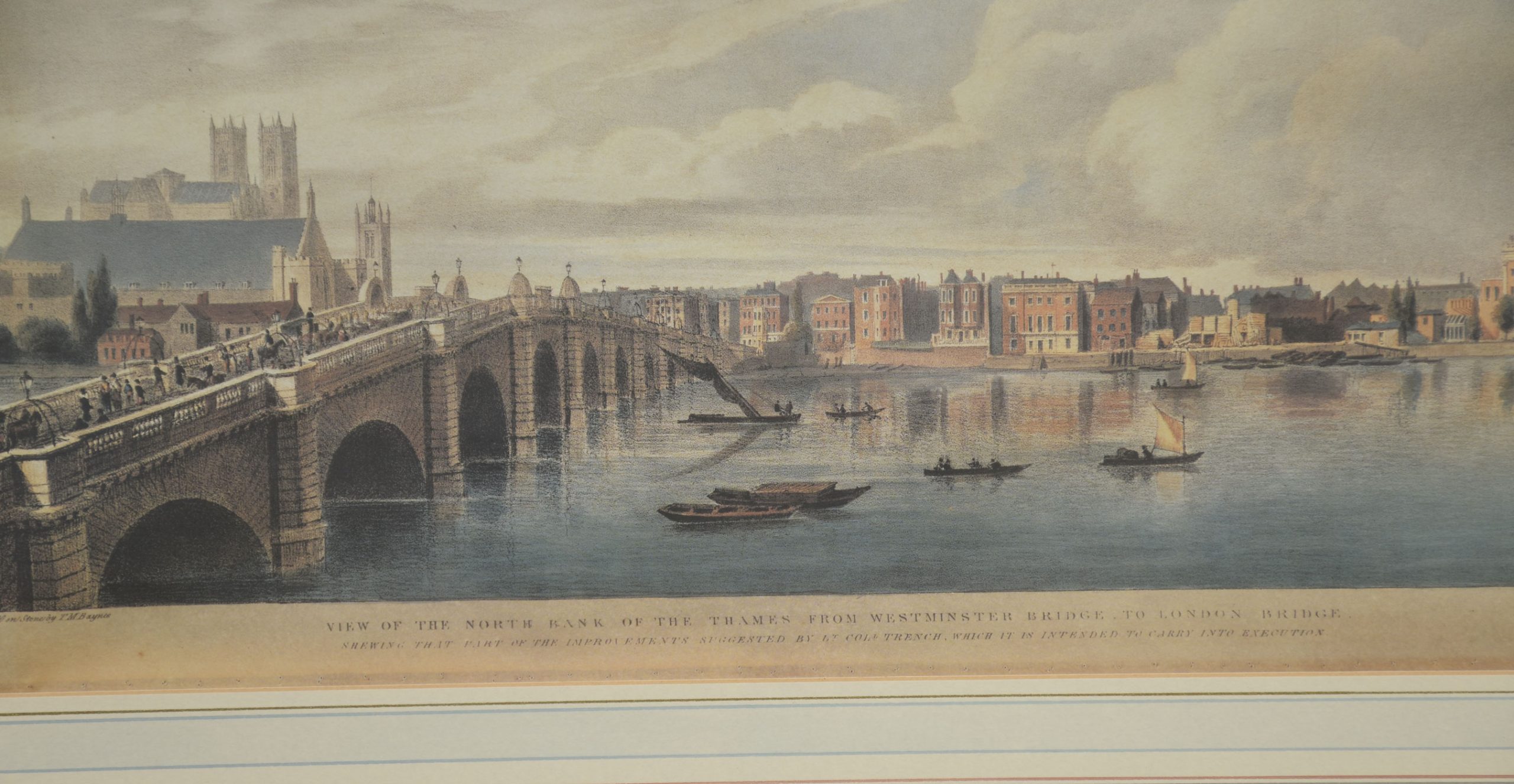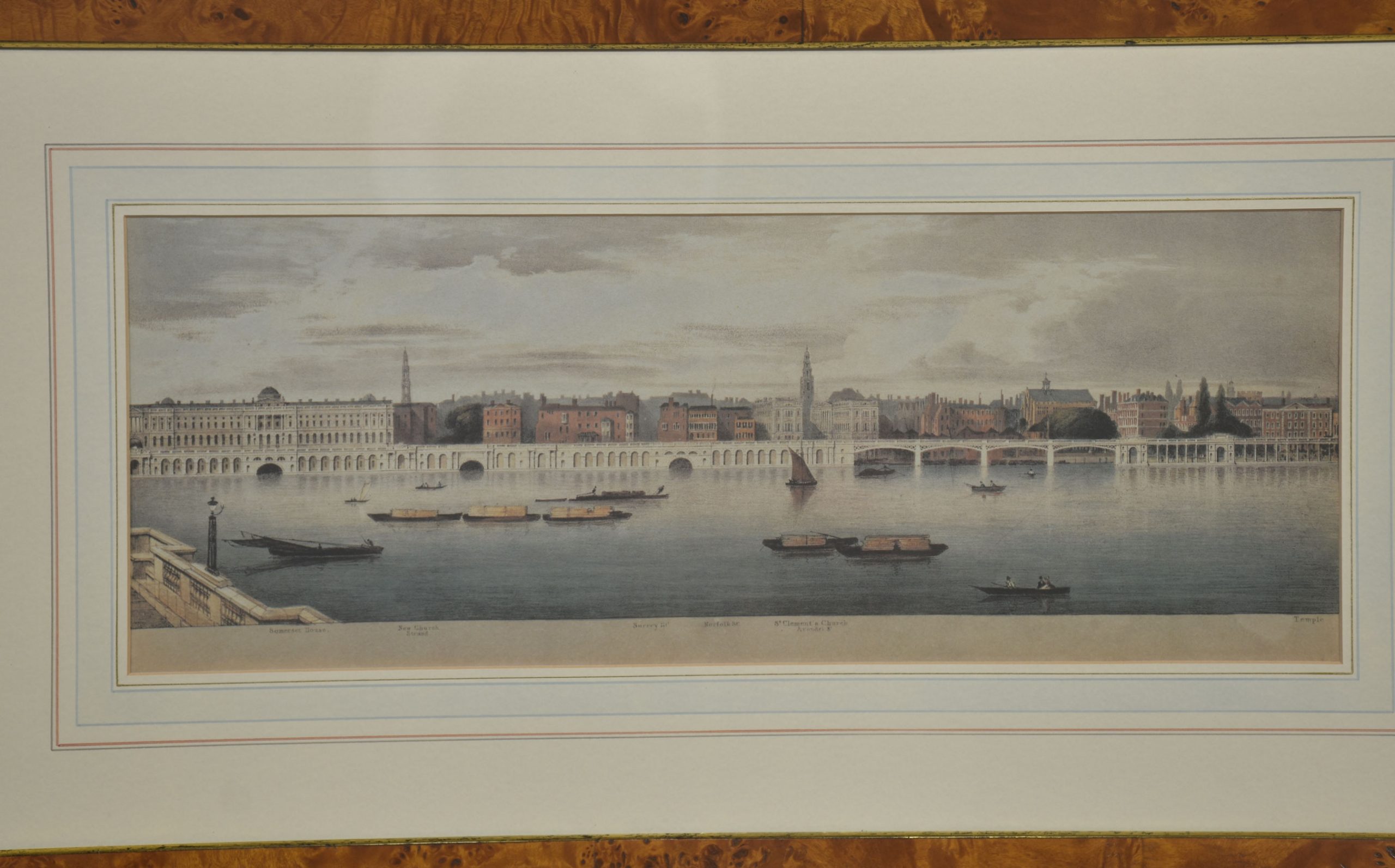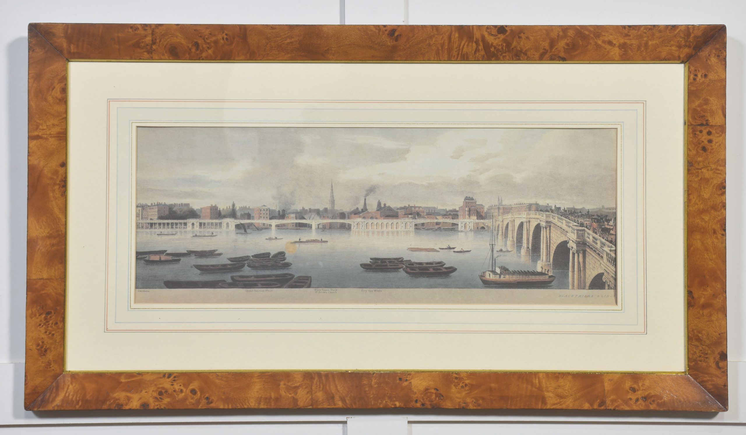 A cohesive and visually impressive suite of panoramic river views depicting the Thames as it winds through historic London. Each work presents a carefully articulated prospect along the river, recording the city’s architectural grandeur, commercial life, and bridges at a moment when topographical accuracy and picturesque effect were closely allied. The scenes include extended stretches between Westminster Bridge and London Bridge, with prominent landmarks such as St Paul’s Cathedral rising above the riverfront skyline.