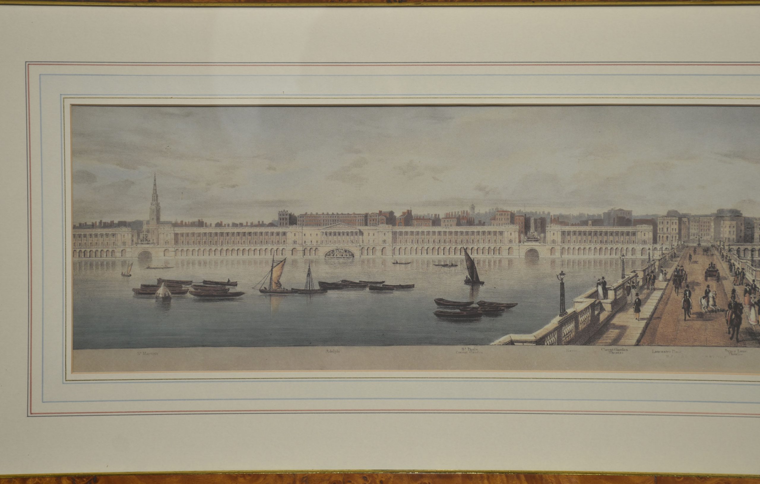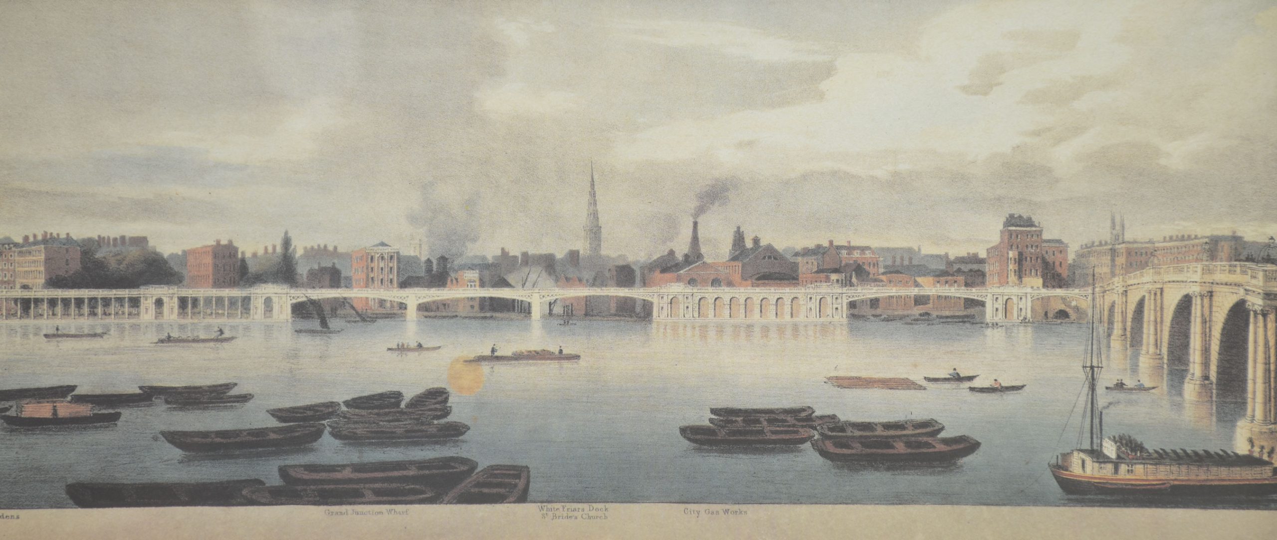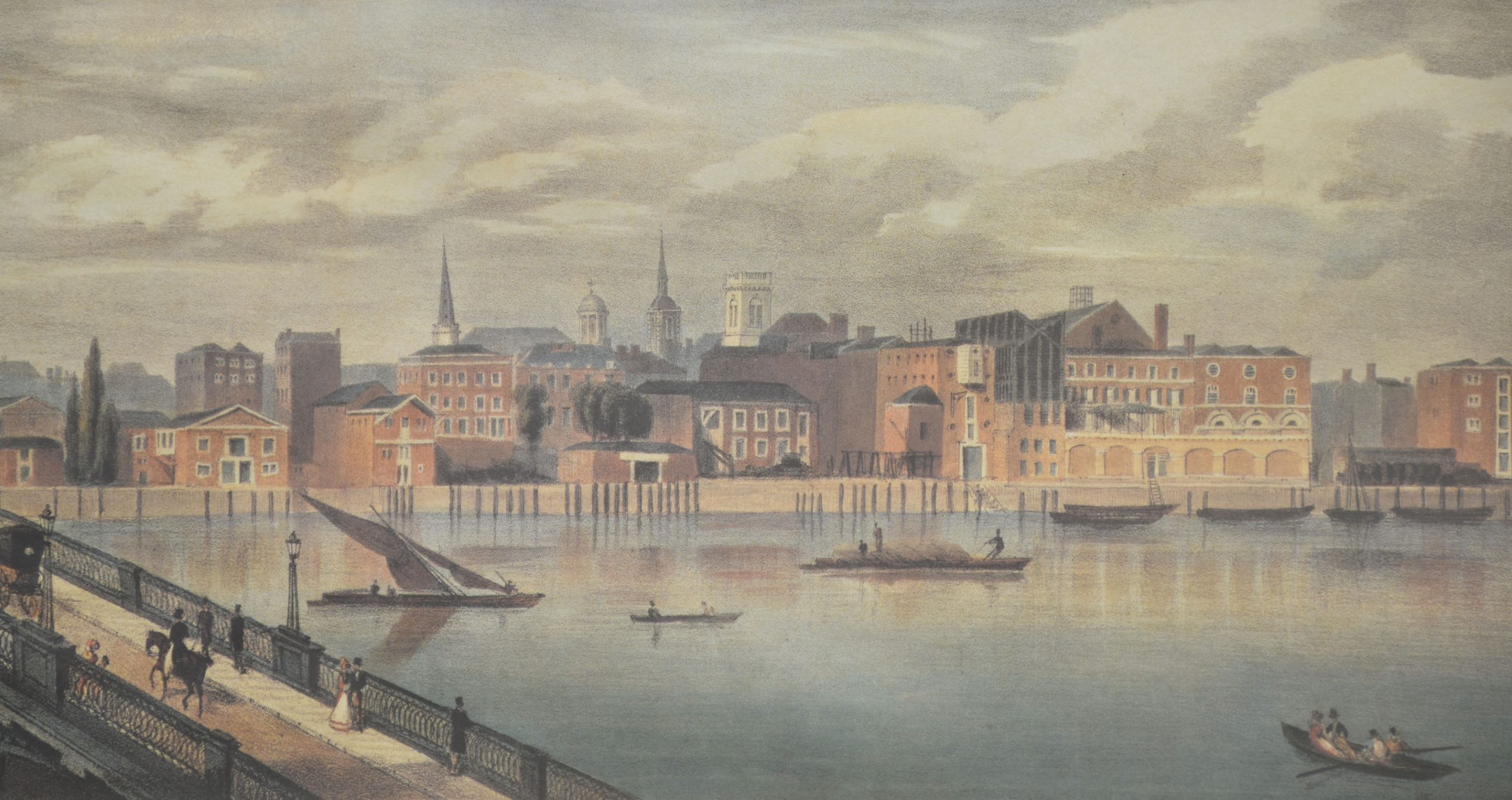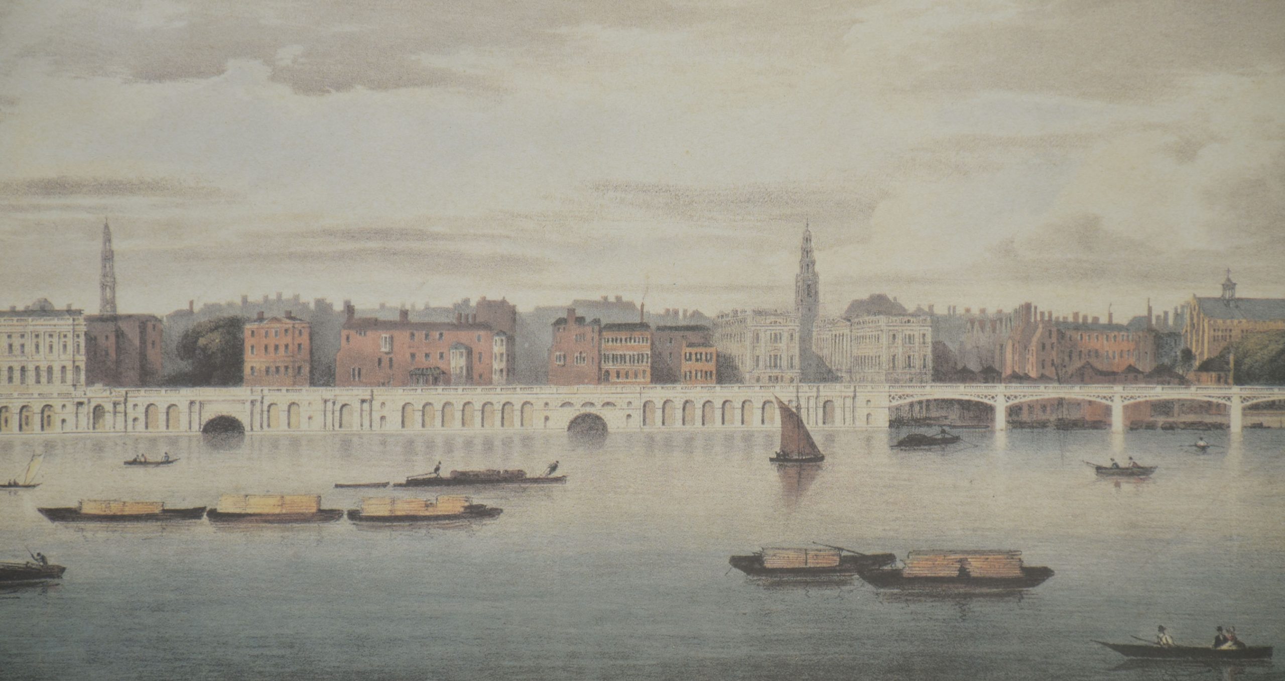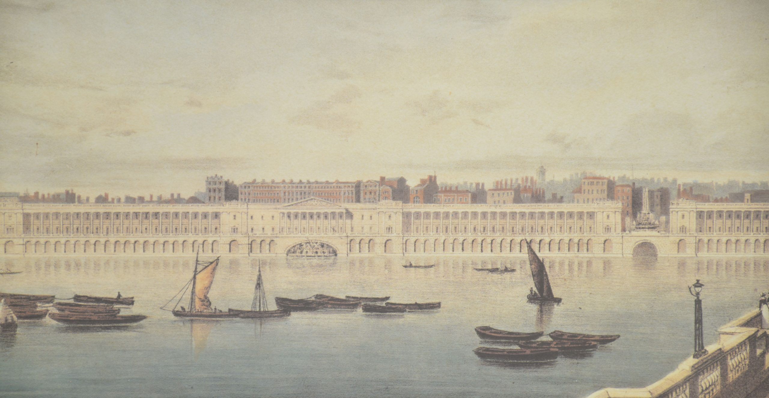 Rendered in a delicate, restrained palette, the compositions balance architectural precision with atmospheric perspective. River traffic—barges, wherries, and small sailing craft—animates the water, while pedestrians, carriages, and figures on bridges lend scale and narrative interest. The long, horizontal format emphasizes the breadth of the Thames and allows for uninterrupted sequences of buildings, bridges, and embankments, characteristic of panoramic views intended for sustained visual reading rather than a single focal point.