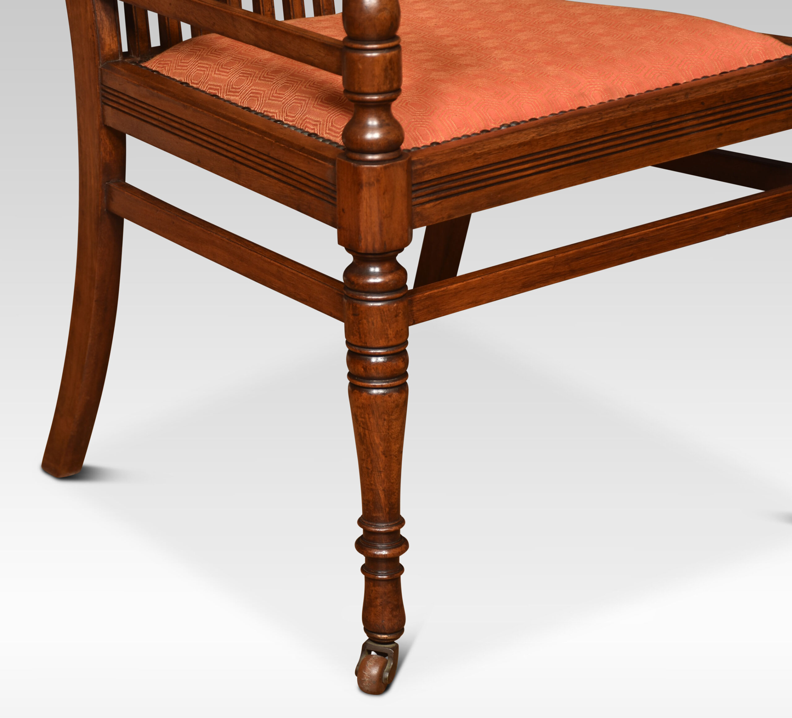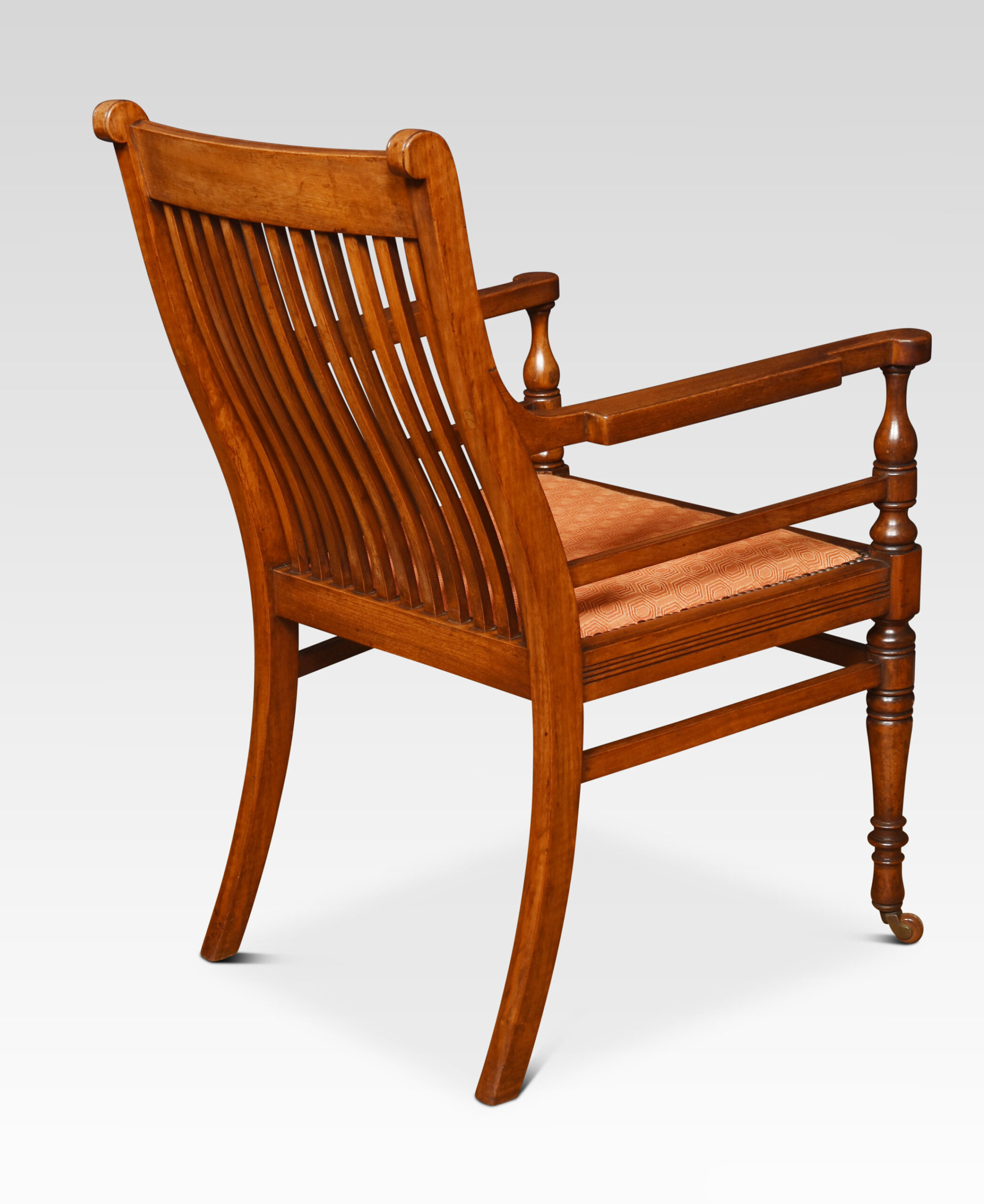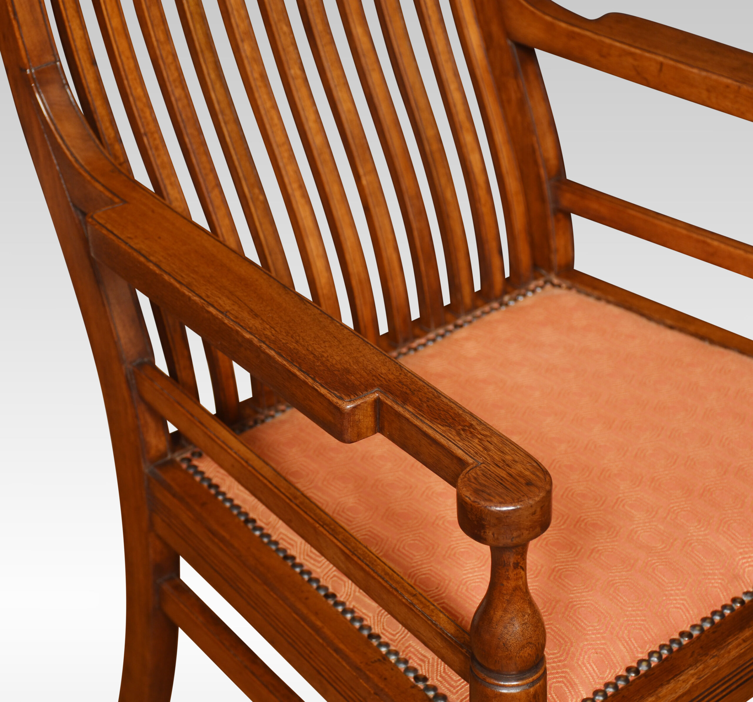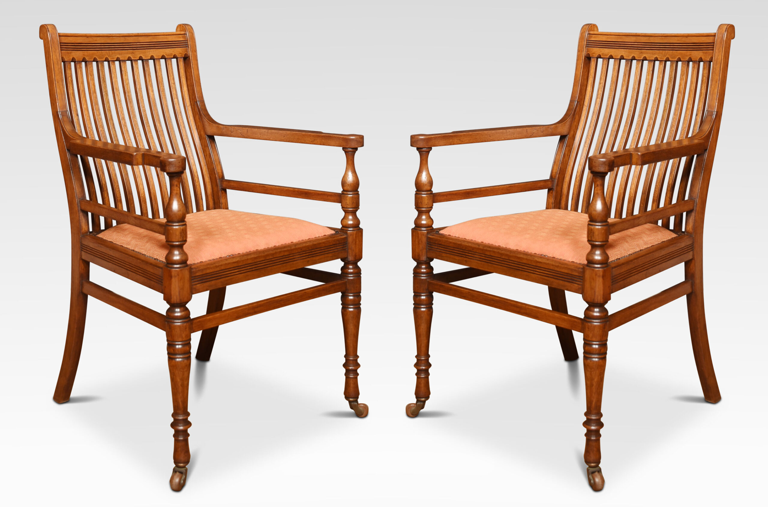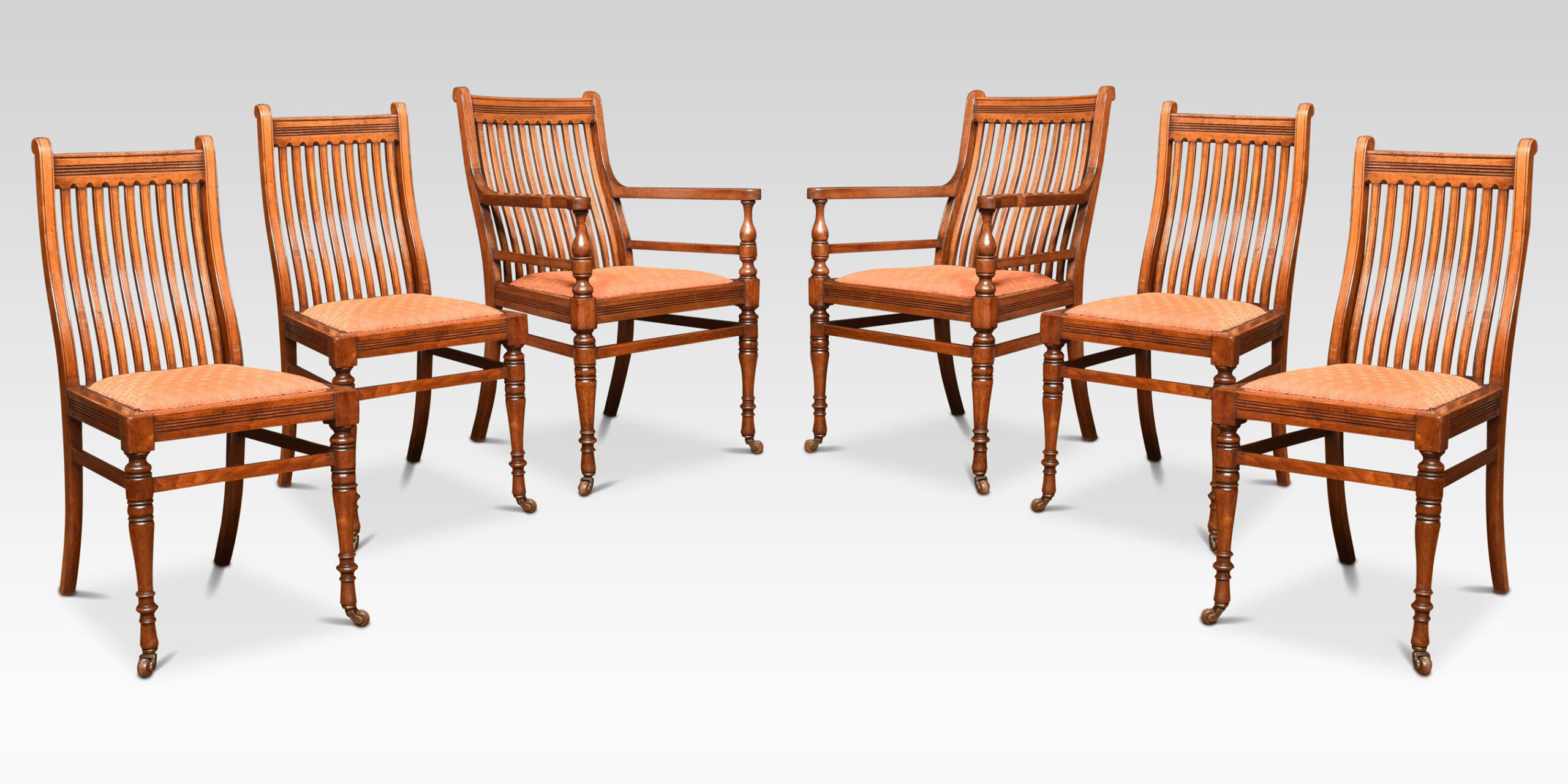 Set of Six James Shoolbread dining chairs, comprising of two armchairs and four chairs, the shed comb backs above upholstered seat. All raised up on ring turned legs united by stretchers.