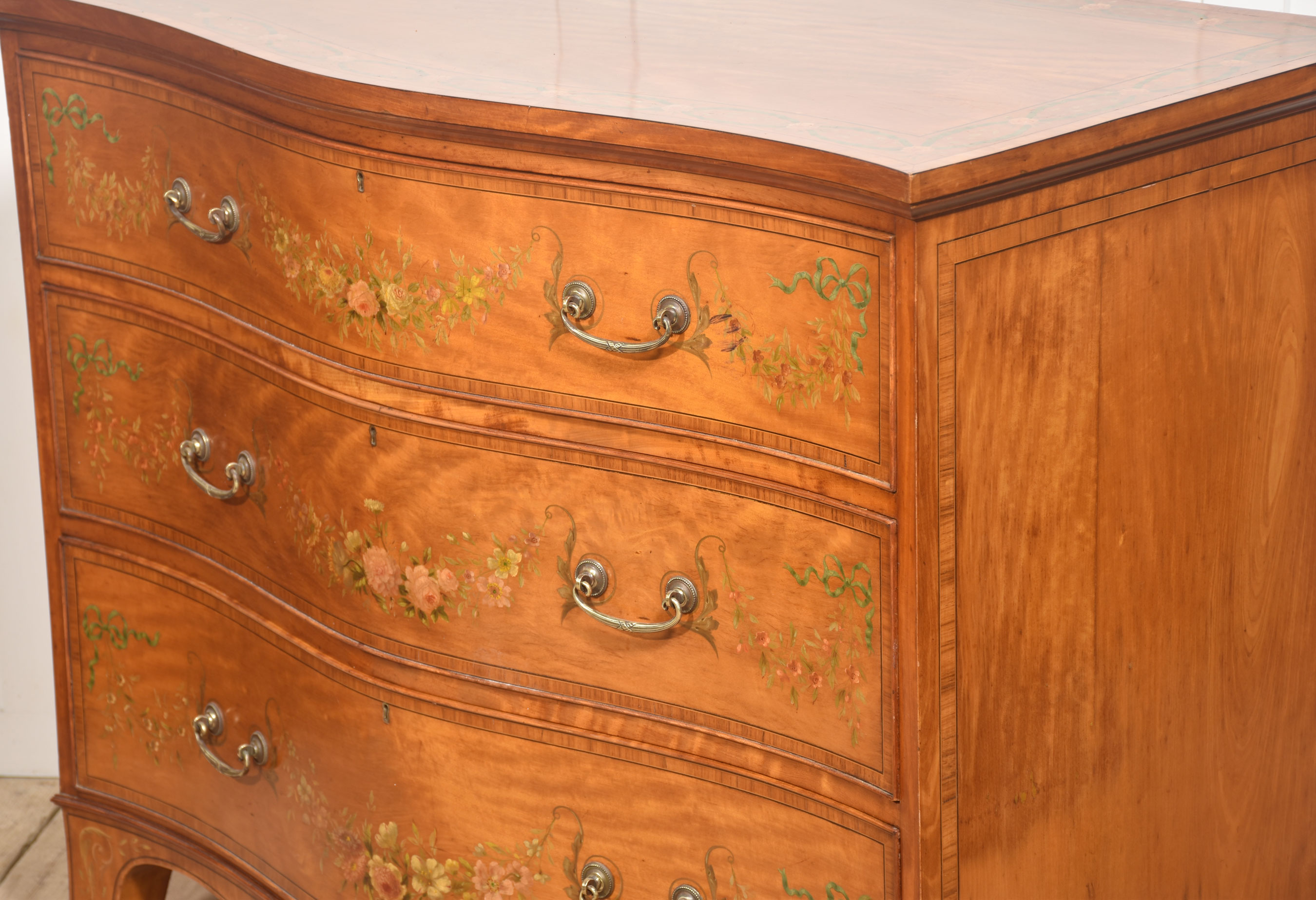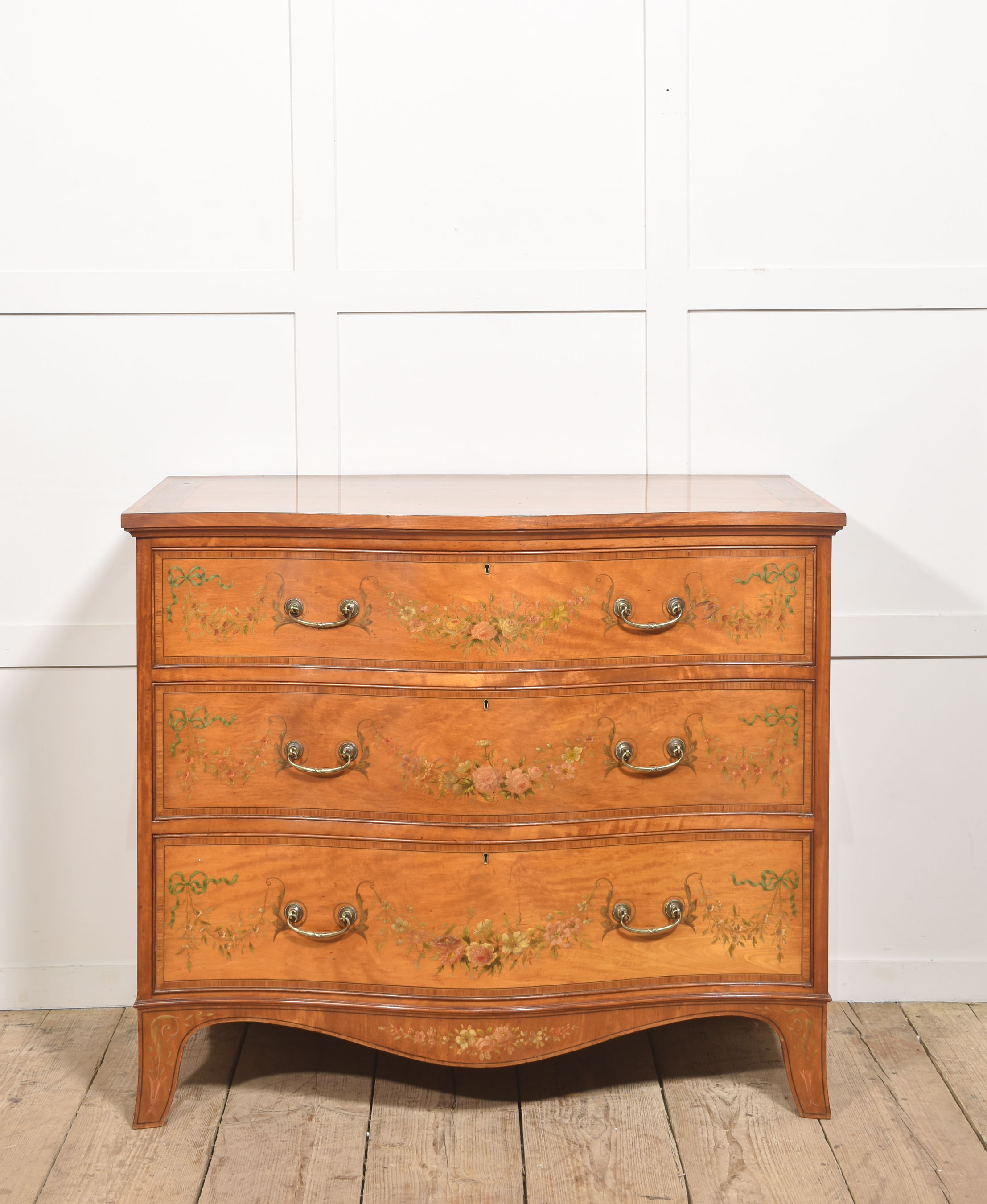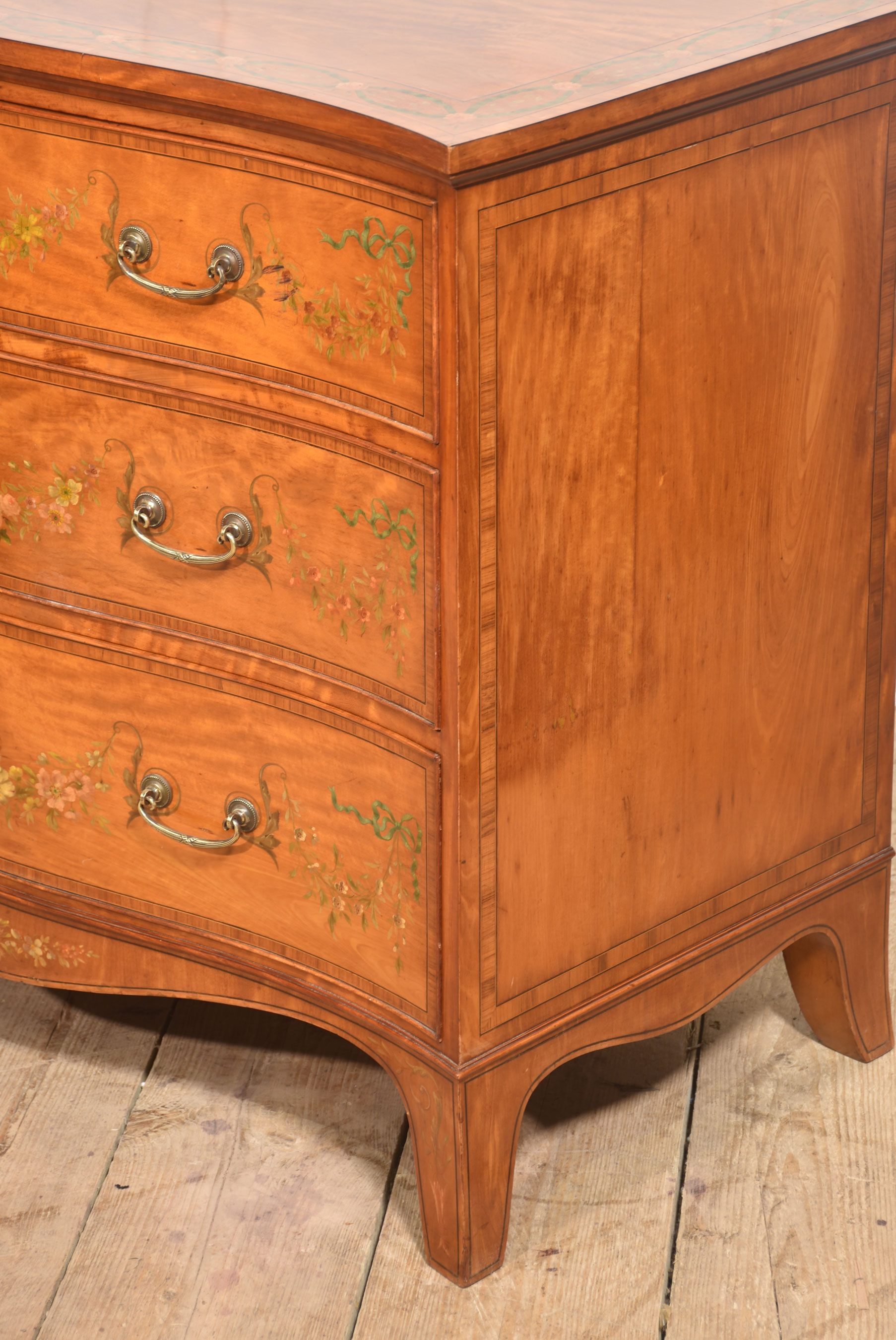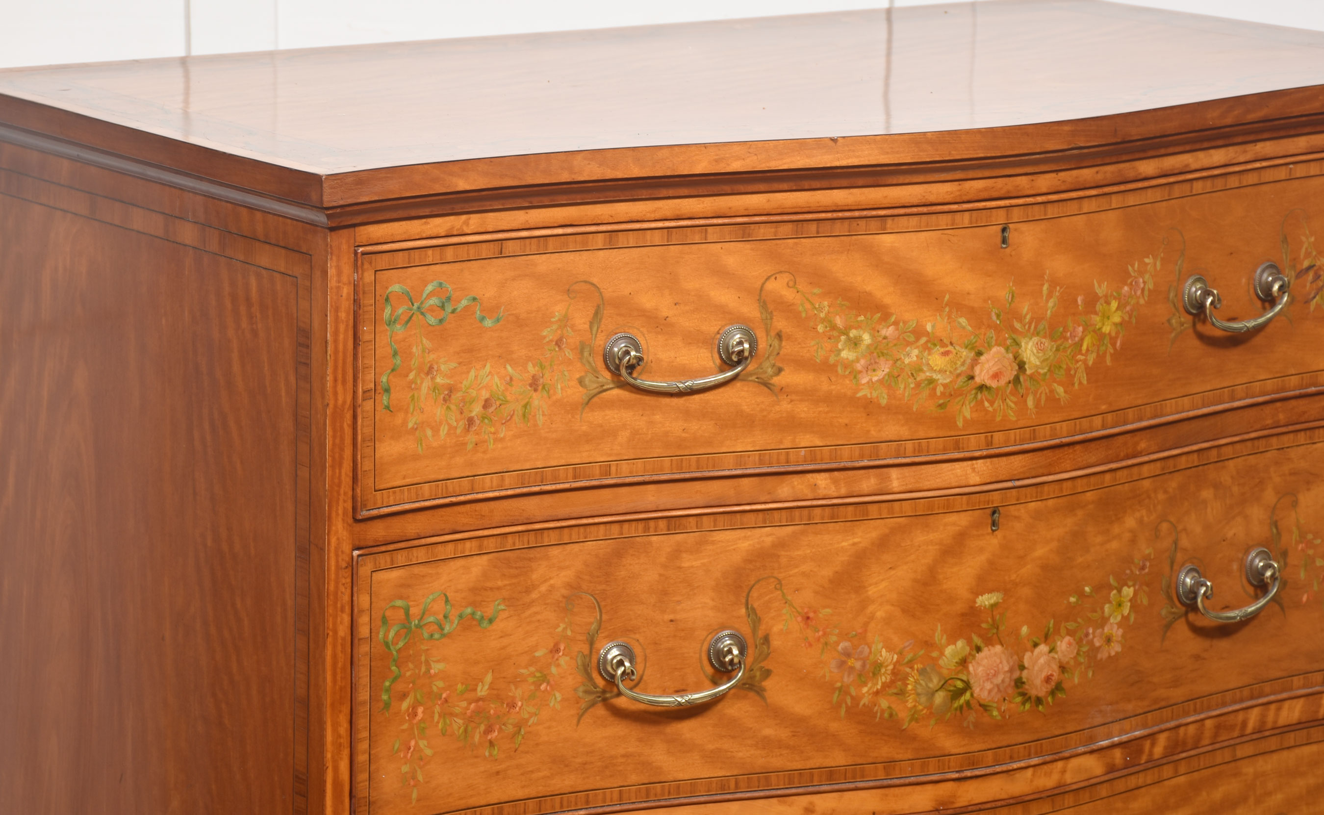A finely crafted serpentine-front chest of drawers in the Sheraton Revival taste, constructed in richly figured satinwood and decorated throughout with delicate hand-painted floral ornament. The shaped rectangular top, with gently bowed front, is bordered by a subtle line inlay and exhibits the characteristic soft sheen and fine, even grain of satinwood.