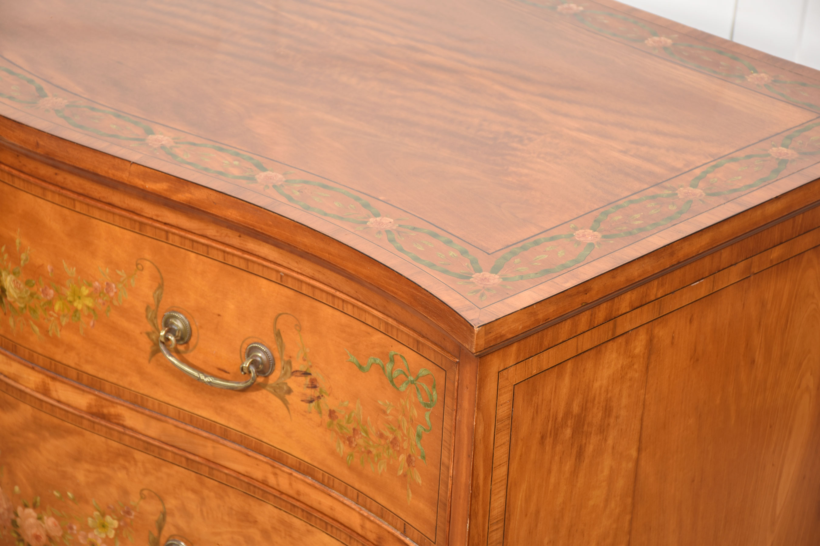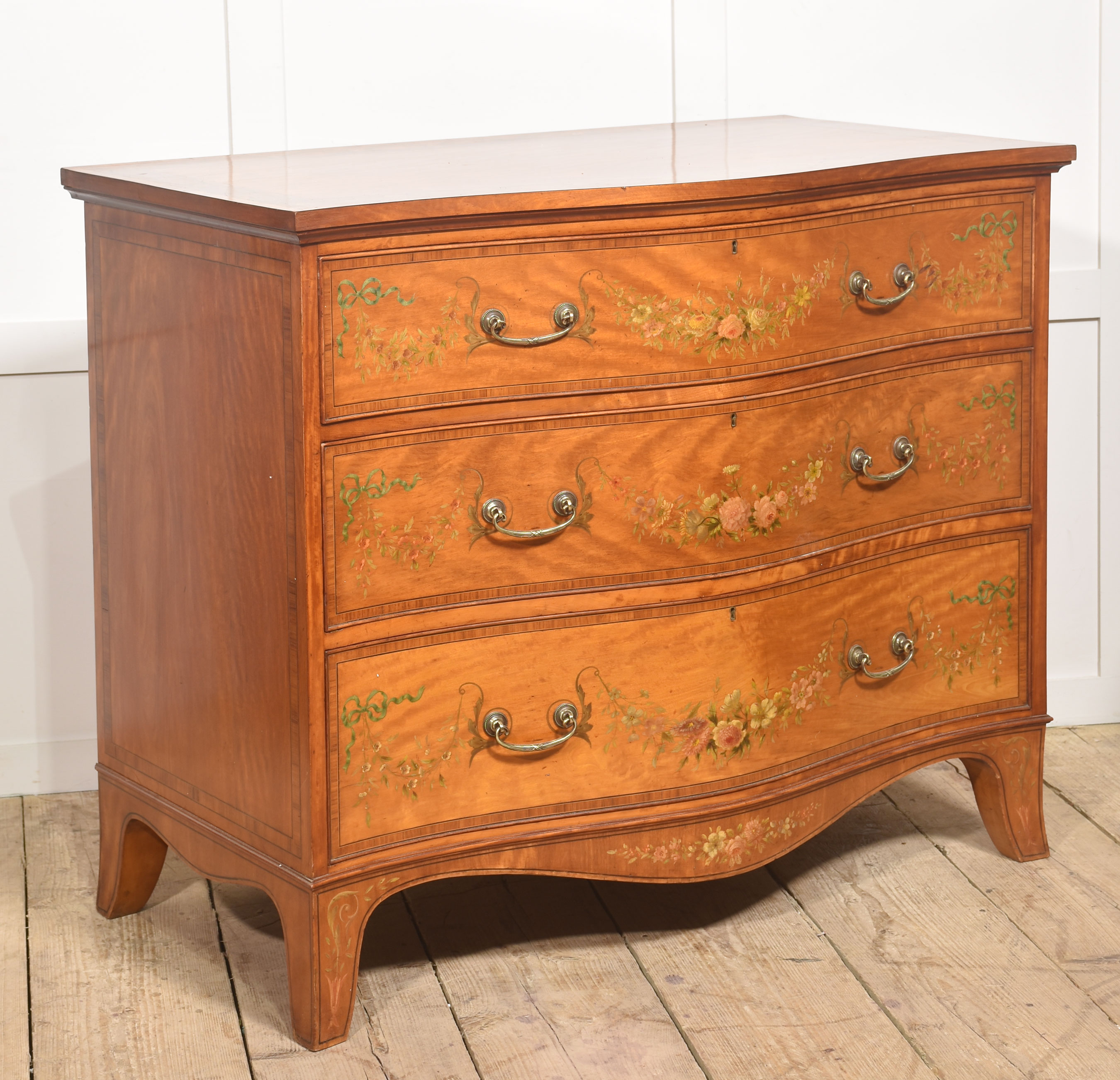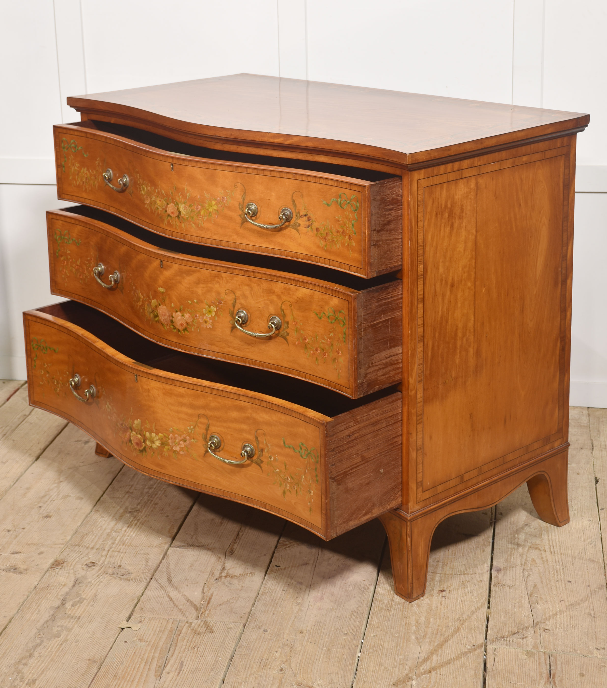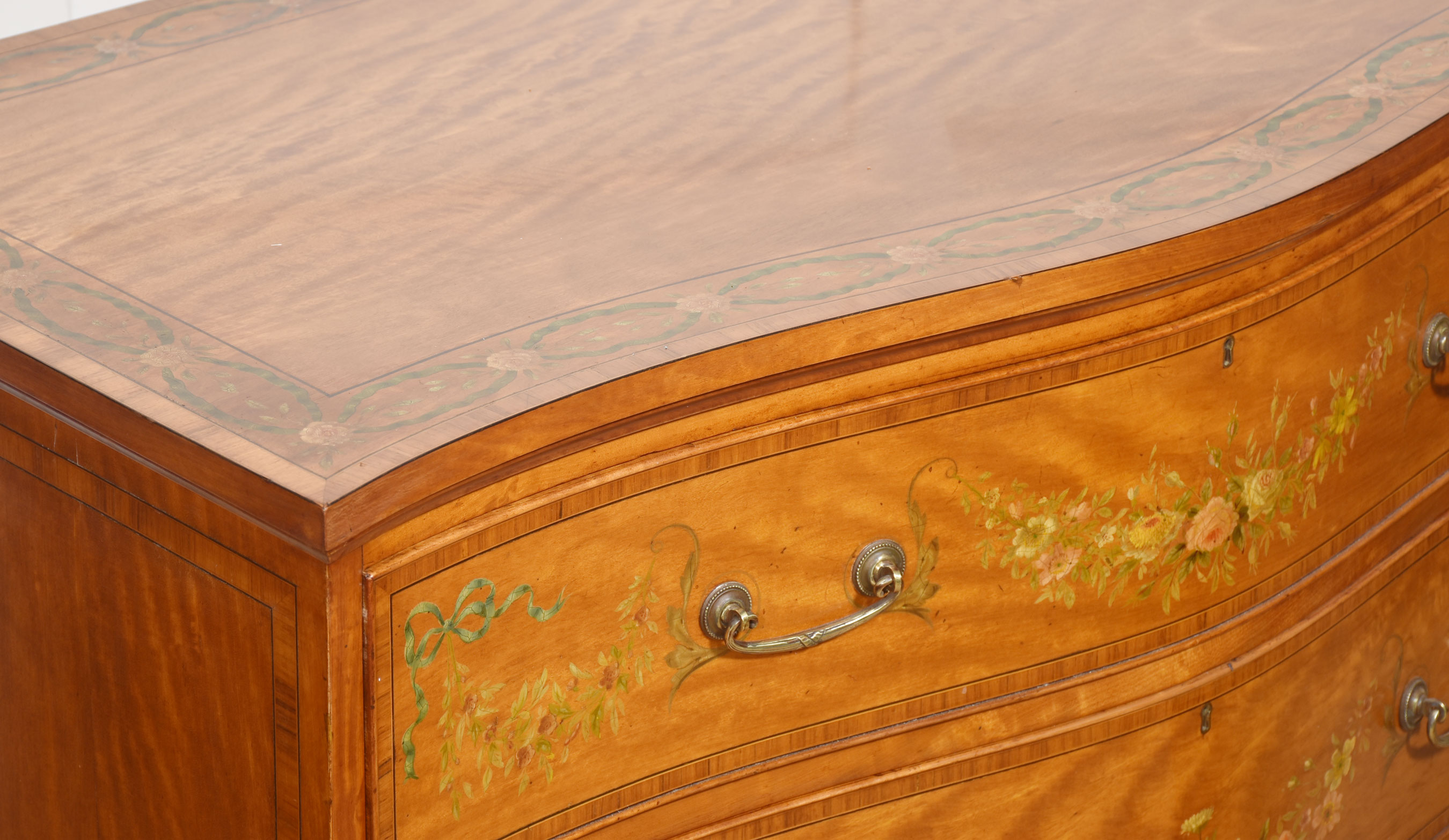 A finely crafted serpentine-front chest of drawers in the Sheraton Revival taste, constructed in richly figured satinwood and decorated throughout with delicate hand-painted floral ornament. The shaped rectangular top, with gently bowed front, is bordered by a subtle line inlay and exhibits the characteristic soft sheen and fine, even grain of satinwood.