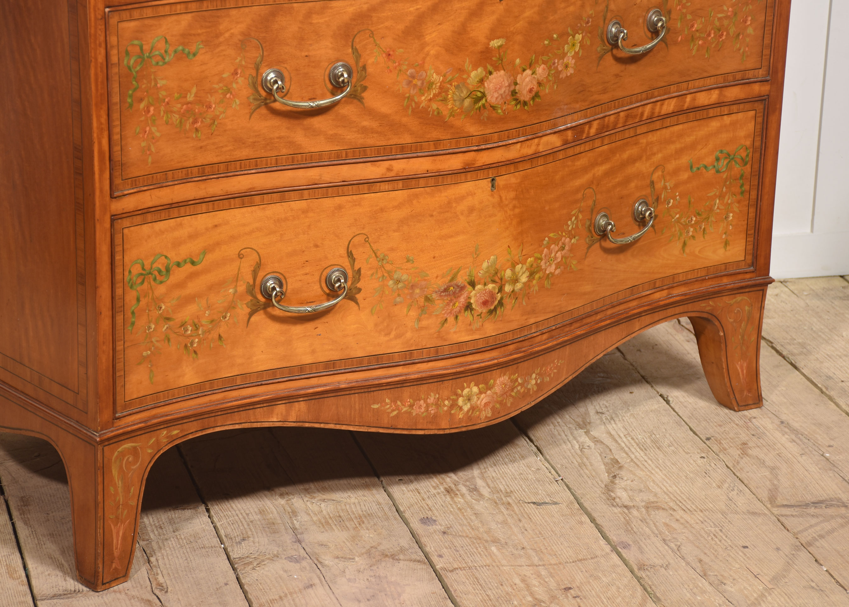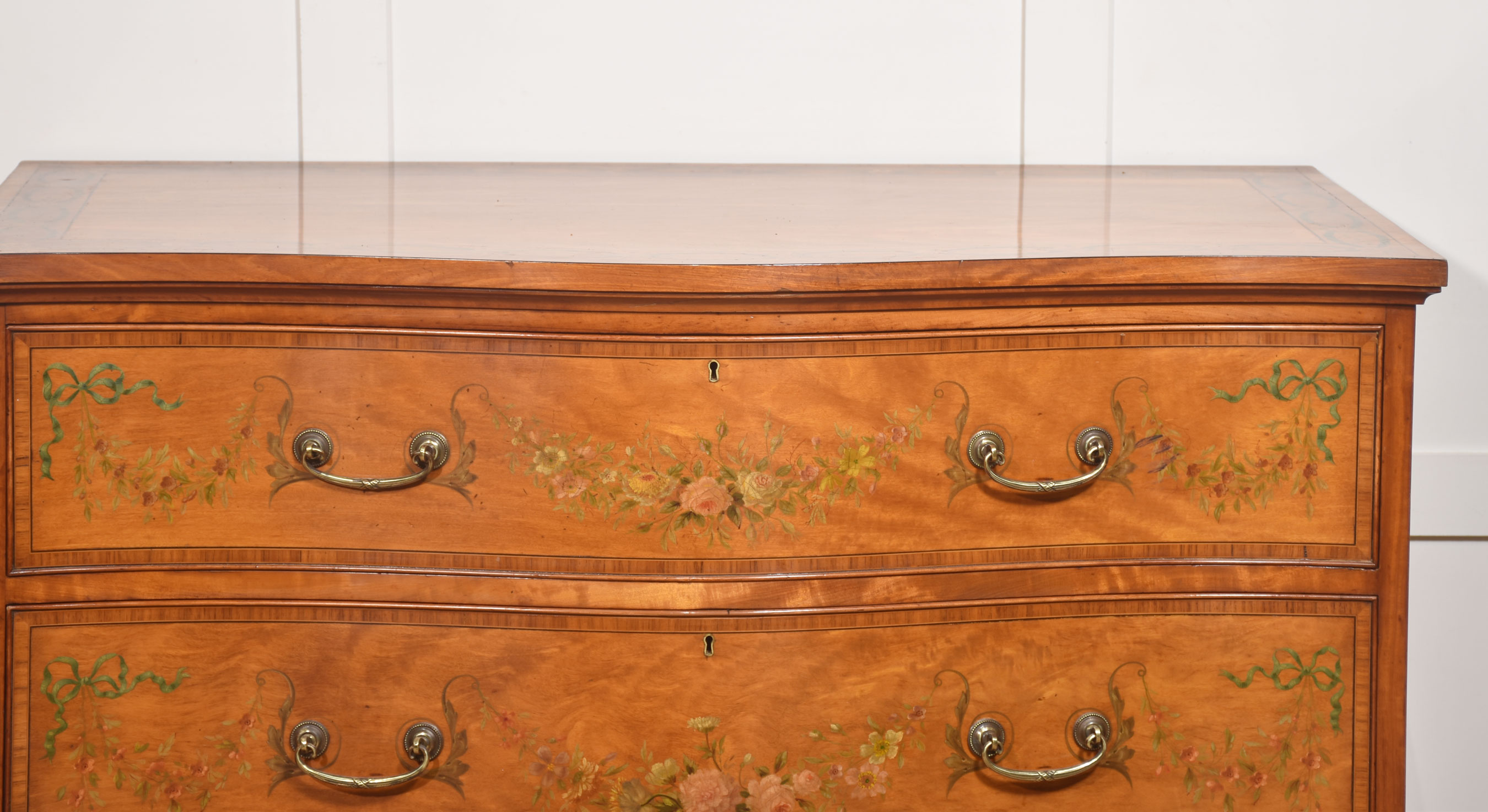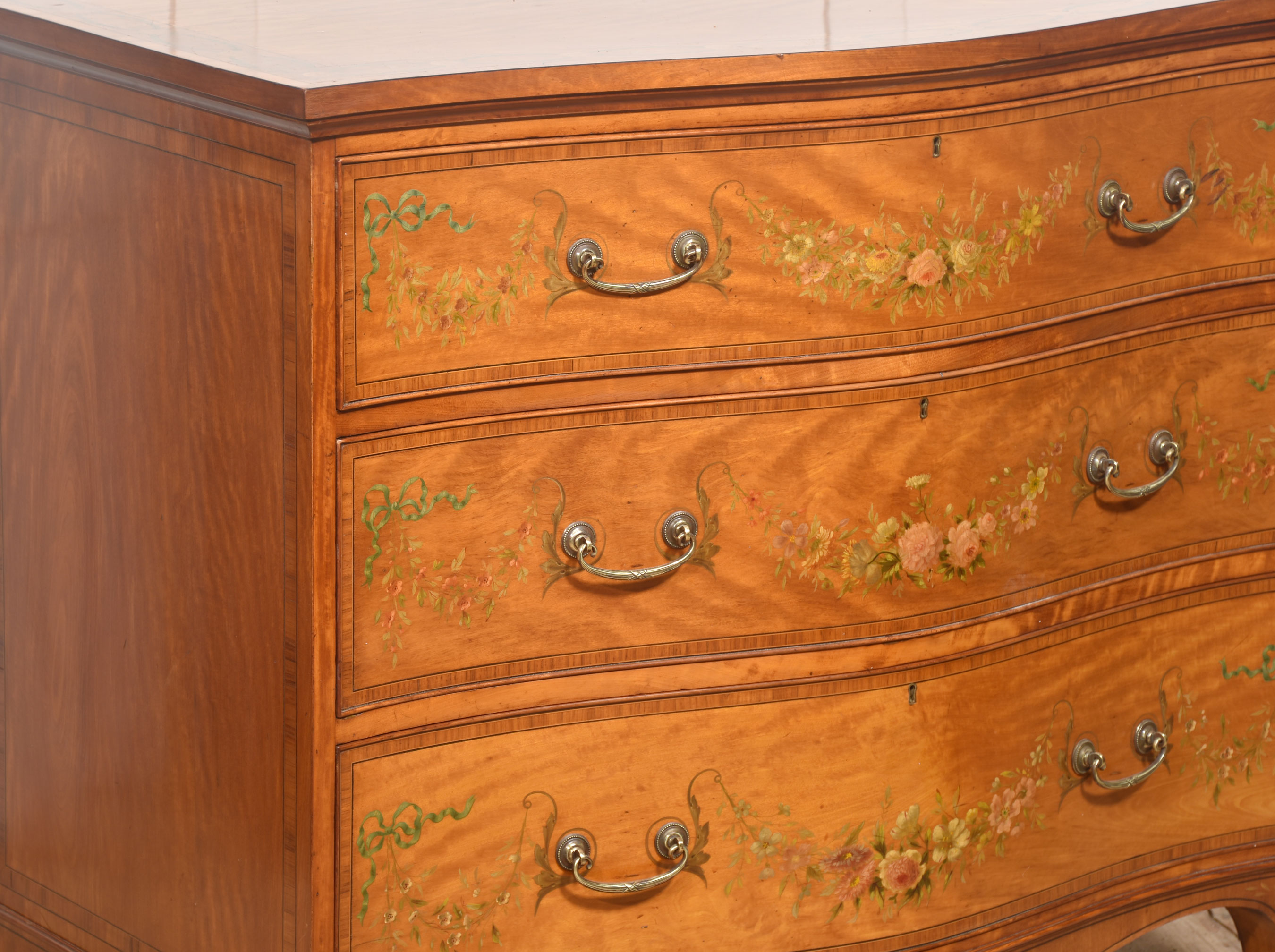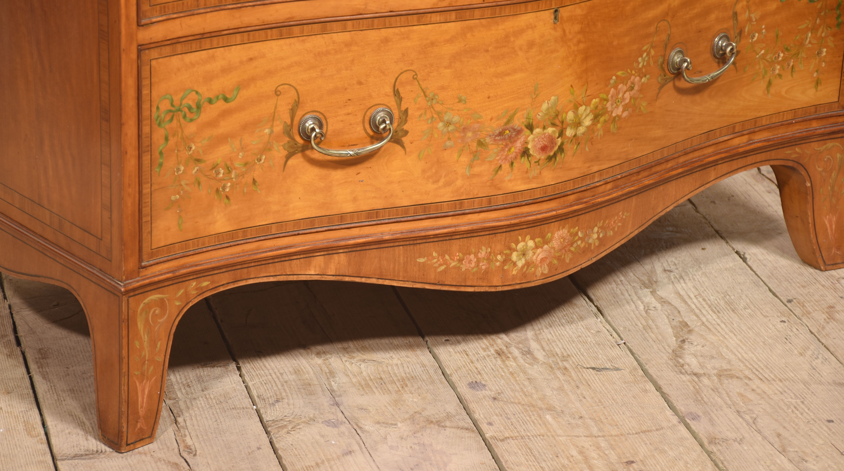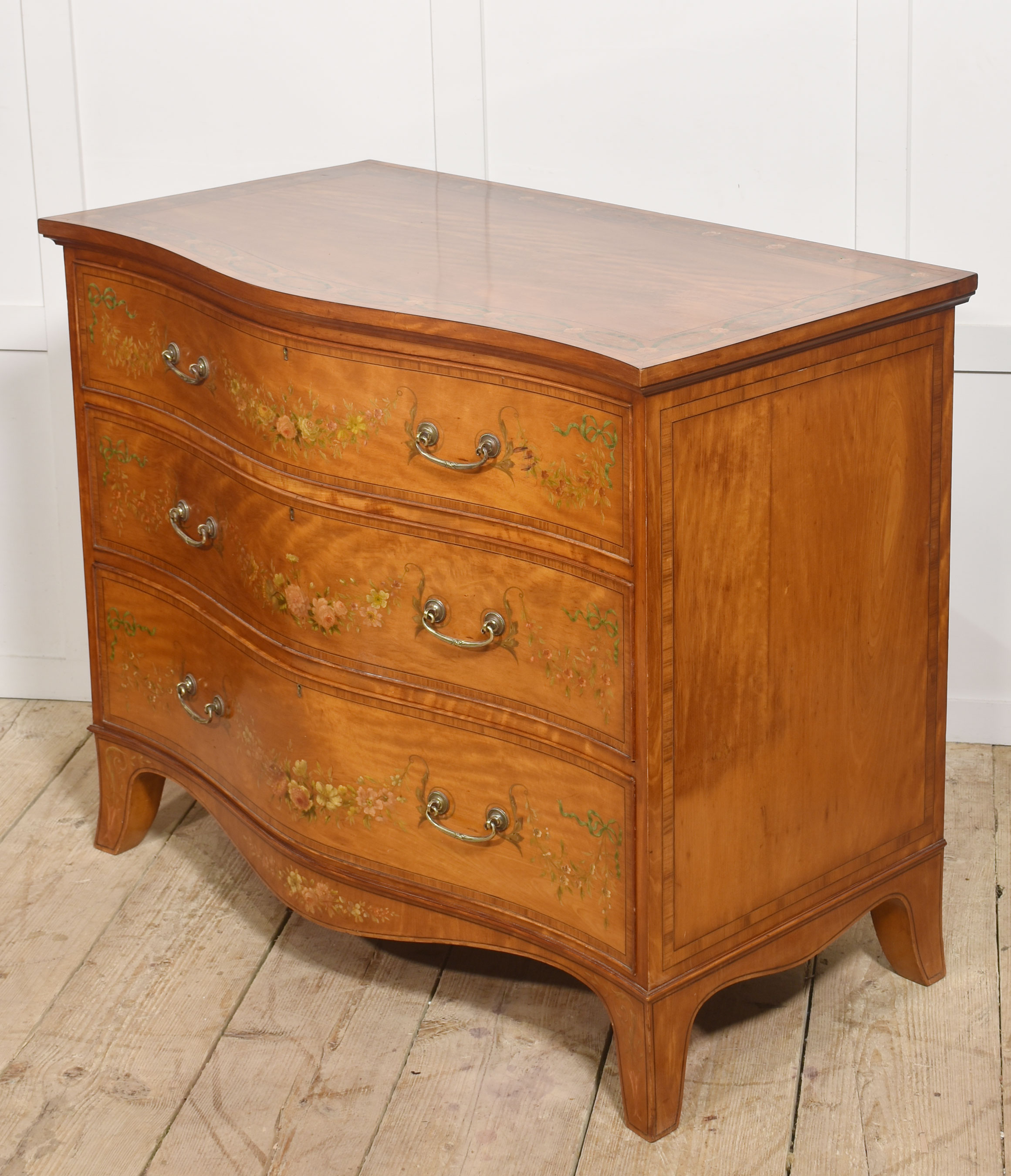 A finely crafted serpentine-front chest of drawers in the Sheraton Revival taste, constructed in richly figured satinwood and decorated throughout with delicate hand-painted floral ornament. The shaped rectangular top, with gently bowed front, is bordered by a subtle line inlay and exhibits the characteristic soft sheen and fine, even grain of satinwood.