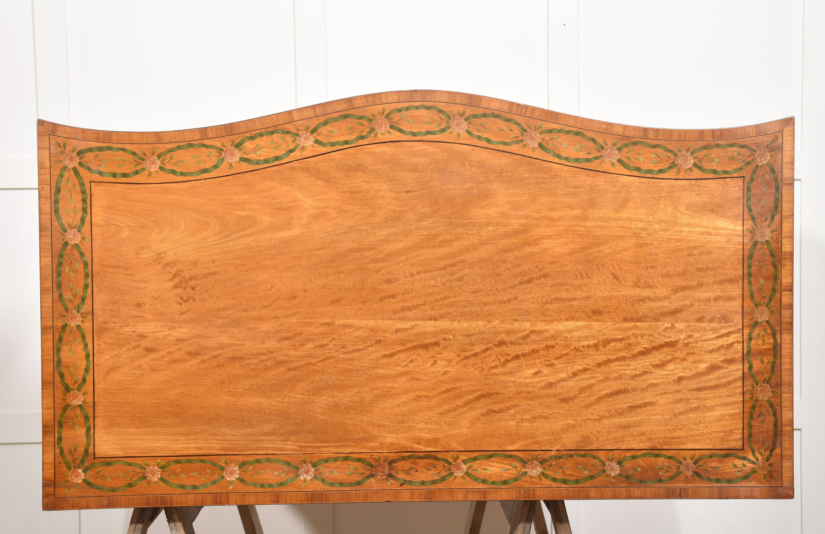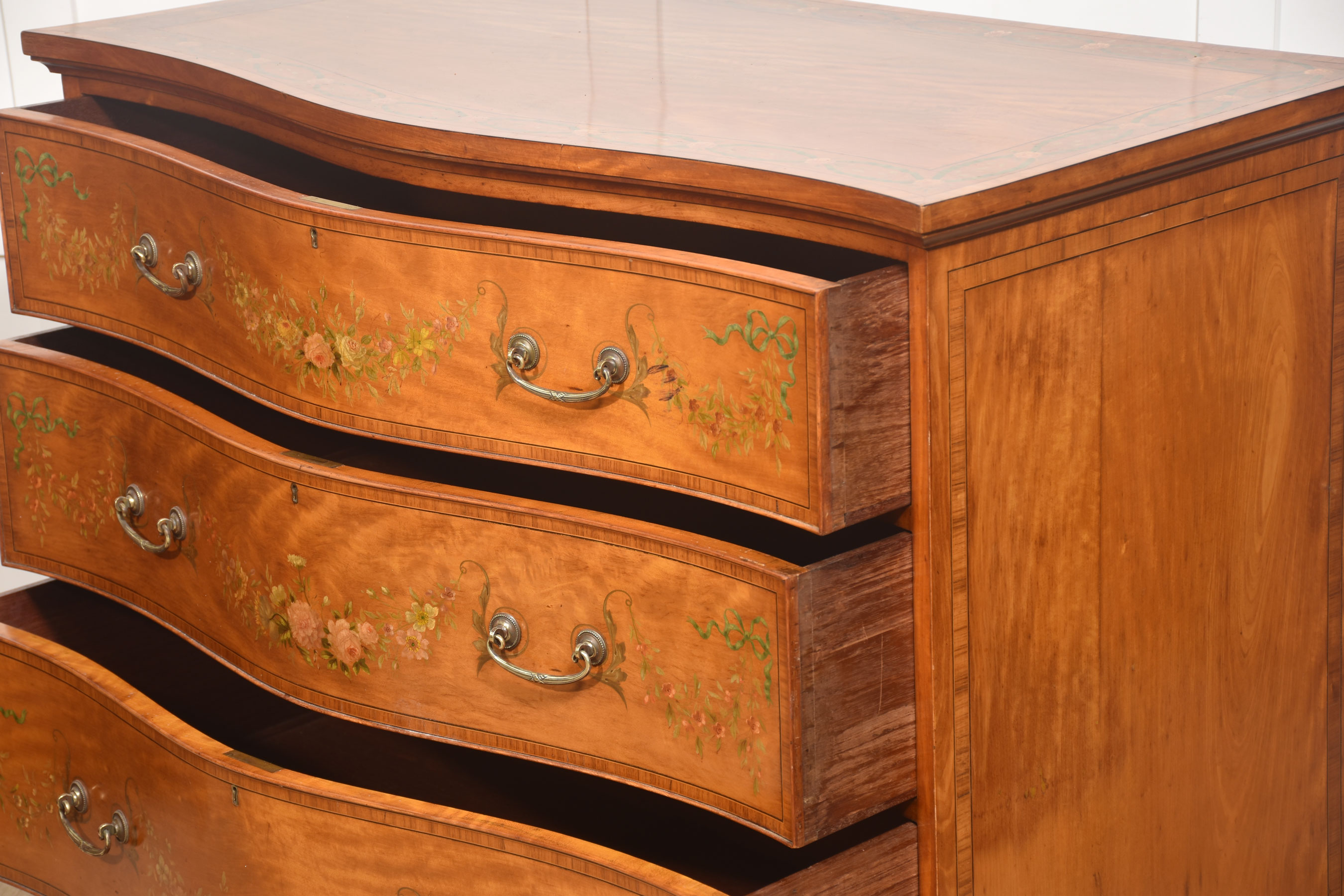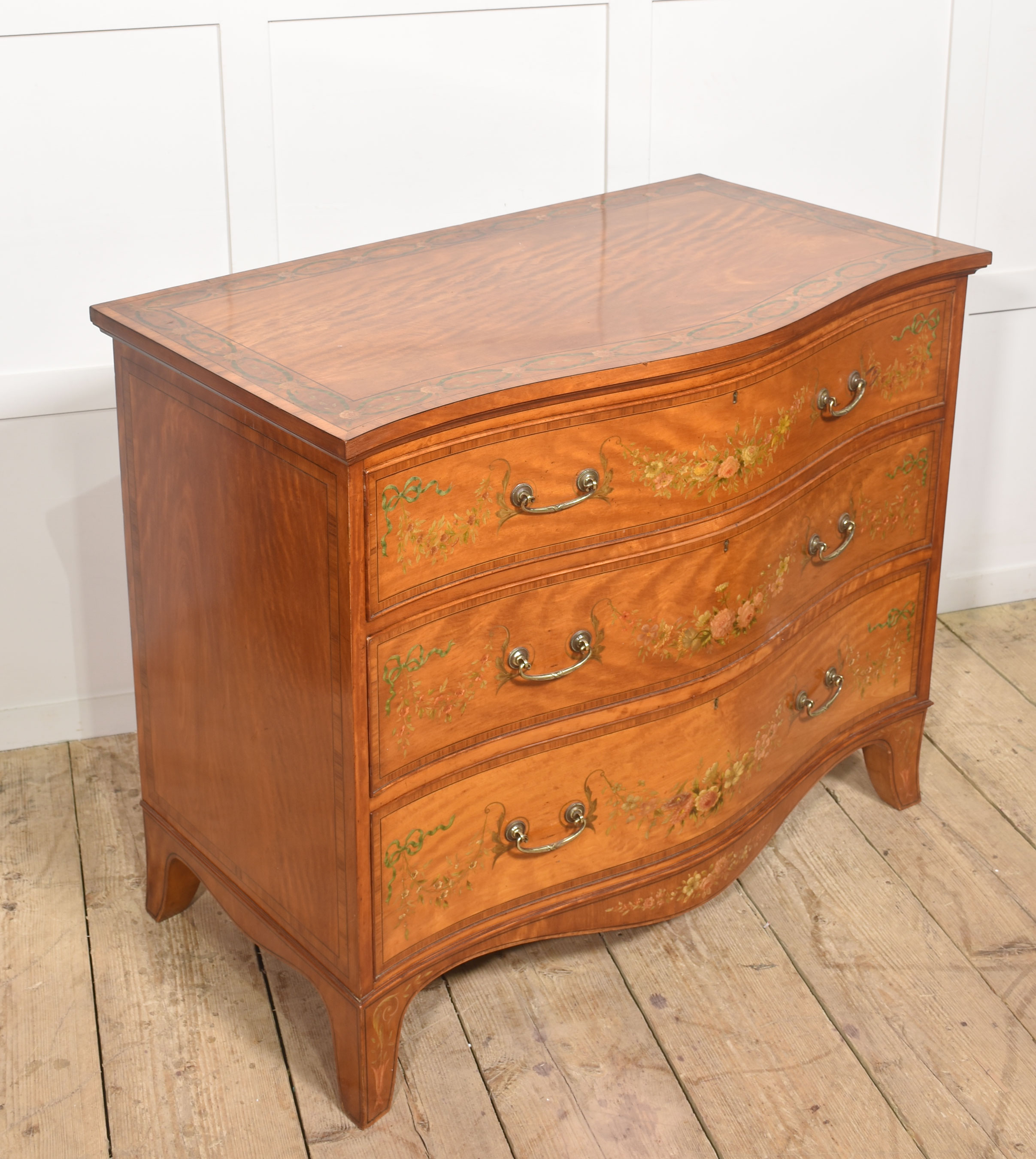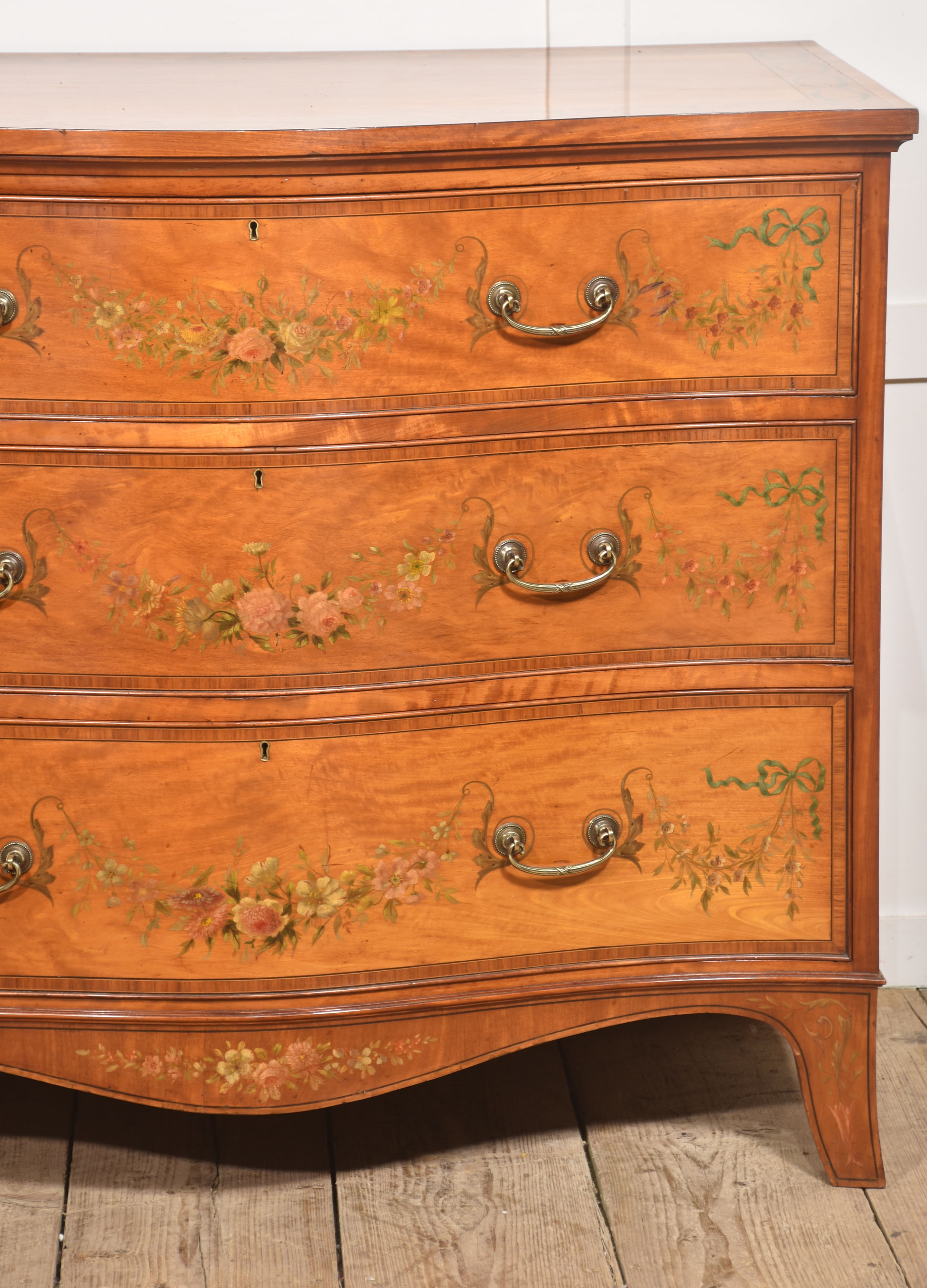 A finely crafted serpentine-front chest of drawers in the Sheraton Revival taste, constructed in richly figured satinwood and decorated throughout with delicate hand-painted floral ornament. The shaped rectangular top, with gently bowed front, is bordered by a subtle line inlay and exhibits the characteristic soft sheen and fine, even grain of satinwood.