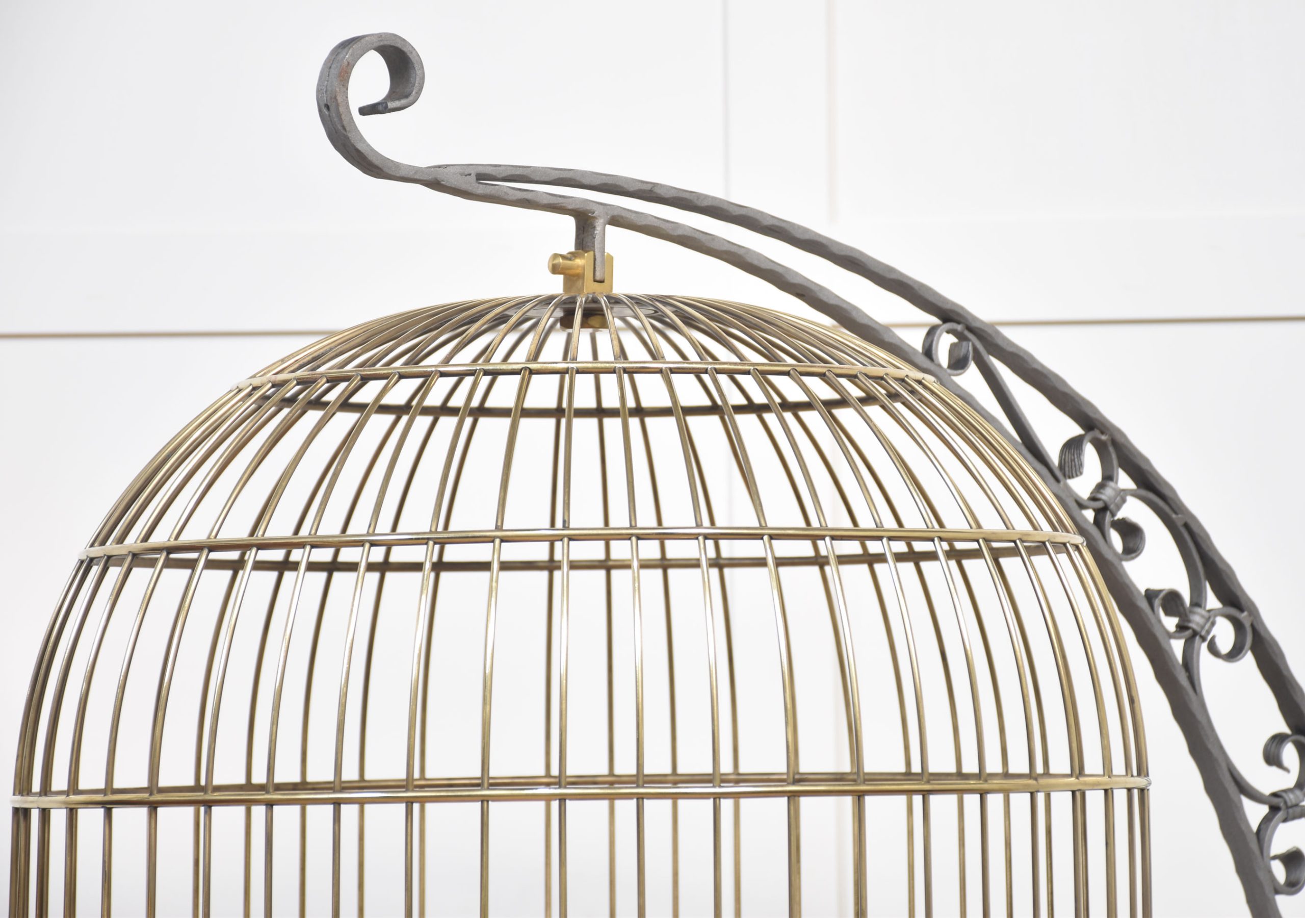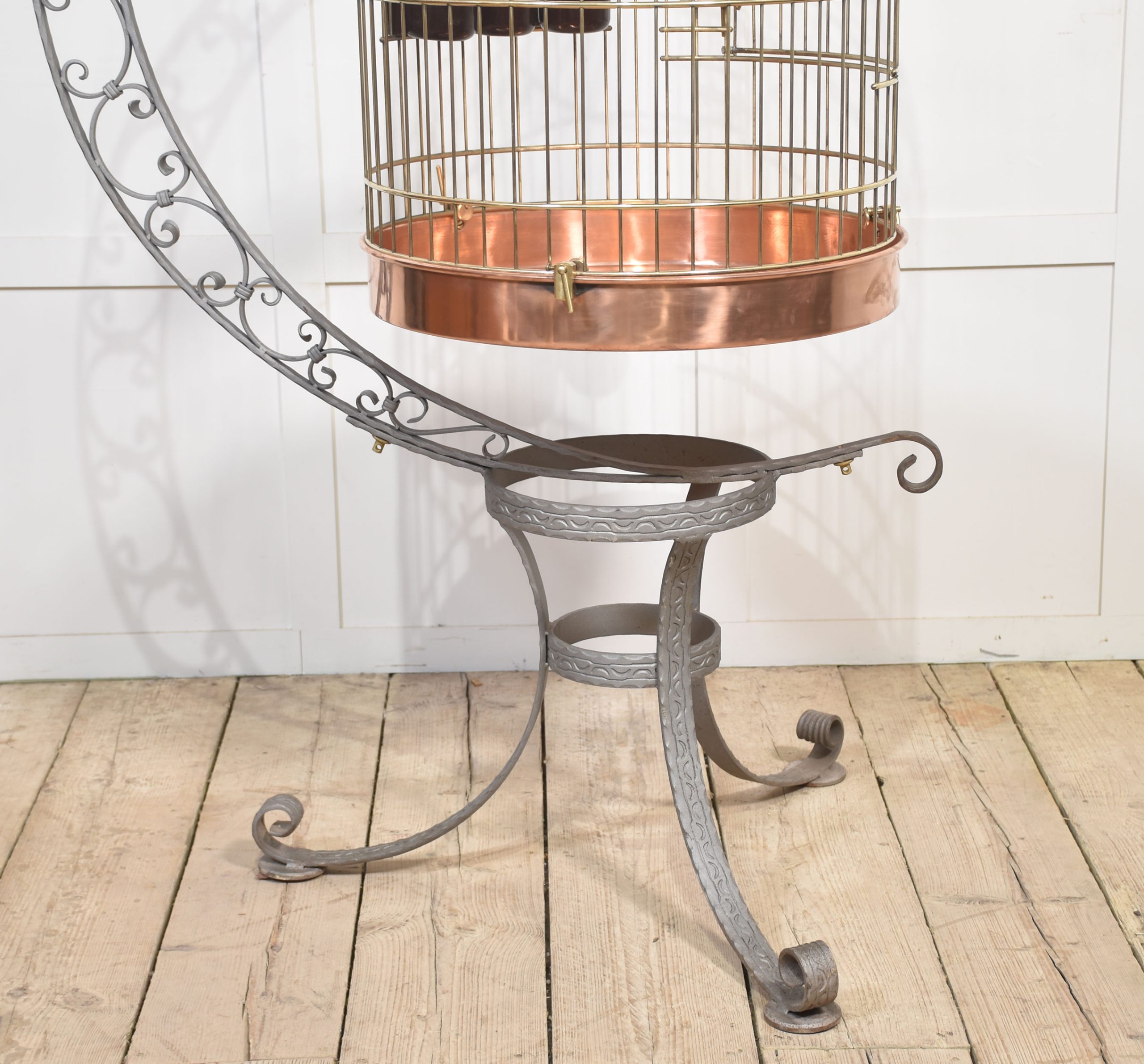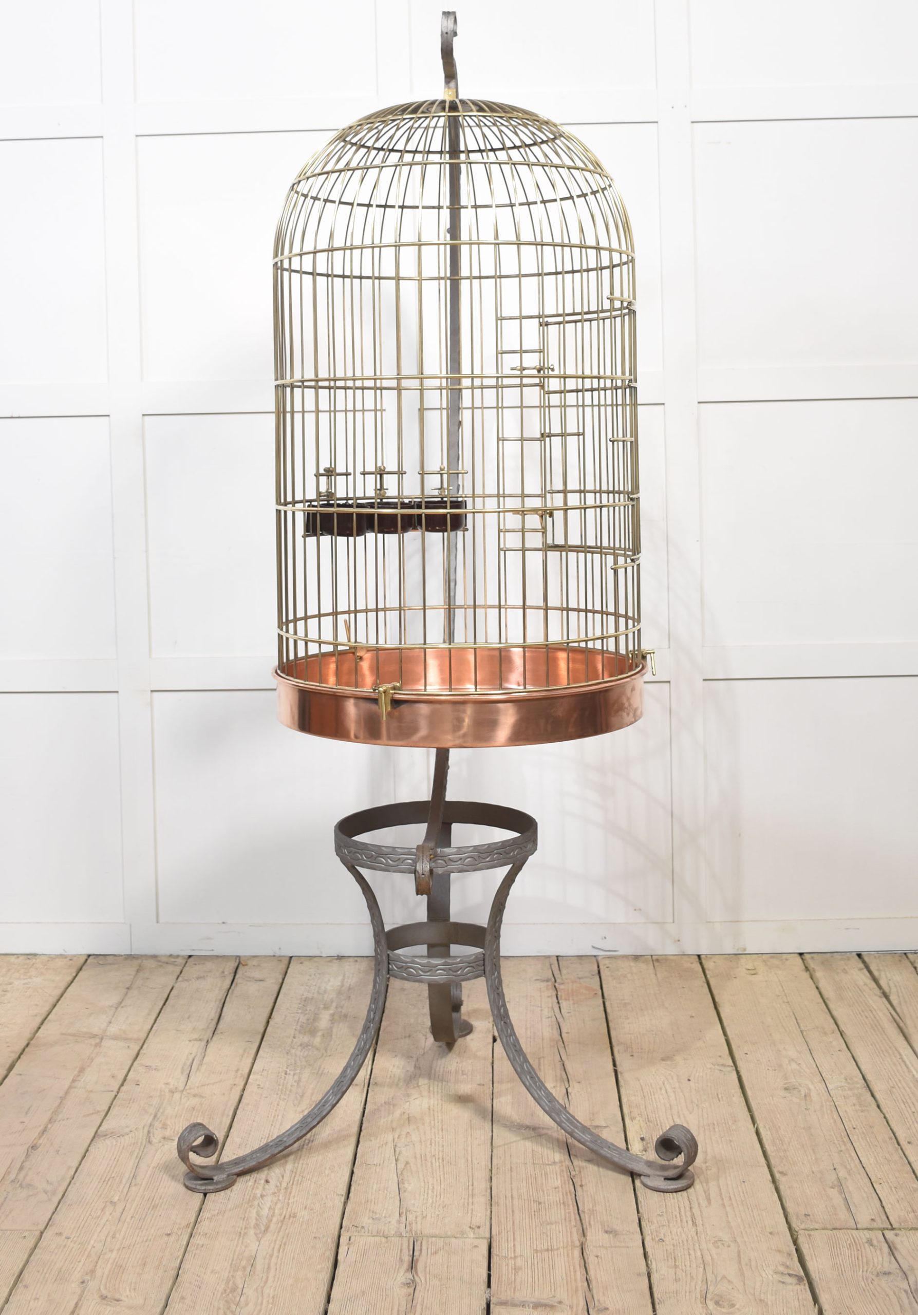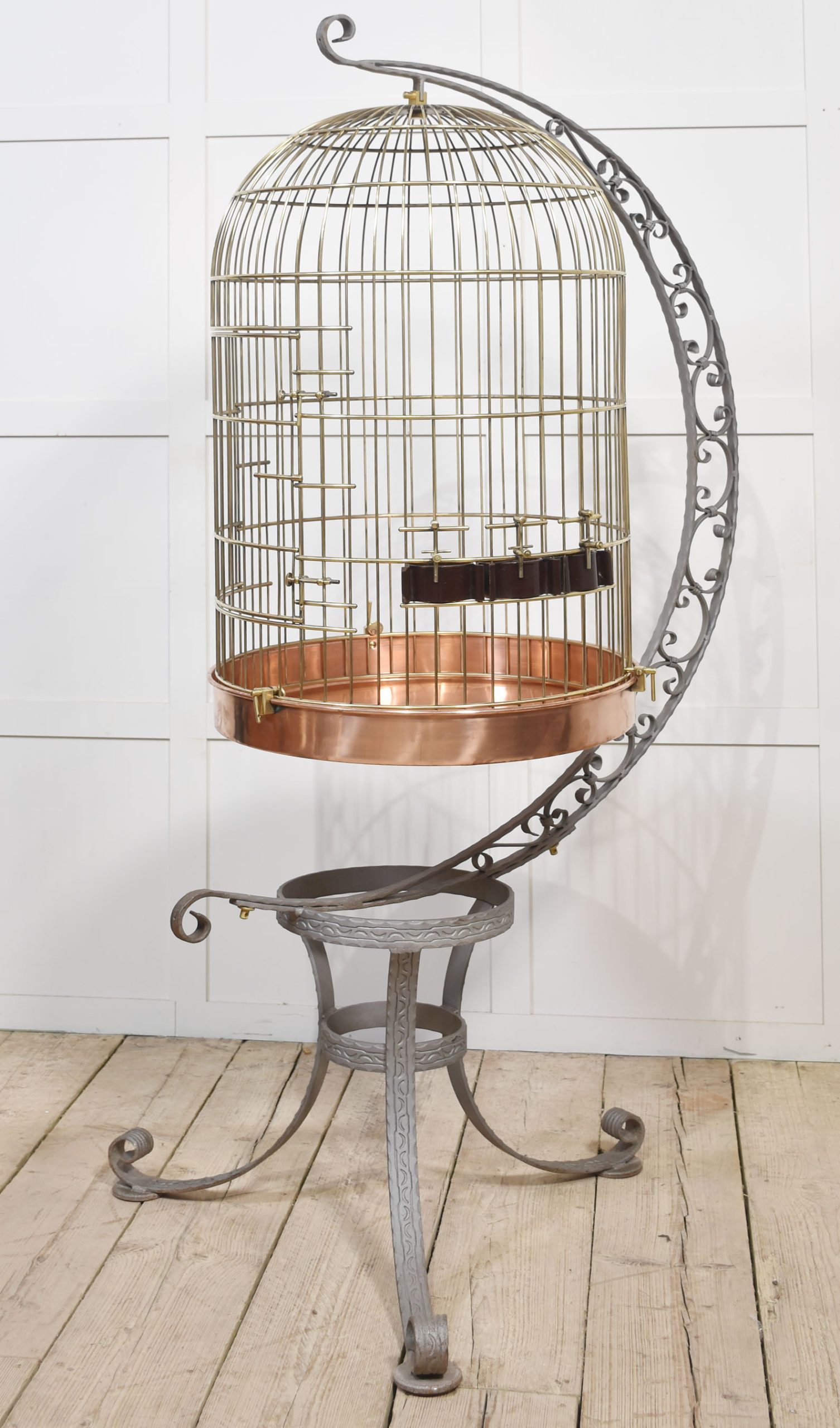 Substantial brass birdcage or aviary, having a dome-shaped cage with copper bottom supported on wrought iron frame with scrolling decoration.