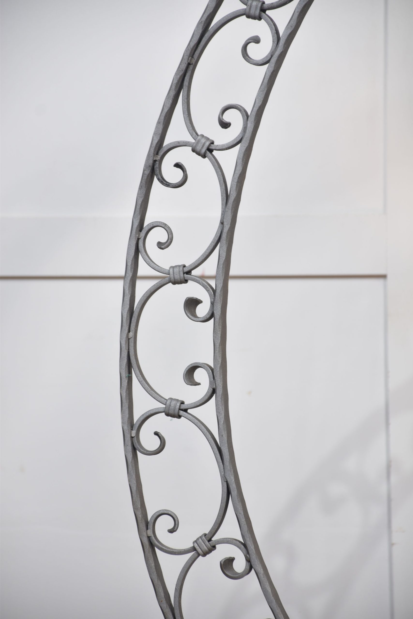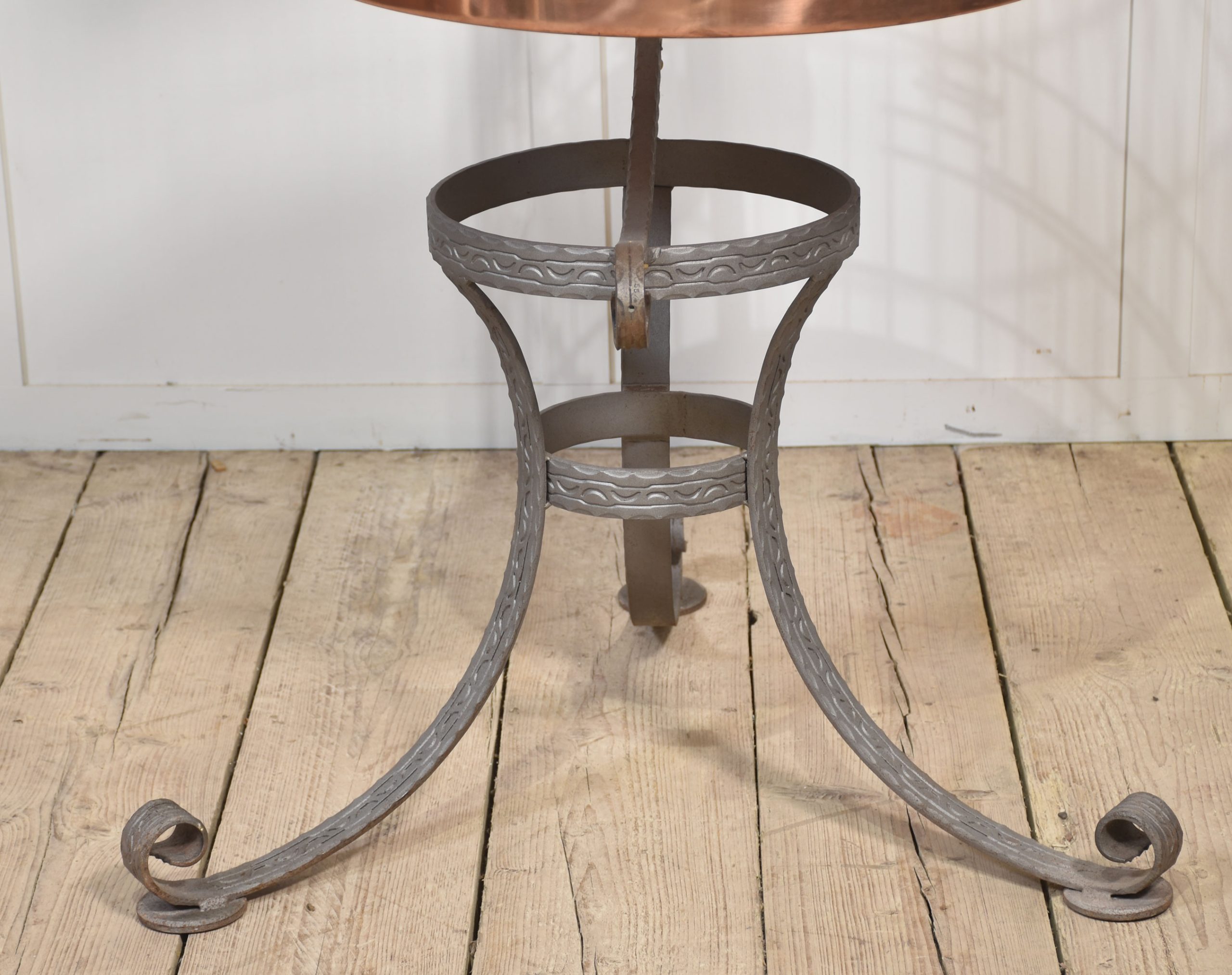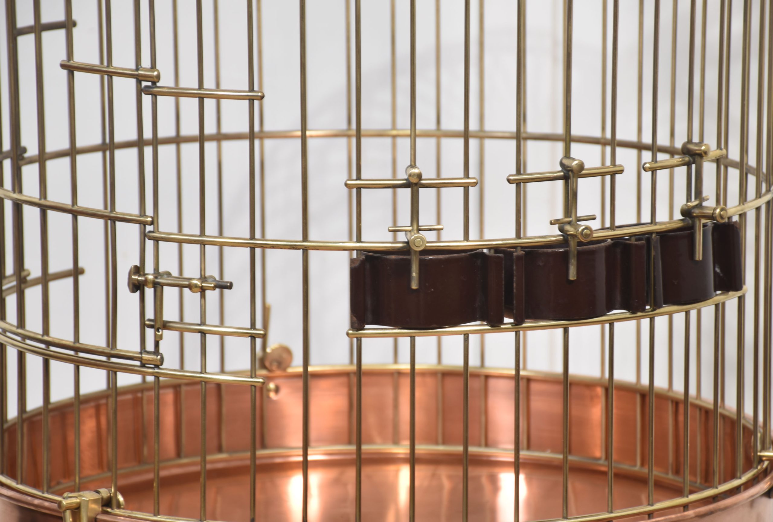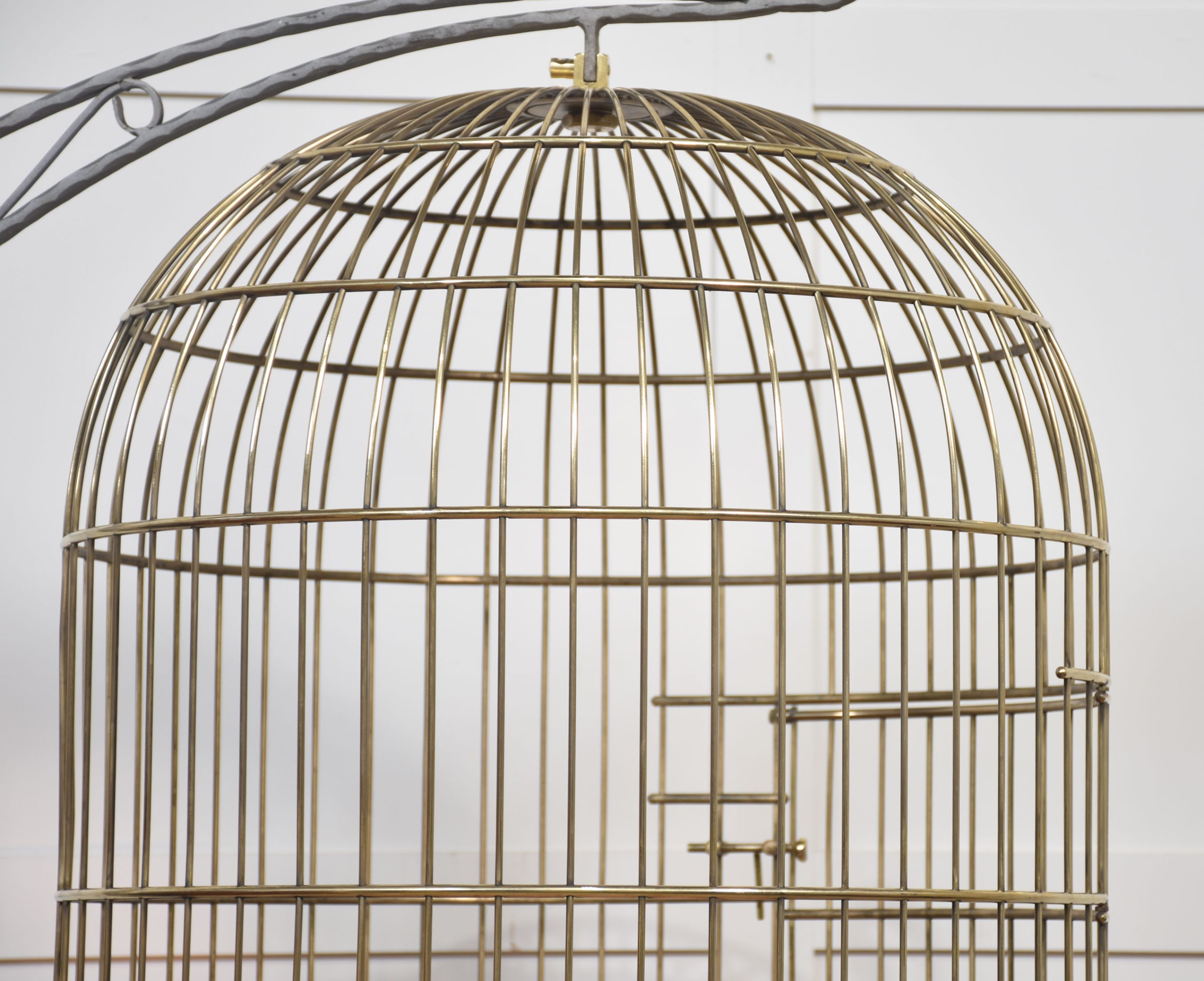 Substantial brass birdcage or aviary, having a dome-shaped cage with copper bottom supported on wrought iron frame with scrolling decoration.