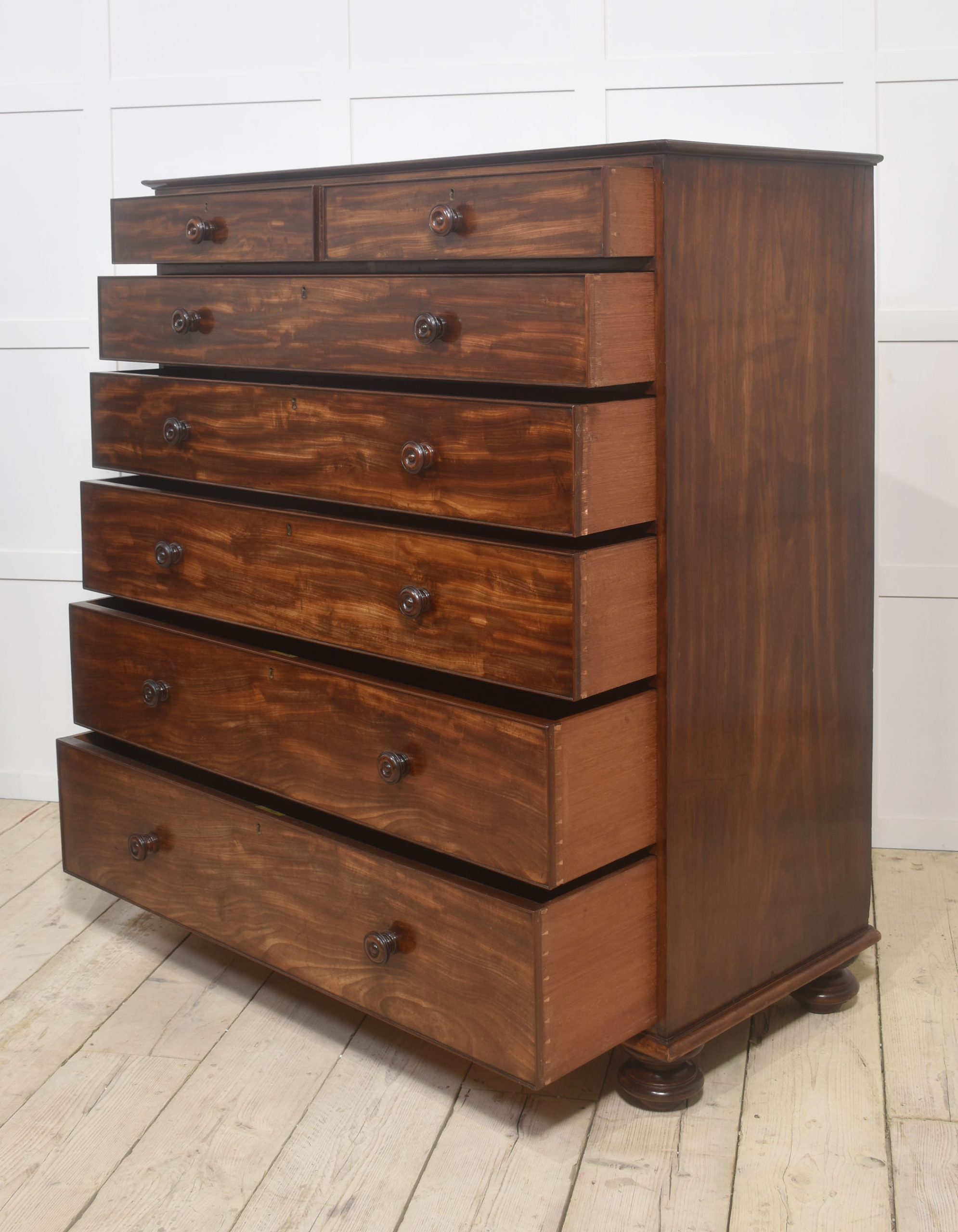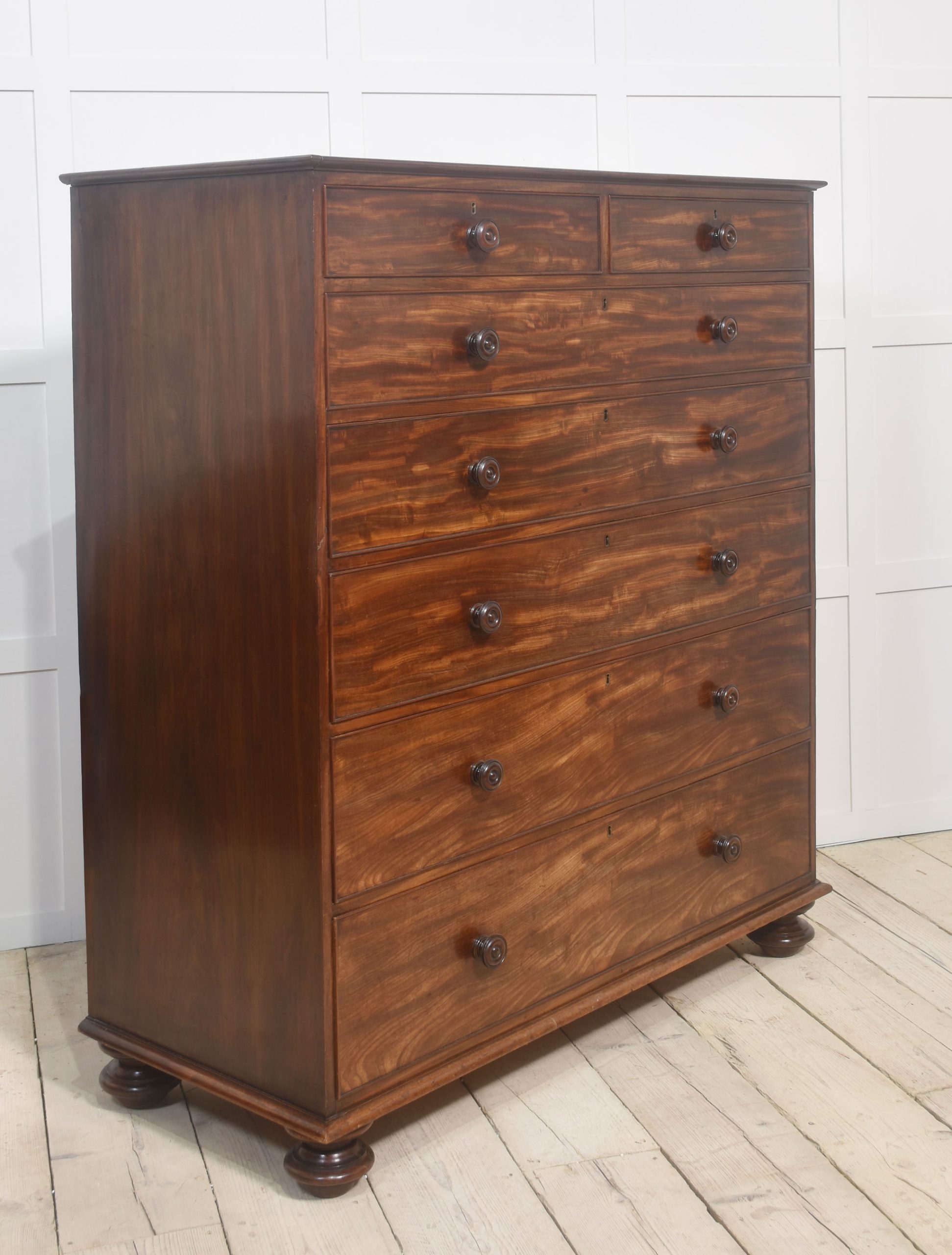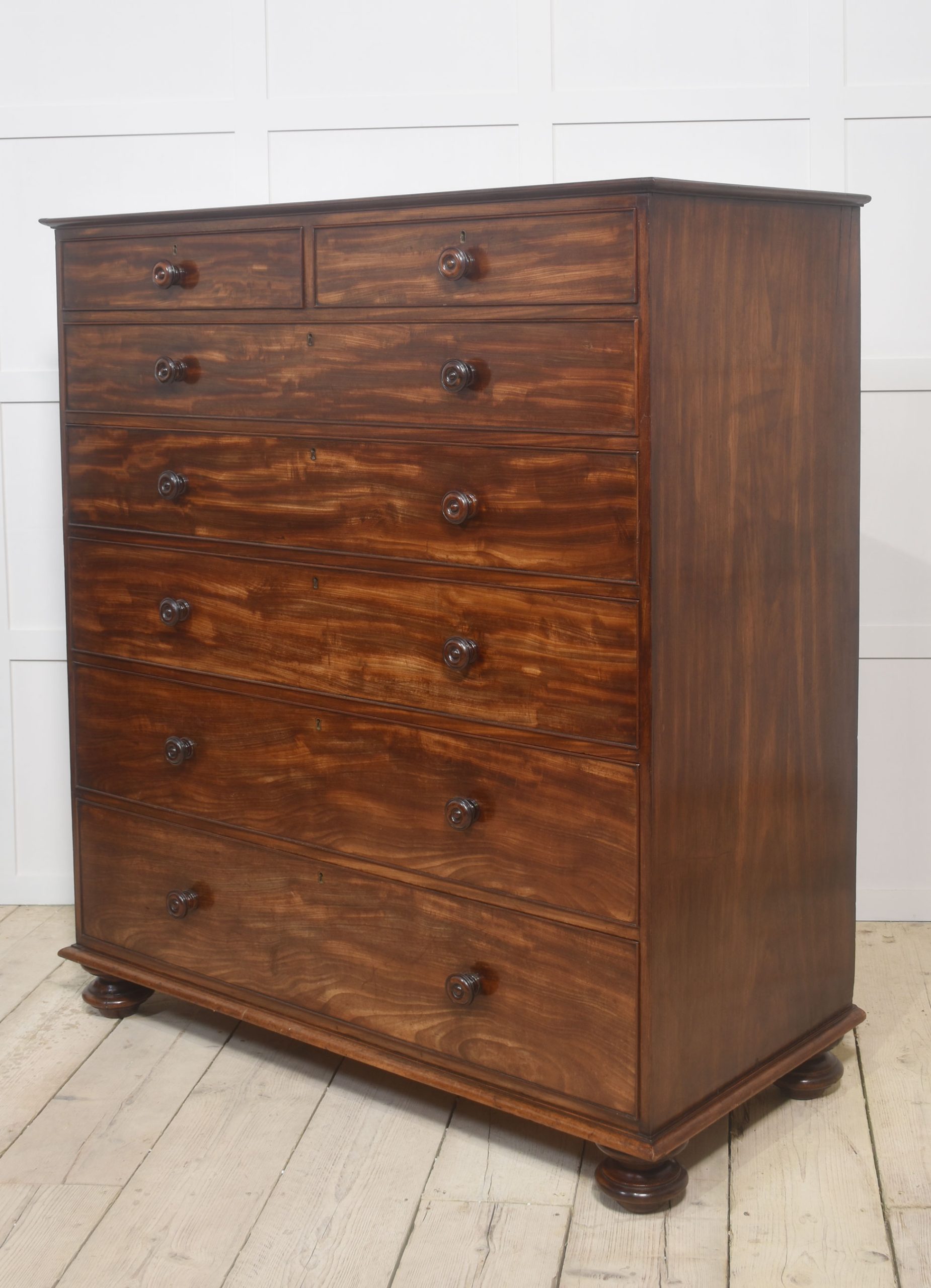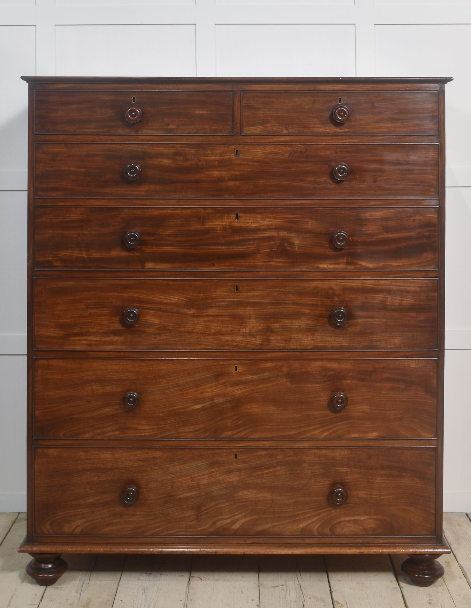 Tall mahogany chest of drawers, the rectangular top above two short and five long mahogany lined graduated drawers, all with turned mahogany knob handles. Raised up on bun feet.