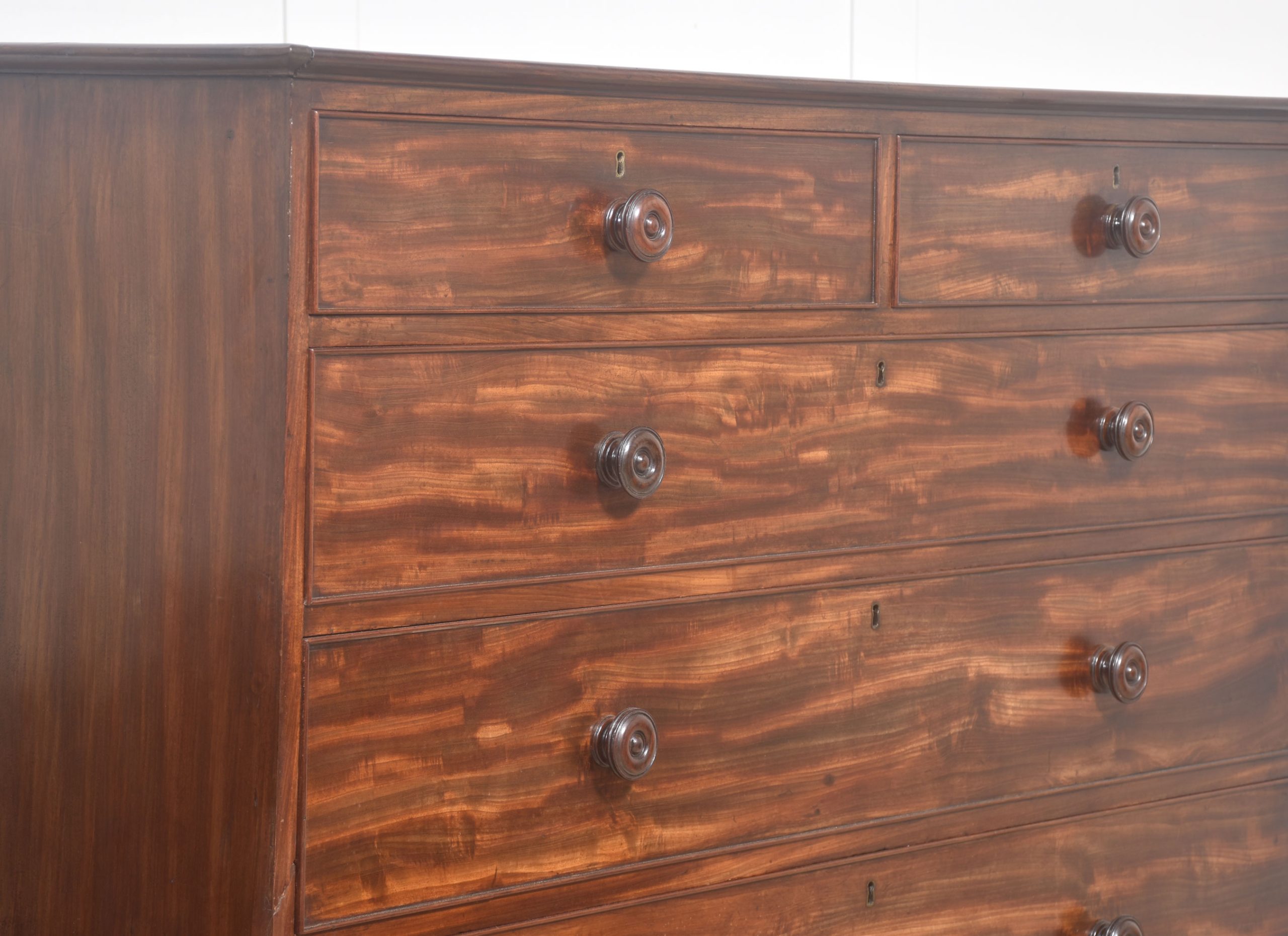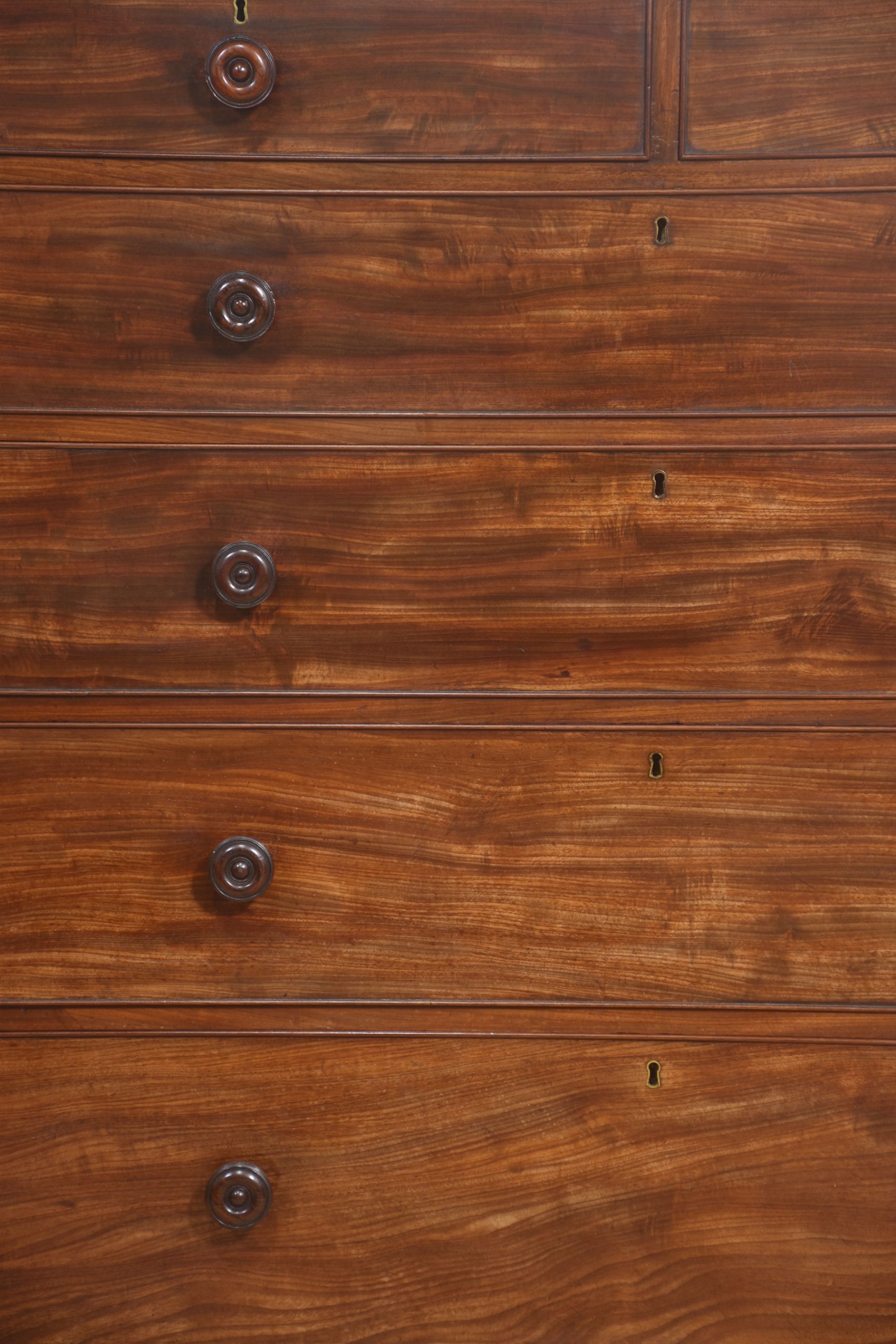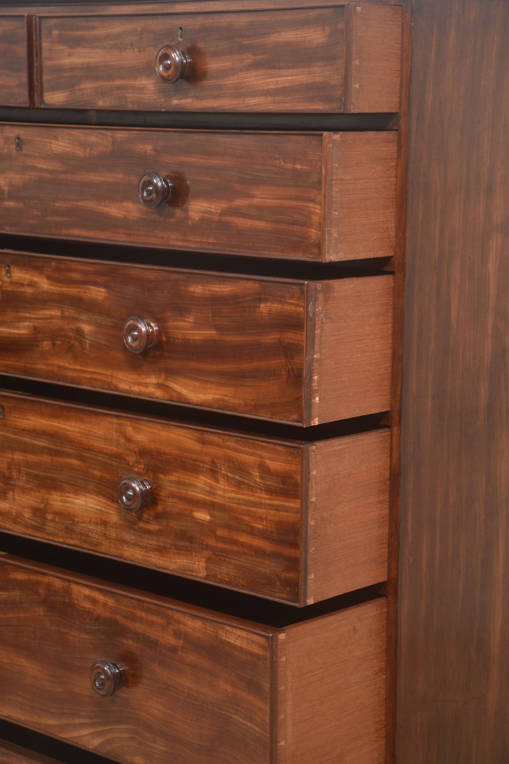 Tall mahogany chest of drawers, the rectangular top above two short and five long mahogany lined graduated drawers, all with turned mahogany knob handles. Raised up on bun feet.